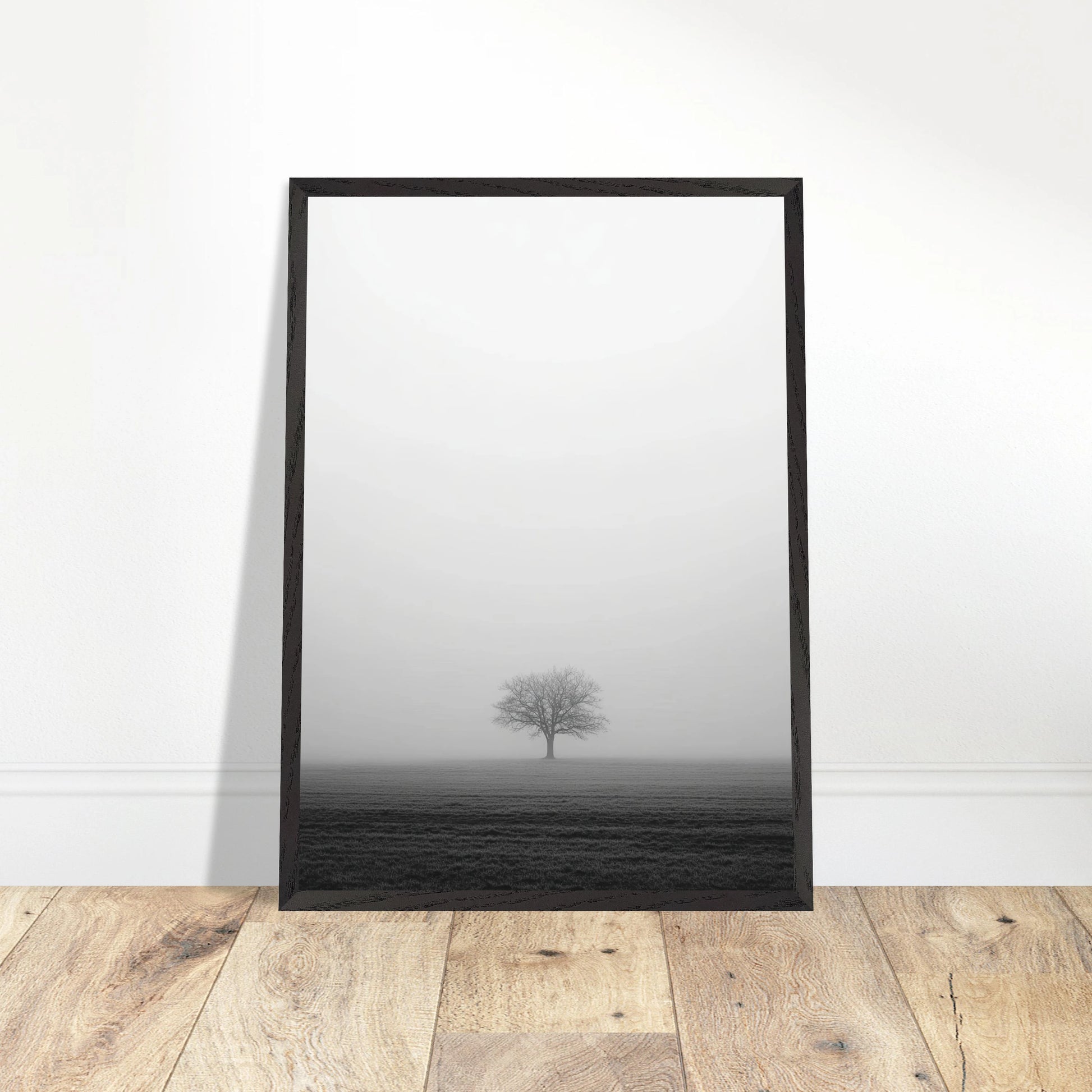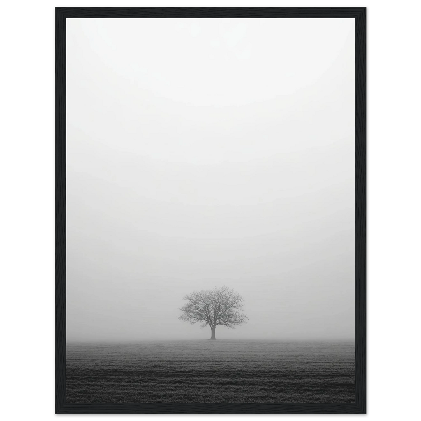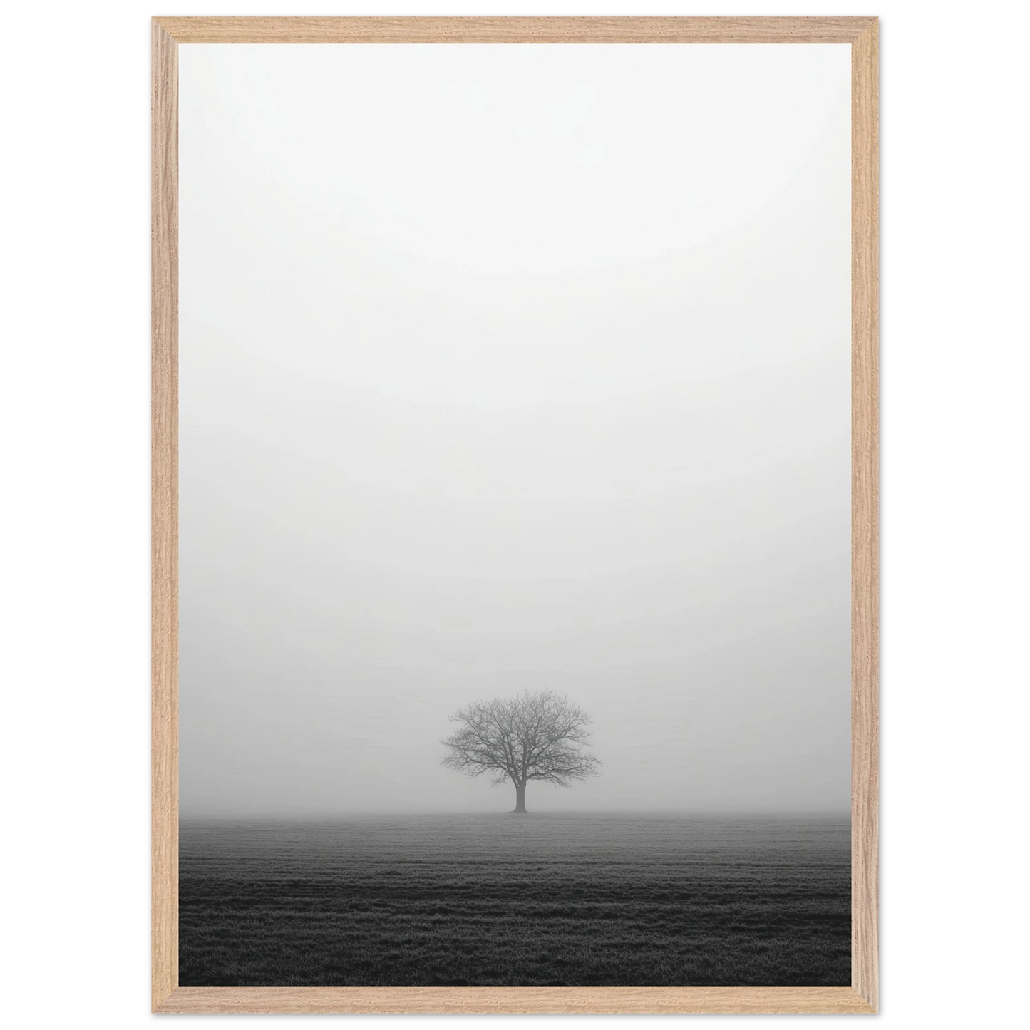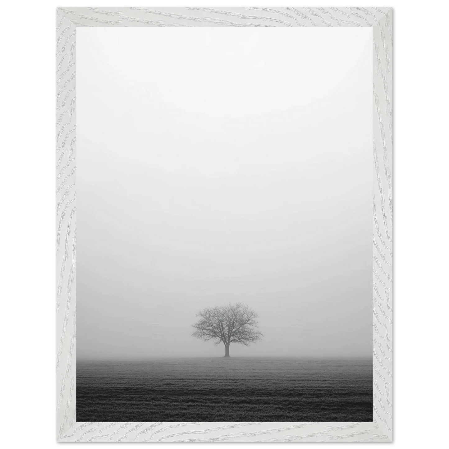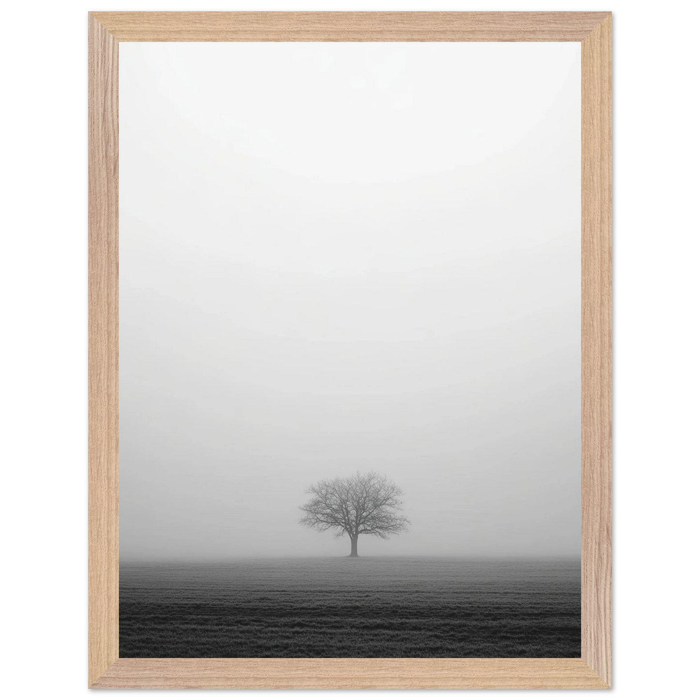 Et minimalistisk fotografisk kunstverk som viser et ensomt tre omgitt av tåke. Det enkle motivet fremhever kontrasten mellom naturens styrke og stillhet, og gir rommet en meditativ og tidløs stemning. Perfekt for deg som ønsker et rolig og poetisk uttrykk på veggen.