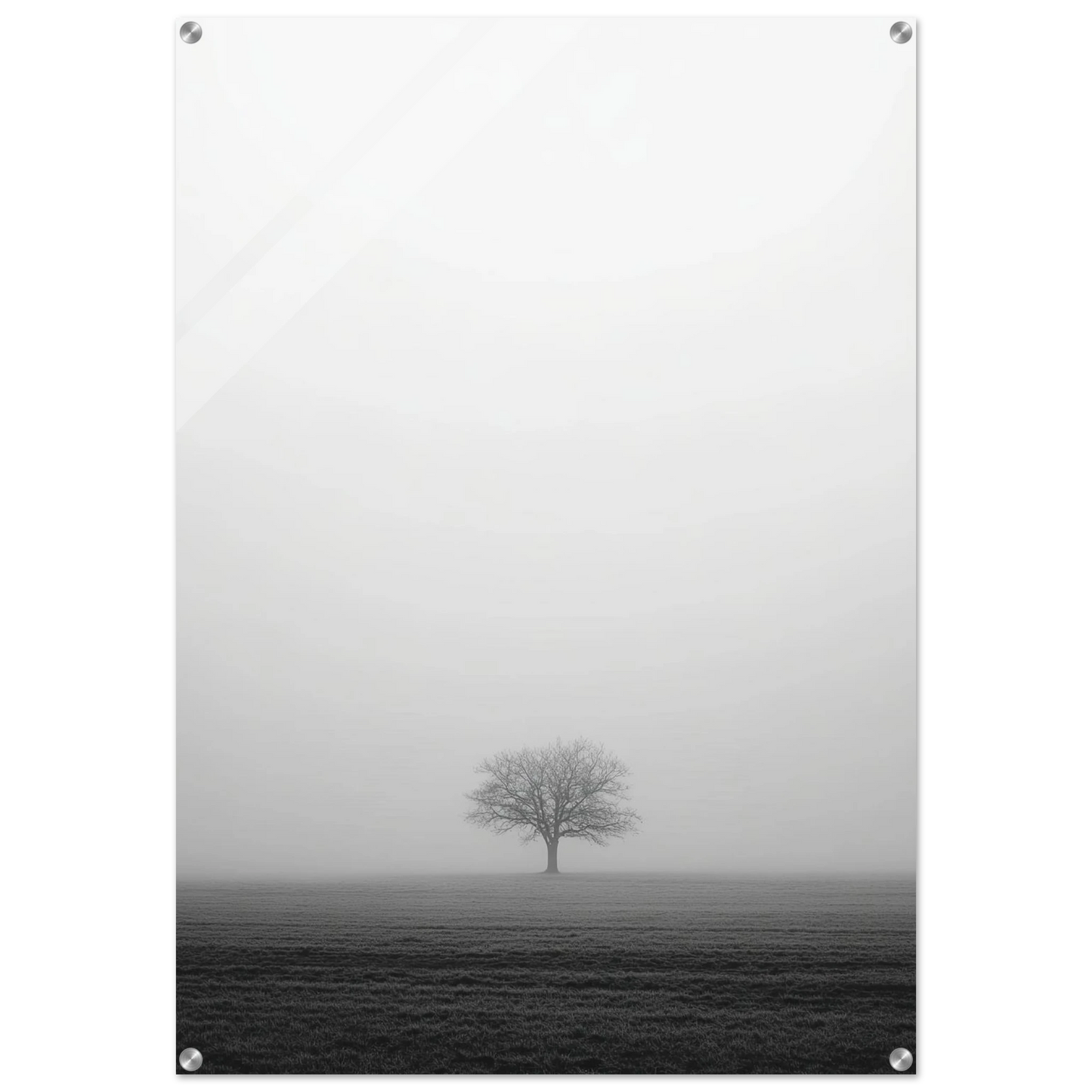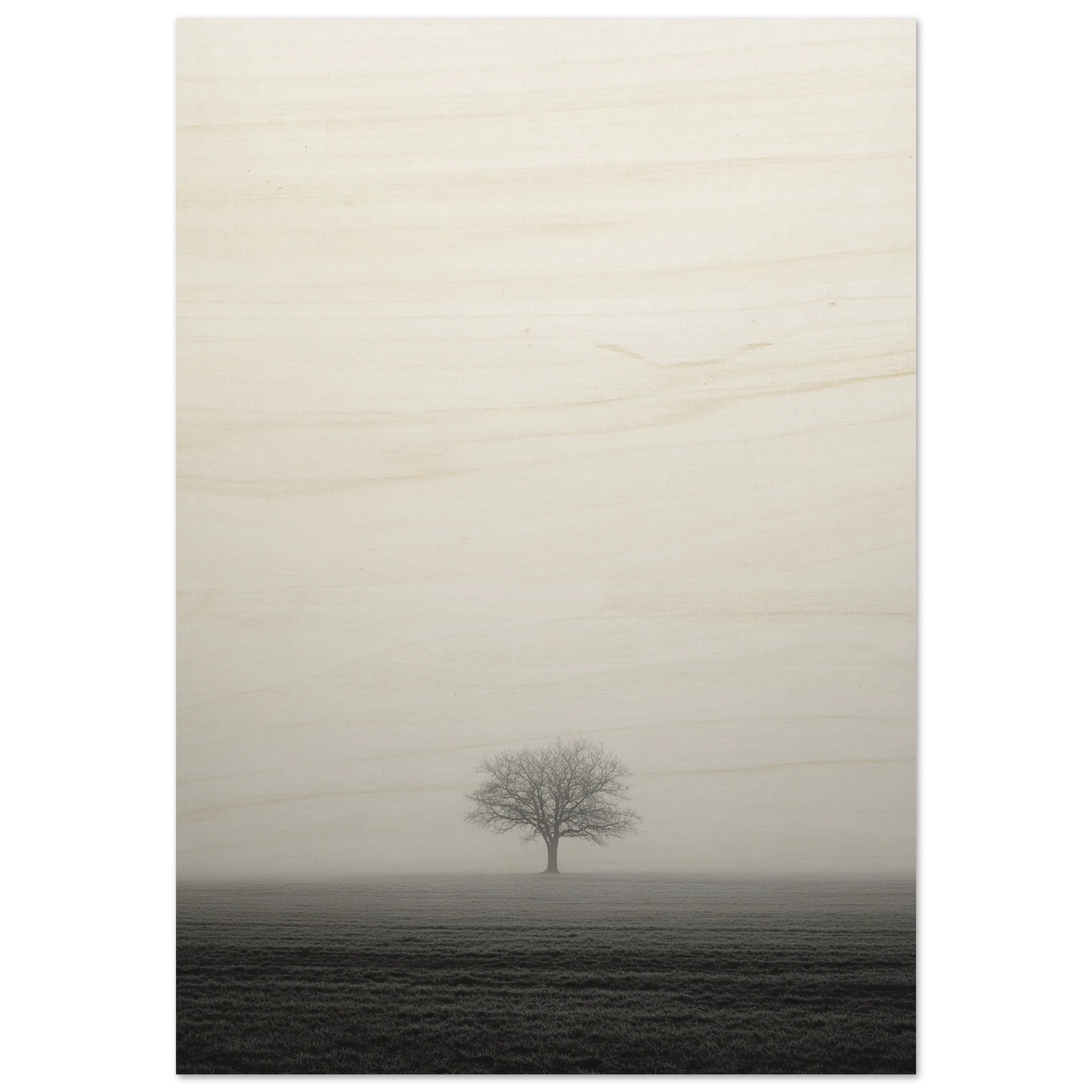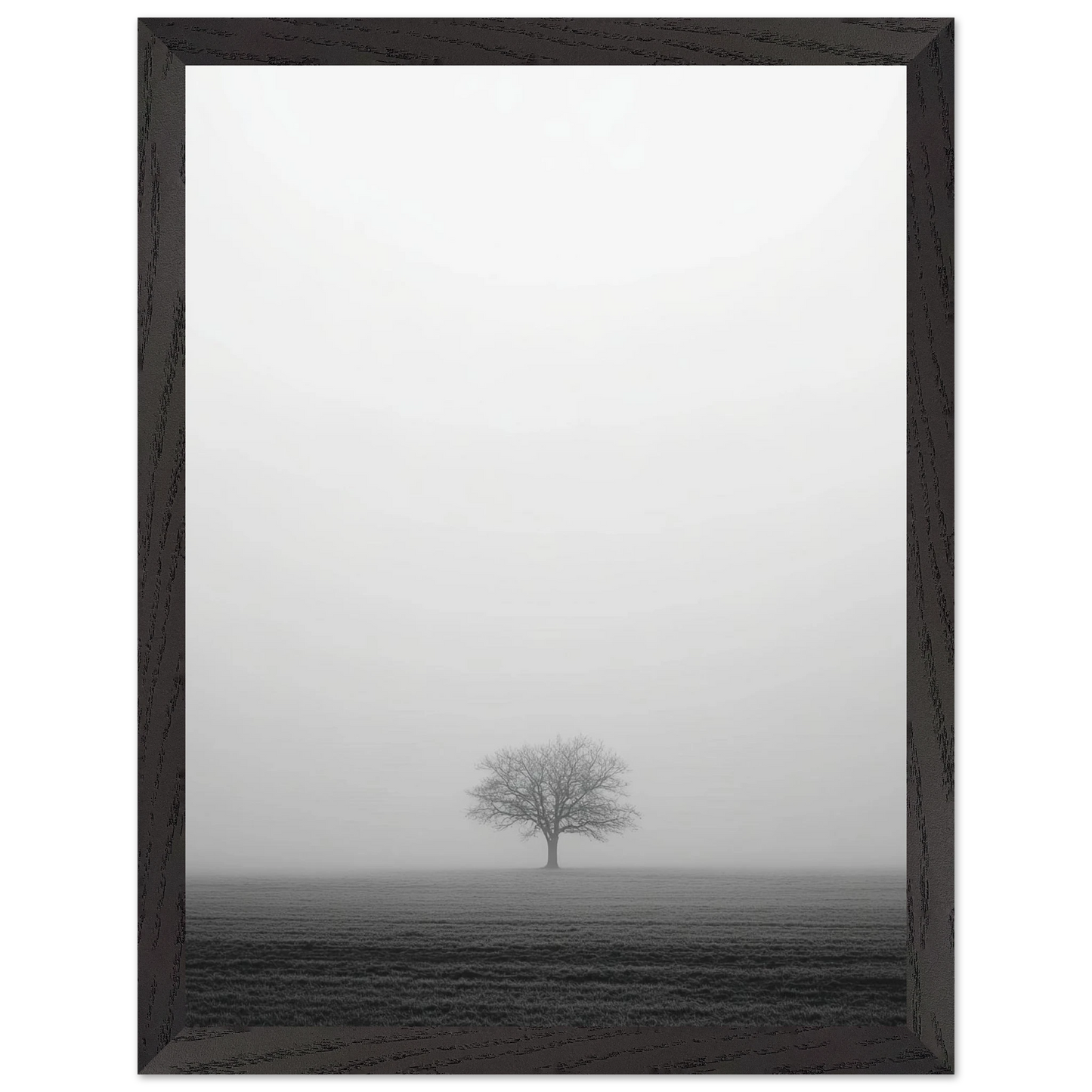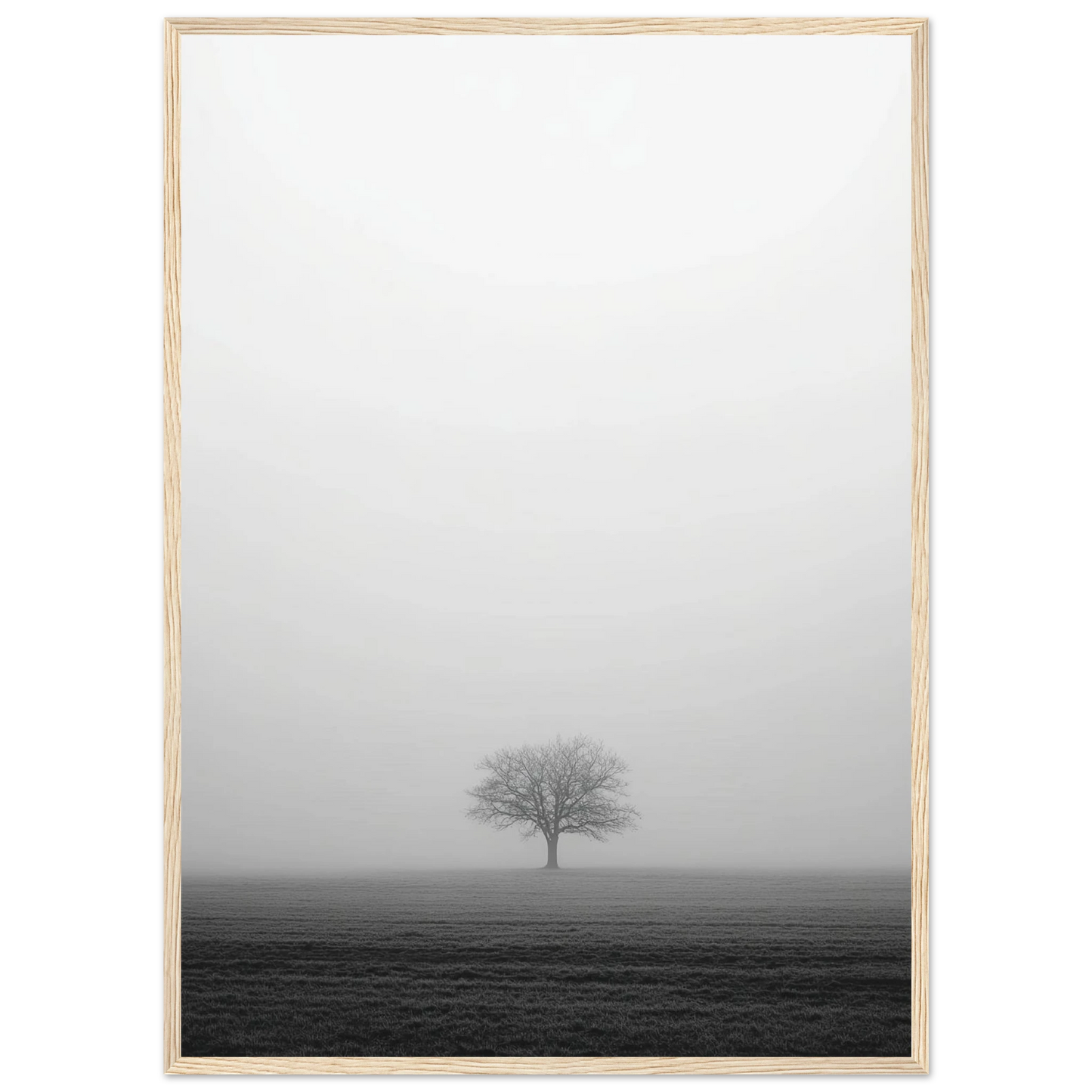 Et minimalistisk fotografisk kunstverk som viser et ensomt tre omgitt av tåke. Det enkle motivet fremhever kontrasten mellom naturens styrke og stillhet, og gir rommet en meditativ og tidløs stemning. Perfekt for deg som ønsker et rolig og poetisk uttrykk på veggen.