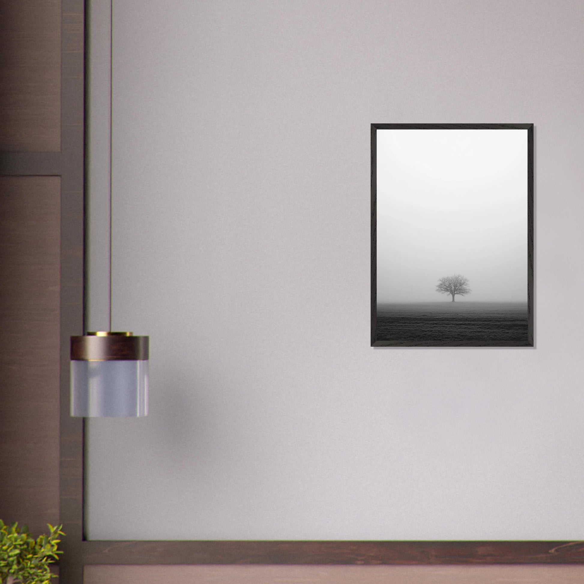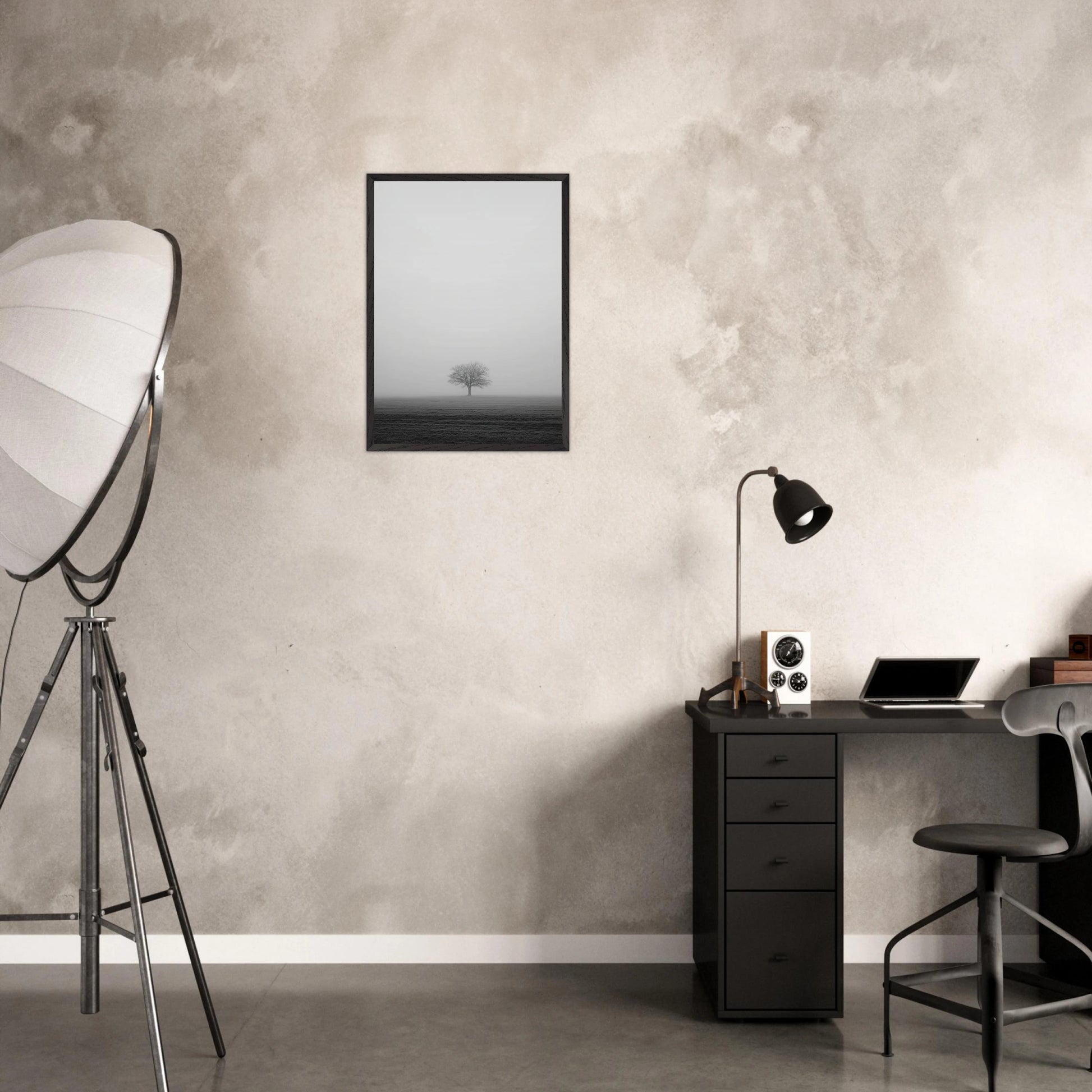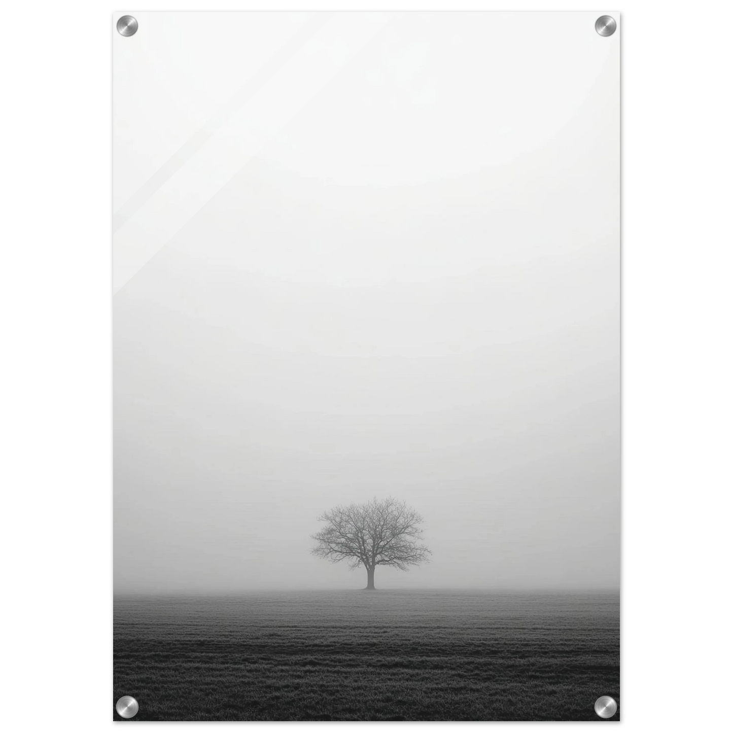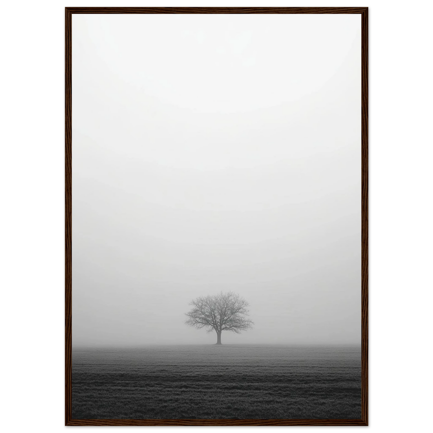Et minimalistisk fotografisk kunstverk som viser et ensomt tre omgitt av tåke. Det enkle motivet fremhever kontrasten mellom naturens styrke og stillhet, og gir rommet en meditativ og tidløs stemning. Perfekt for deg som ønsker et rolig og poetisk uttrykk på veggen.