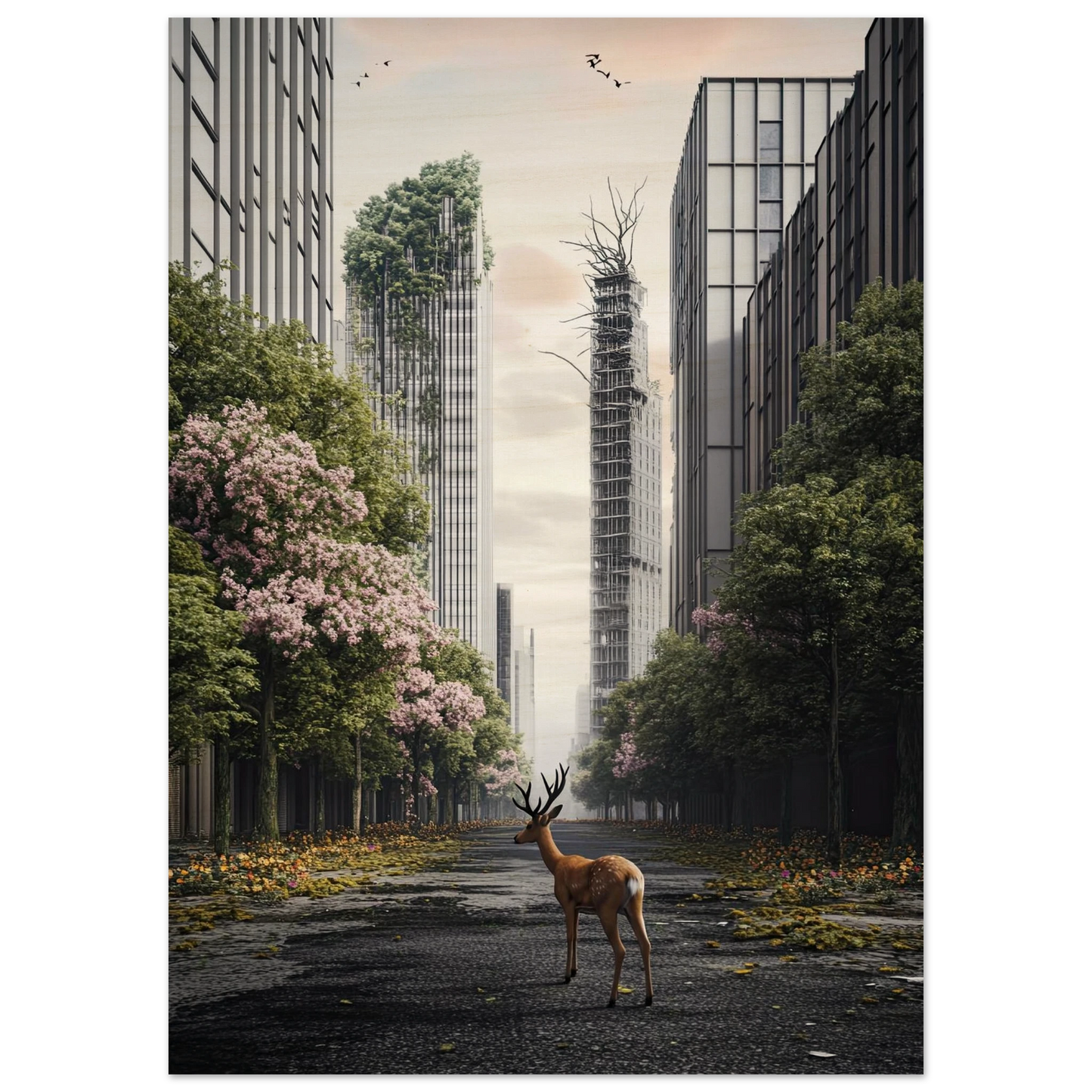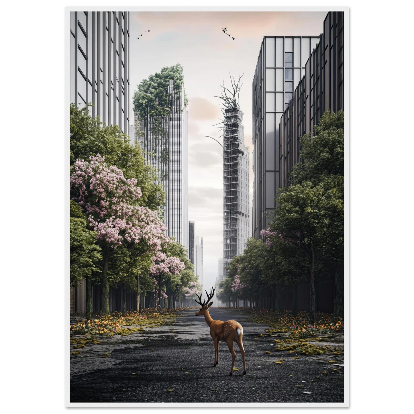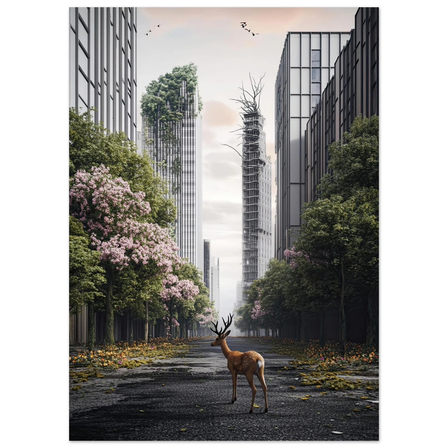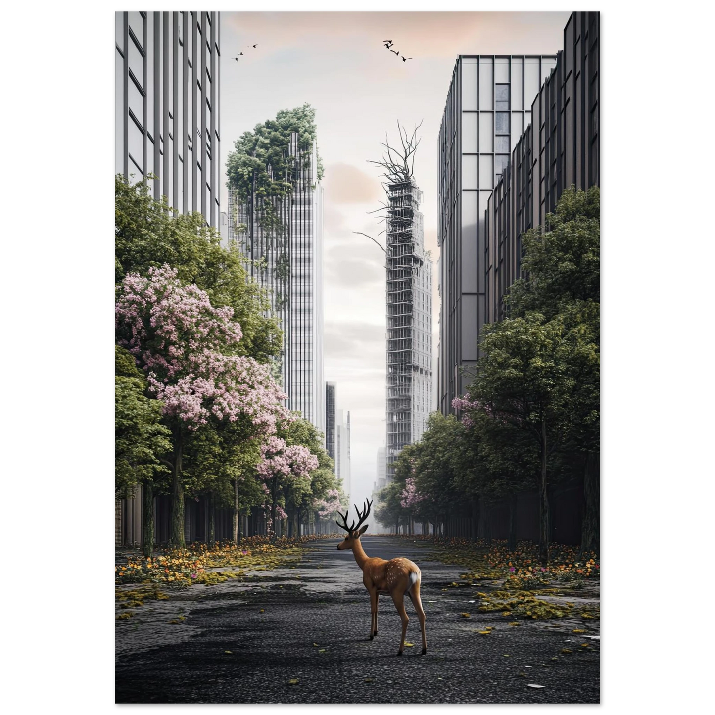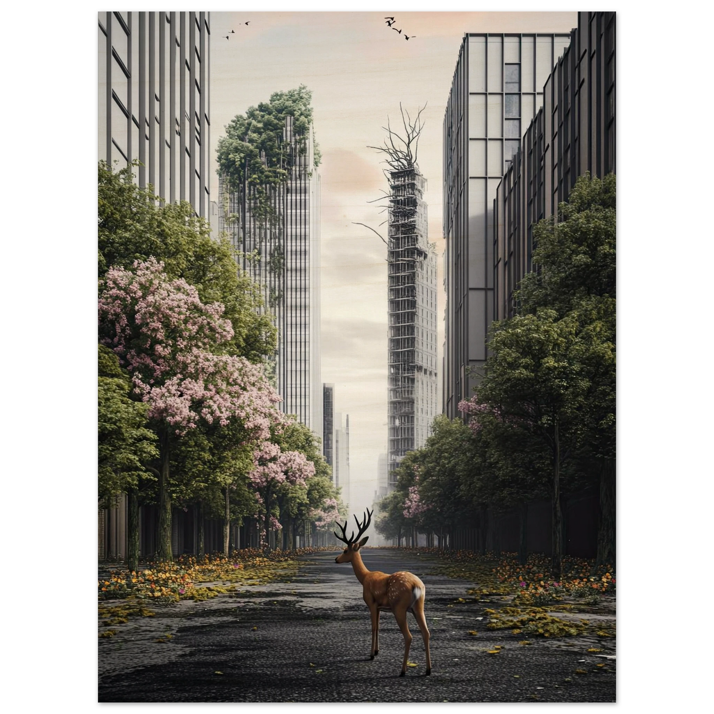 Et stillferdig og sterkt kunstverk som skildrer hvordan naturen finner veien tilbake gjennom byens ruiner. Den majestetiske hjorten står alene i den overgrodde avenyen, omgitt av blomstrende trær og forlatte bygninger. Perfekt for deg som ønsker et bilde med dybde, ettertanke og stille kraft.