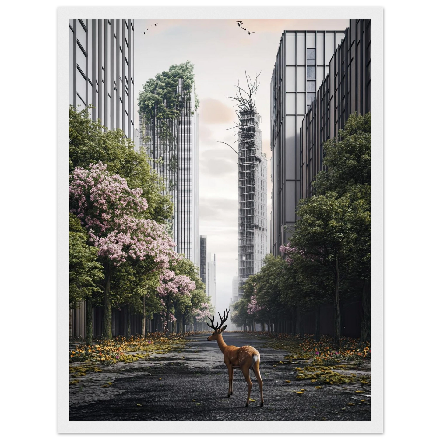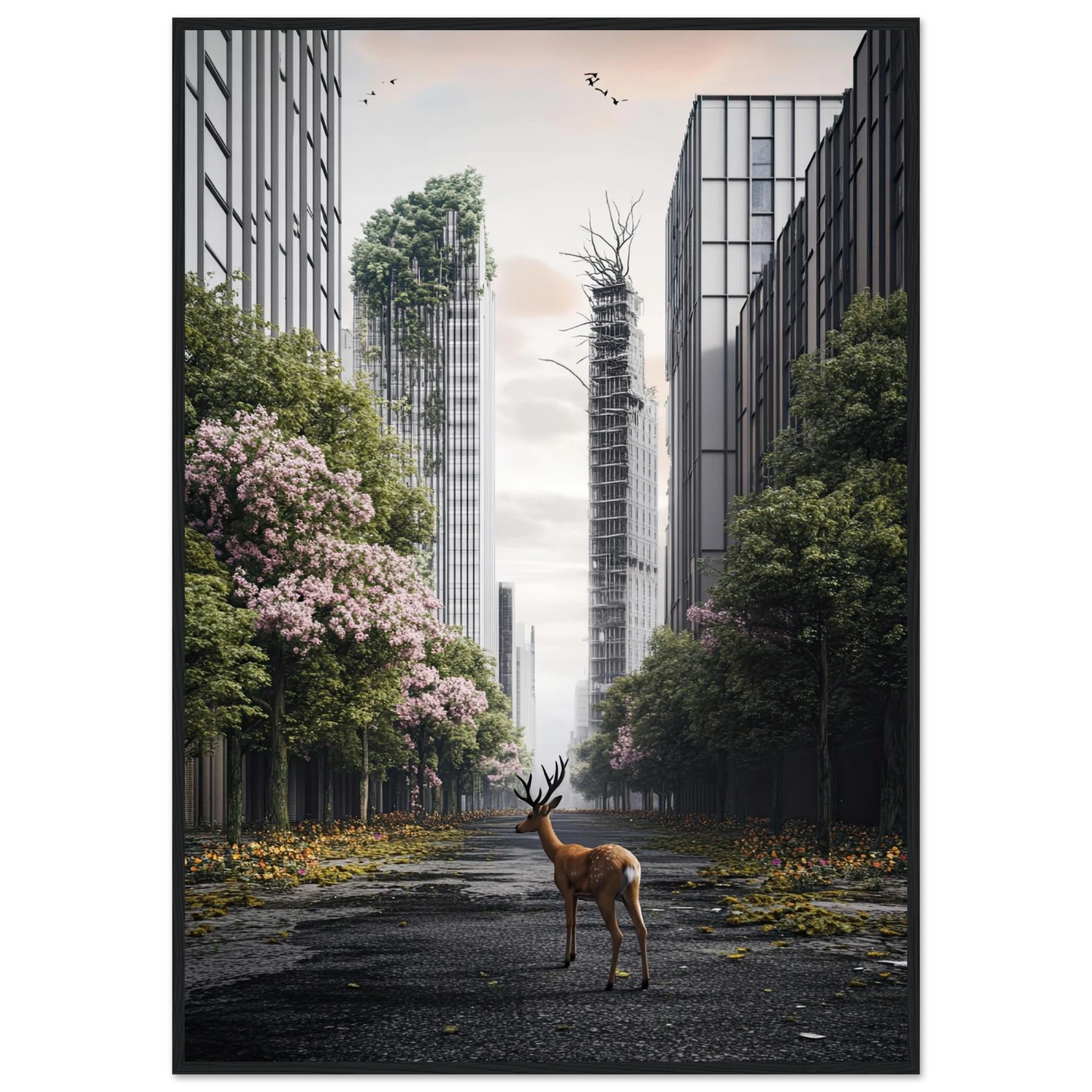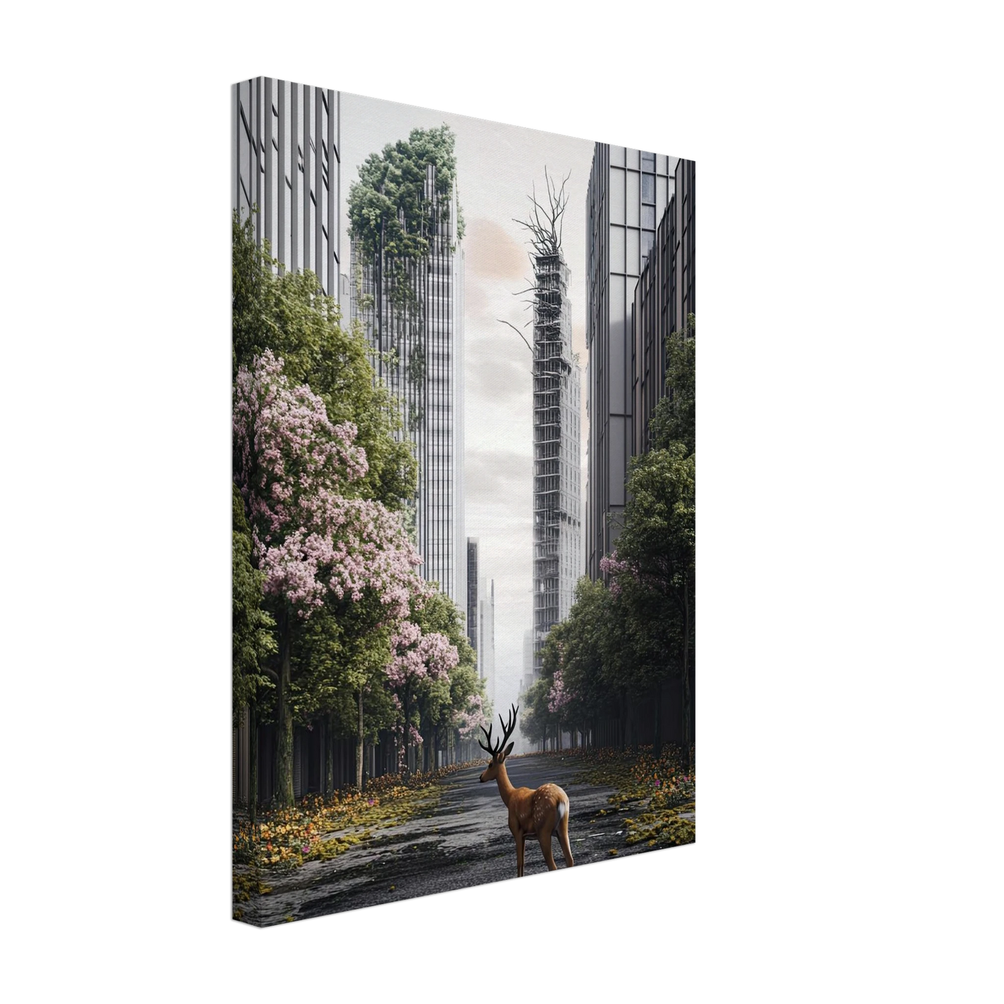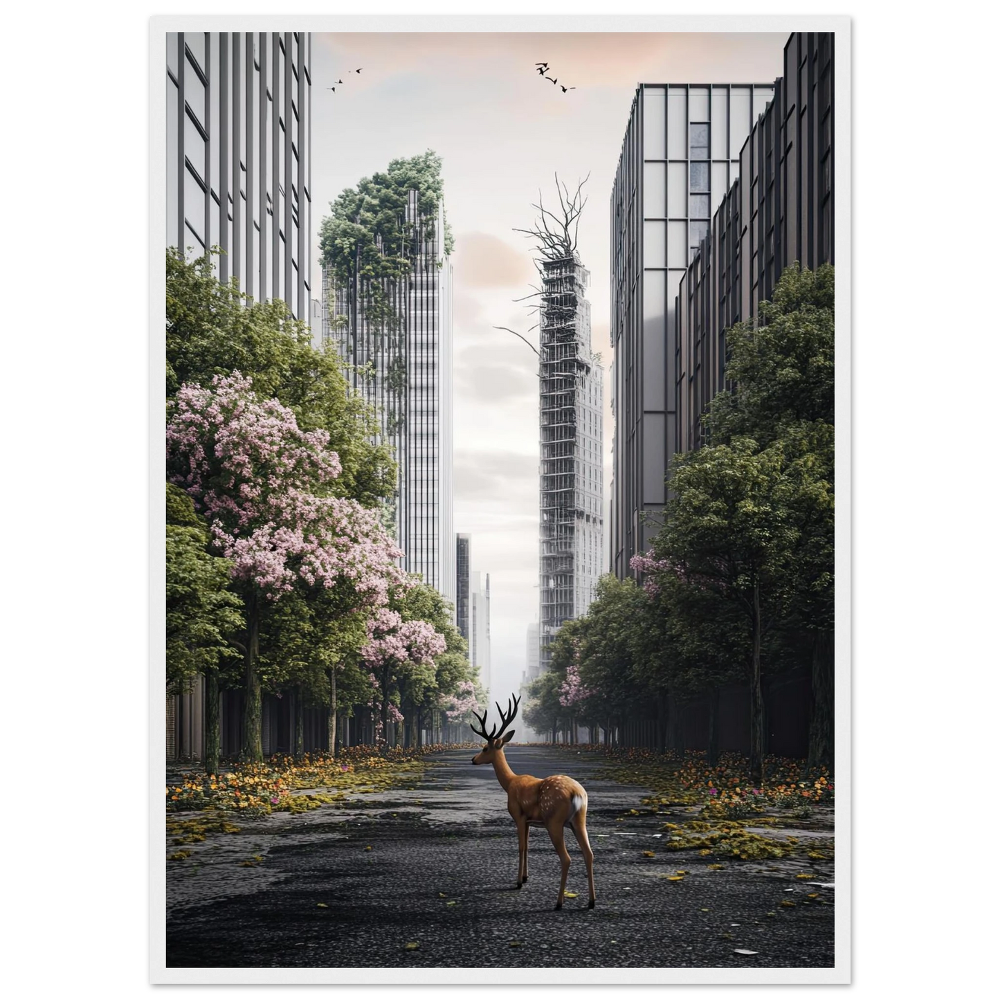 Et stillferdig og sterkt kunstverk som skildrer hvordan naturen finner veien tilbake gjennom byens ruiner. Den majestetiske hjorten står alene i den overgrodde avenyen, omgitt av blomstrende trær og forlatte bygninger. Perfekt for deg som ønsker et bilde med dybde, ettertanke og stille kraft.