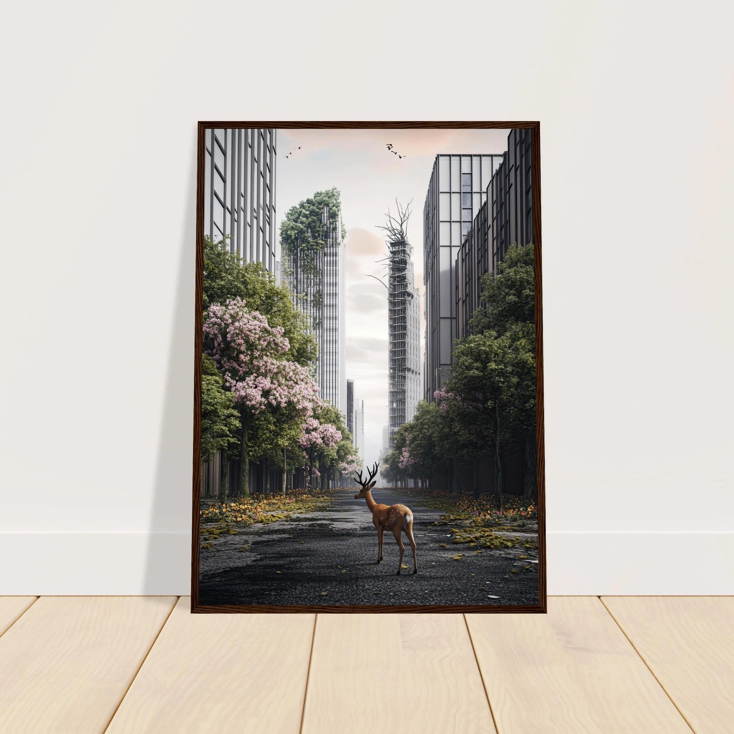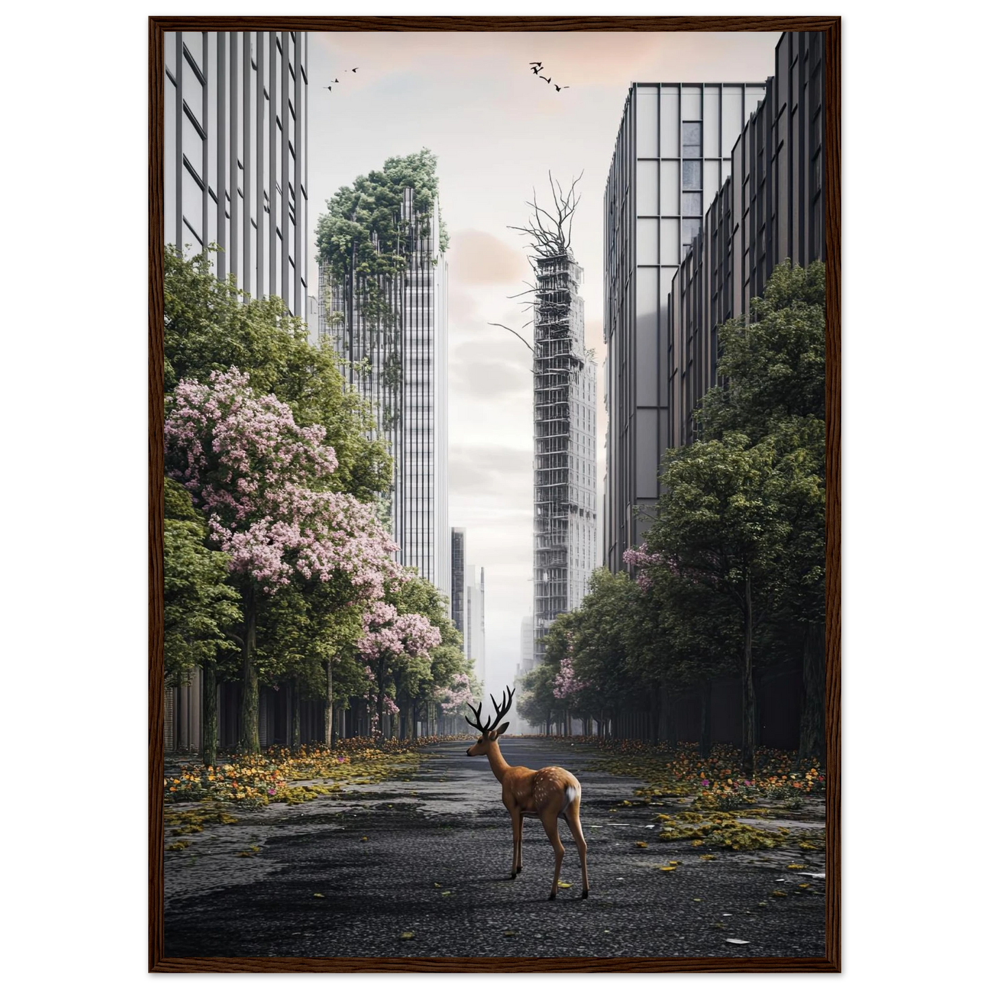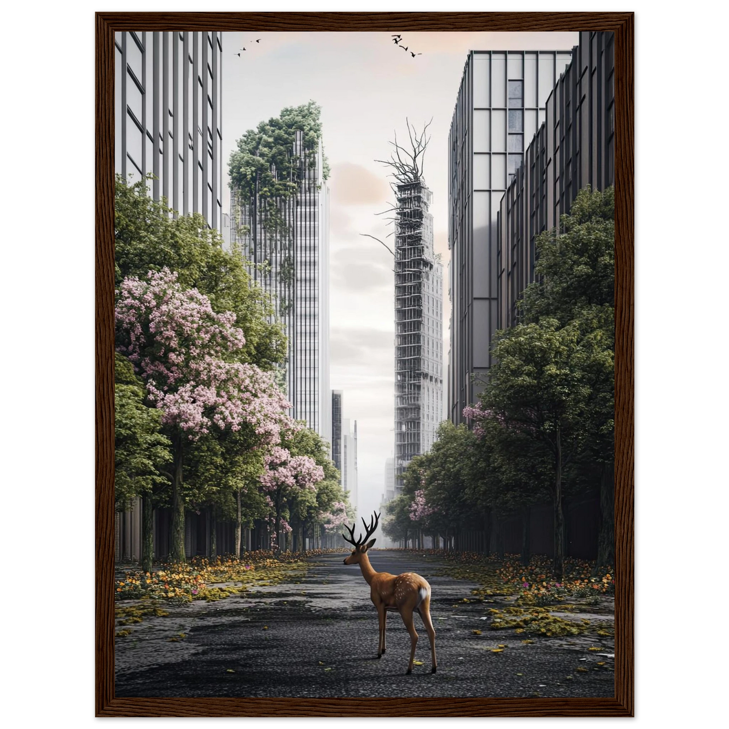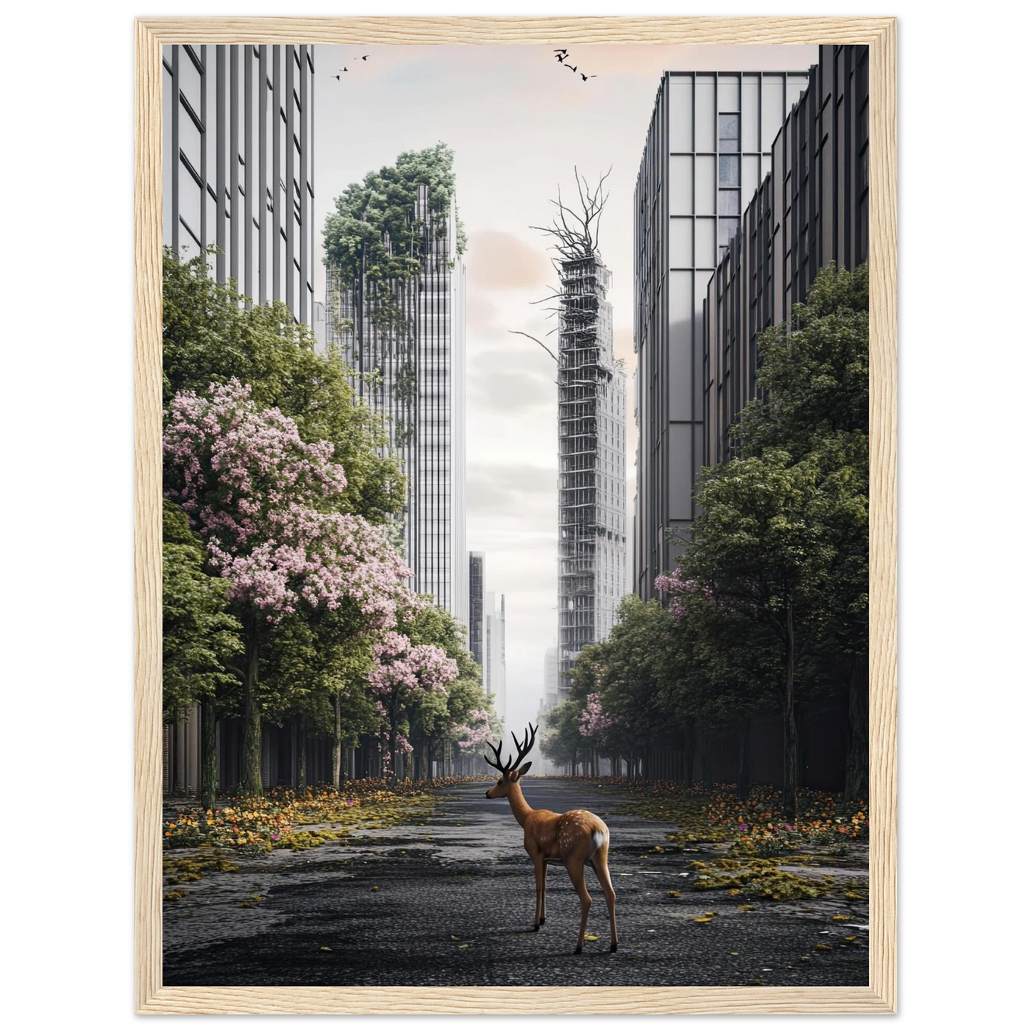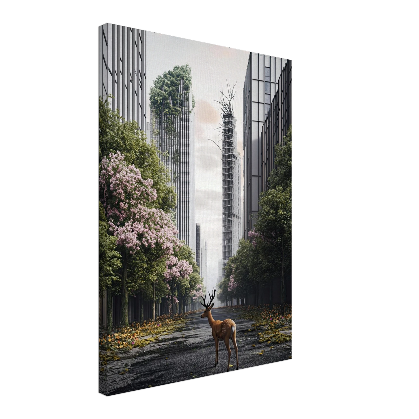 Et stillferdig og sterkt kunstverk som skildrer hvordan naturen finner veien tilbake gjennom byens ruiner. Den majestetiske hjorten står alene i den overgrodde avenyen, omgitt av blomstrende trær og forlatte bygninger. Perfekt for deg som ønsker et bilde med dybde, ettertanke og stille kraft.