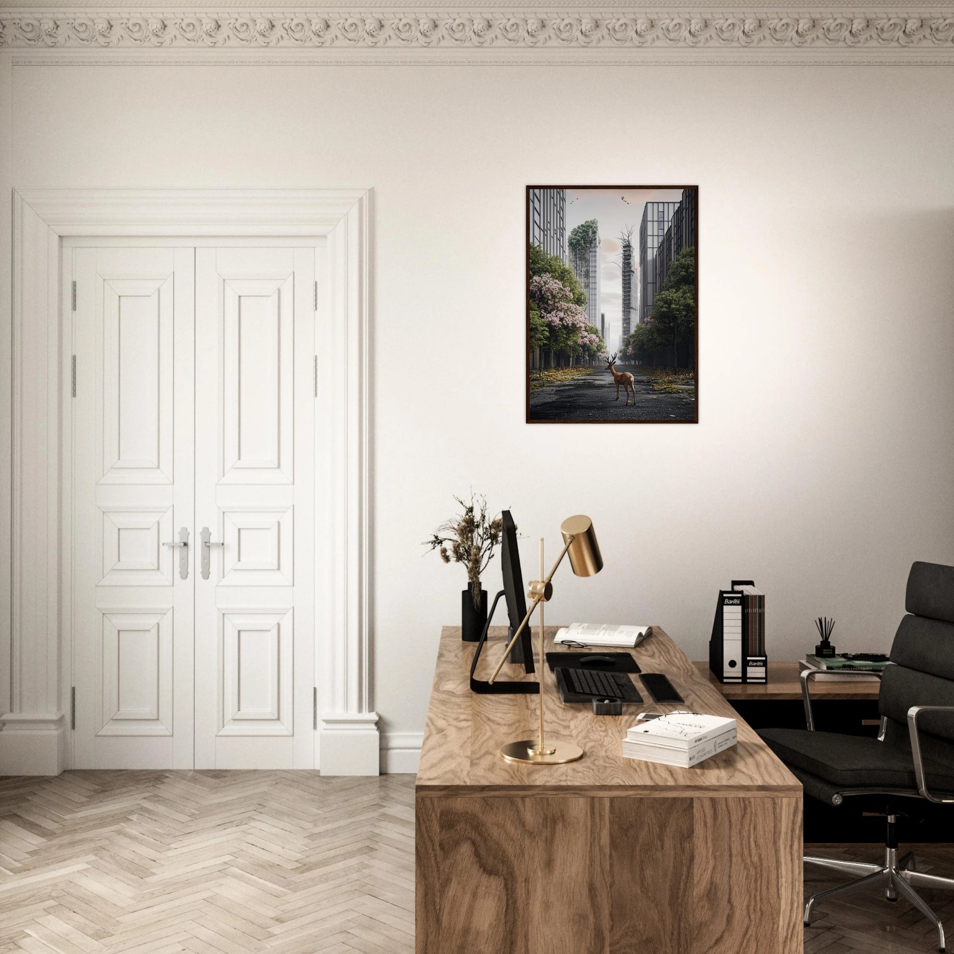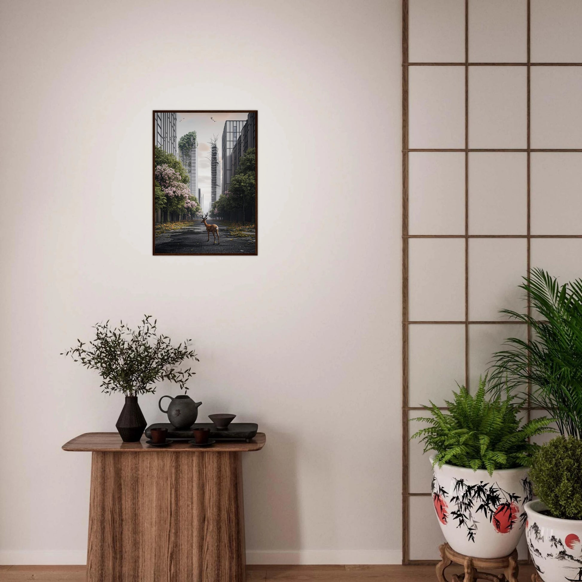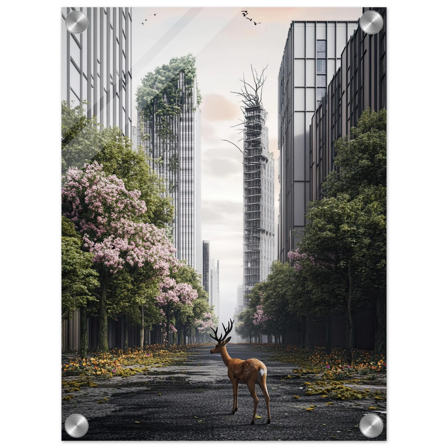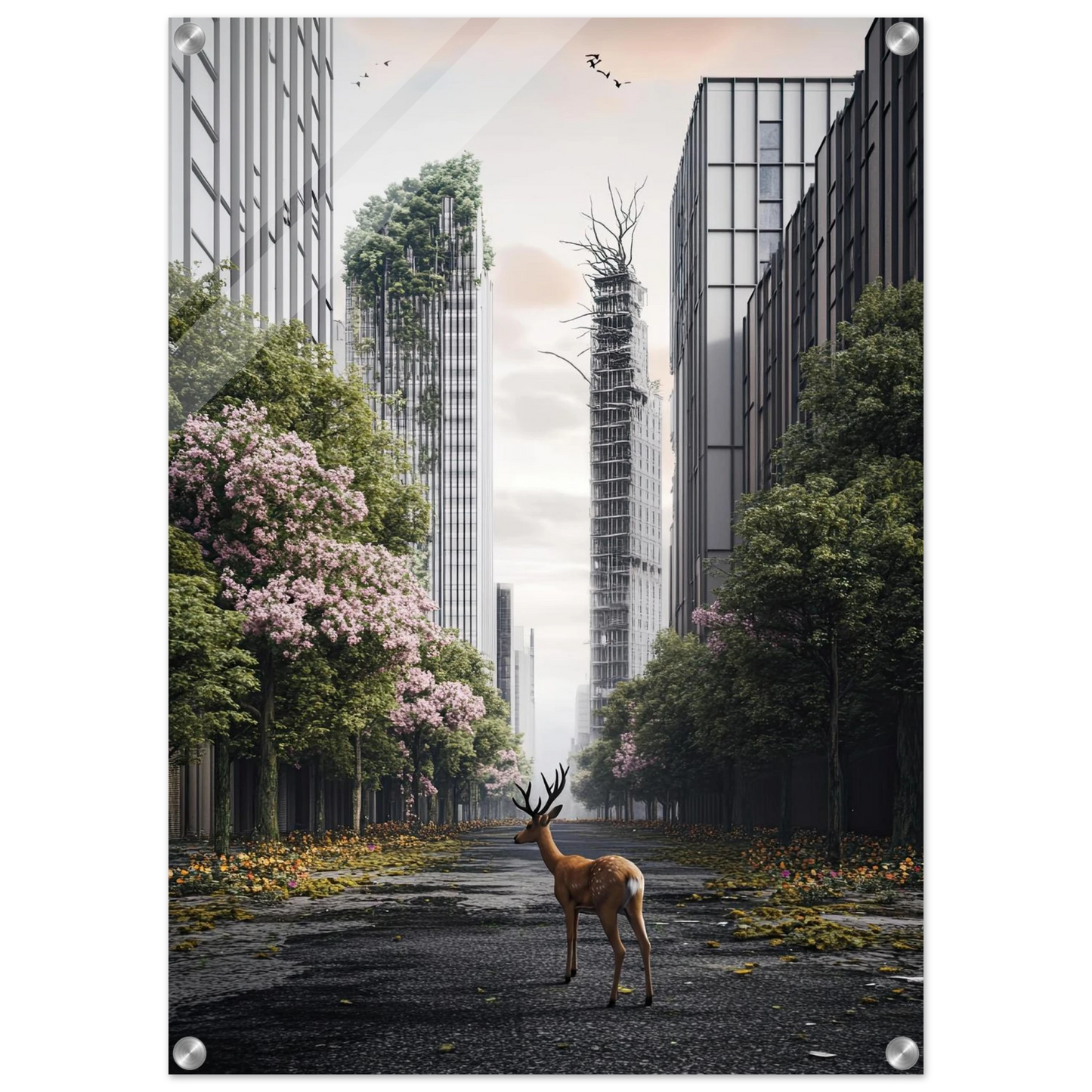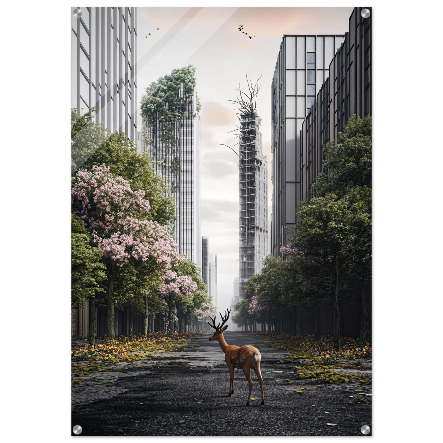 Et stillferdig og sterkt kunstverk som skildrer hvordan naturen finner veien tilbake gjennom byens ruiner. Den majestetiske hjorten står alene i den overgrodde avenyen, omgitt av blomstrende trær og forlatte bygninger. Perfekt for deg som ønsker et bilde med dybde, ettertanke og stille kraft.