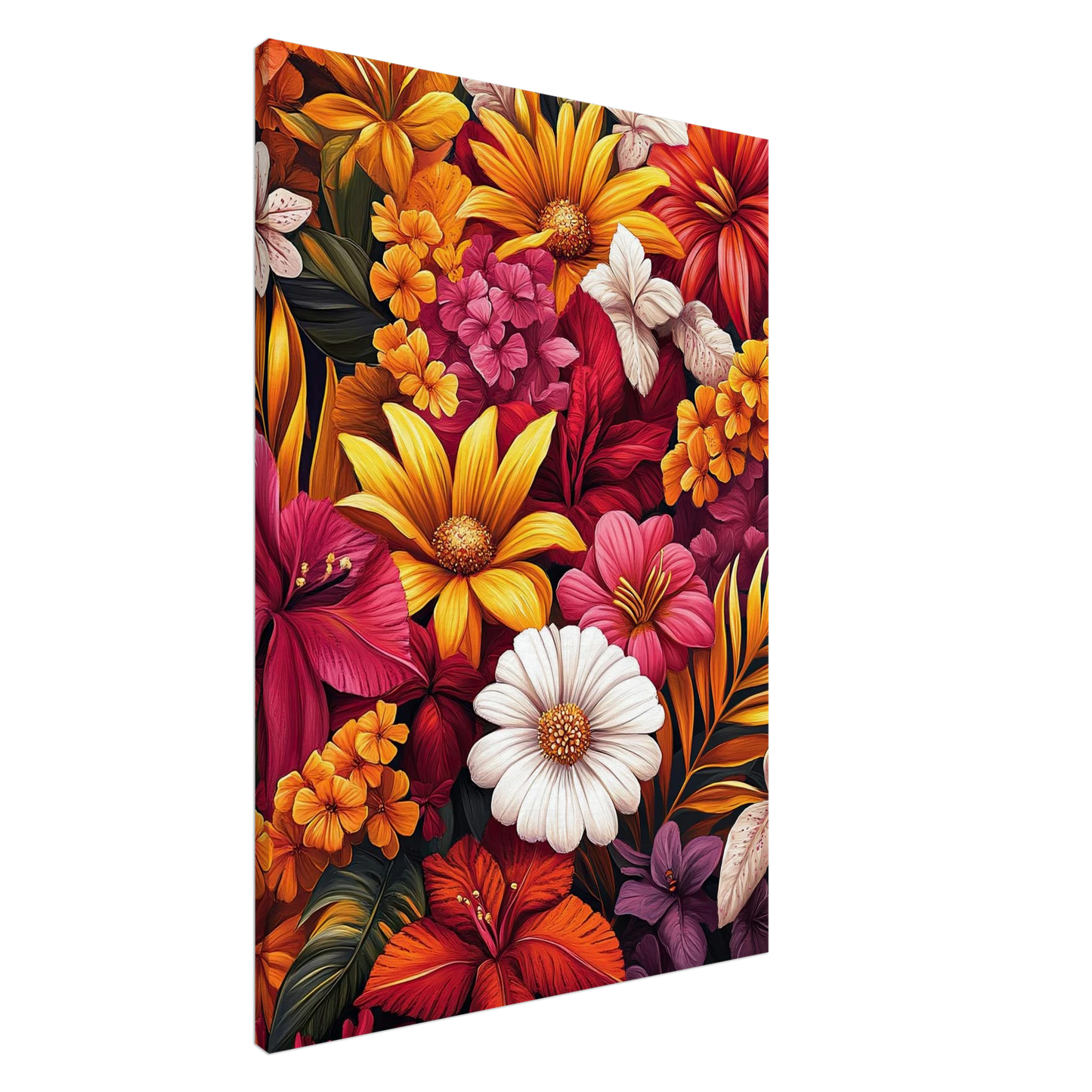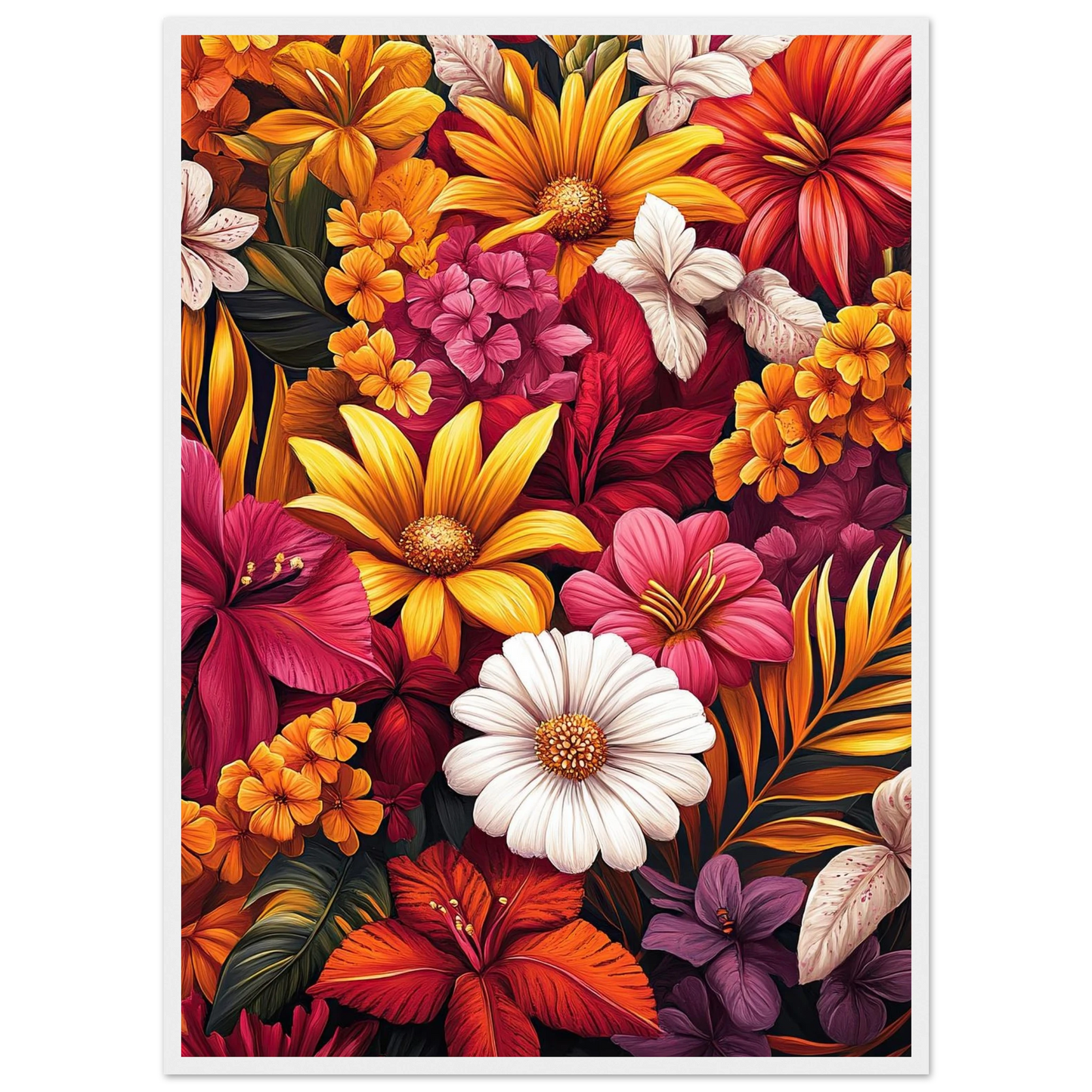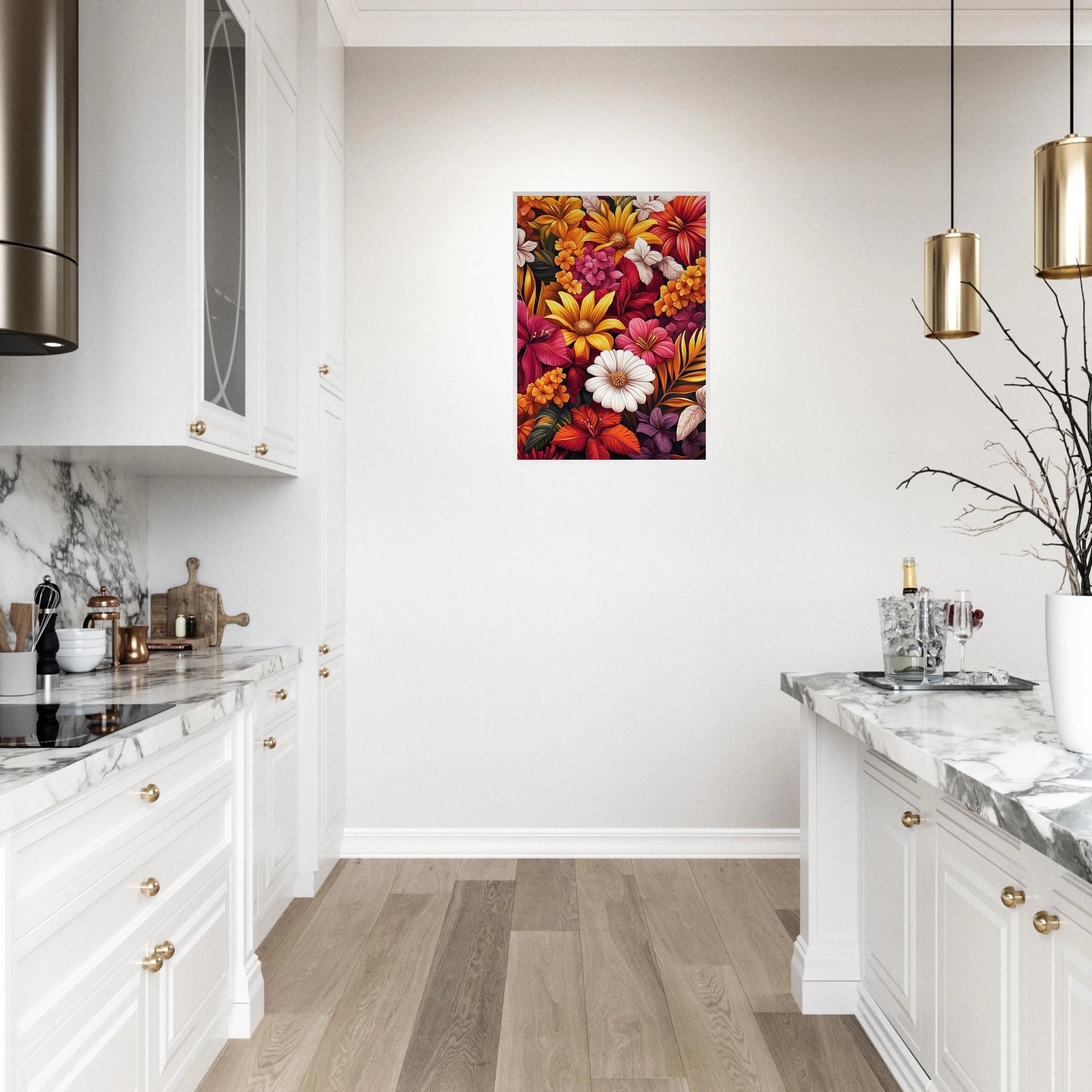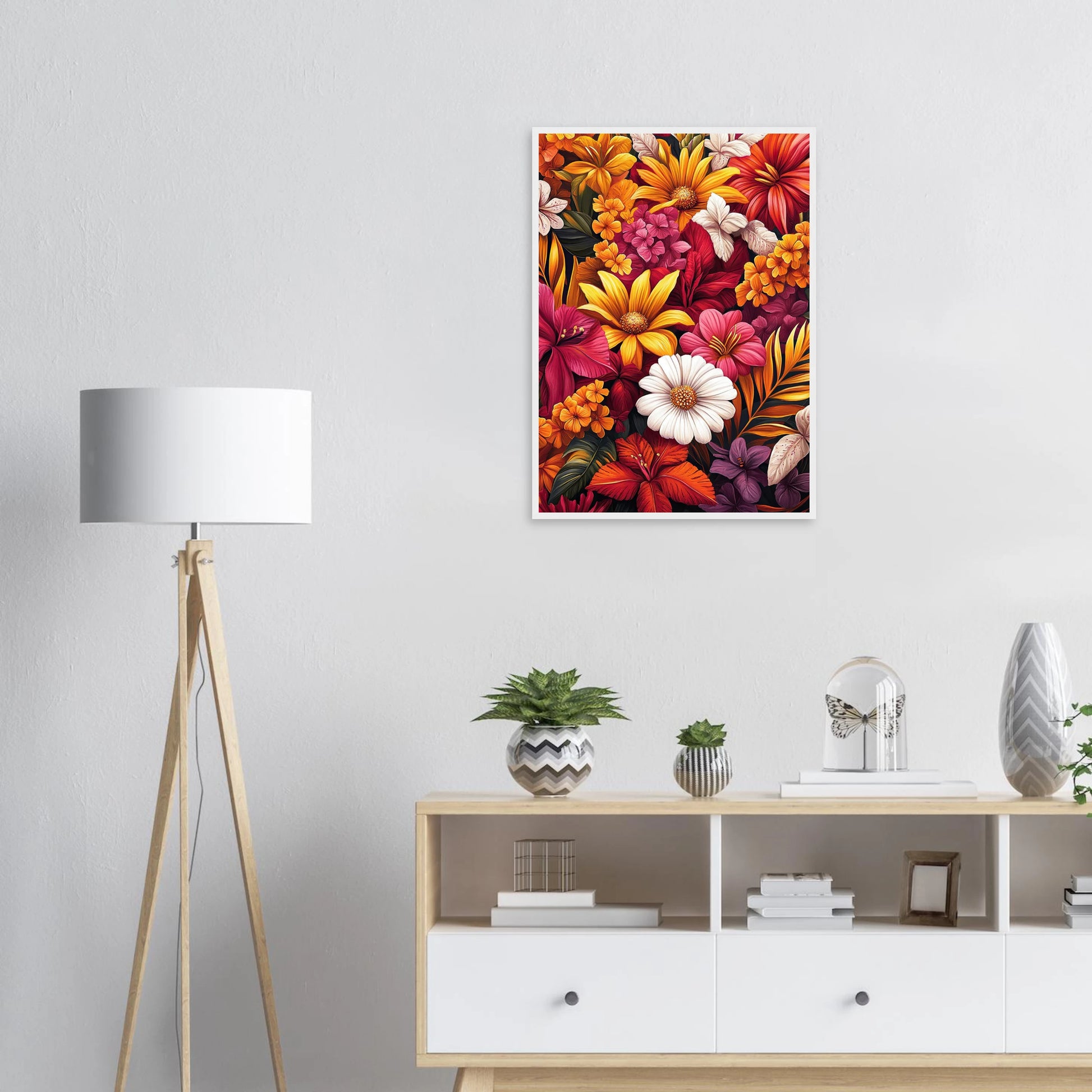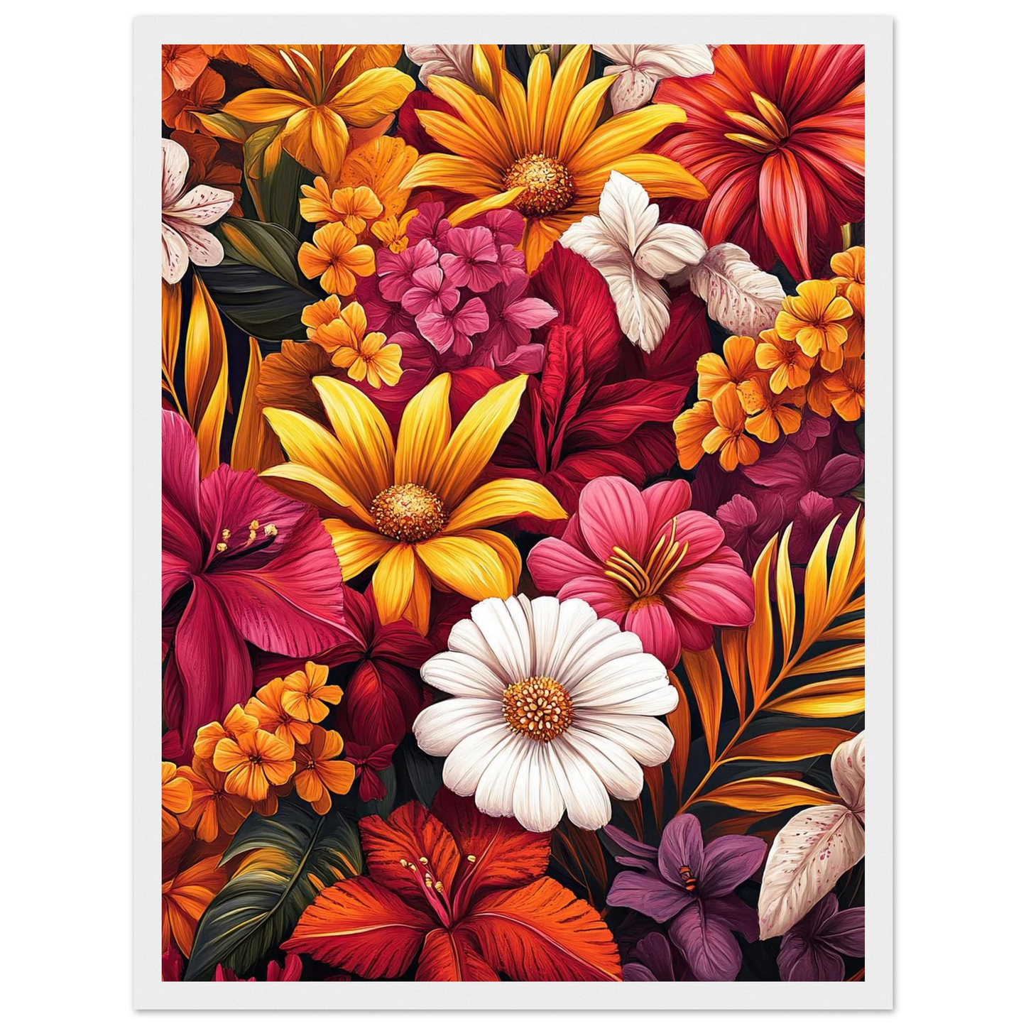 Et livlig og detaljrikt kunstverk som kombinerer varme oransje-, røde-, rosa- og gultoner med friske kontraster av hvitt og lilla. Denne blomsterkomposisjonen sprer glede og energi – perfekt for å skape en varm og innbydende stemning i ethvert rom.