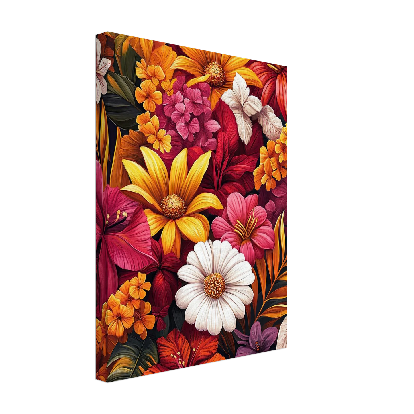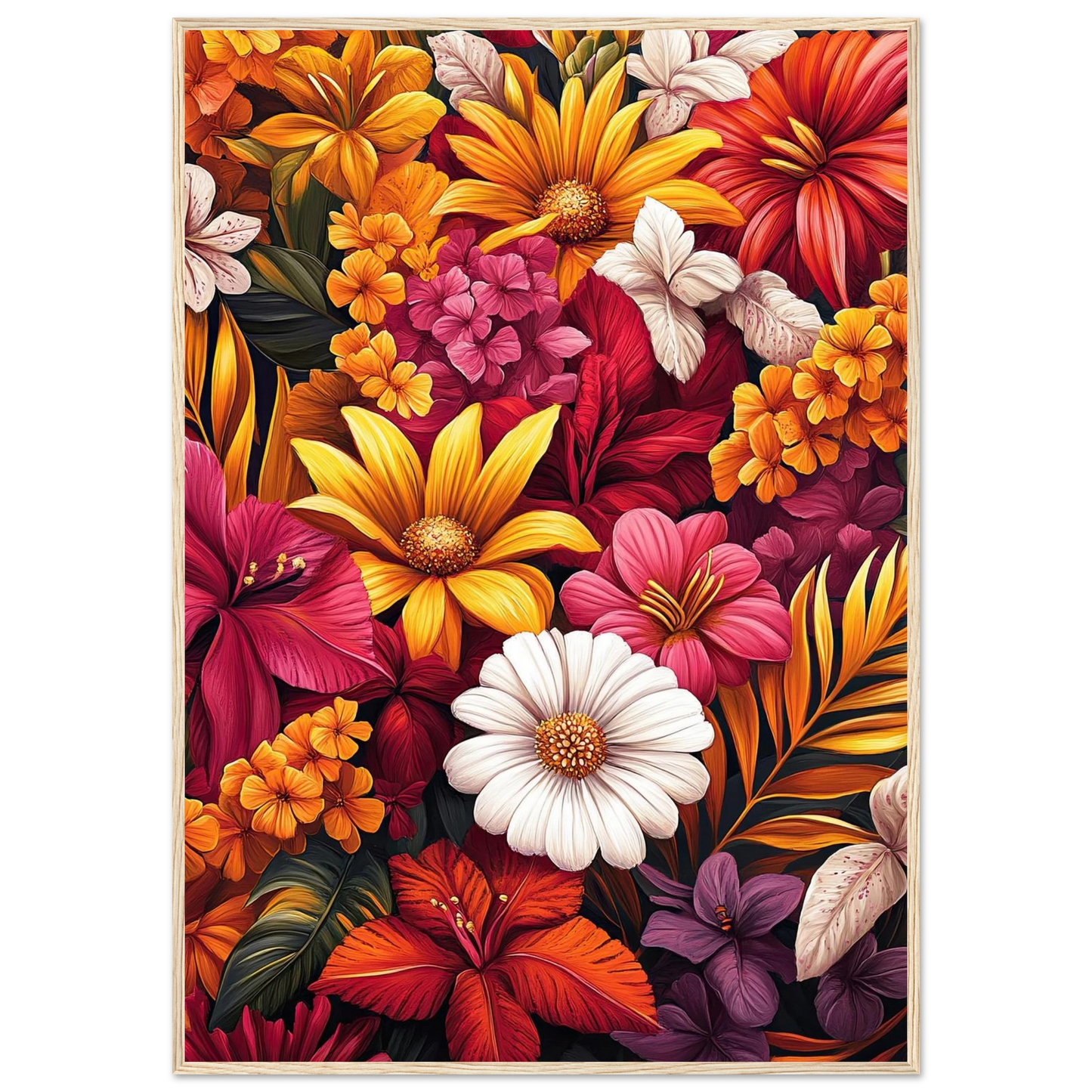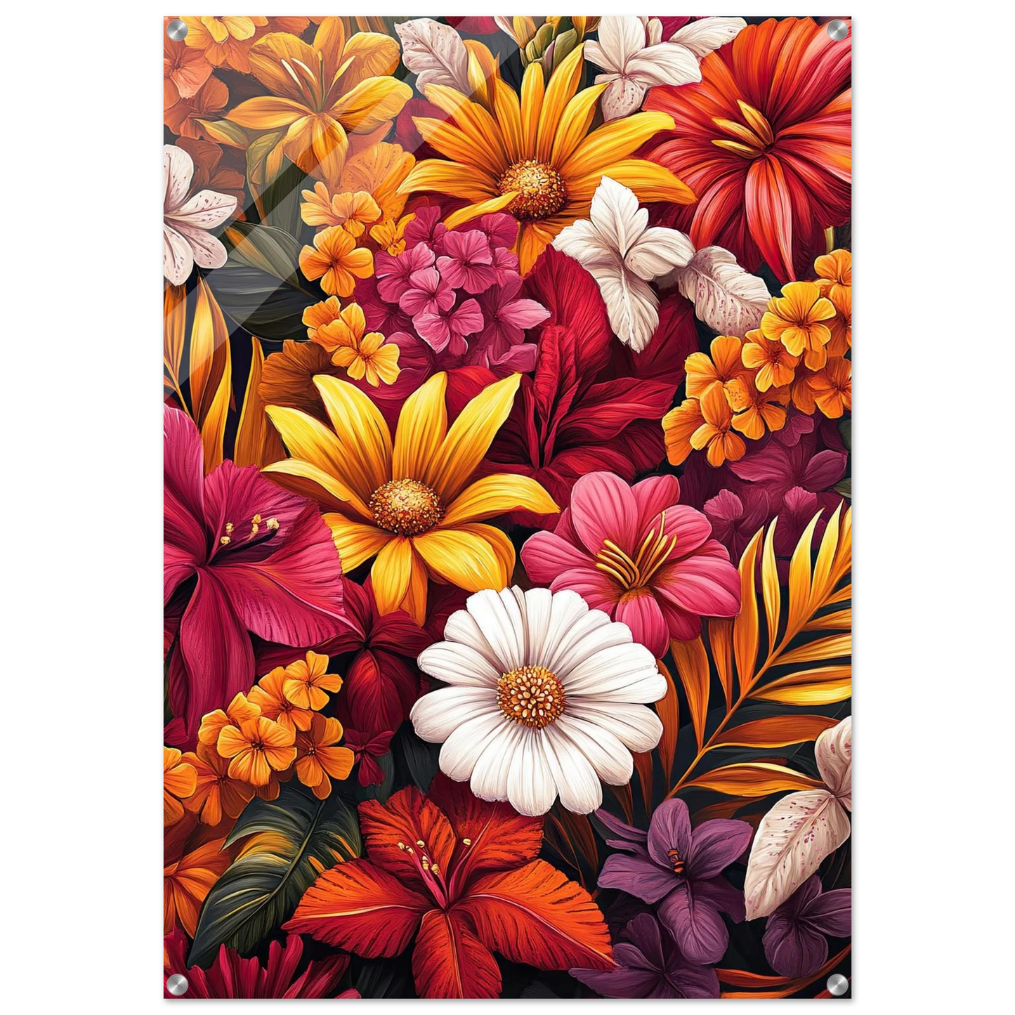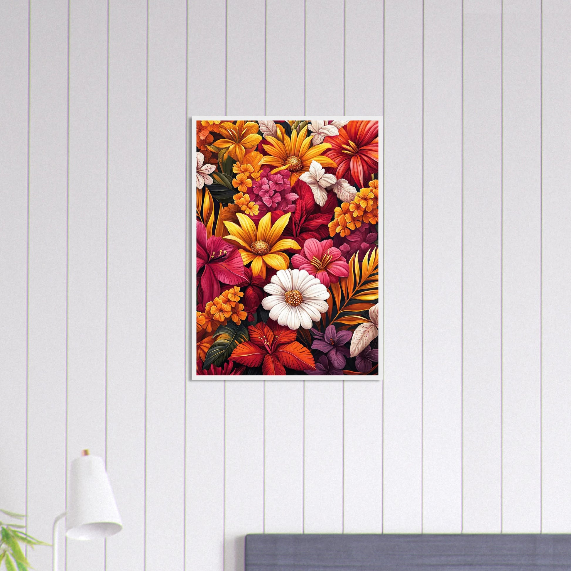 Et livlig og detaljrikt kunstverk som kombinerer varme oransje-, røde-, rosa- og gultoner med friske kontraster av hvitt og lilla. Denne blomsterkomposisjonen sprer glede og energi – perfekt for å skape en varm og innbydende stemning i ethvert rom.