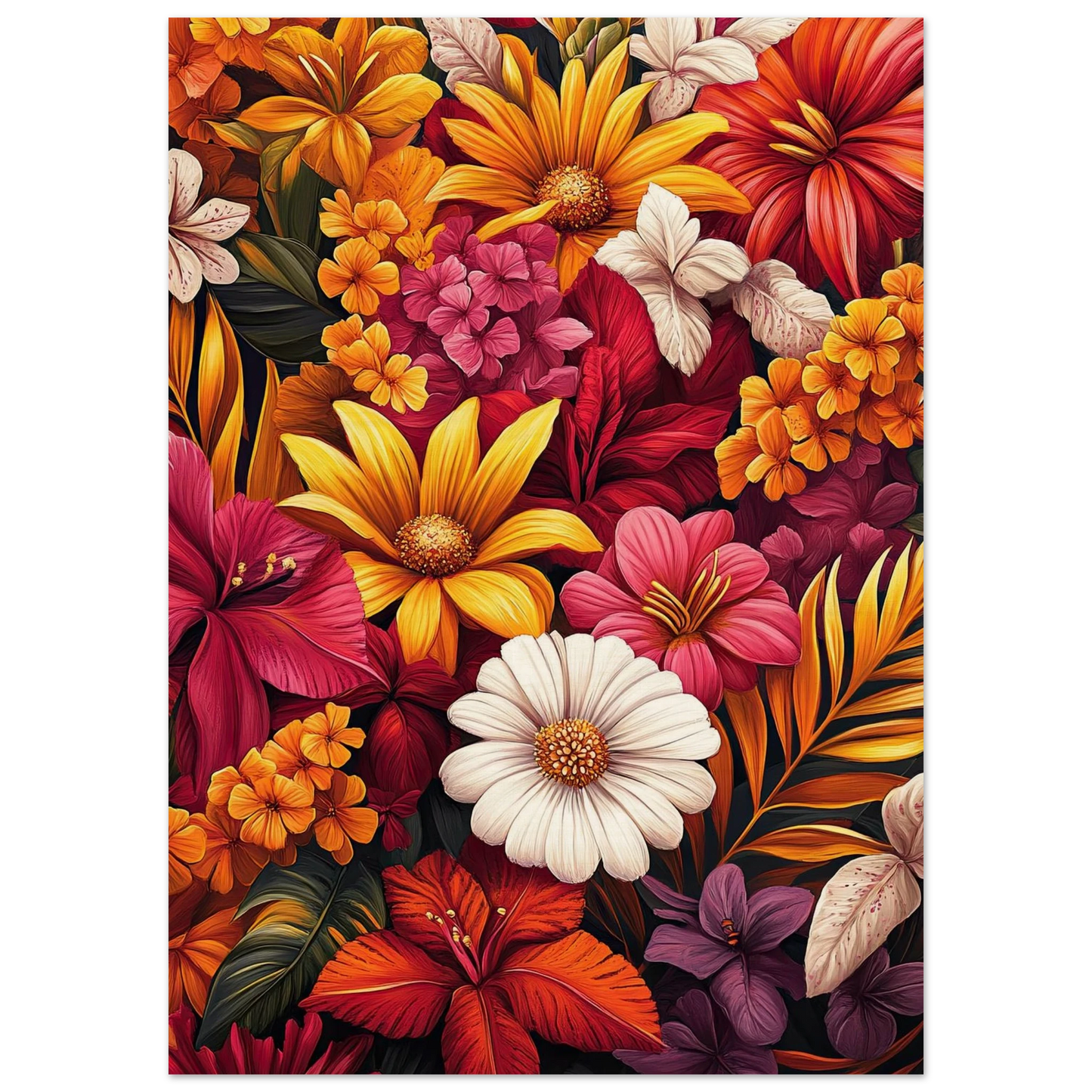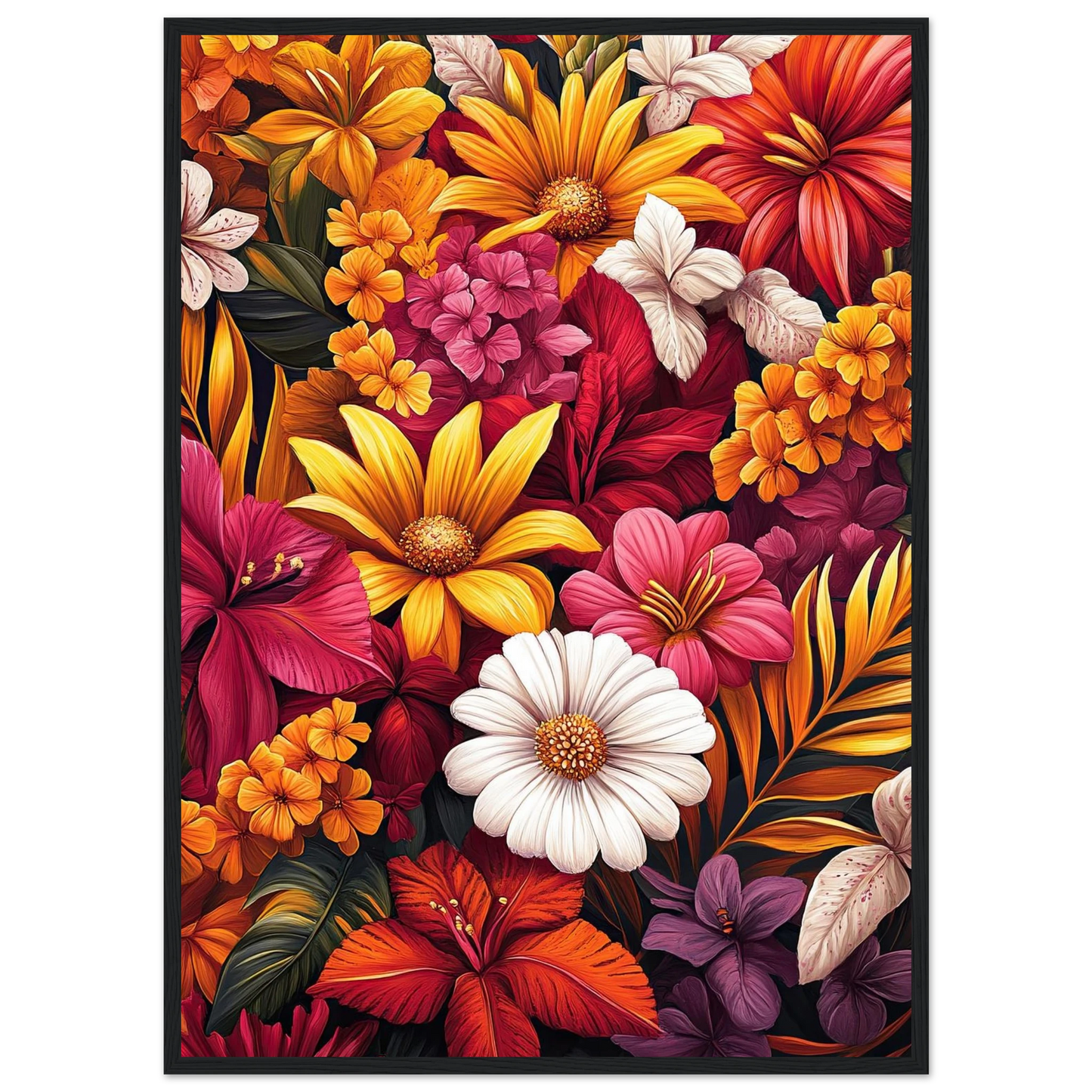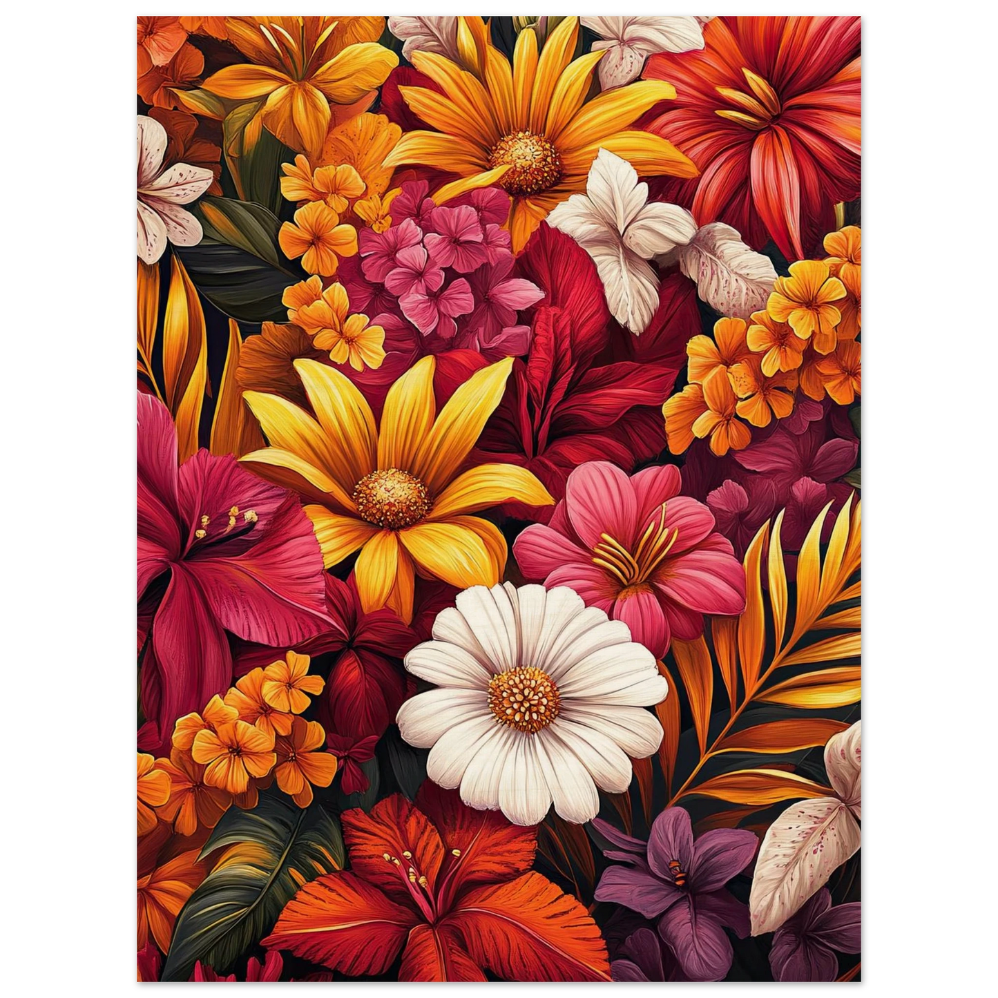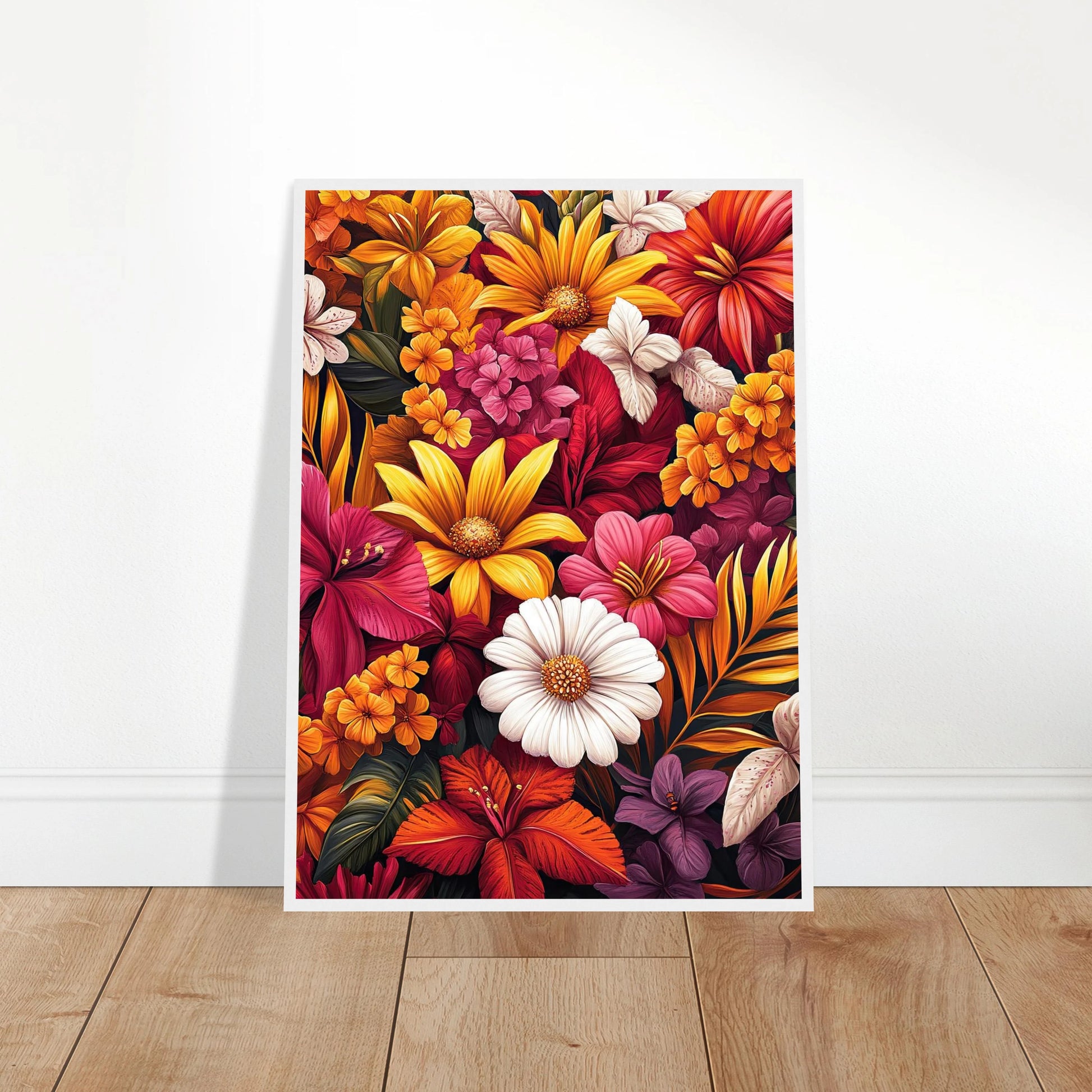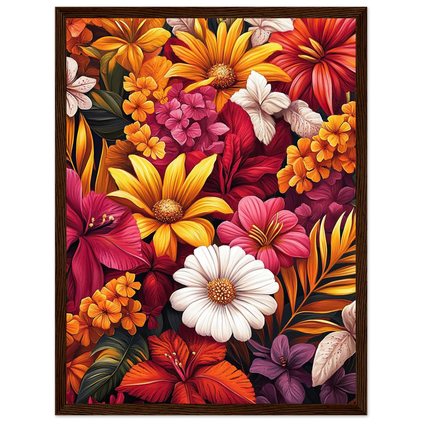 Et livlig og detaljrikt kunstverk som kombinerer varme oransje-, røde-, rosa- og gultoner med friske kontraster av hvitt og lilla. Denne blomsterkomposisjonen sprer glede og energi – perfekt for å skape en varm og innbydende stemning i ethvert rom.