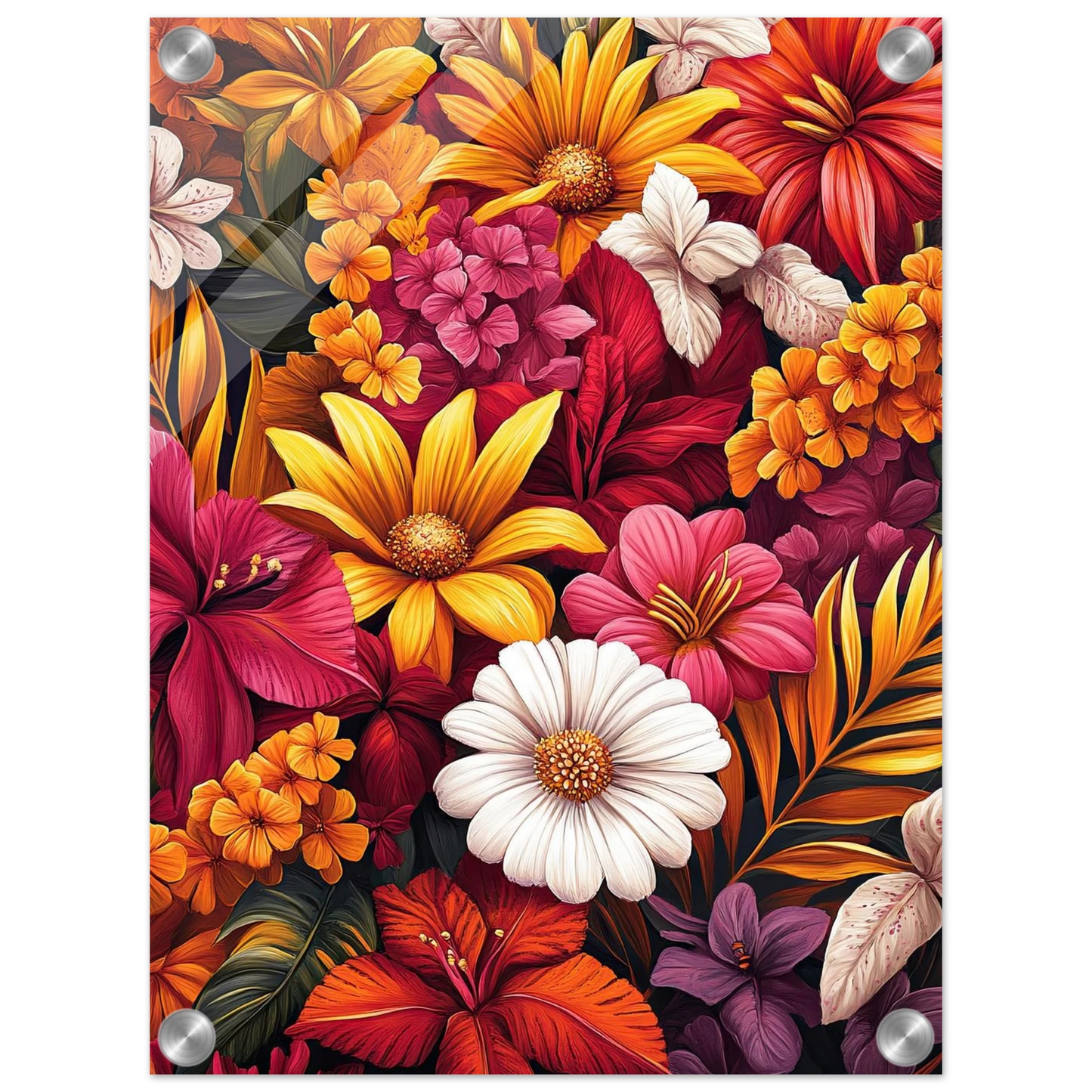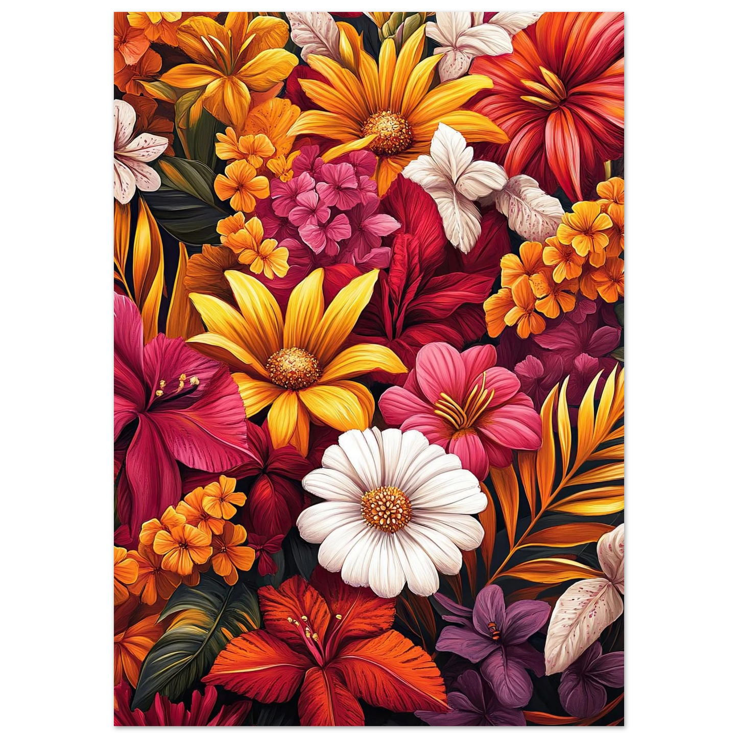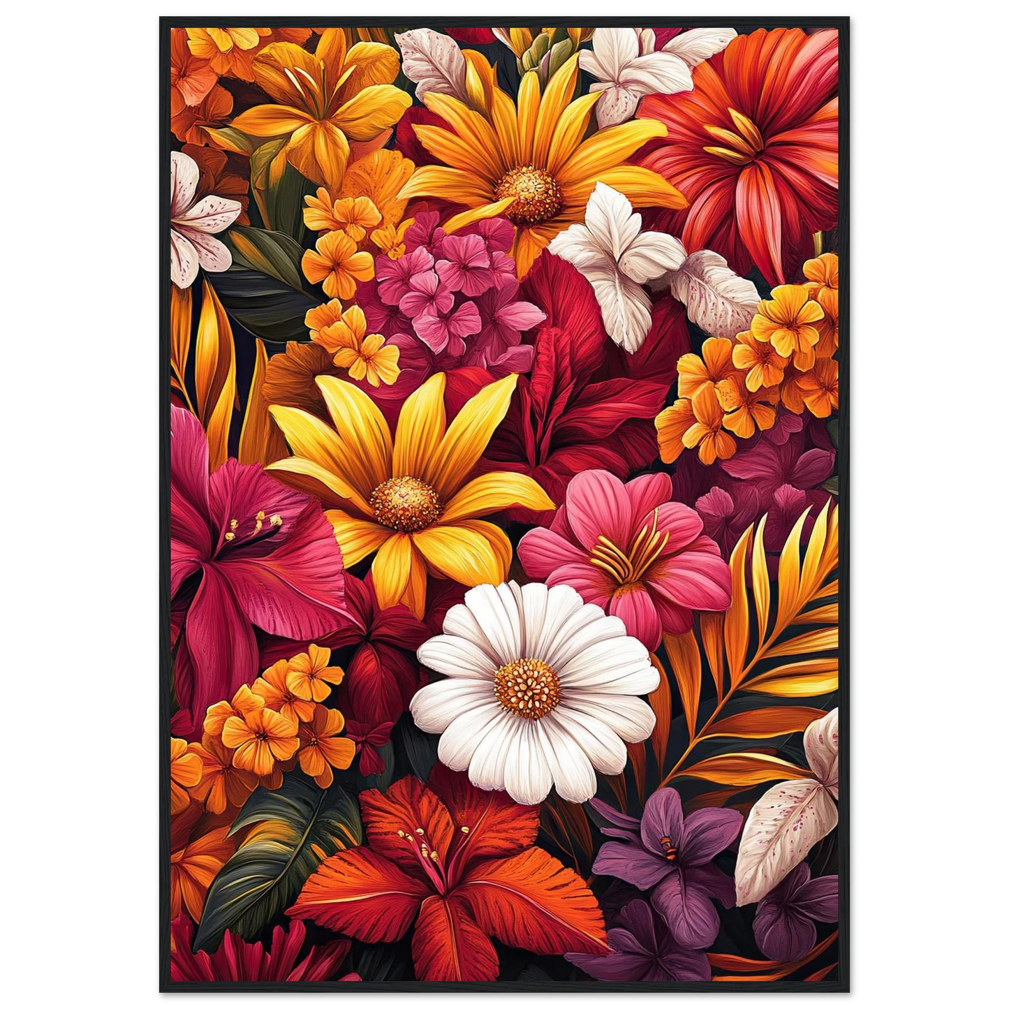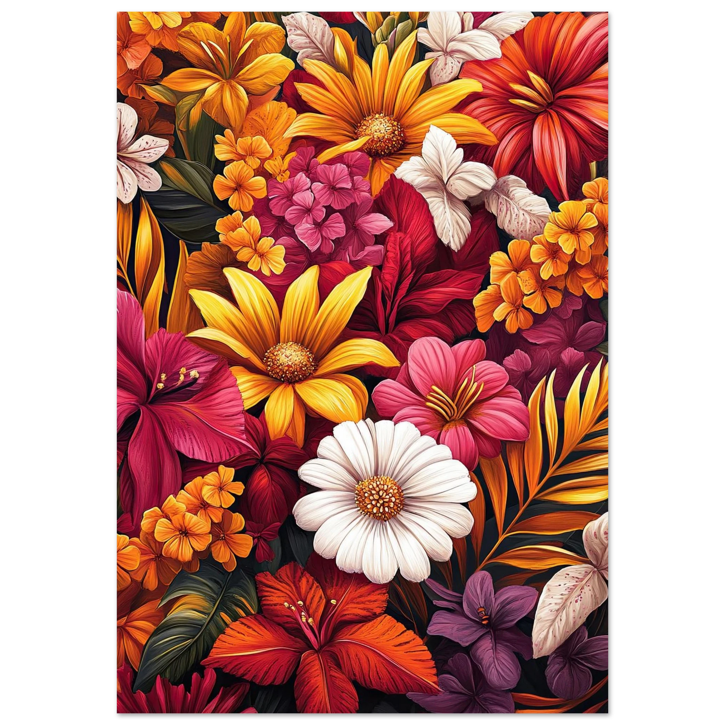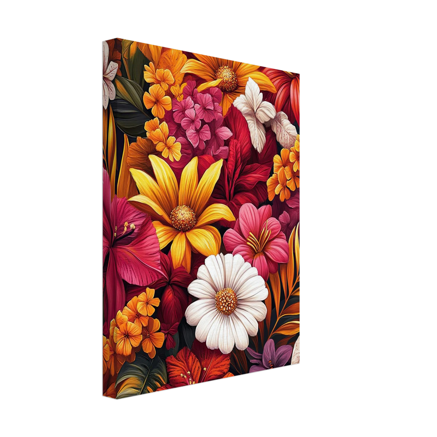 Et livlig og detaljrikt kunstverk som kombinerer varme oransje-, røde-, rosa- og gultoner med friske kontraster av hvitt og lilla. Denne blomsterkomposisjonen sprer glede og energi – perfekt for å skape en varm og innbydende stemning i ethvert rom.