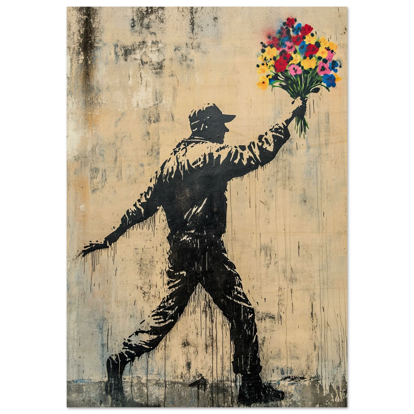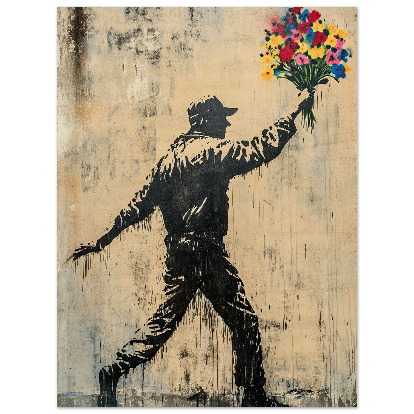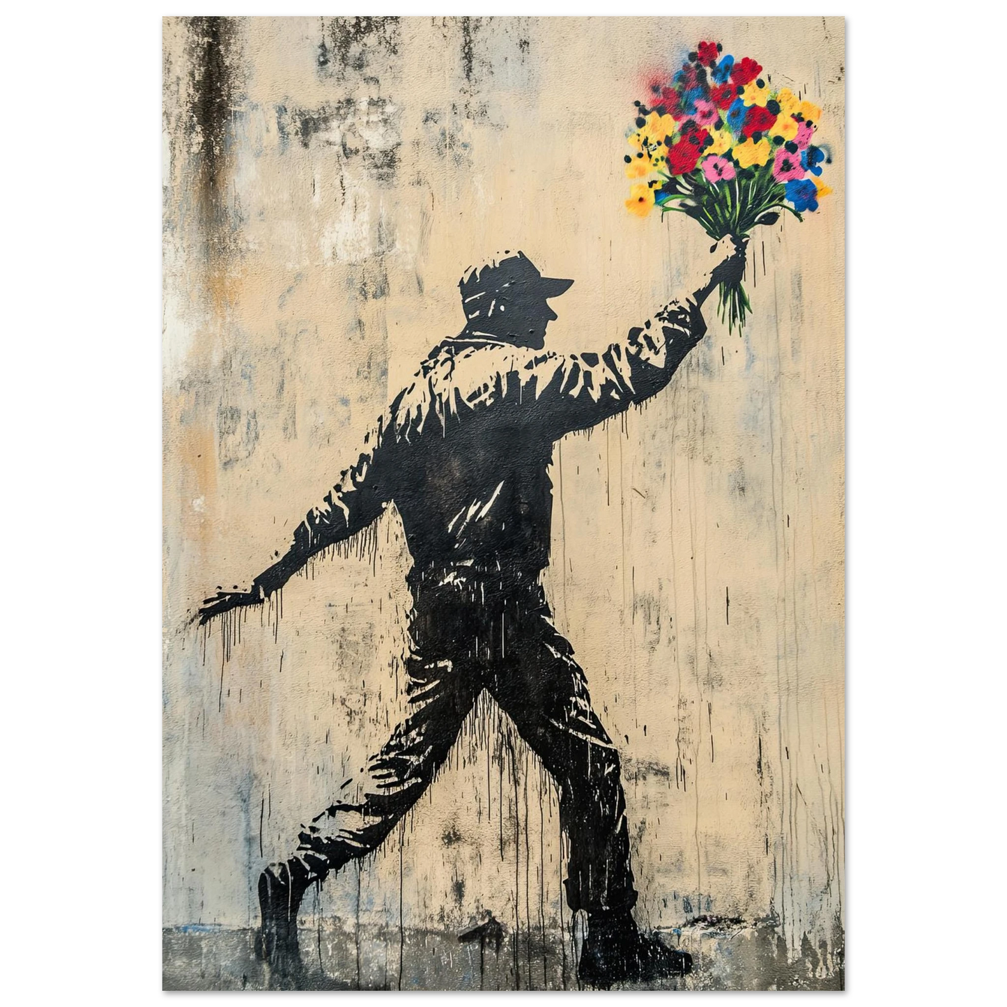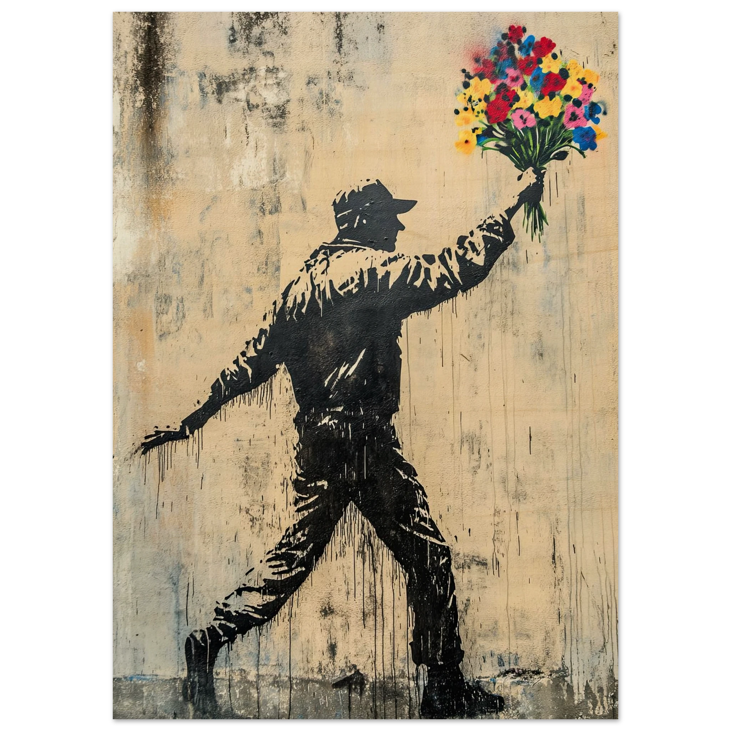 Et ikonisk street art-motiv som kombinerer opprør og håp i ett kraftfullt bilde. Den mørke silhuetten av en demonstrant står i kontrast til den fargerike blomsterbuketten – et symbol på fred, kjærlighet og motstandskraft. Perfekt for deg som vil bringe urban edge og samtidig et sterkt budskap inn i interiøret.