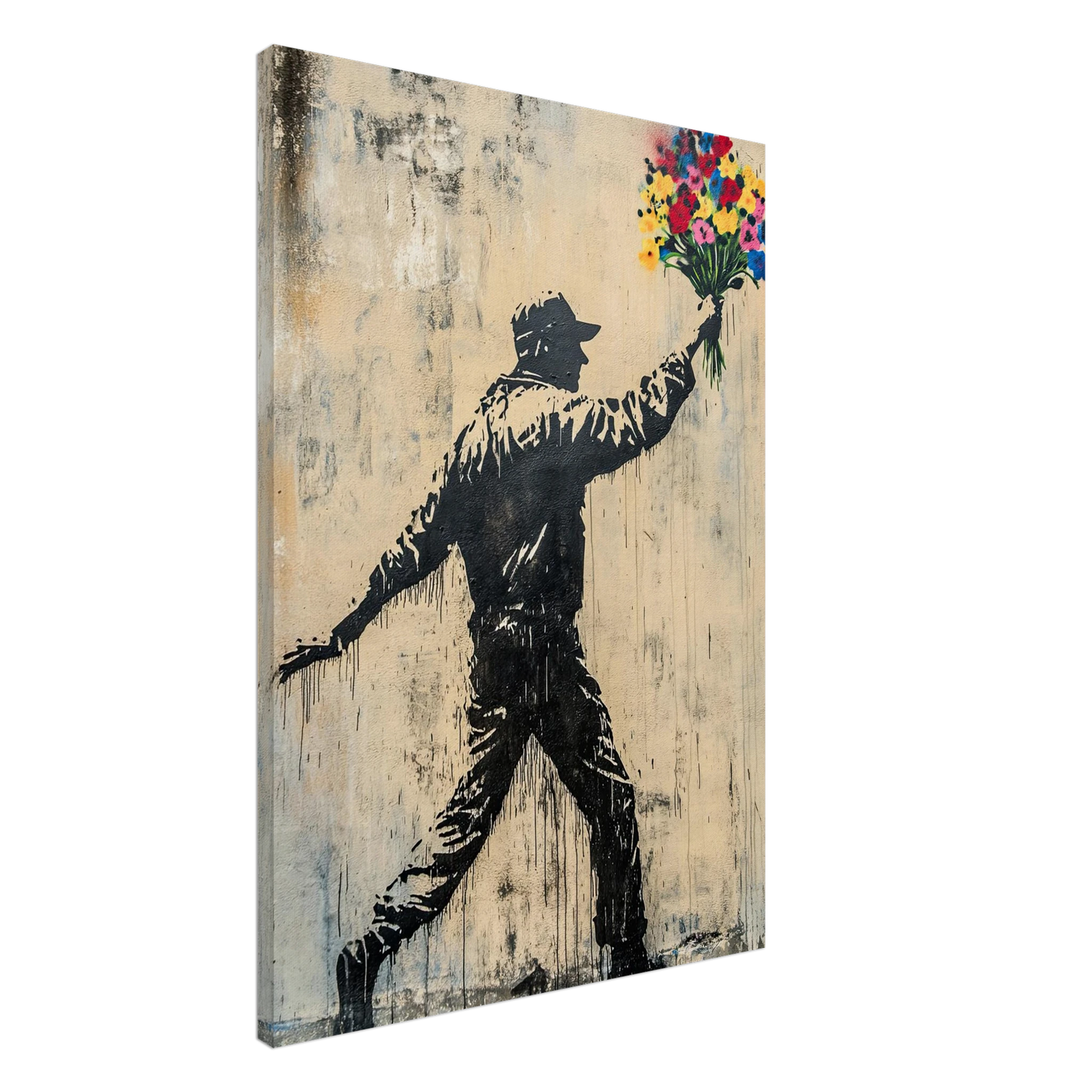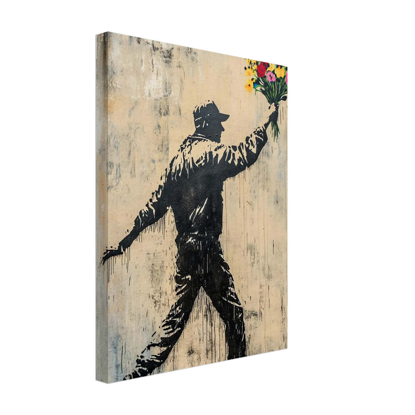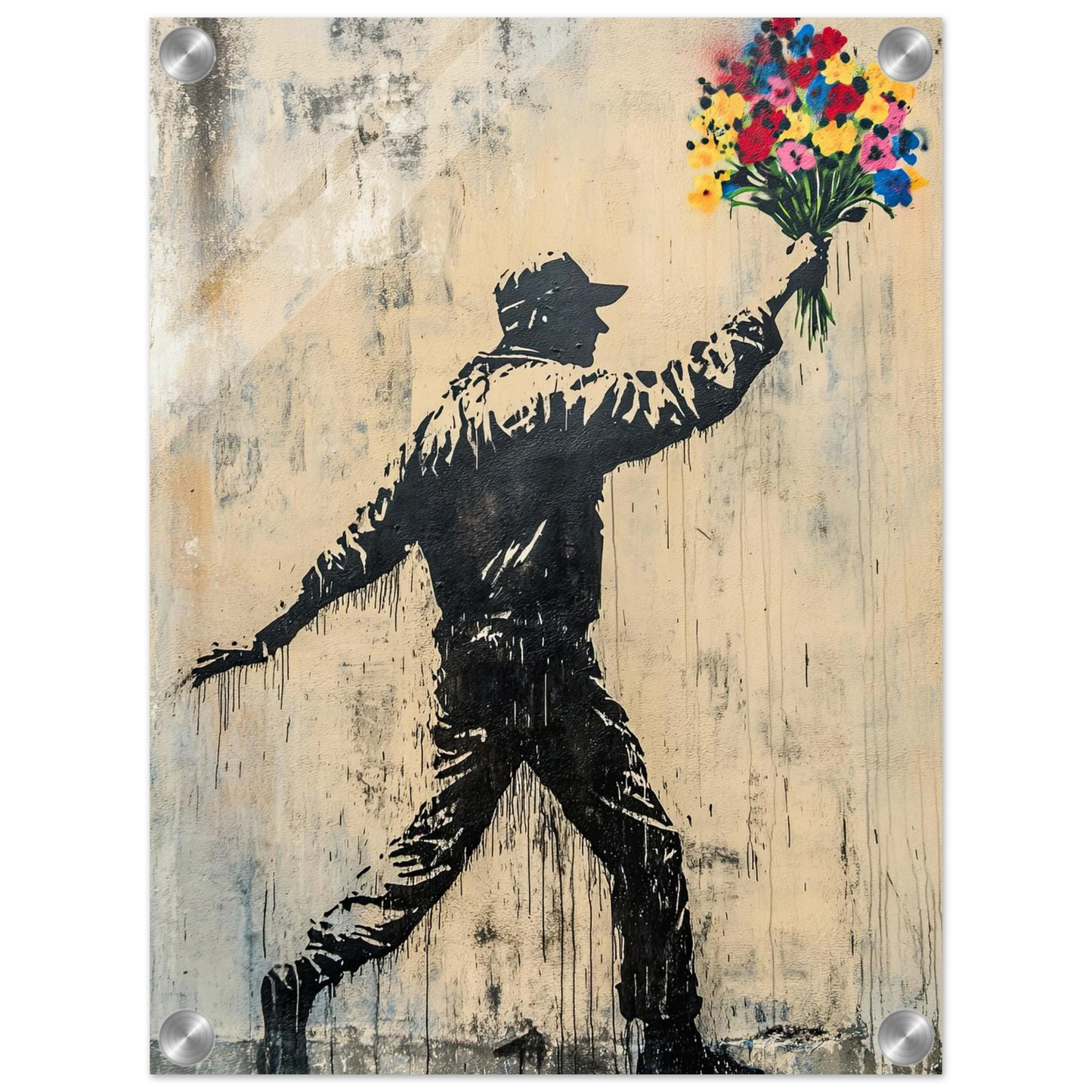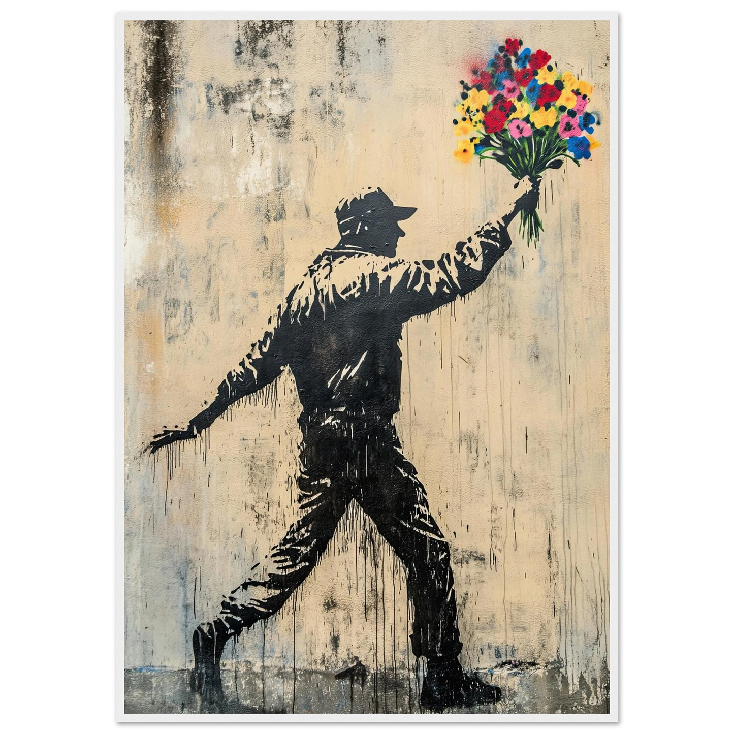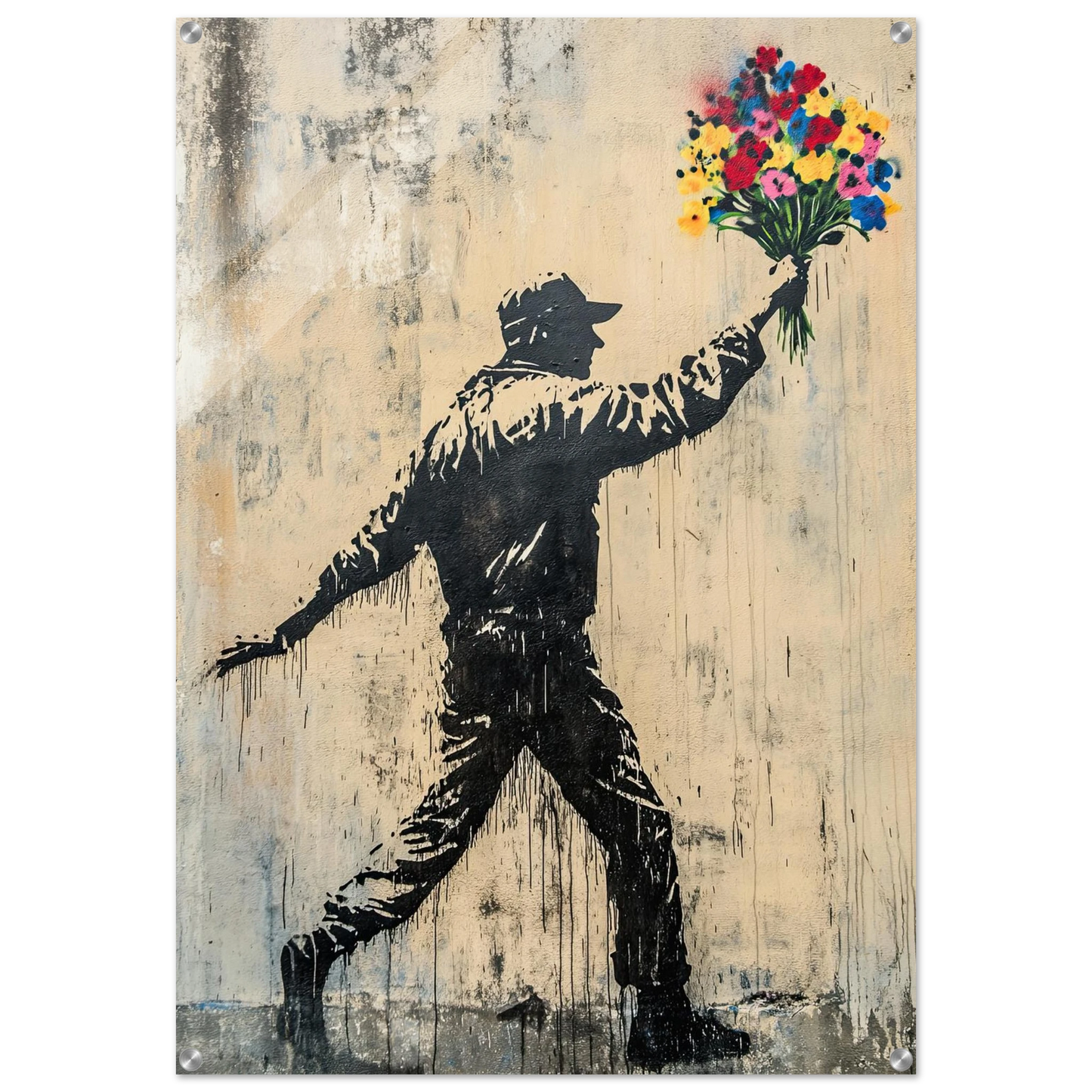 Et ikonisk street art-motiv som kombinerer opprør og håp i ett kraftfullt bilde. Den mørke silhuetten av en demonstrant står i kontrast til den fargerike blomsterbuketten – et symbol på fred, kjærlighet og motstandskraft. Perfekt for deg som vil bringe urban edge og samtidig et sterkt budskap inn i interiøret.