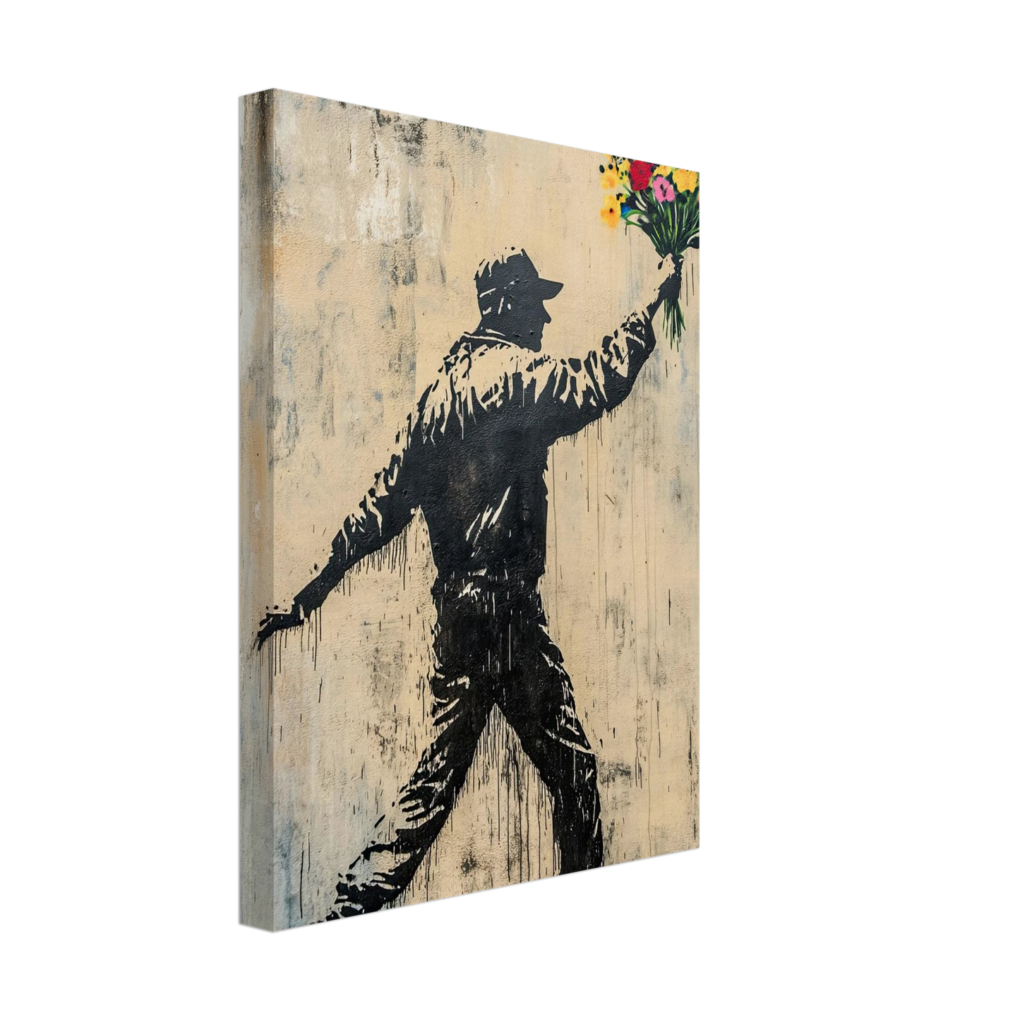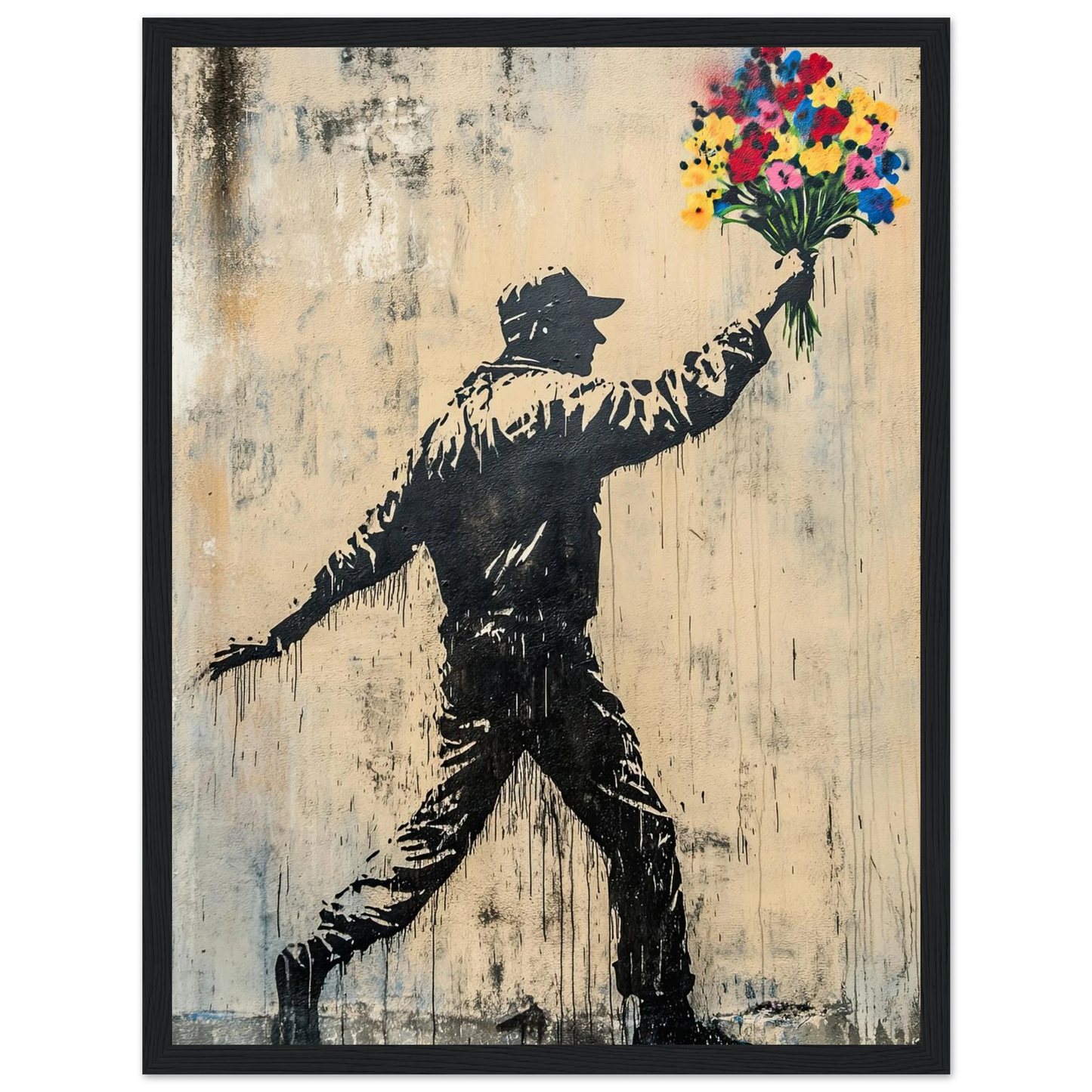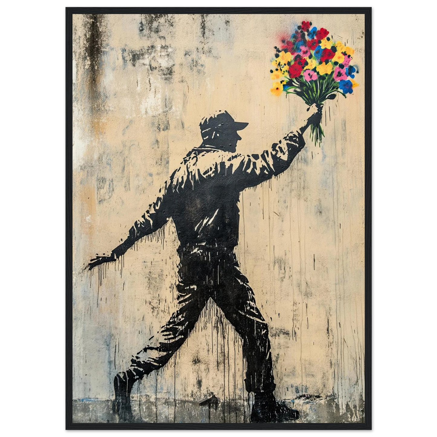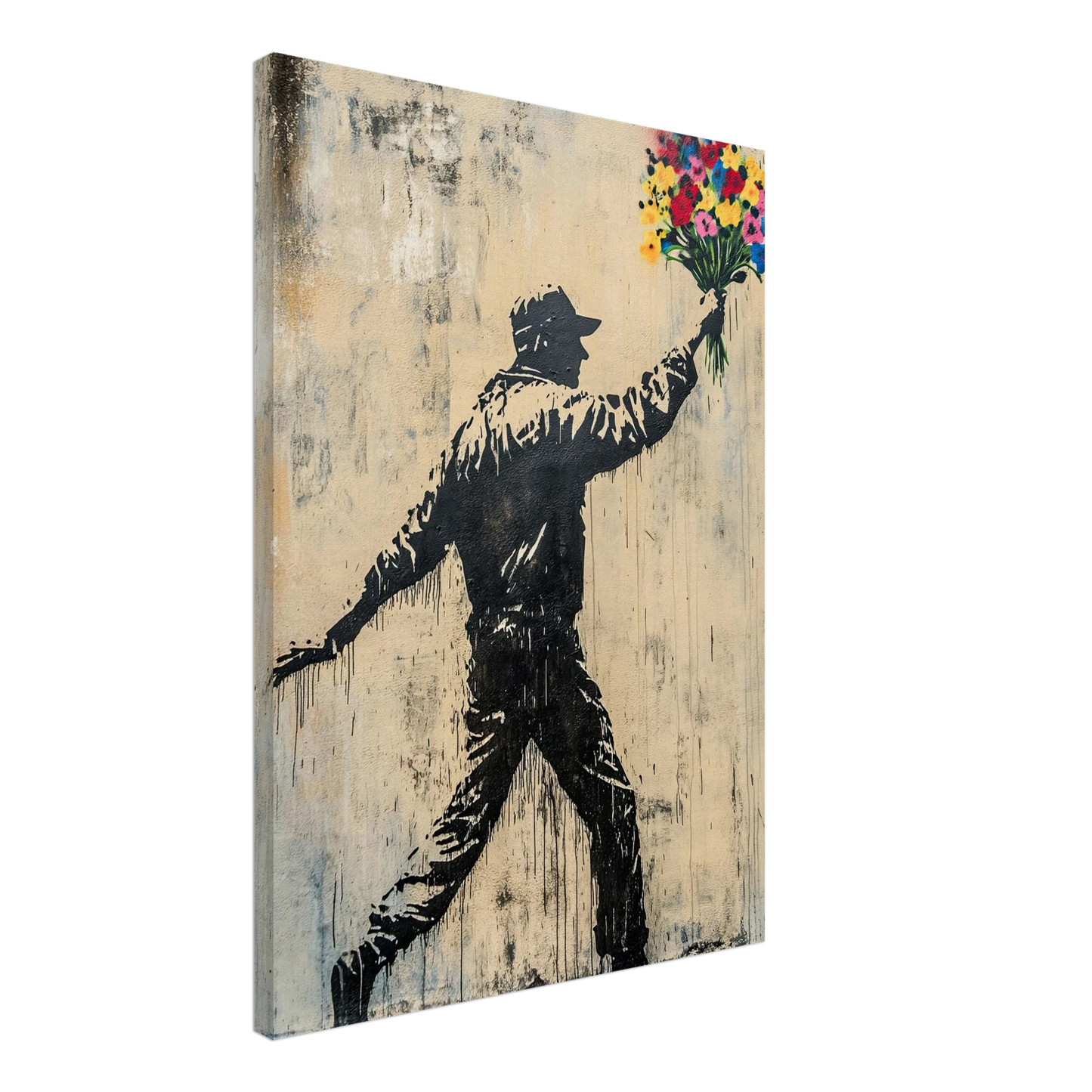 Et ikonisk street art-motiv som kombinerer opprør og håp i ett kraftfullt bilde. Den mørke silhuetten av en demonstrant står i kontrast til den fargerike blomsterbuketten – et symbol på fred, kjærlighet og motstandskraft. Perfekt for deg som vil bringe urban edge og samtidig et sterkt budskap inn i interiøret.