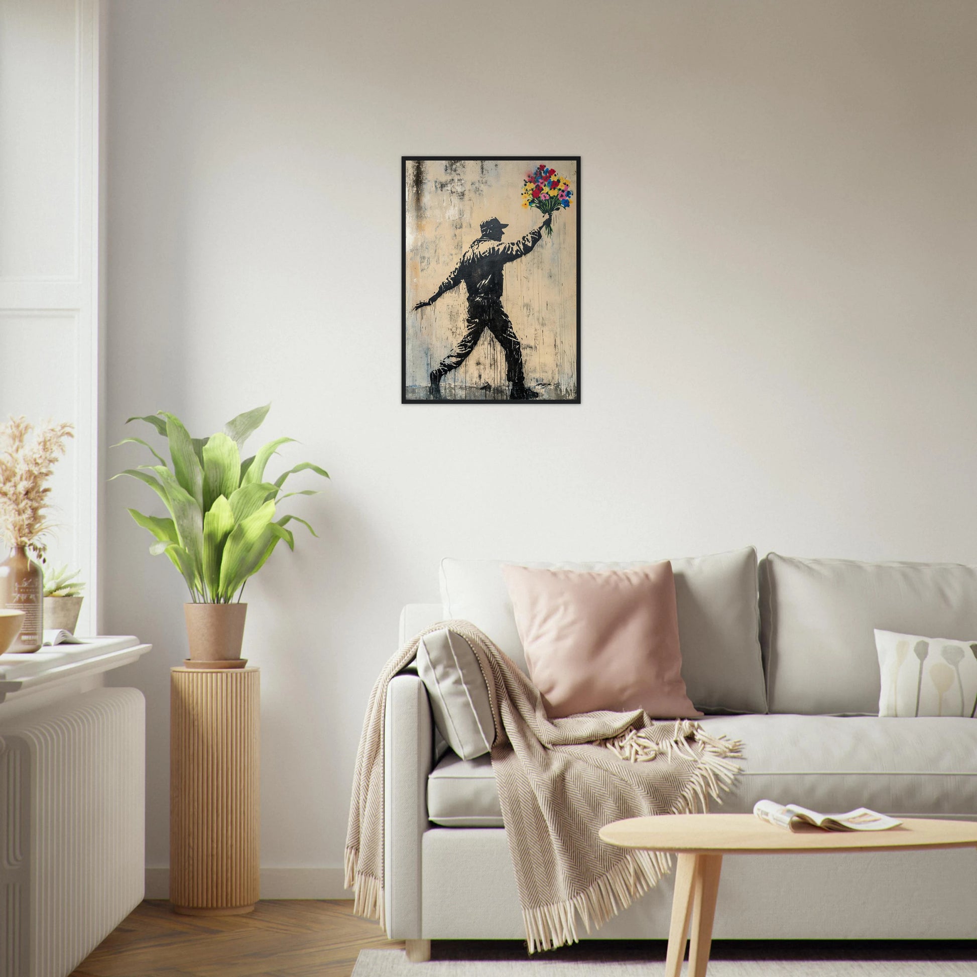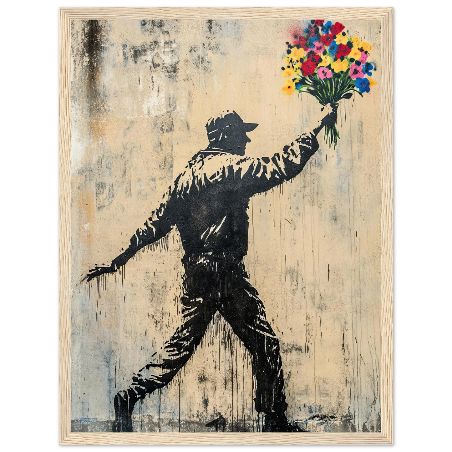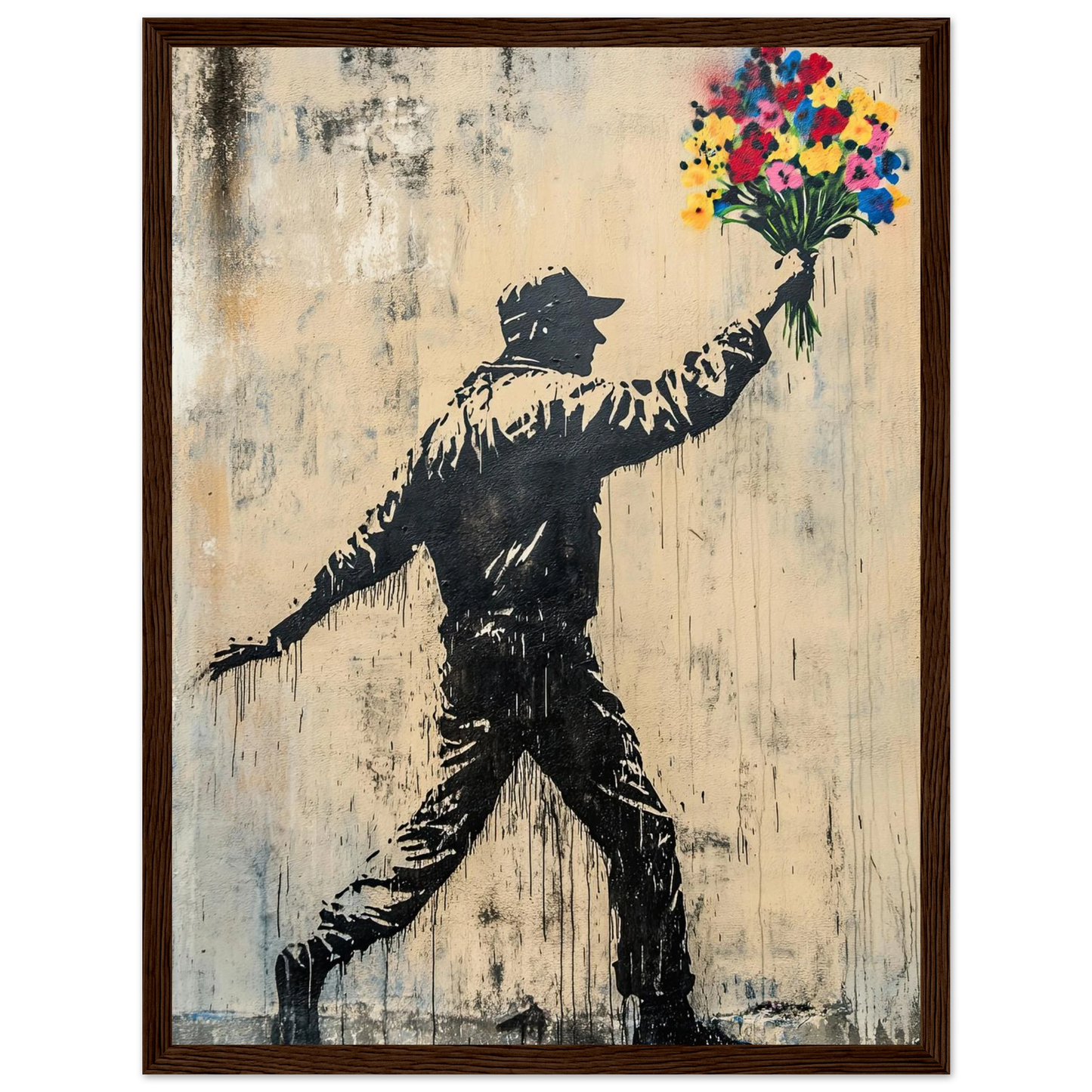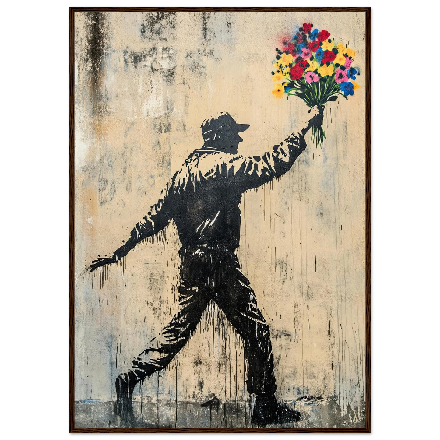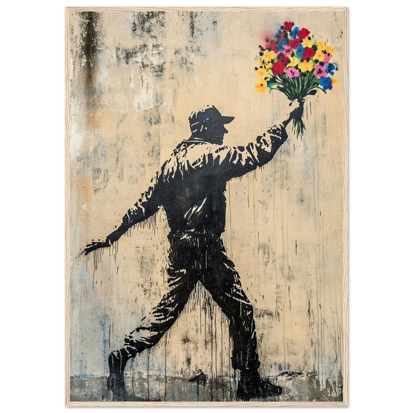 Et ikonisk street art-motiv som kombinerer opprør og håp i ett kraftfullt bilde. Den mørke silhuetten av en demonstrant står i kontrast til den fargerike blomsterbuketten – et symbol på fred, kjærlighet og motstandskraft. Perfekt for deg som vil bringe urban edge og samtidig et sterkt budskap inn i interiøret.