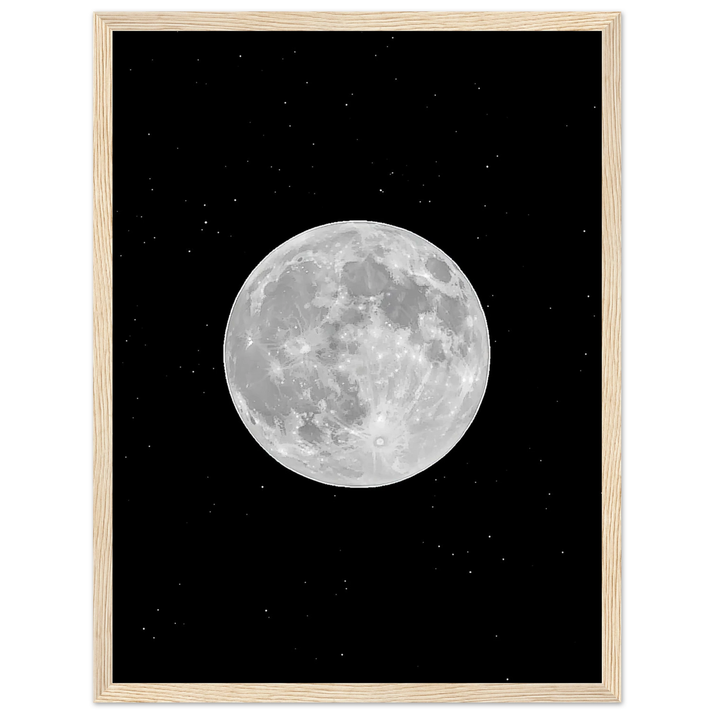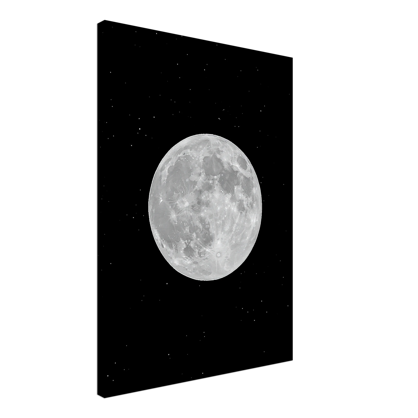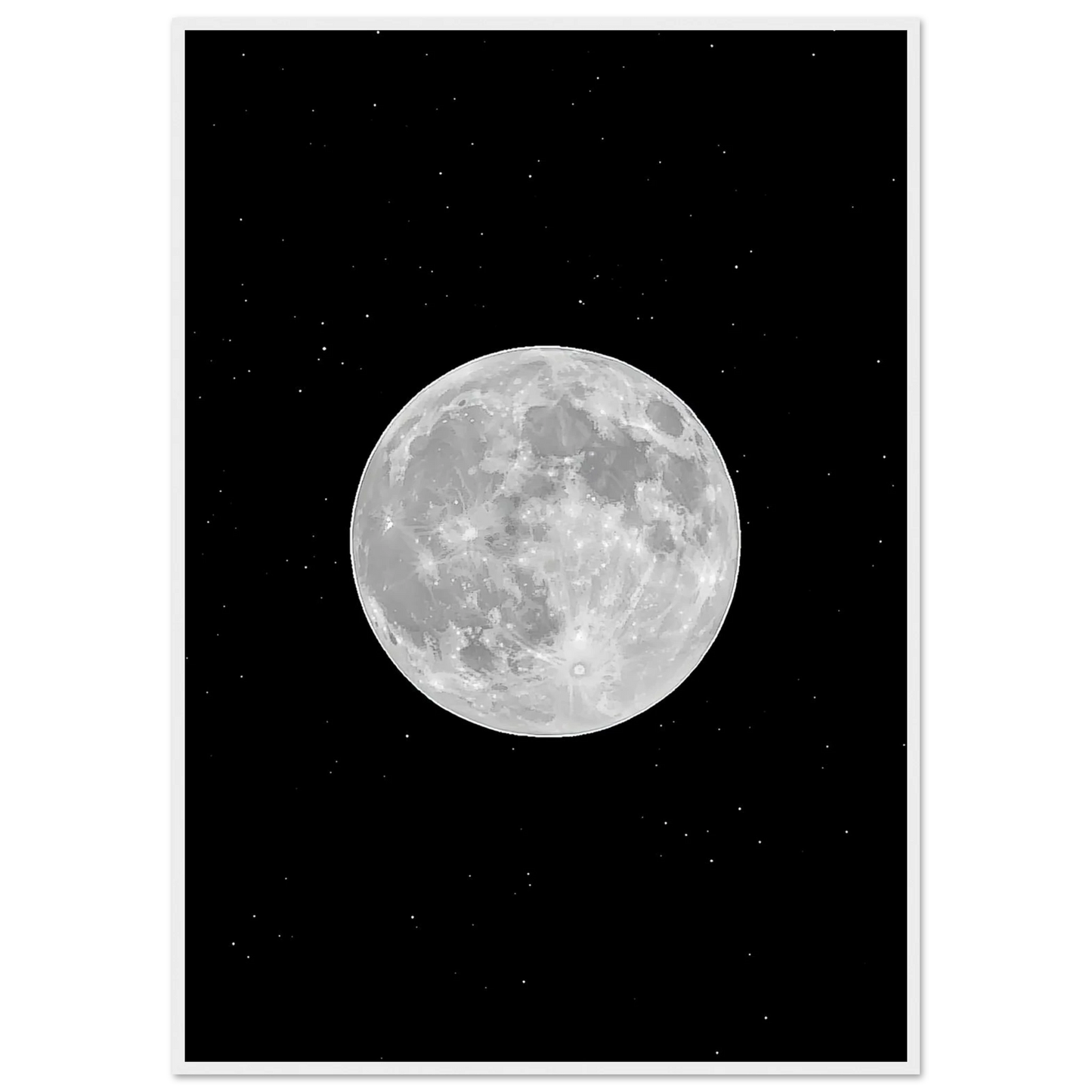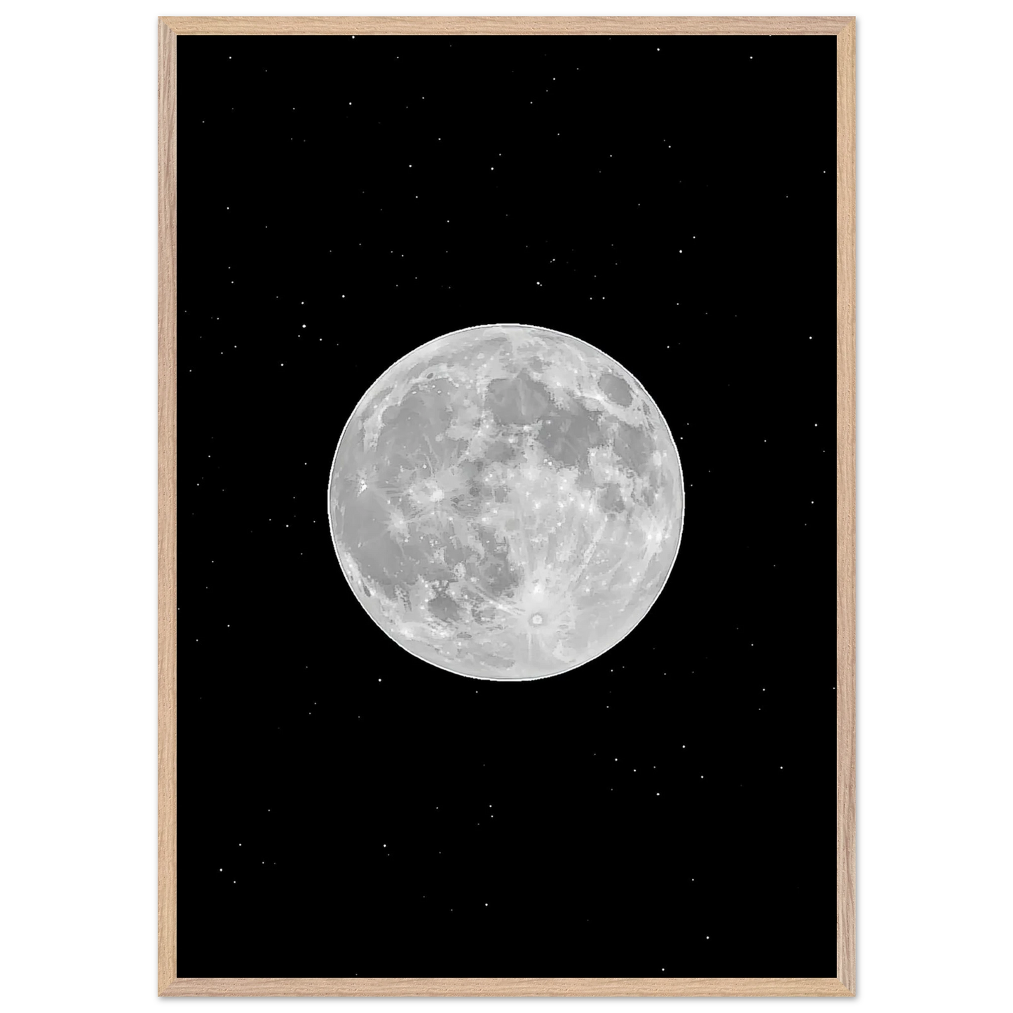 Et tidløst kunstverk som viser månen i all sin prakt, lysende klar mot en mørk nattehimmel. Enkelheten i motivet gir en sterk tilstedeværelse – et symbol på ro, mysterium og universets evige syklus. Perfekt for deg som ønsker et ikonisk og balansert motiv på veggen.