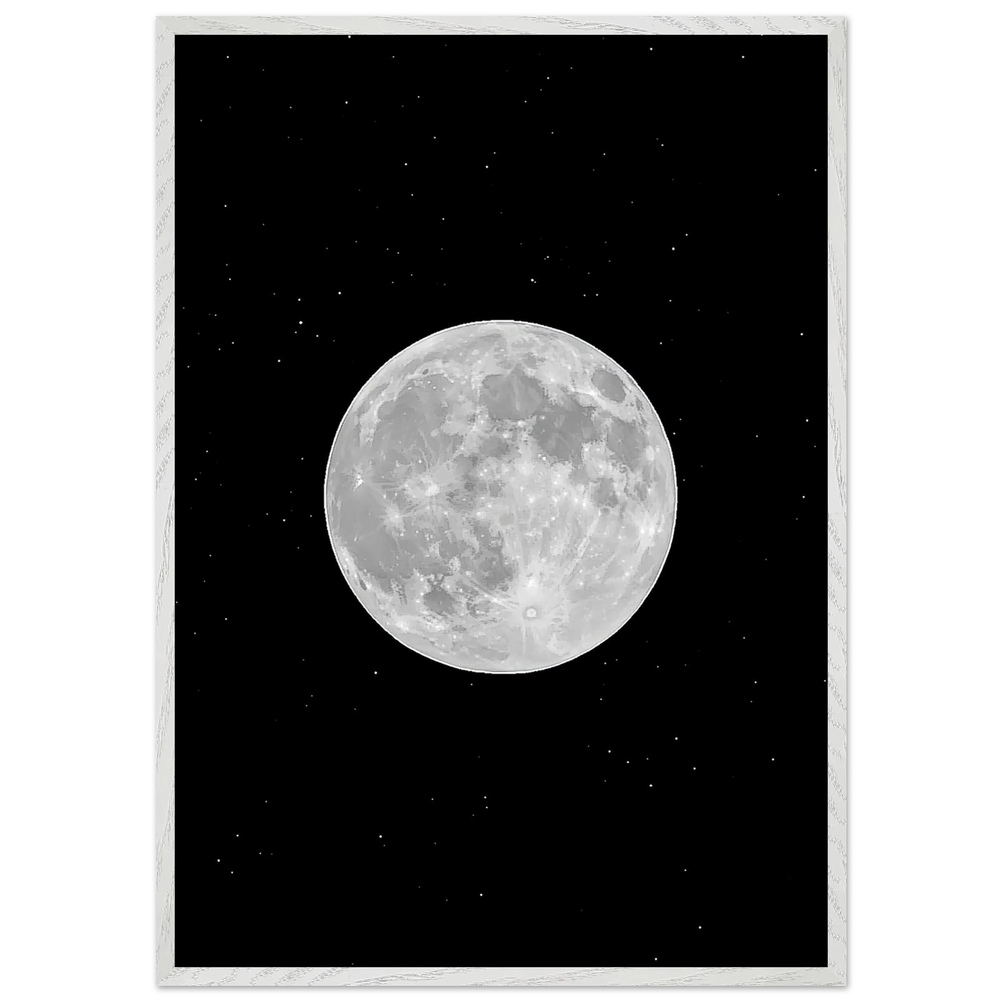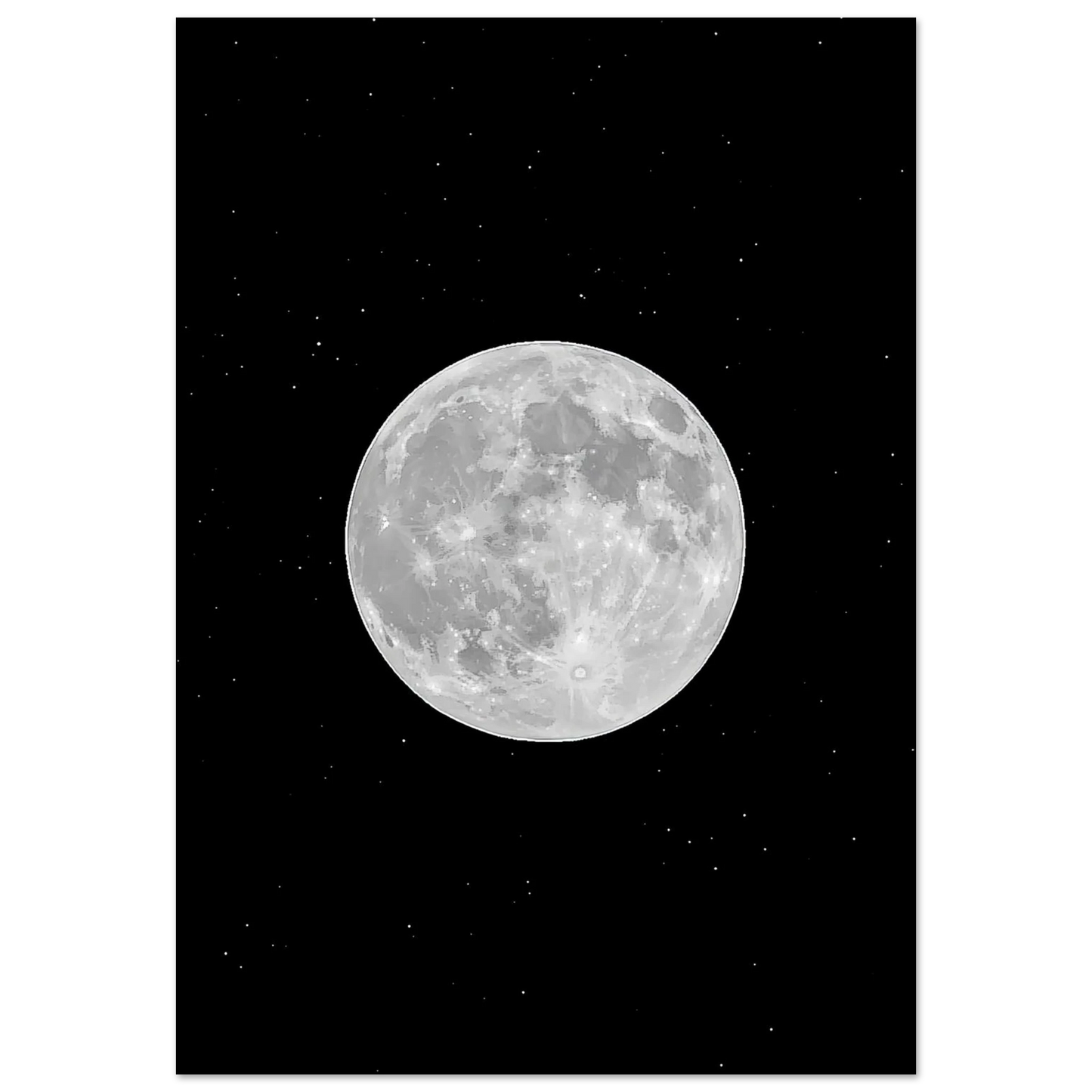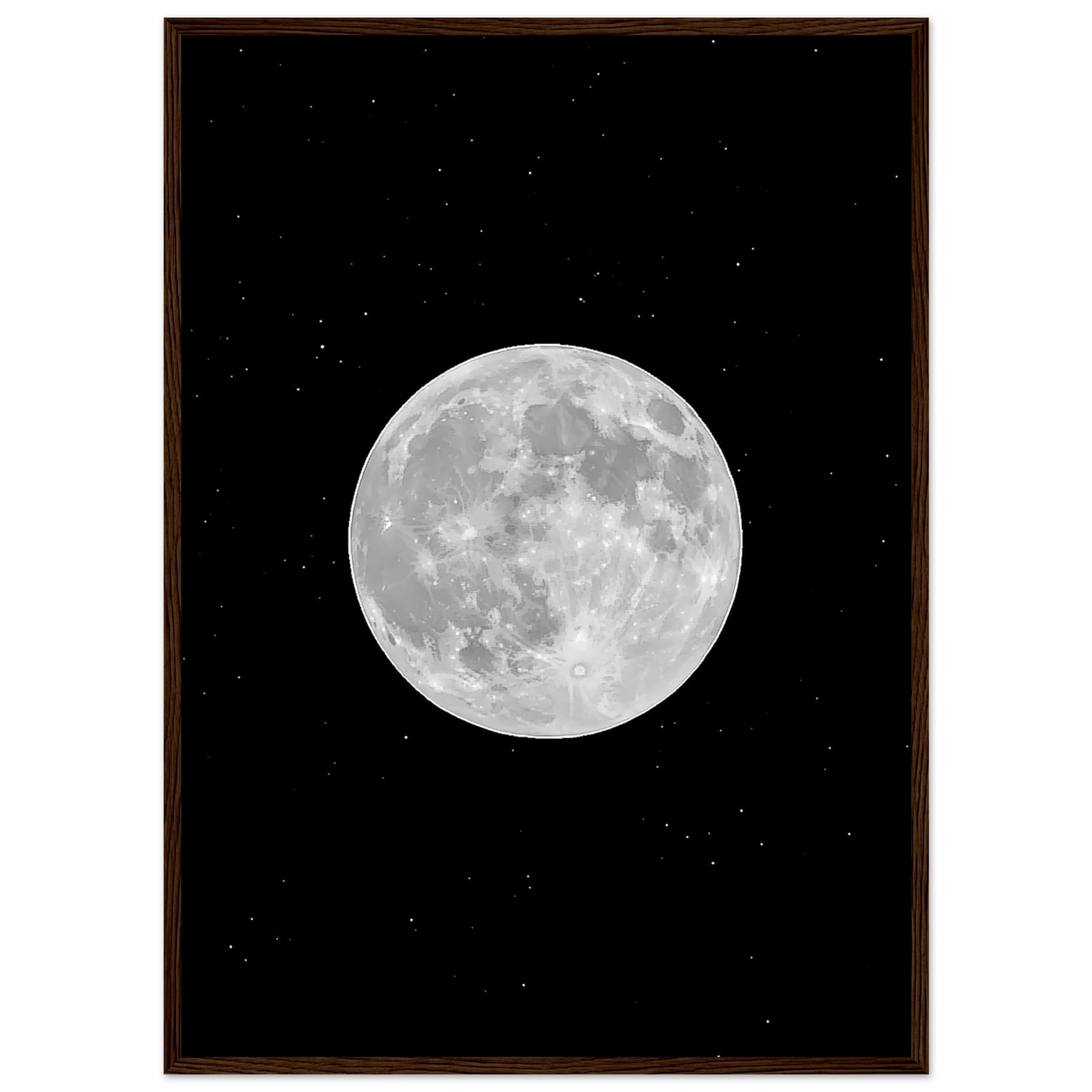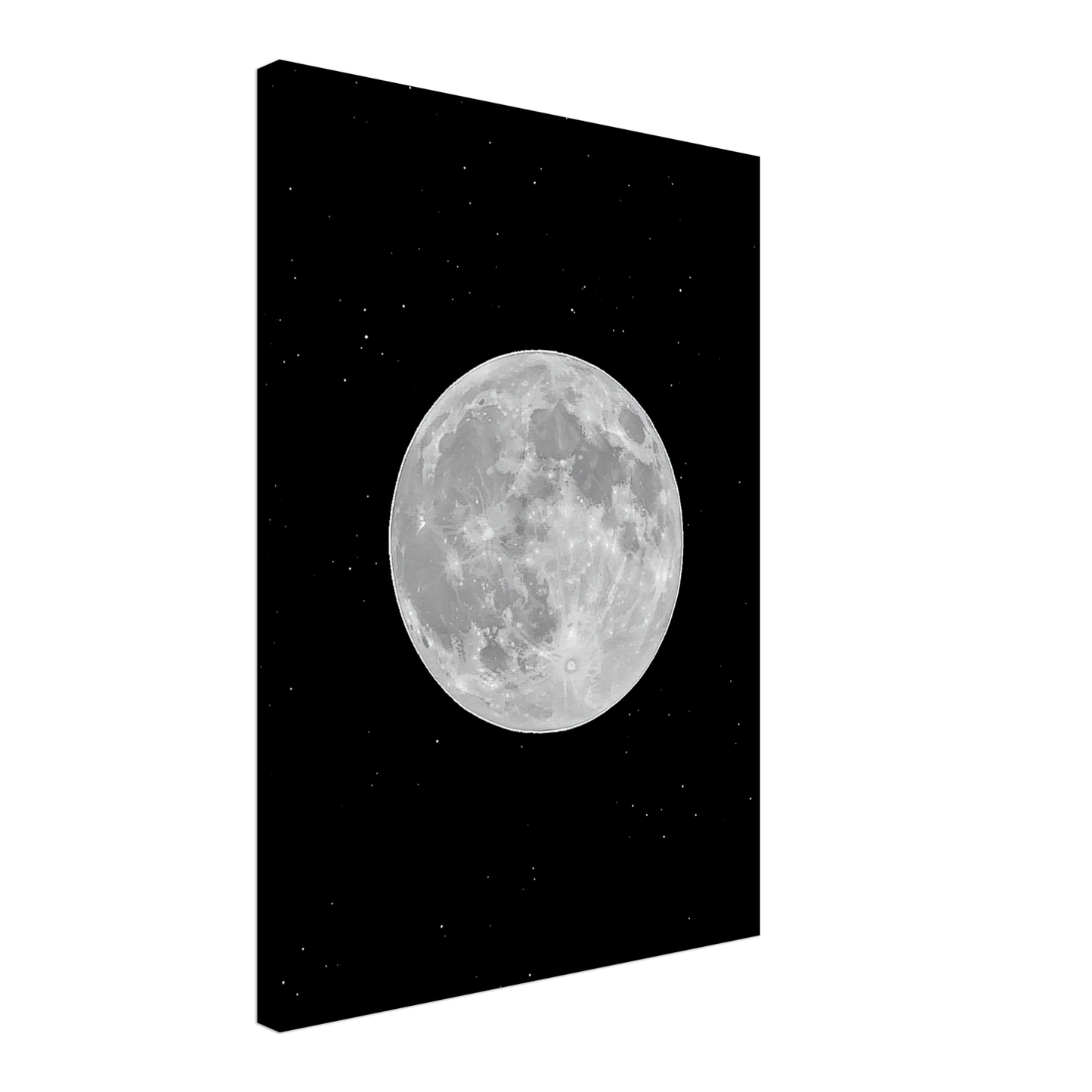 Et tidløst kunstverk som viser månen i all sin prakt, lysende klar mot en mørk nattehimmel. Enkelheten i motivet gir en sterk tilstedeværelse – et symbol på ro, mysterium og universets evige syklus. Perfekt for deg som ønsker et ikonisk og balansert motiv på veggen.