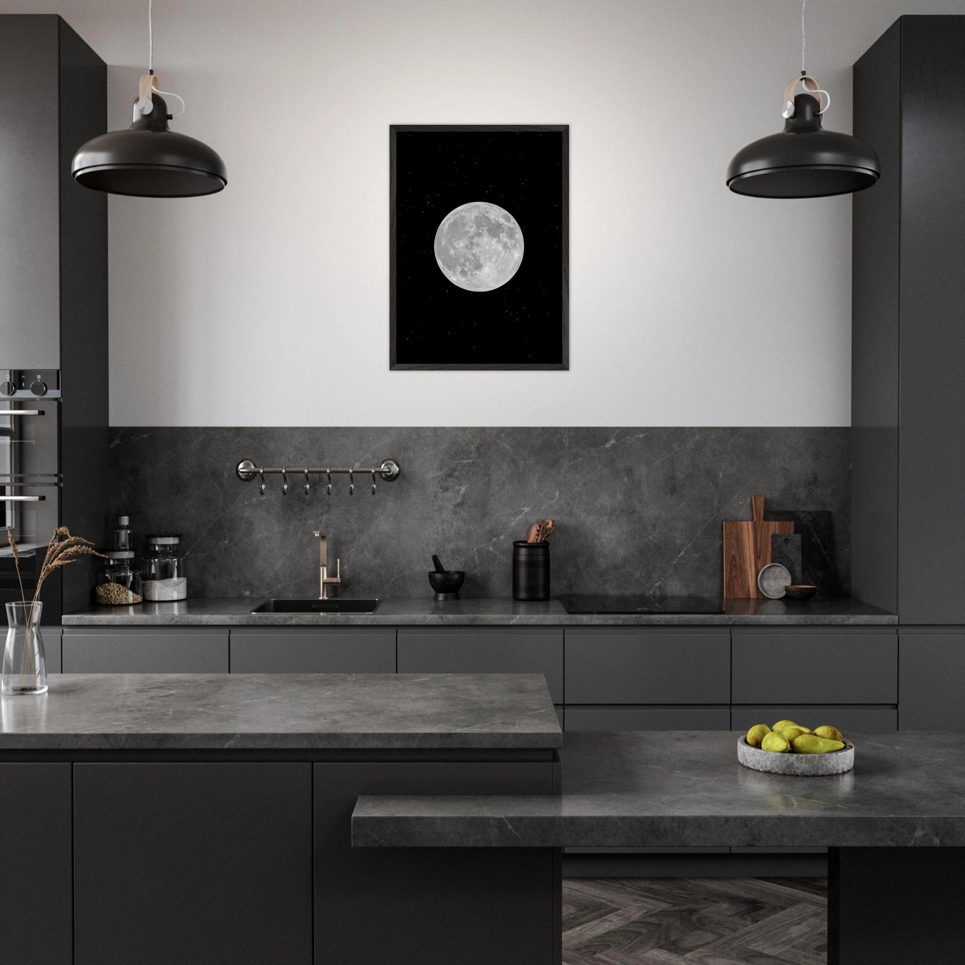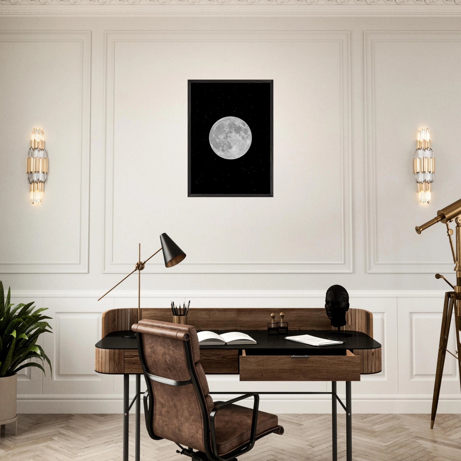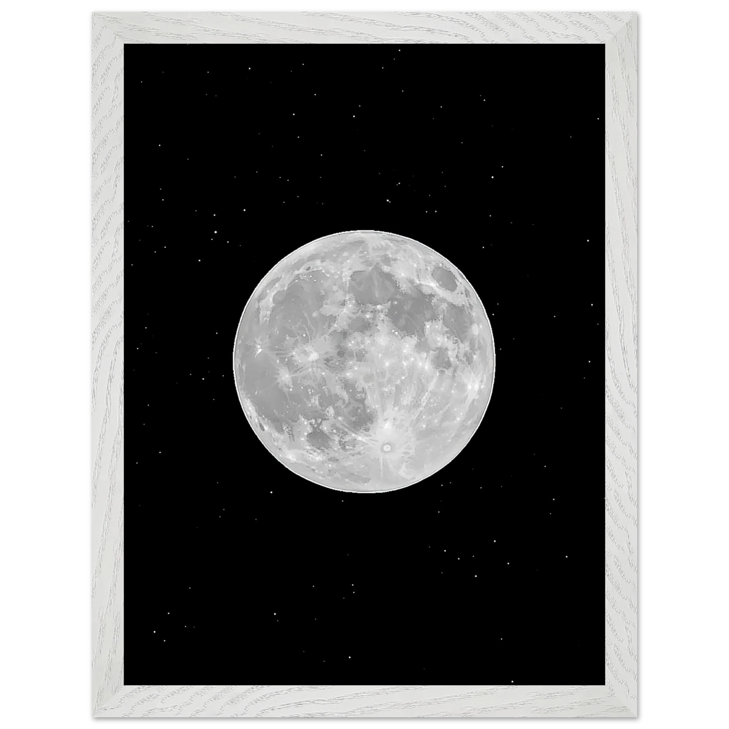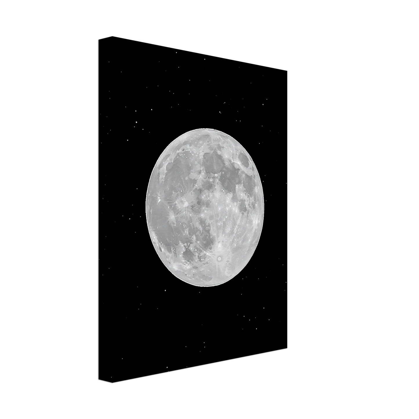 Et tidløst kunstverk som viser månen i all sin prakt, lysende klar mot en mørk nattehimmel. Enkelheten i motivet gir en sterk tilstedeværelse – et symbol på ro, mysterium og universets evige syklus. Perfekt for deg som ønsker et ikonisk og balansert motiv på veggen.