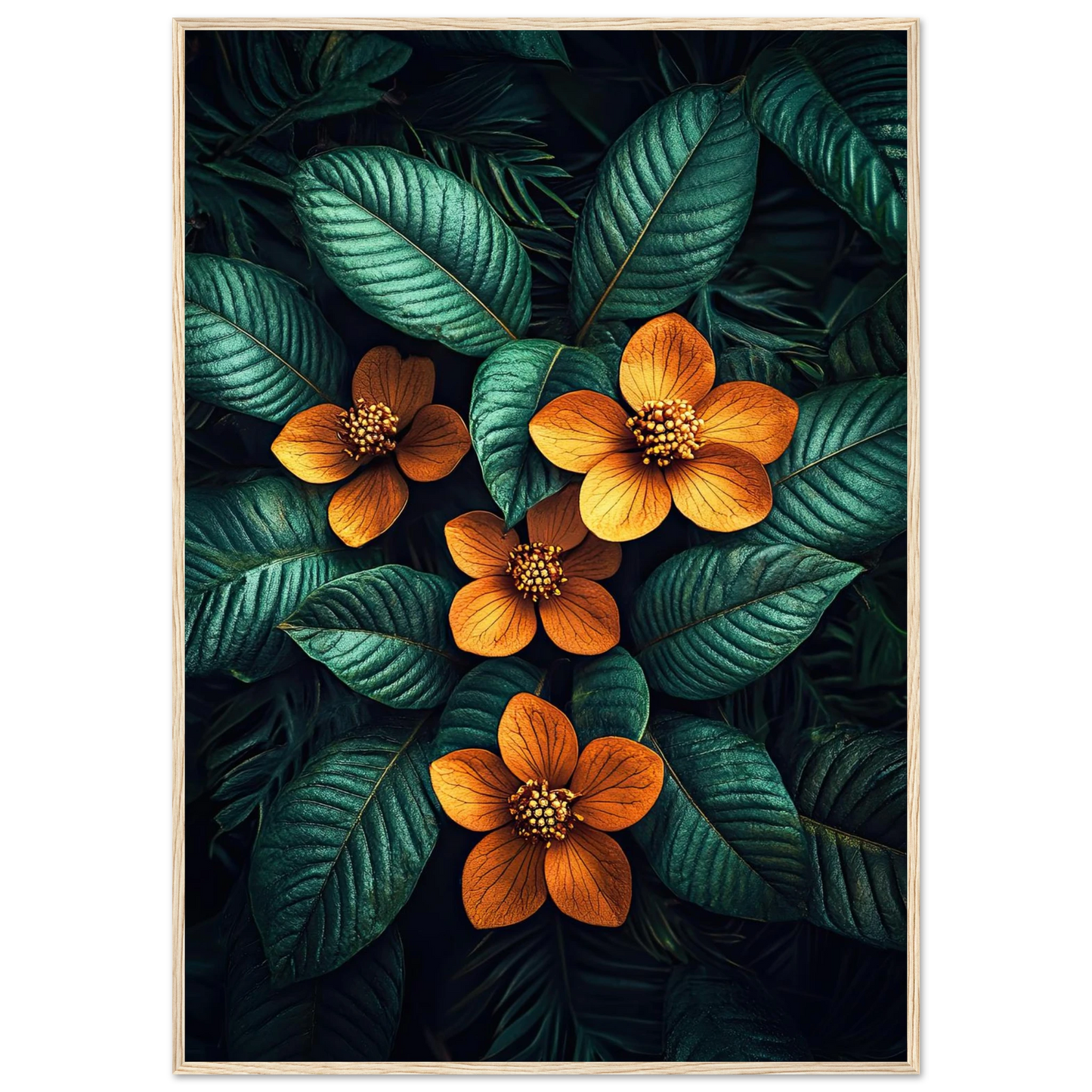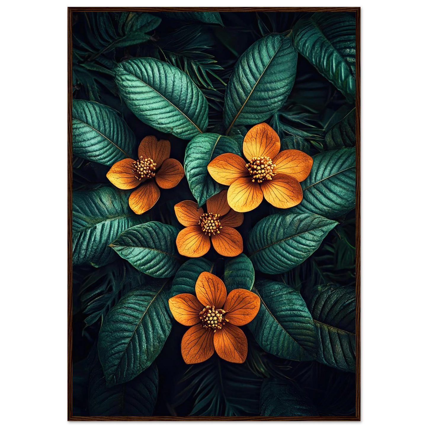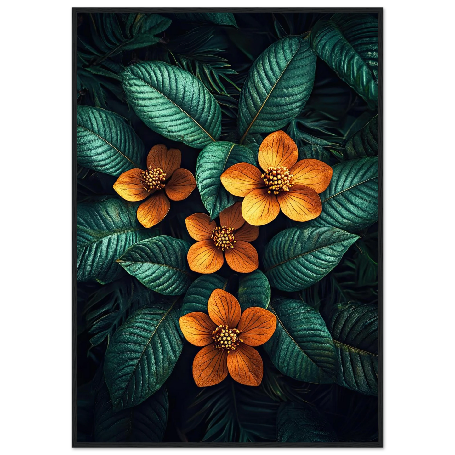 Et slående kunstverk med glødende oransje blomster som trer frem fra mørkegrønne blader. Den dramatiske kontrasten skaper et uttrykk som både føles eksotisk og elegant – perfekt for deg som vil tilføre interiøret en sofistikert, naturinspirert energi.