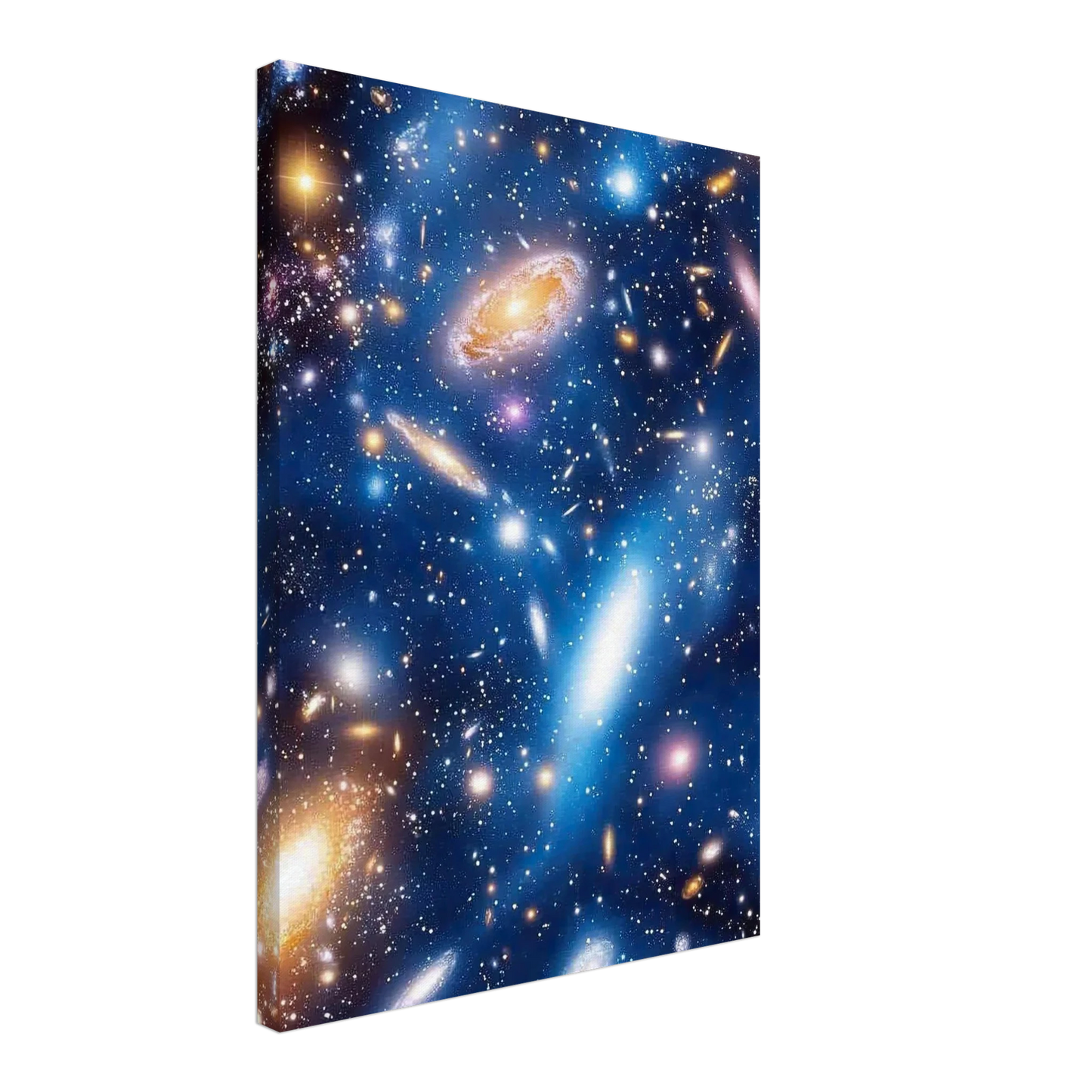 Et spektakulært kunstverk som viser et uendelig mylder av galakser i dype blåtoner og strålende lys. Bildet minner oss om universets ubegrensede mysterier og gir rommet en følelse av dybde, undring og tidløs skjønnhet. Perfekt for deg som ønsker et motiv som inspirerer til drømmer og refleksjon.