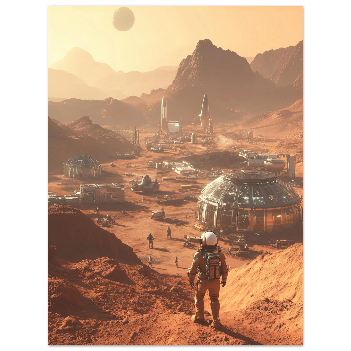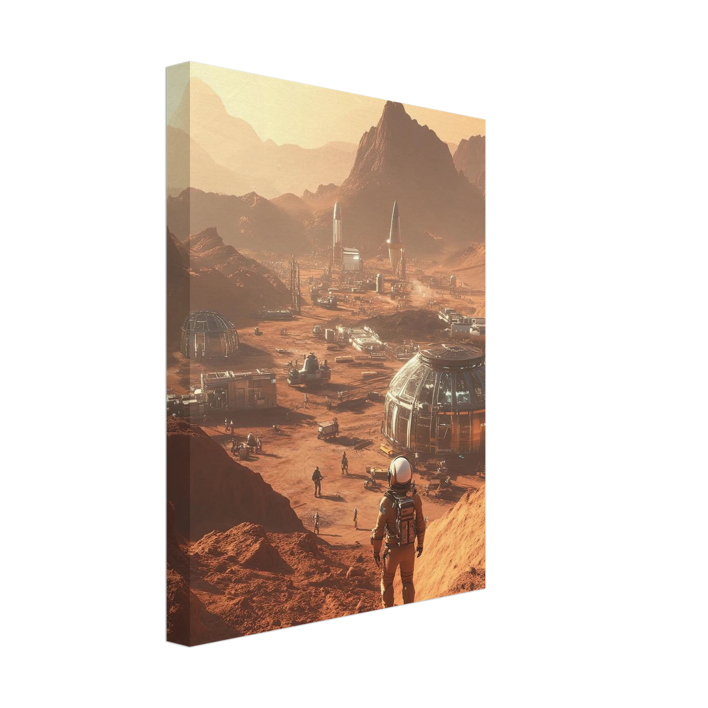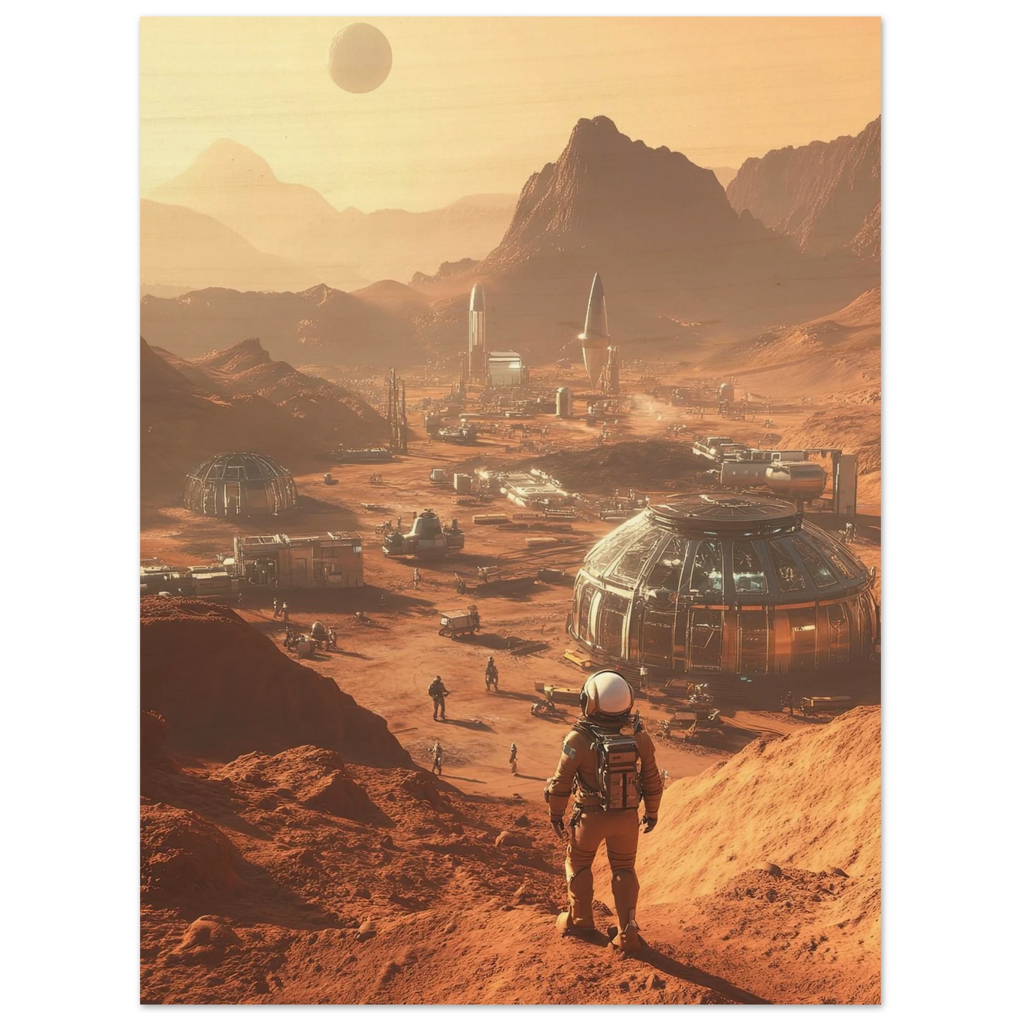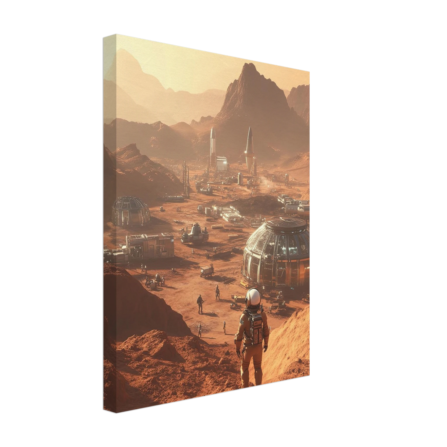 Et visjonært kunstverk som forestiller en fremtidig koloni på Mars. Astronauter og romfartøy utforsker det røde landskapet, mens kuppelformede bygg vitner om menneskets drømmer om å bosette seg på en ny planet. Et motiv som symboliserer eventyrlyst, fremtidstro og vår evige søken etter nye horisonter.