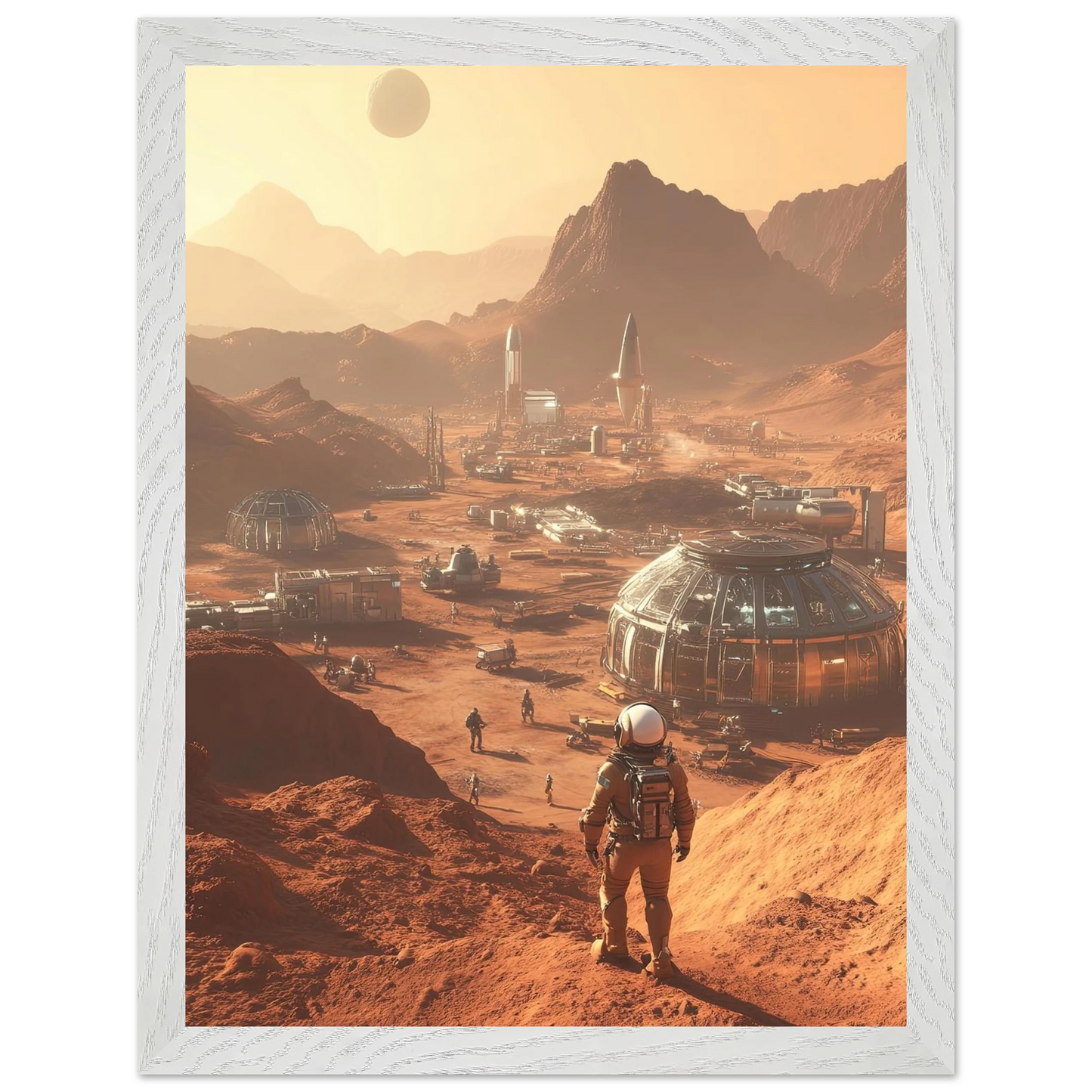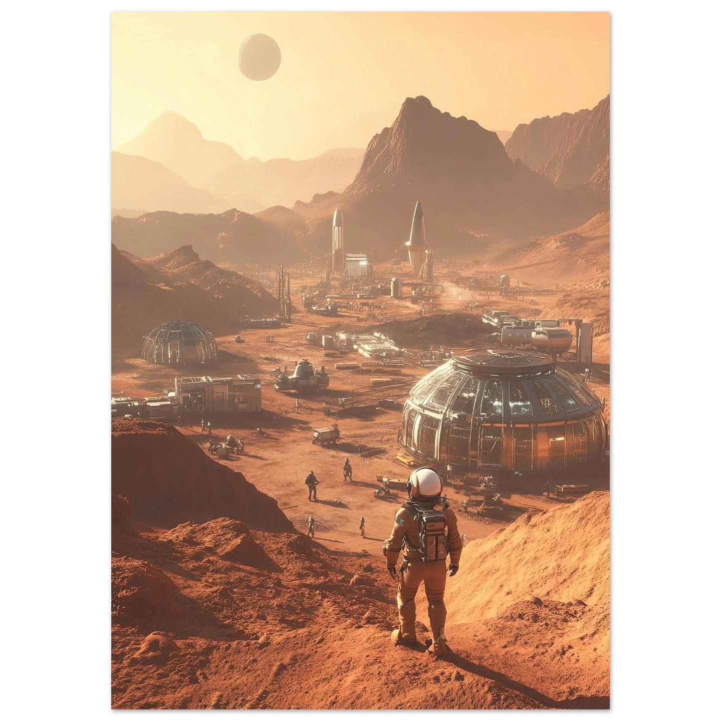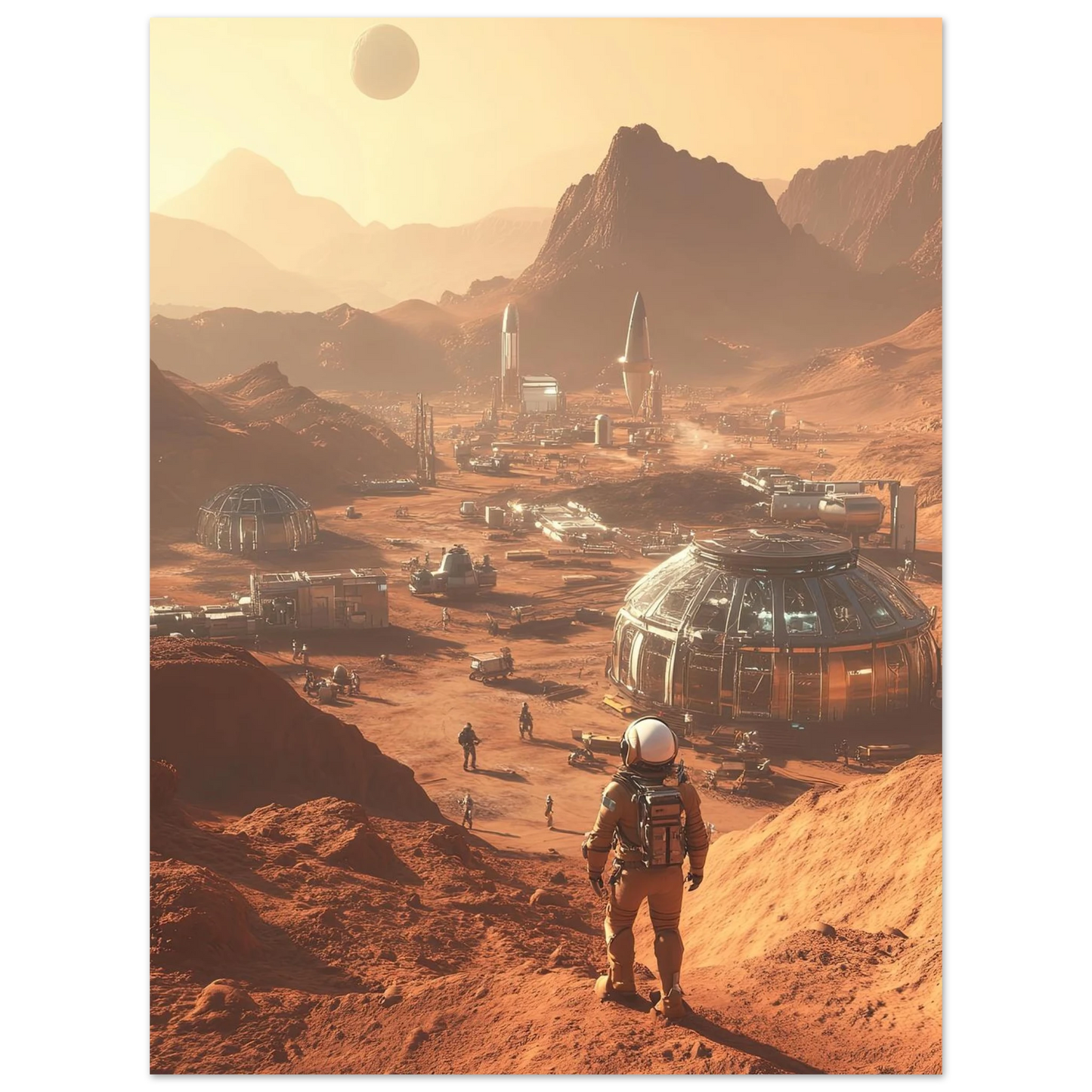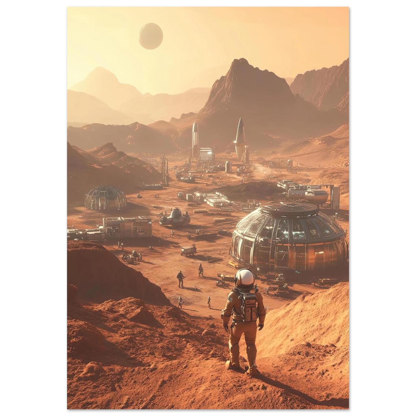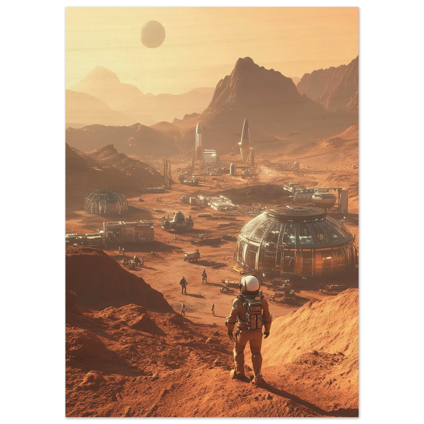 Et visjonært kunstverk som forestiller en fremtidig koloni på Mars. Astronauter og romfartøy utforsker det røde landskapet, mens kuppelformede bygg vitner om menneskets drømmer om å bosette seg på en ny planet. Et motiv som symboliserer eventyrlyst, fremtidstro og vår evige søken etter nye horisonter.