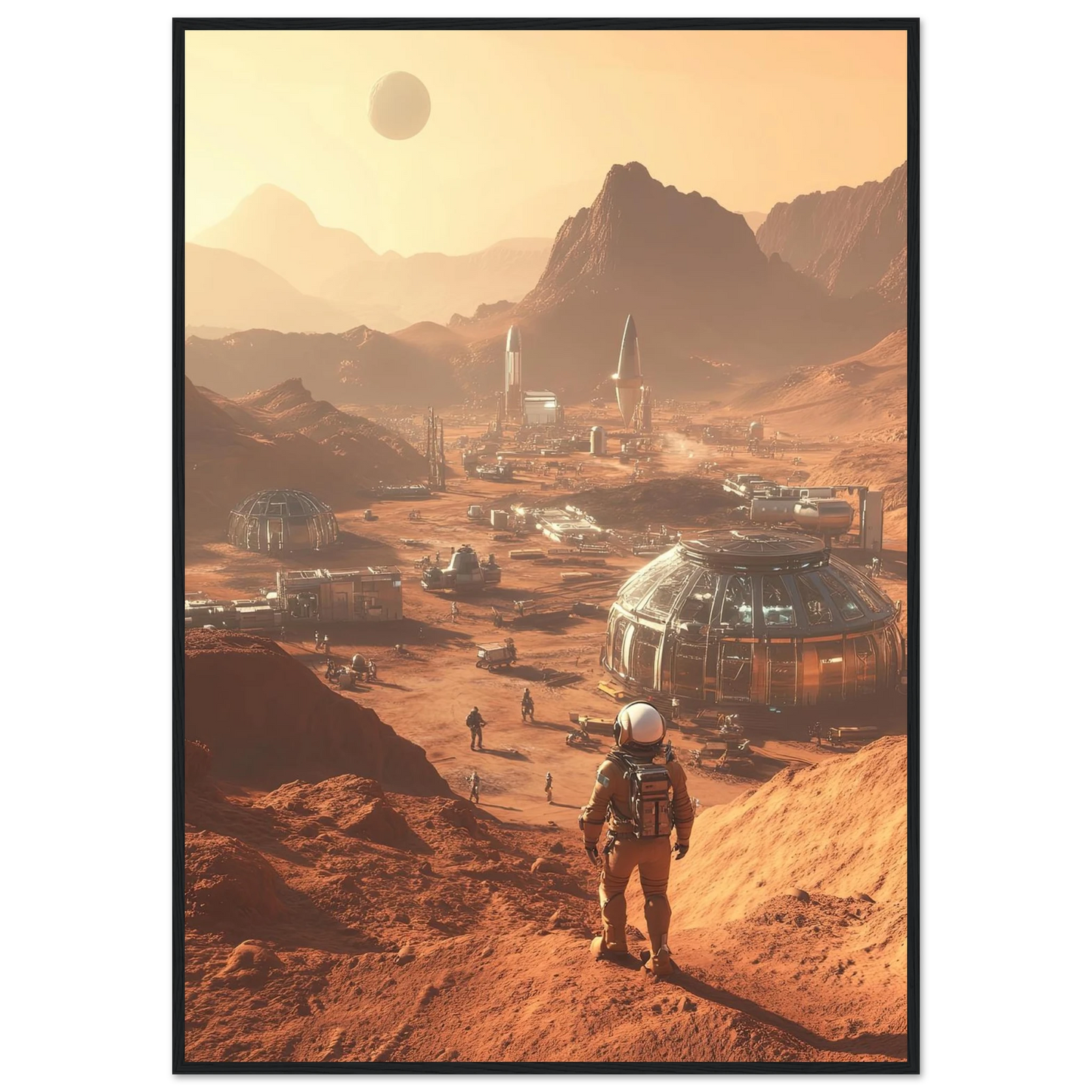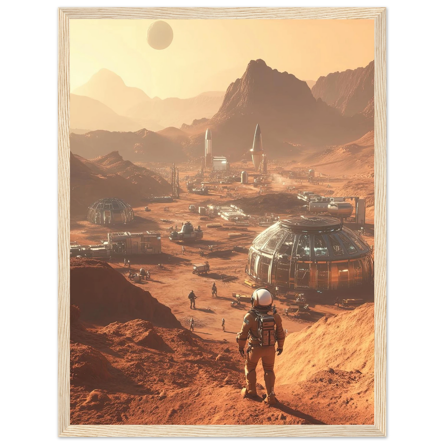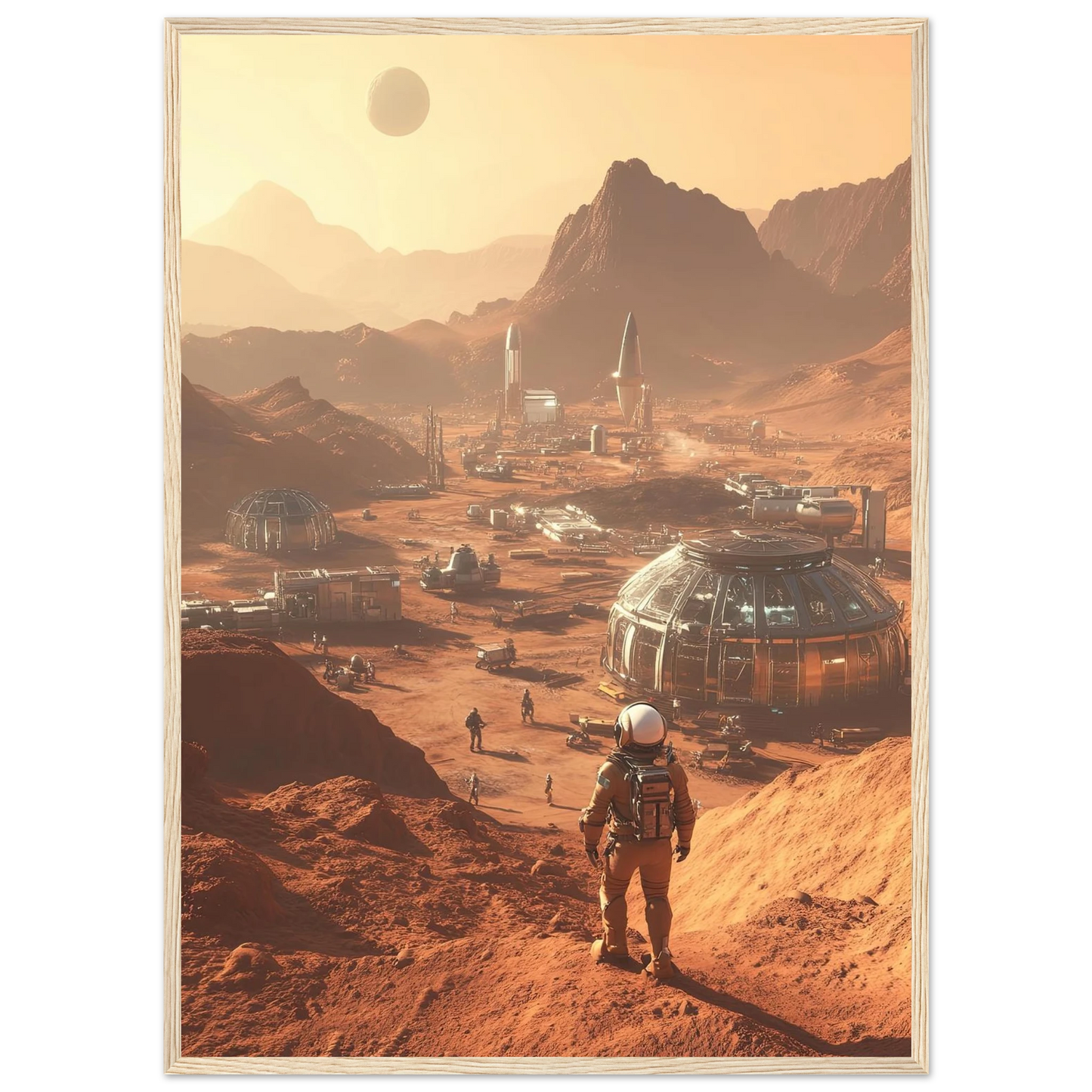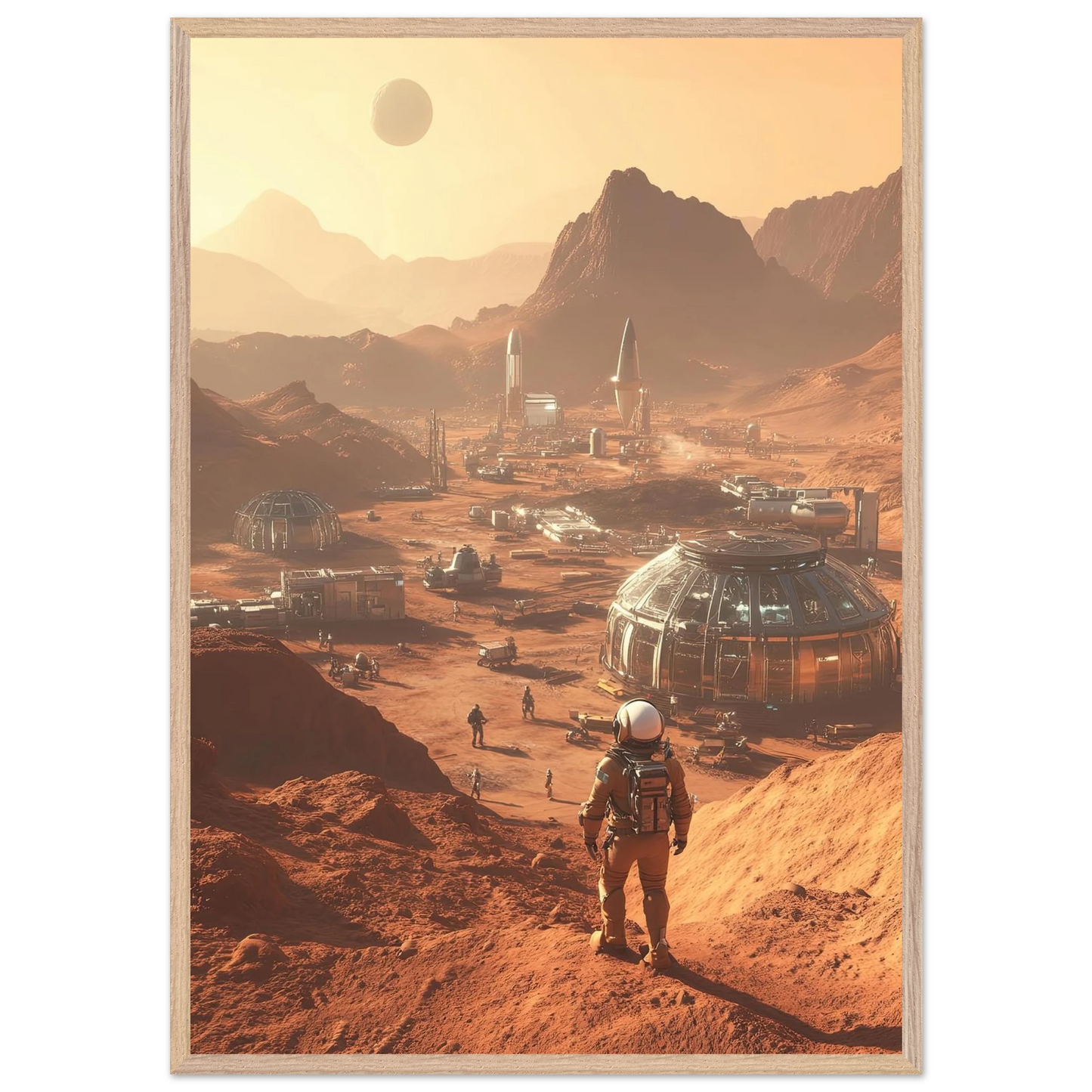 Et visjonært kunstverk som forestiller en fremtidig koloni på Mars. Astronauter og romfartøy utforsker det røde landskapet, mens kuppelformede bygg vitner om menneskets drømmer om å bosette seg på en ny planet. Et motiv som symboliserer eventyrlyst, fremtidstro og vår evige søken etter nye horisonter.