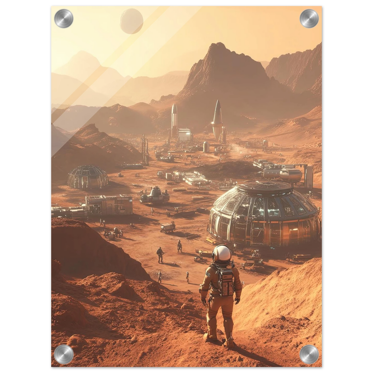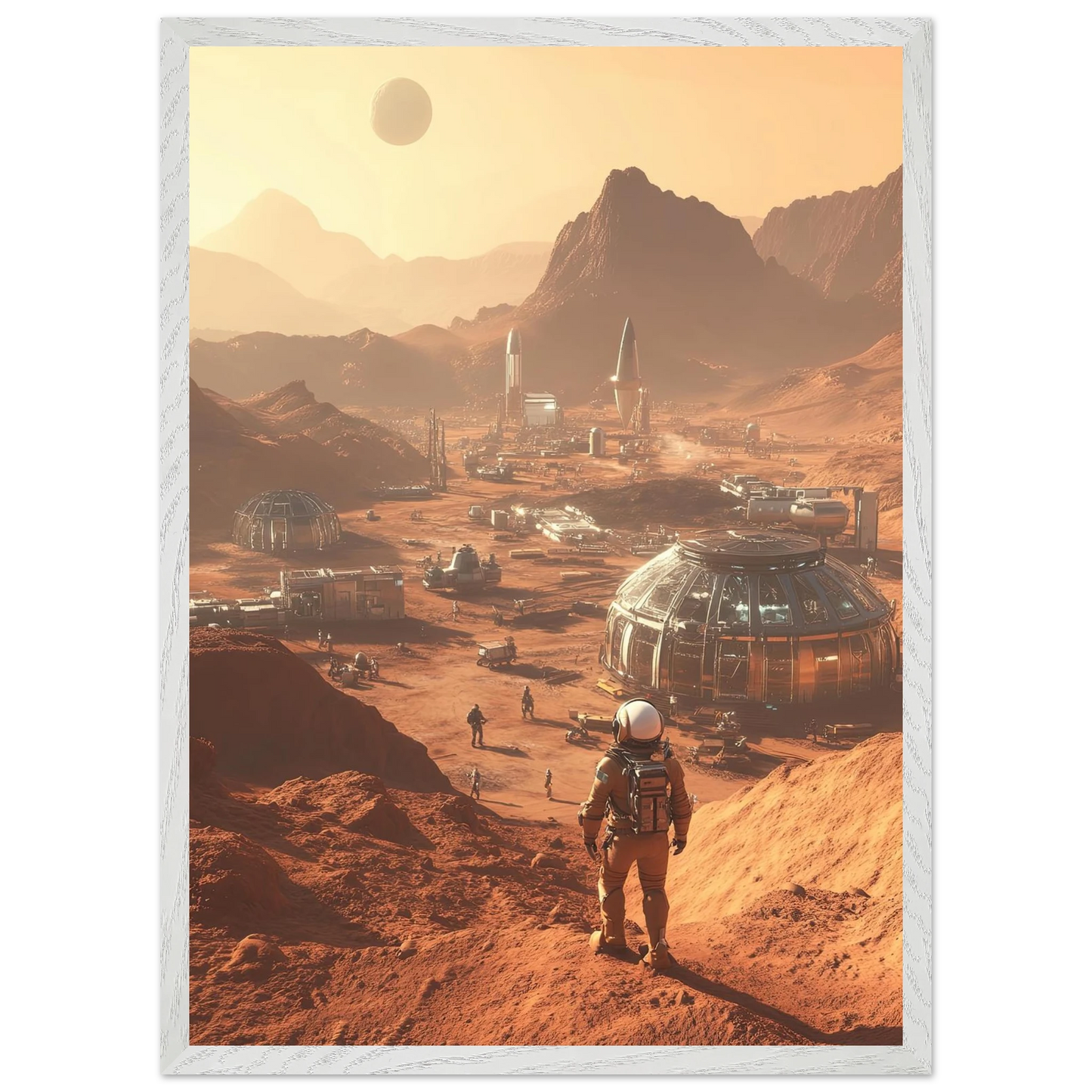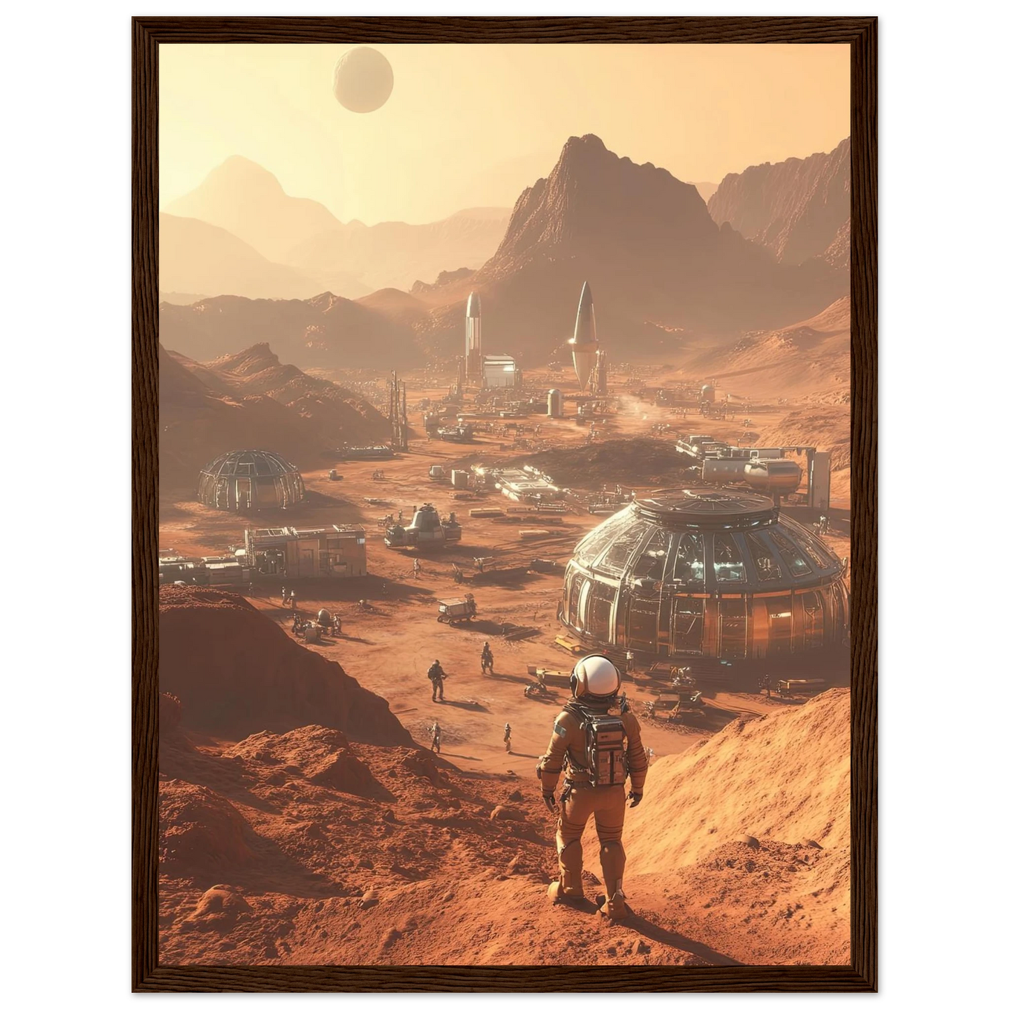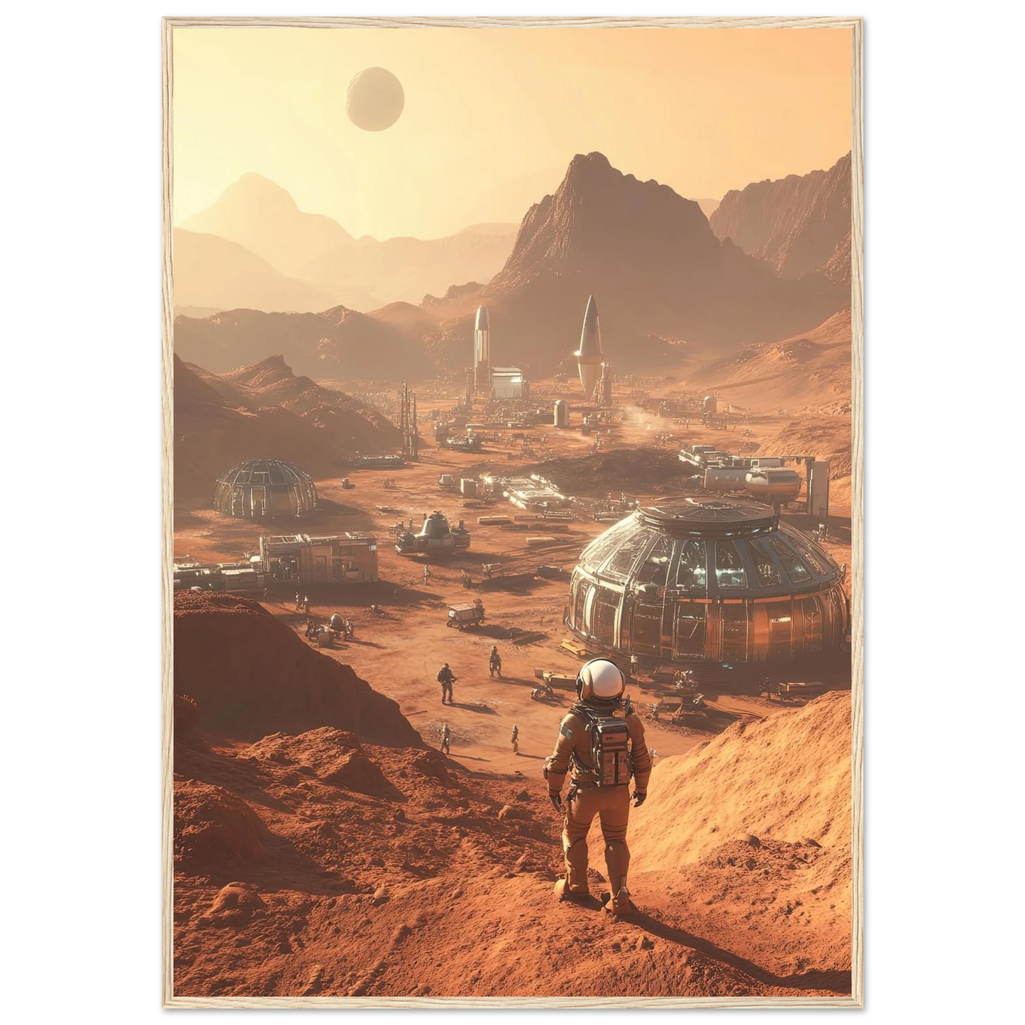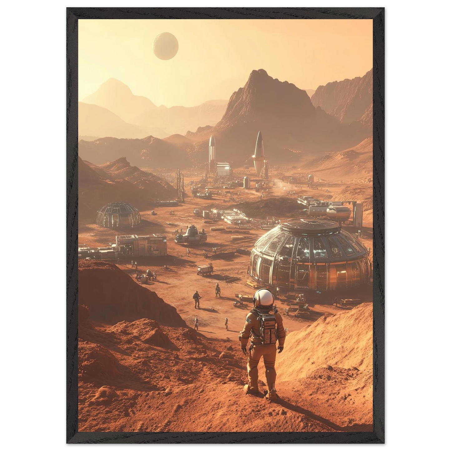 Et visjonært kunstverk som forestiller en fremtidig koloni på Mars. Astronauter og romfartøy utforsker det røde landskapet, mens kuppelformede bygg vitner om menneskets drømmer om å bosette seg på en ny planet. Et motiv som symboliserer eventyrlyst, fremtidstro og vår evige søken etter nye horisonter.