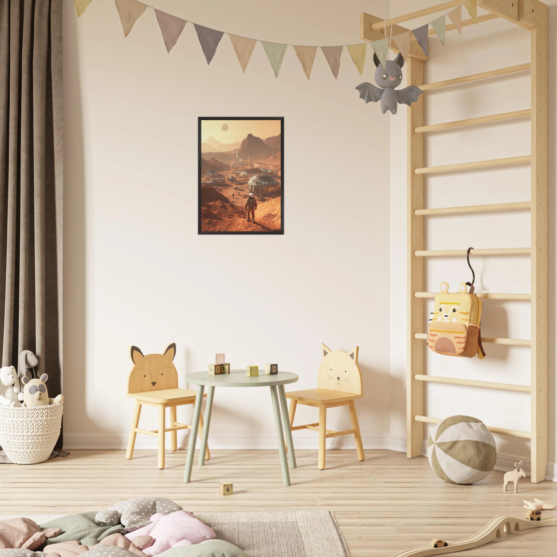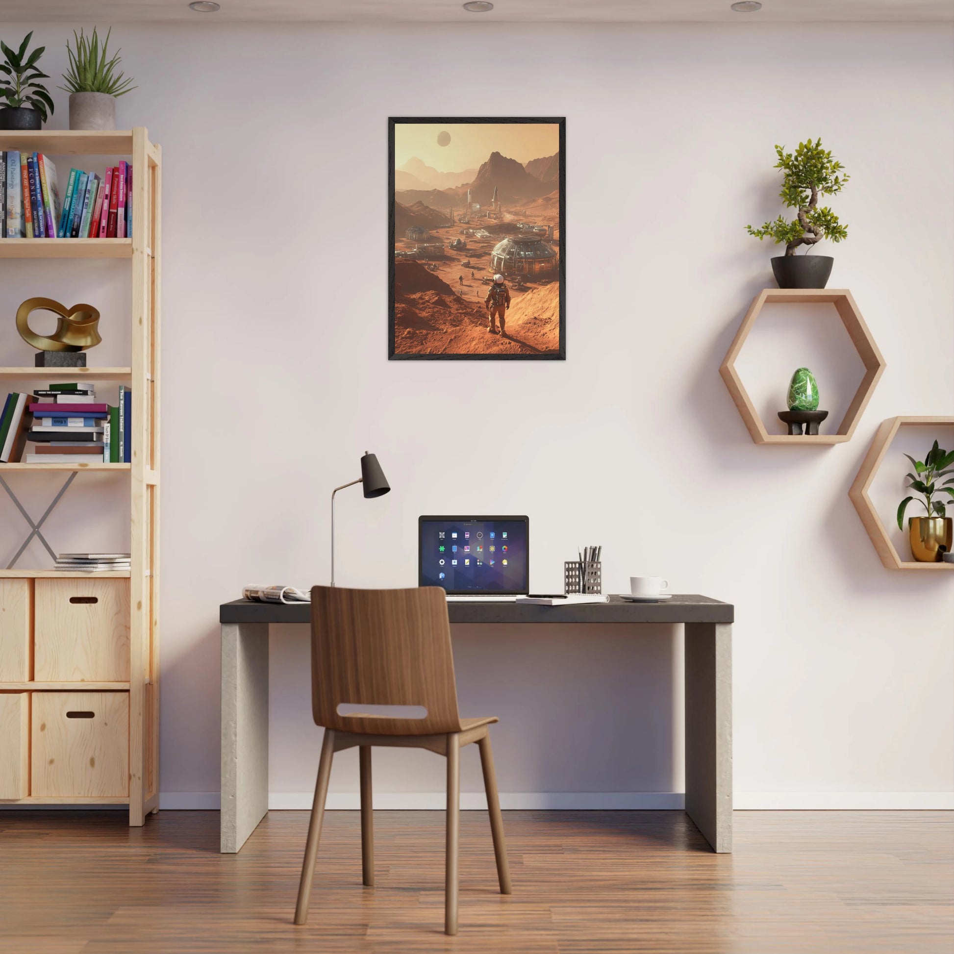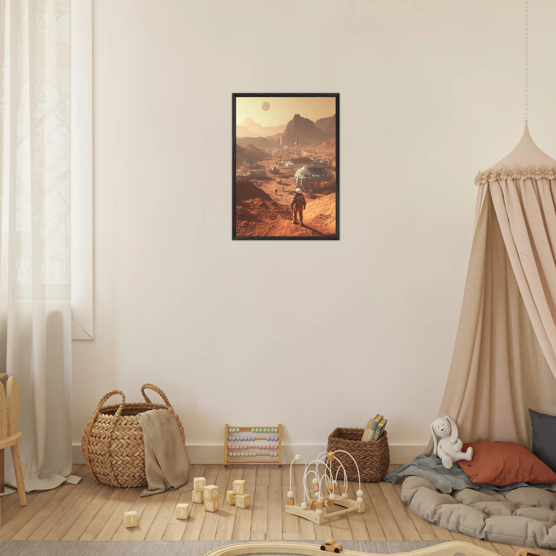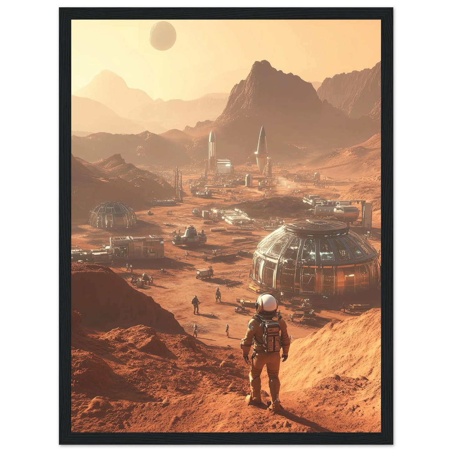 Et visjonært kunstverk som forestiller en fremtidig koloni på Mars. Astronauter og romfartøy utforsker det røde landskapet, mens kuppelformede bygg vitner om menneskets drømmer om å bosette seg på en ny planet. Et motiv som symboliserer eventyrlyst, fremtidstro og vår evige søken etter nye horisonter.