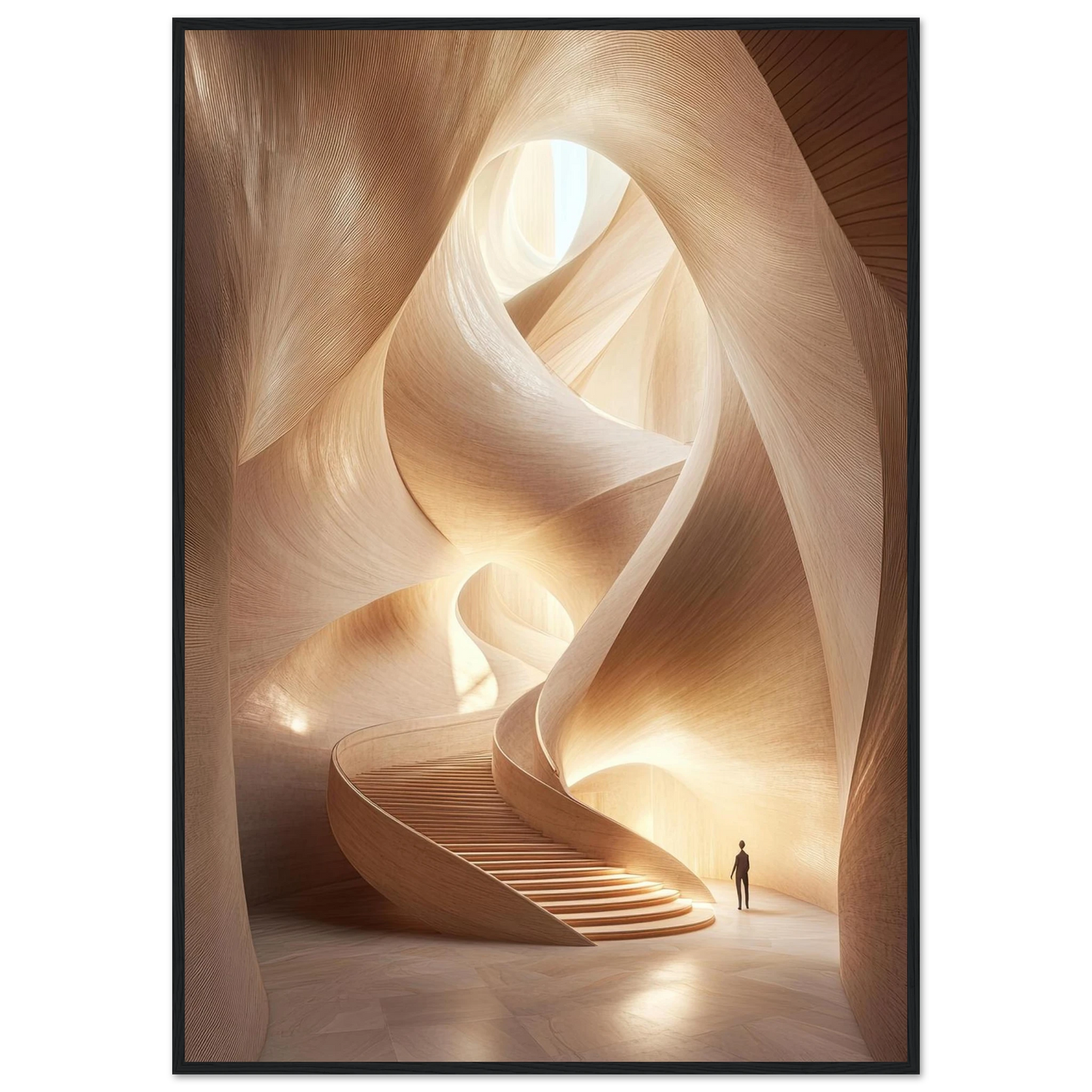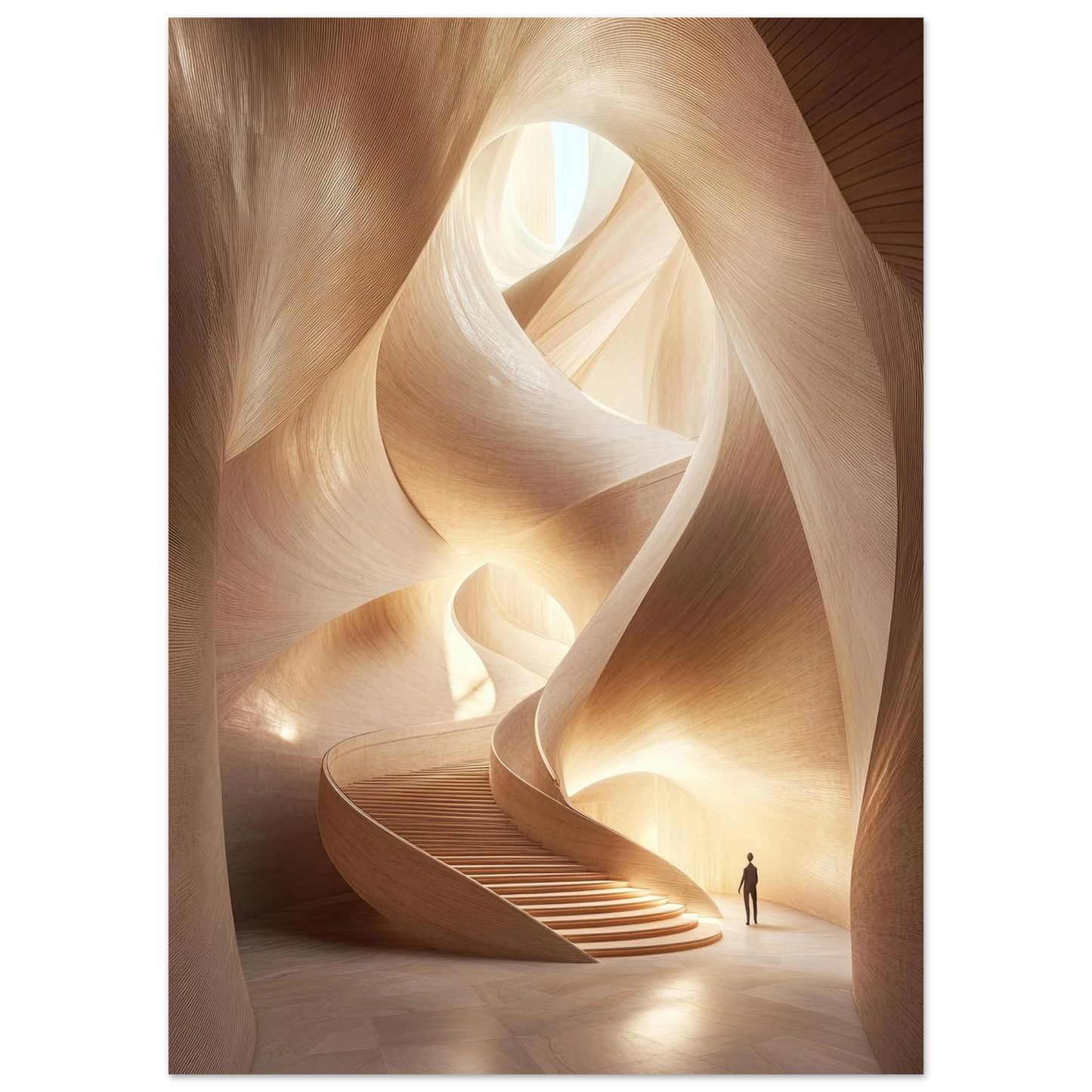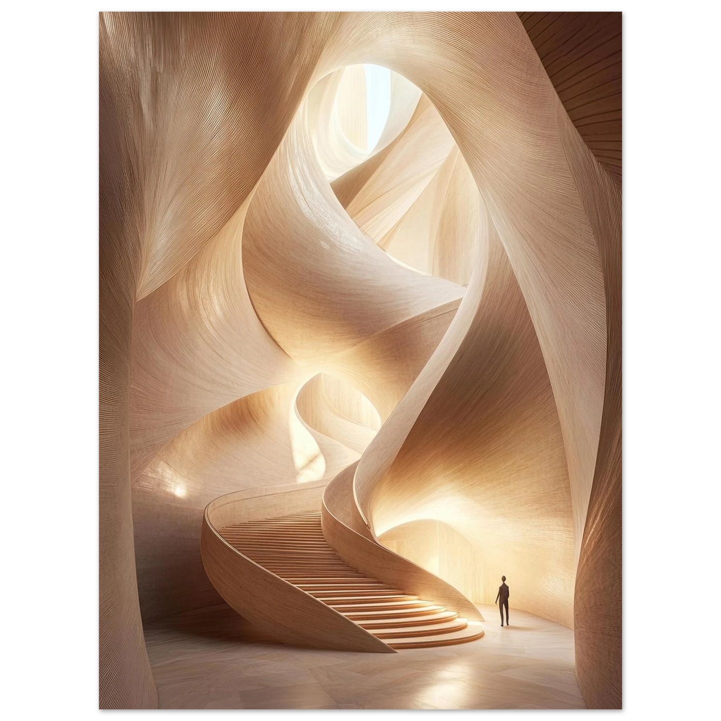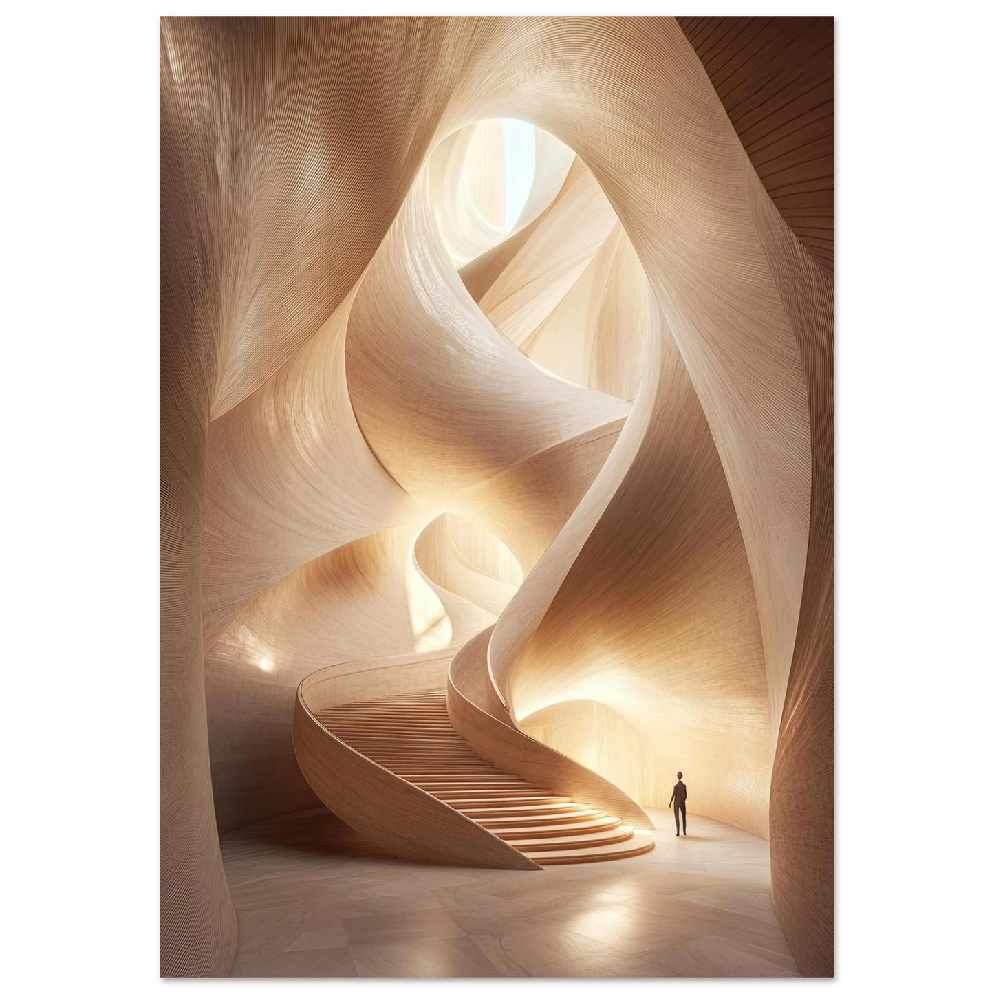 Et visuelt spektakulært motiv som forener lys, form og bevegelse i en nesten drømmeaktig struktur. Den svevende trappen, de flytende linjene og menneskets lille skikkelse skaper en følelse av undring og ro. Passer perfekt for deg som søker noe futuristisk, organisk og storslått i interiøret.