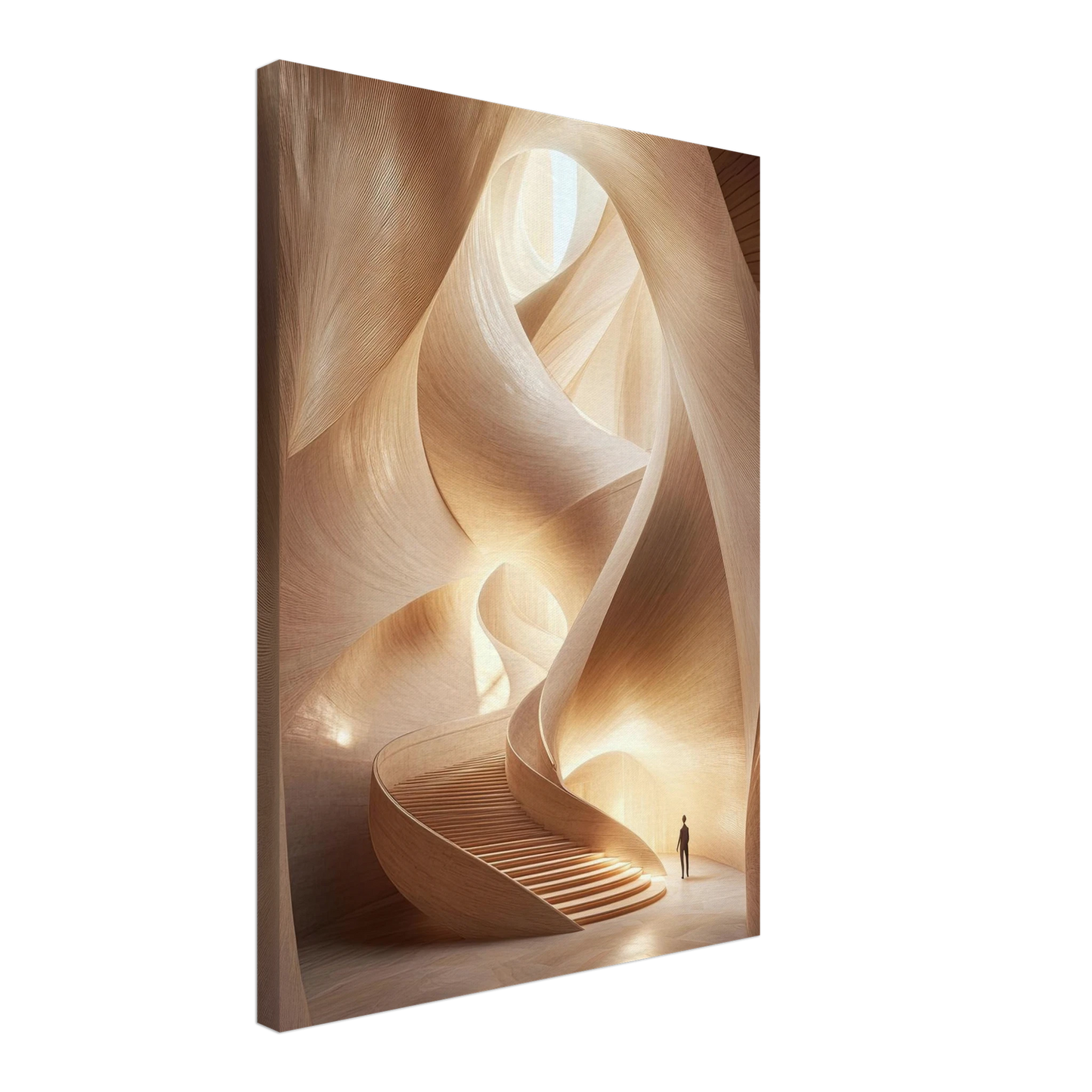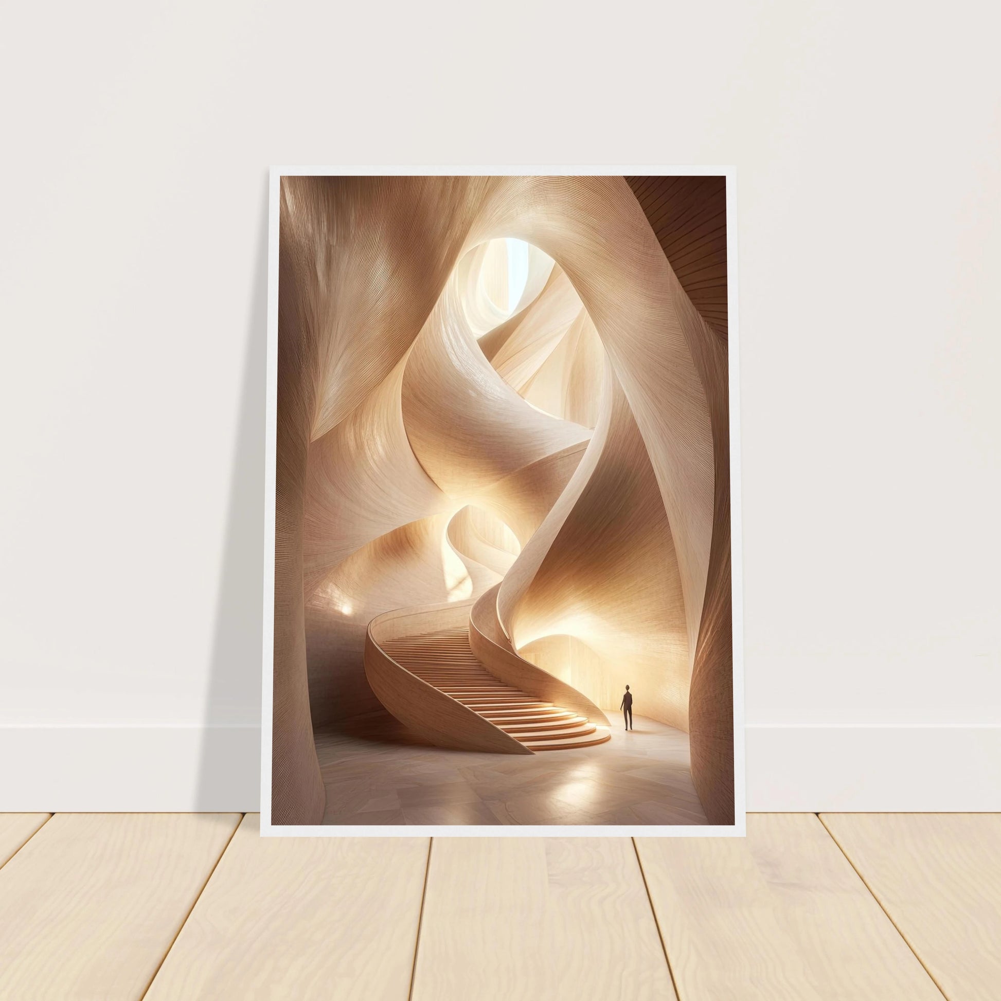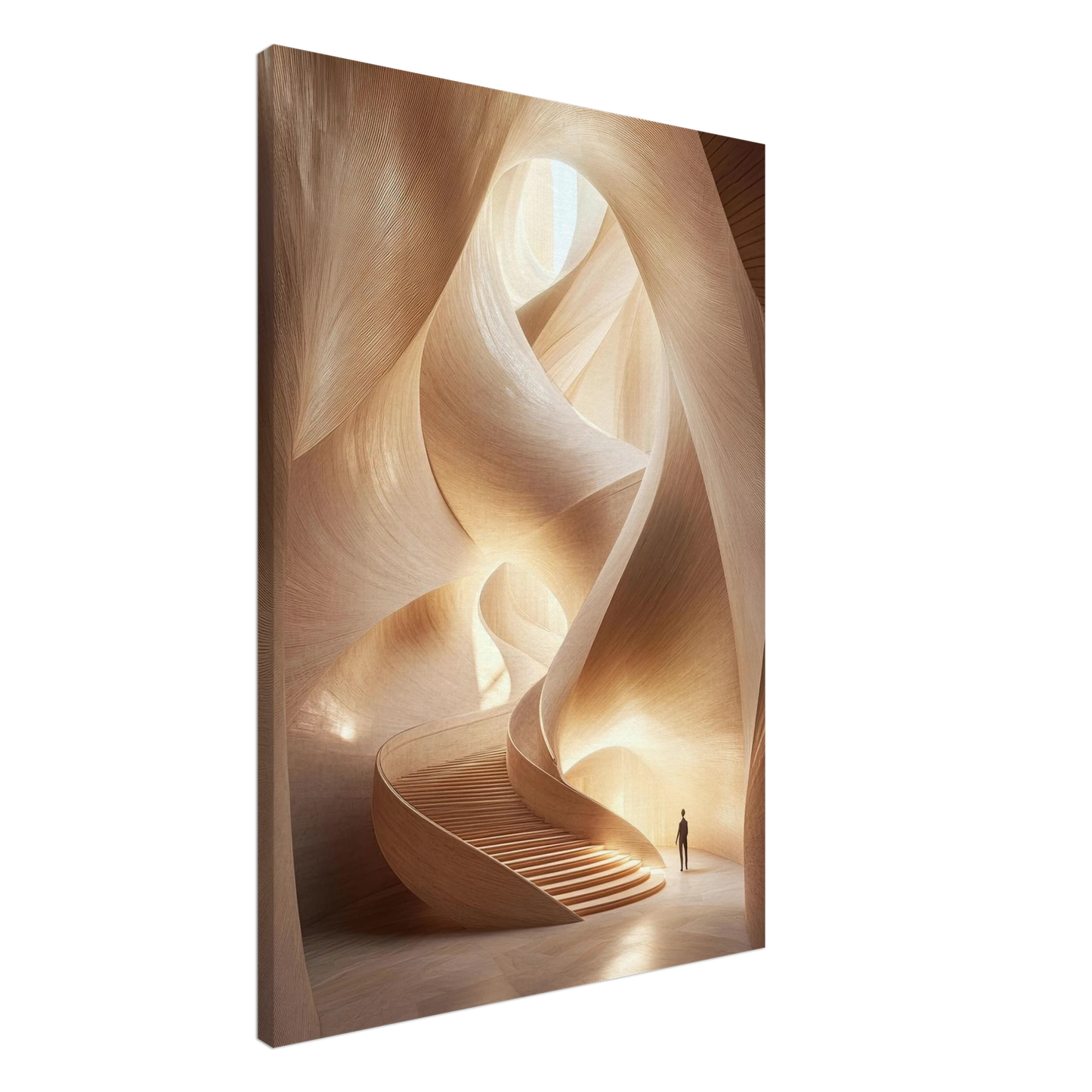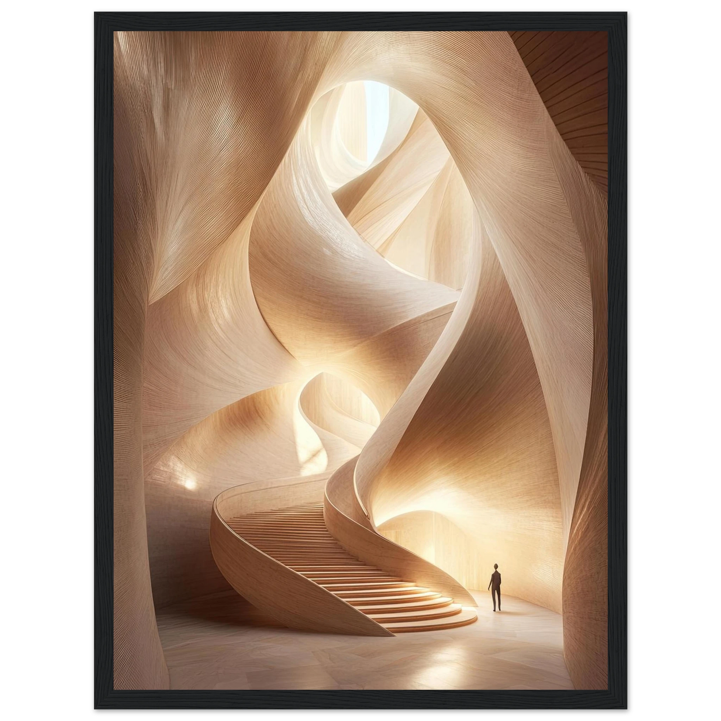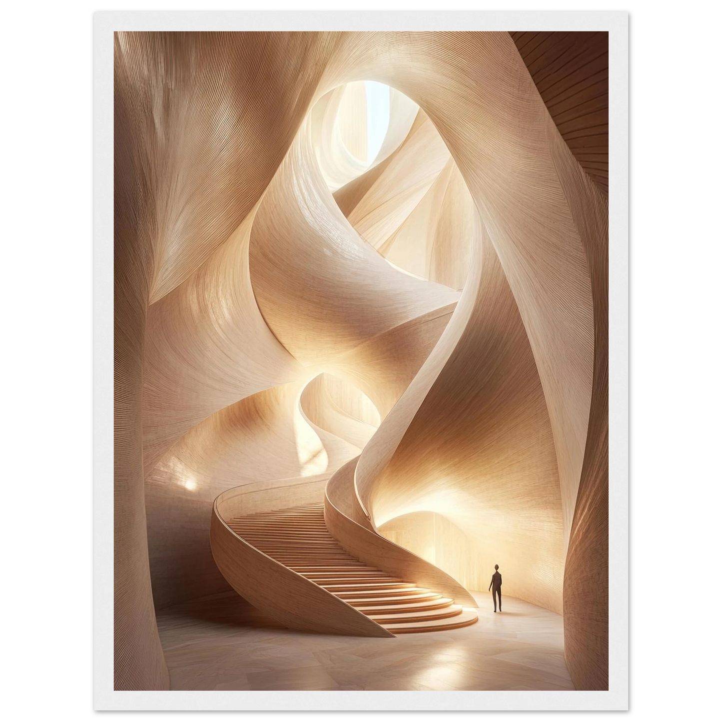 Et visuelt spektakulært motiv som forener lys, form og bevegelse i en nesten drømmeaktig struktur. Den svevende trappen, de flytende linjene og menneskets lille skikkelse skaper en følelse av undring og ro. Passer perfekt for deg som søker noe futuristisk, organisk og storslått i interiøret.