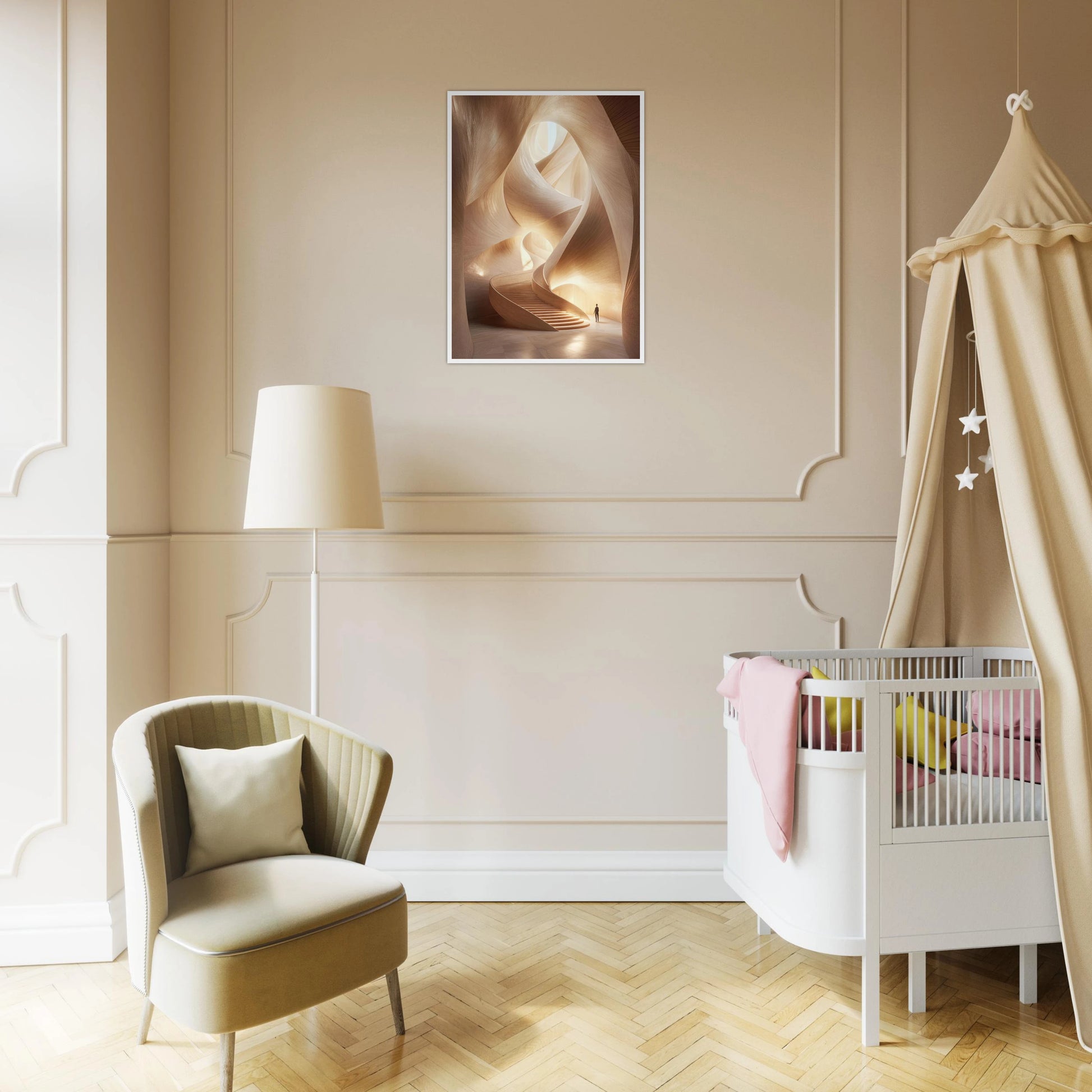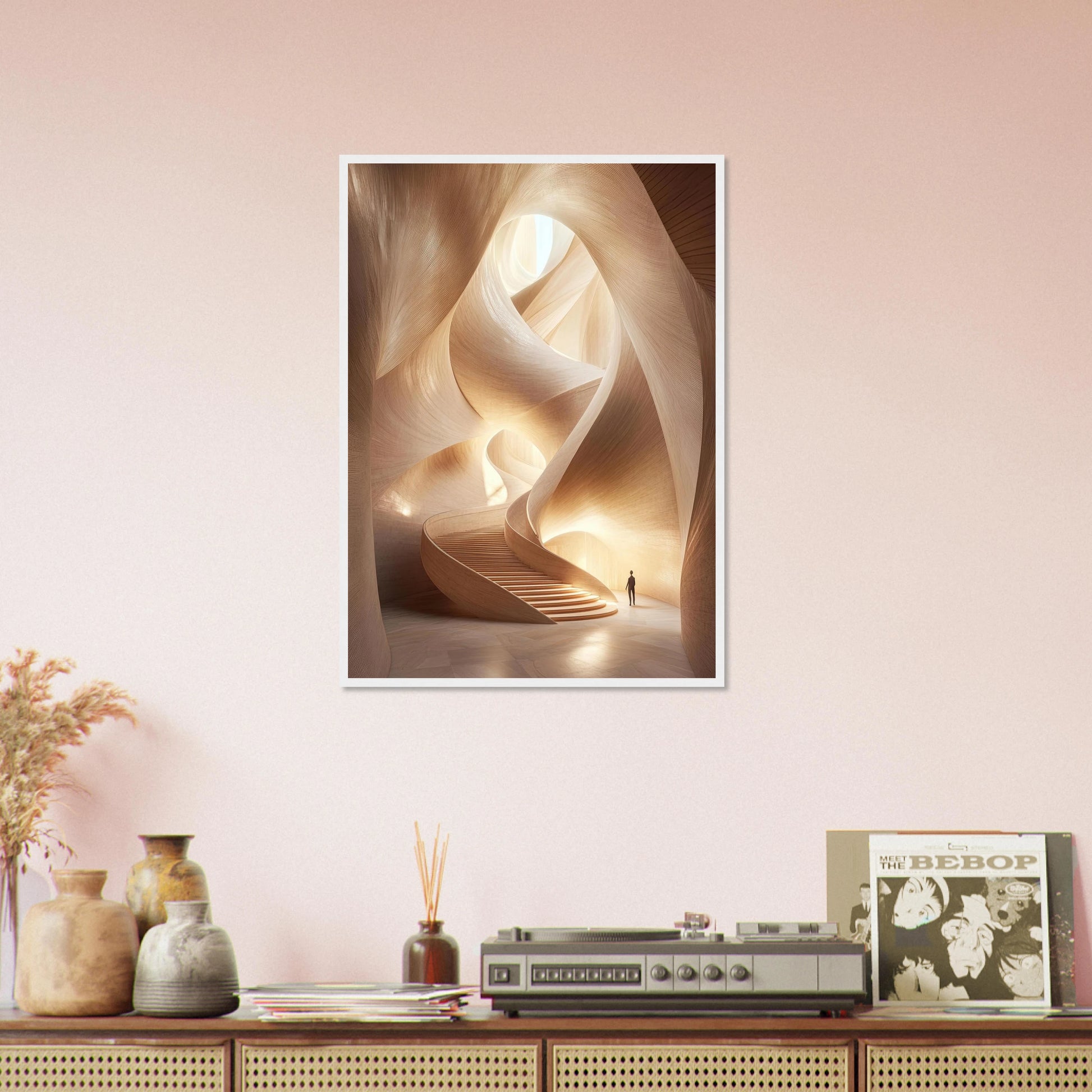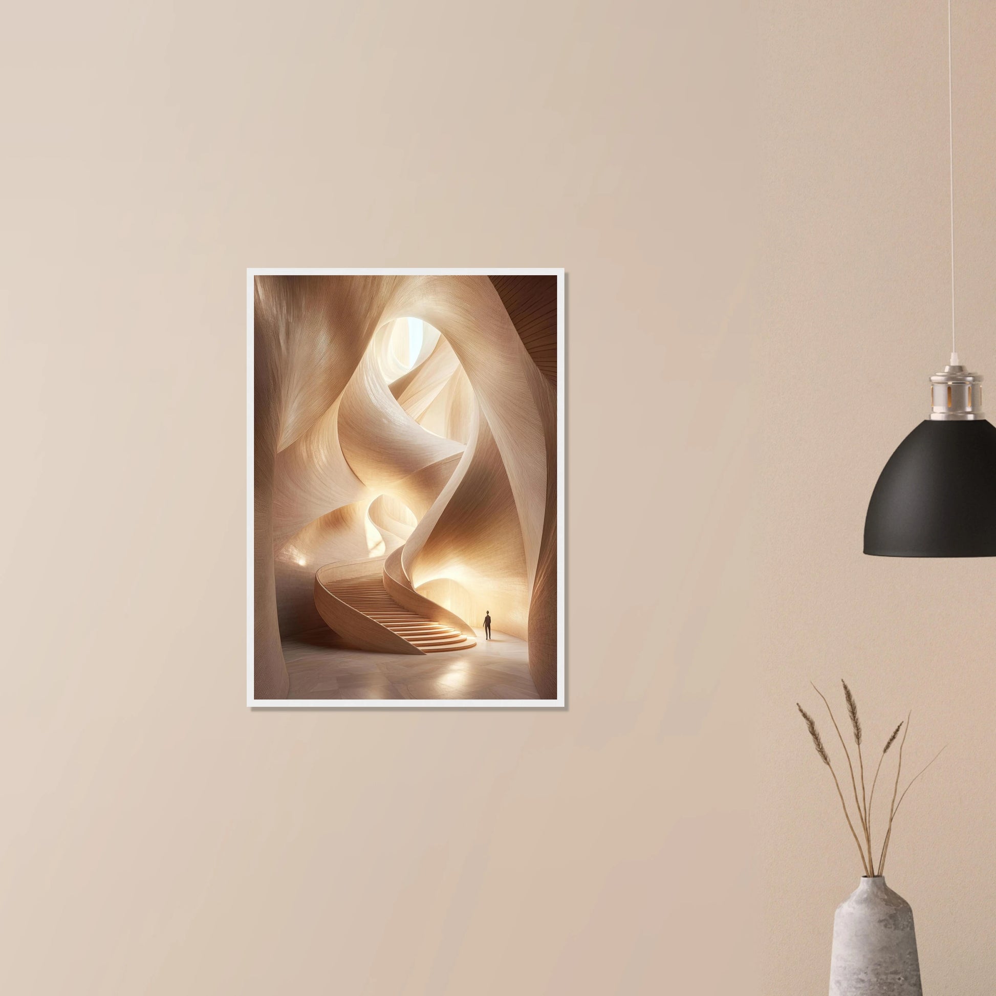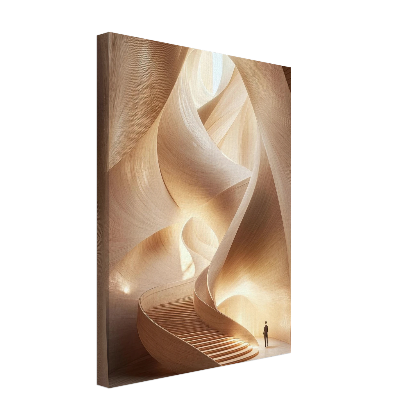 Et visuelt spektakulært motiv som forener lys, form og bevegelse i en nesten drømmeaktig struktur. Den svevende trappen, de flytende linjene og menneskets lille skikkelse skaper en følelse av undring og ro. Passer perfekt for deg som søker noe futuristisk, organisk og storslått i interiøret.