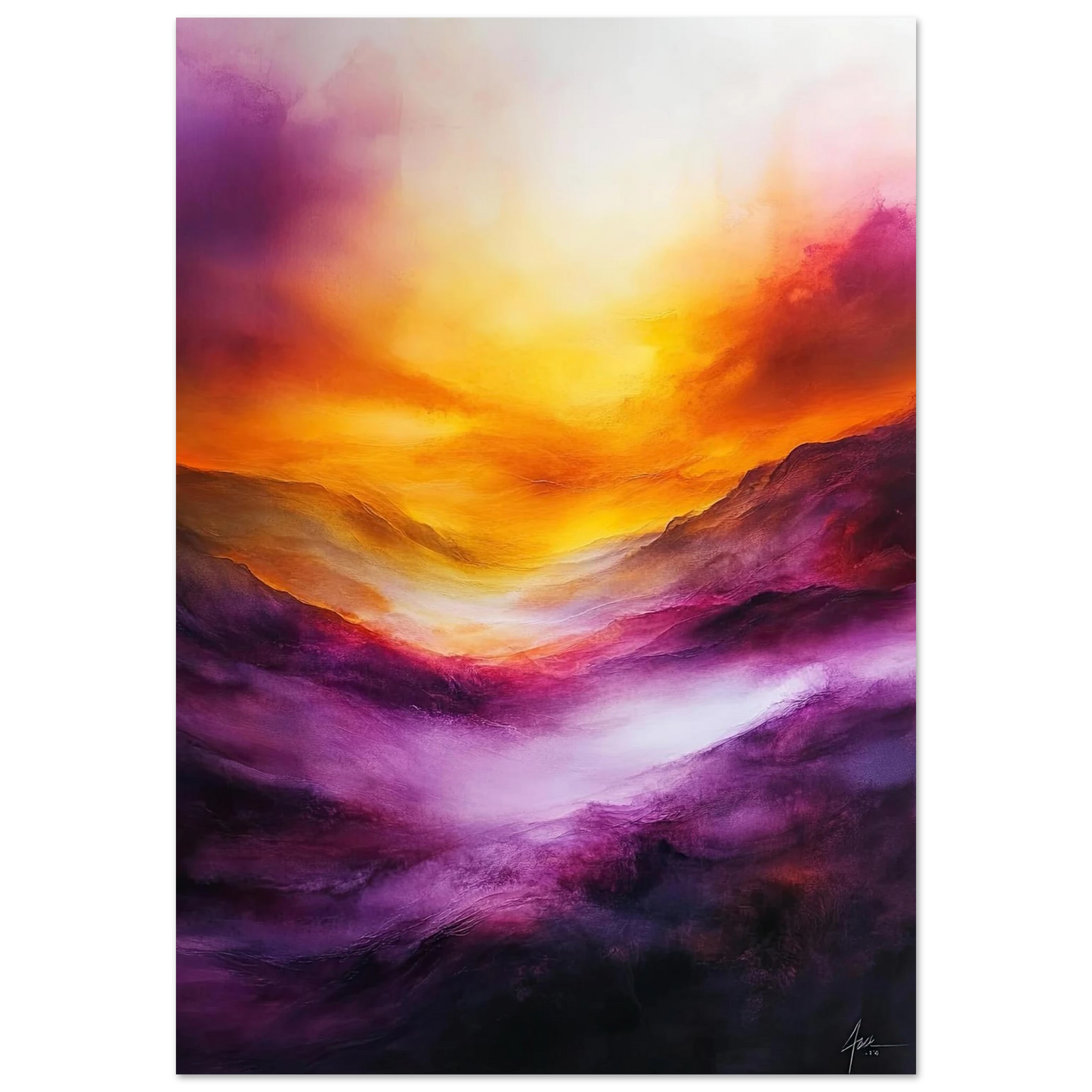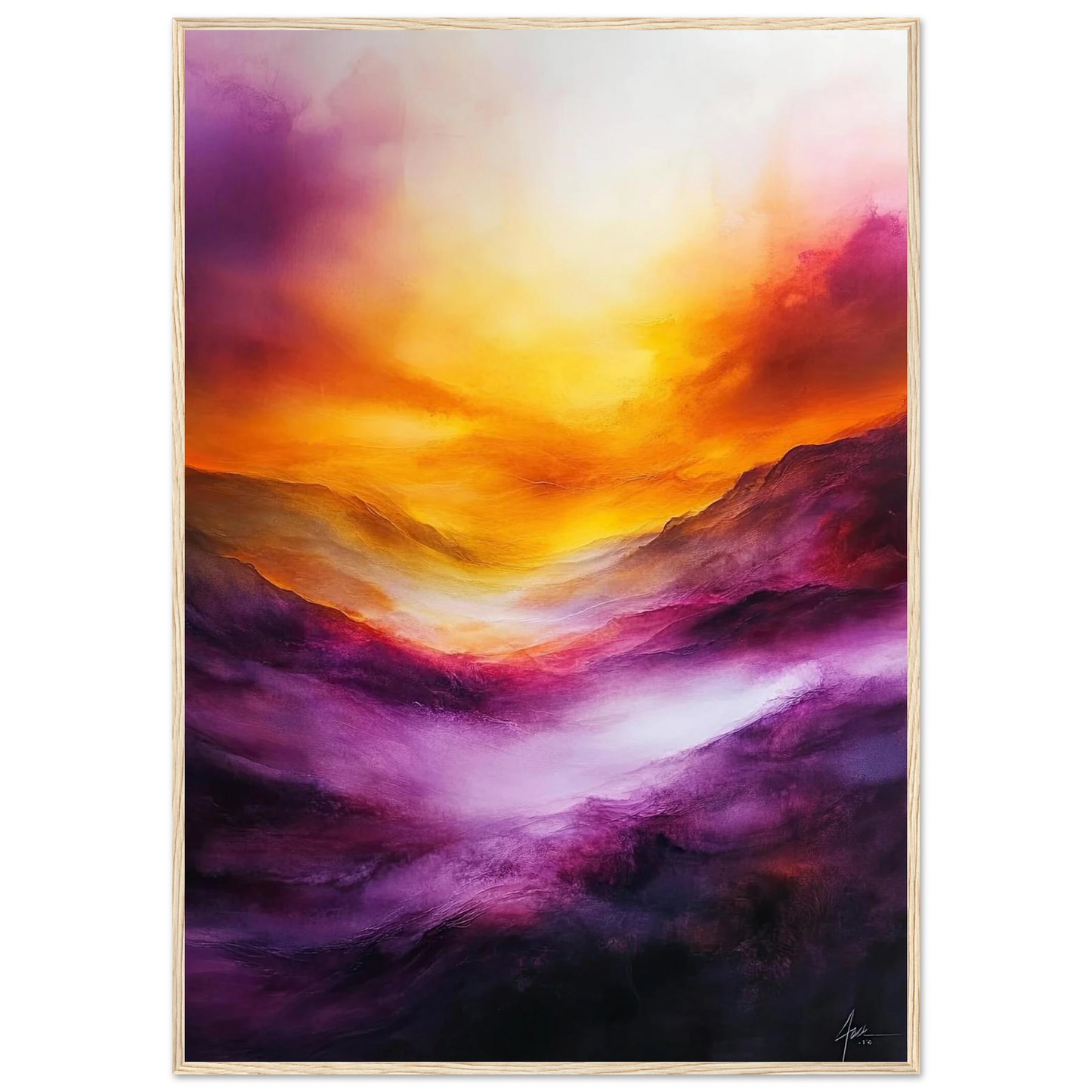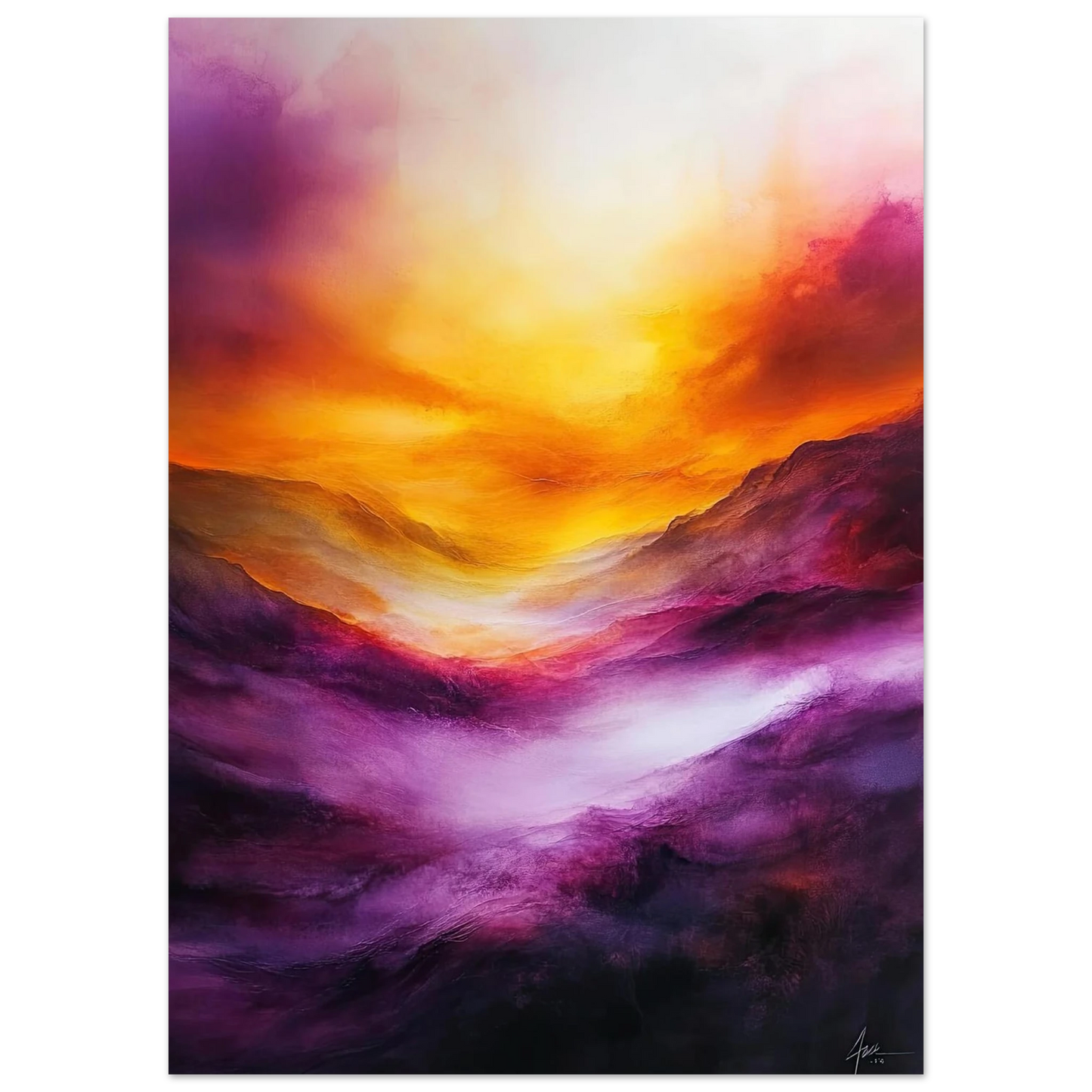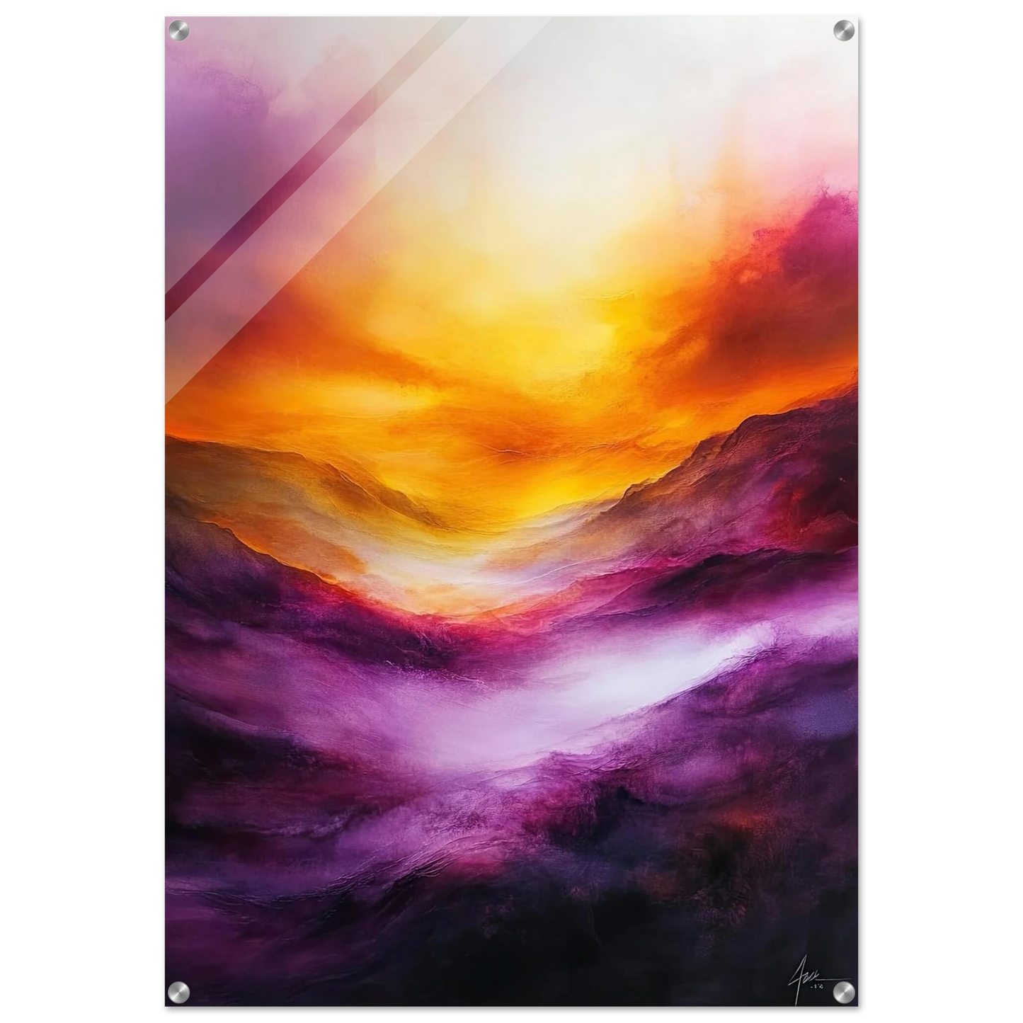 Et stemningsfullt og abstrakt kunstverk med dype lillatoner og varme oransje nyanser. Et bilde som føles som et gjennombrudd av lys – både drømmende og kraftfullt på samme tid.