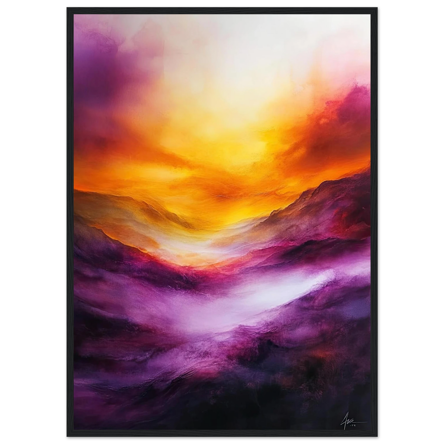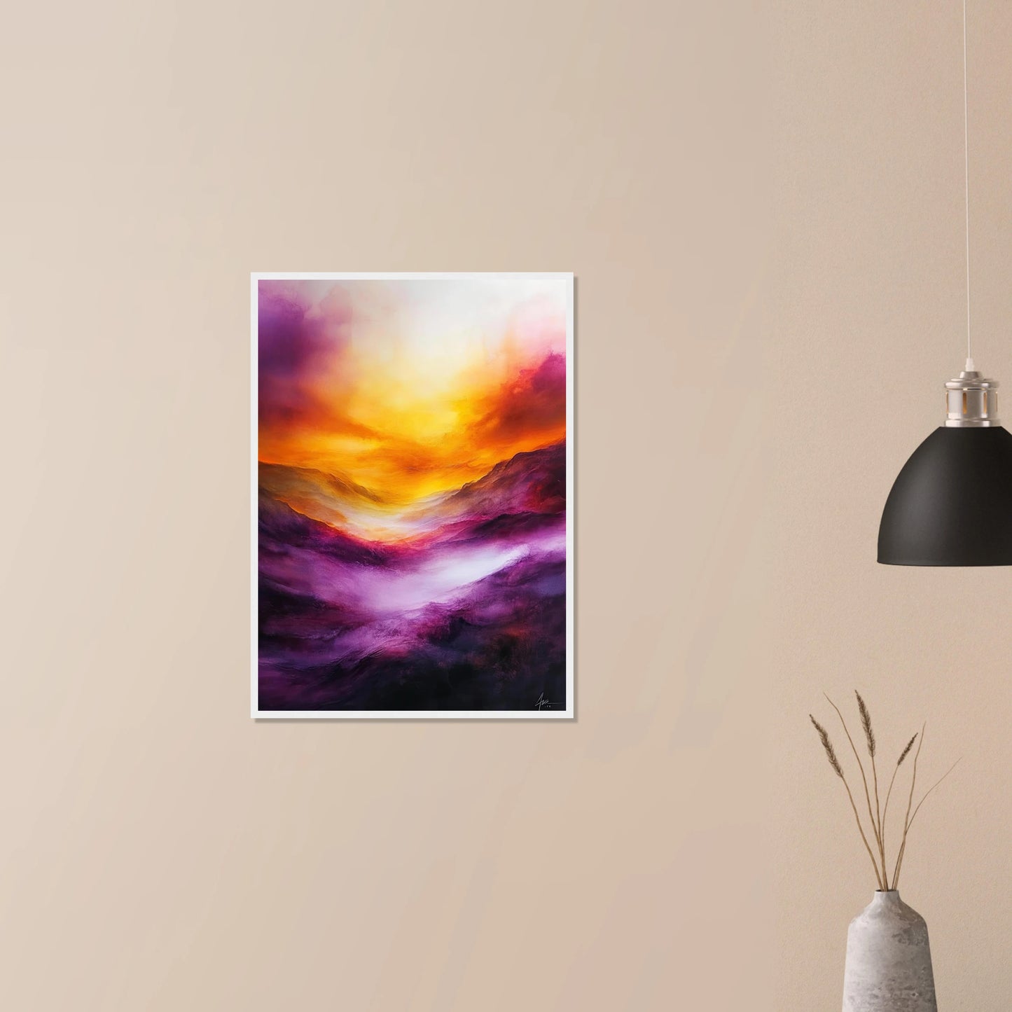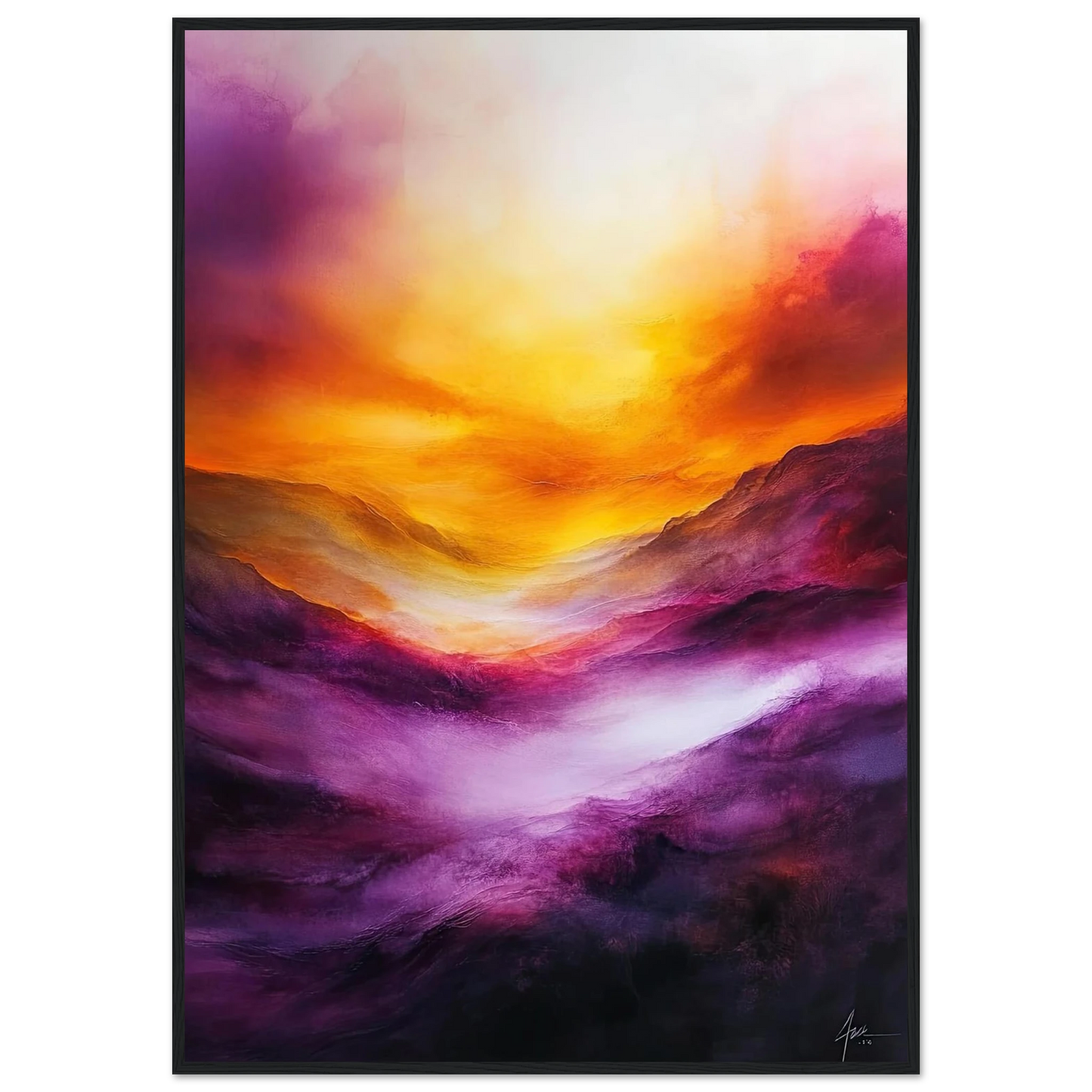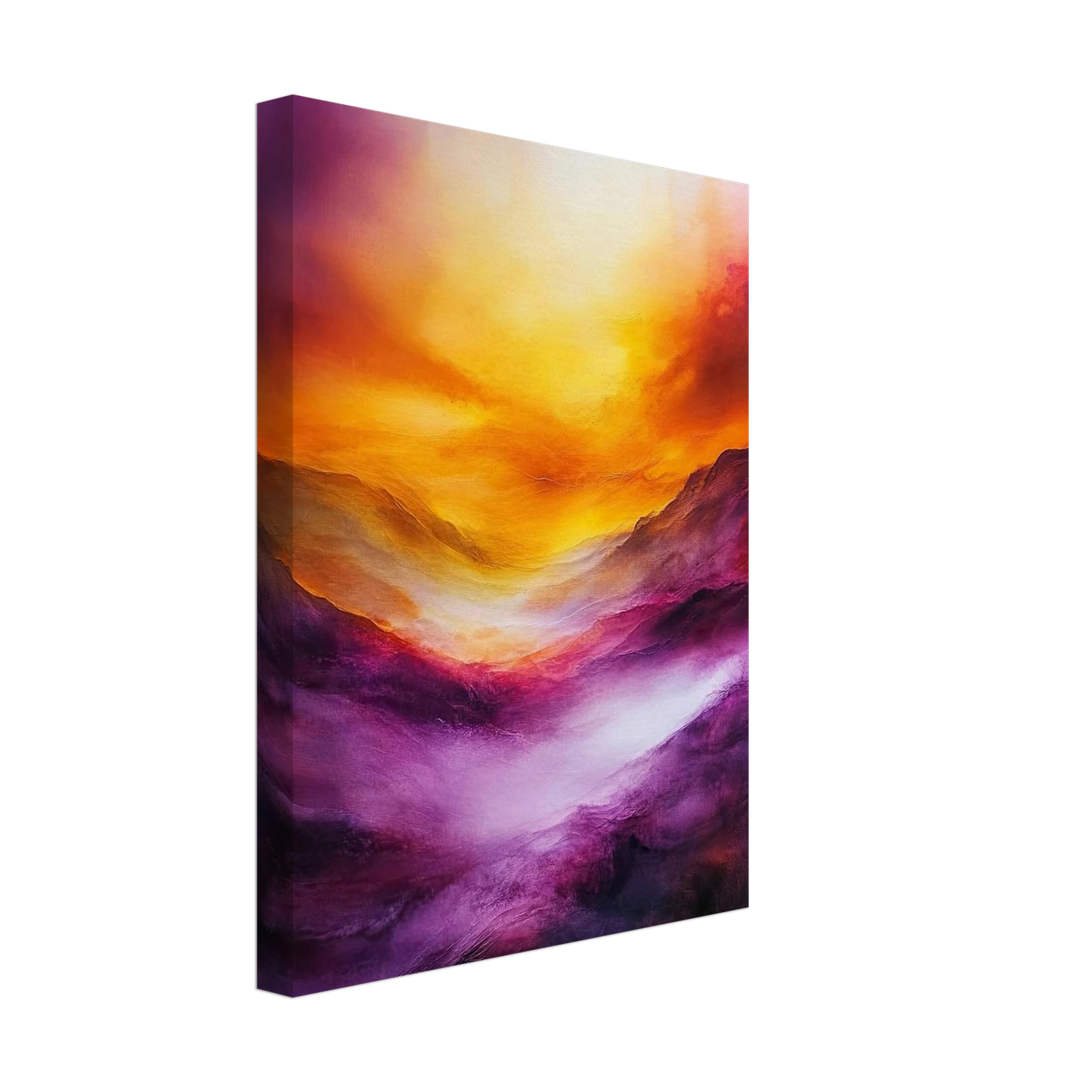 Et stemningsfullt og abstrakt kunstverk med dype lillatoner og varme oransje nyanser. Et bilde som føles som et gjennombrudd av lys – både drømmende og kraftfullt på samme tid.