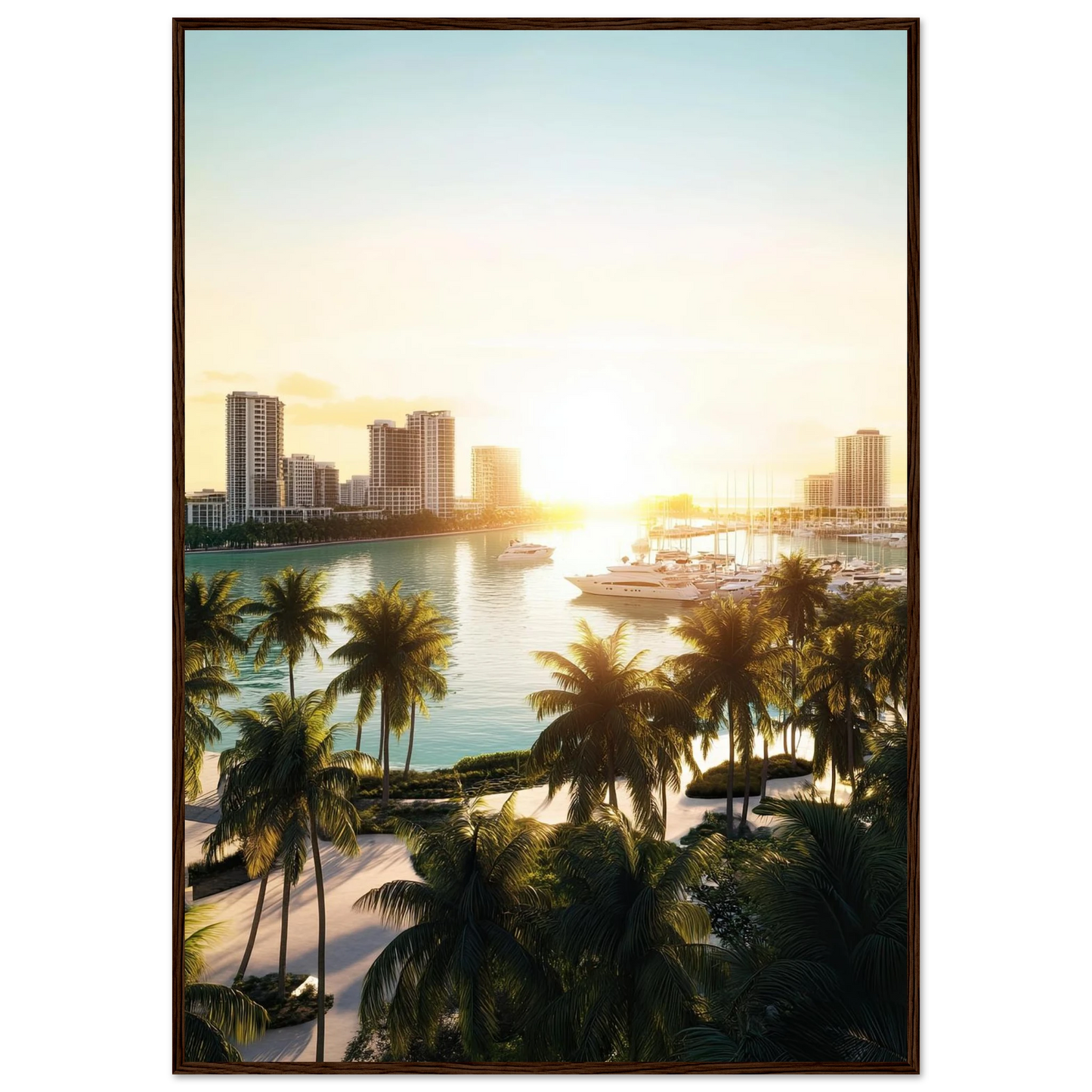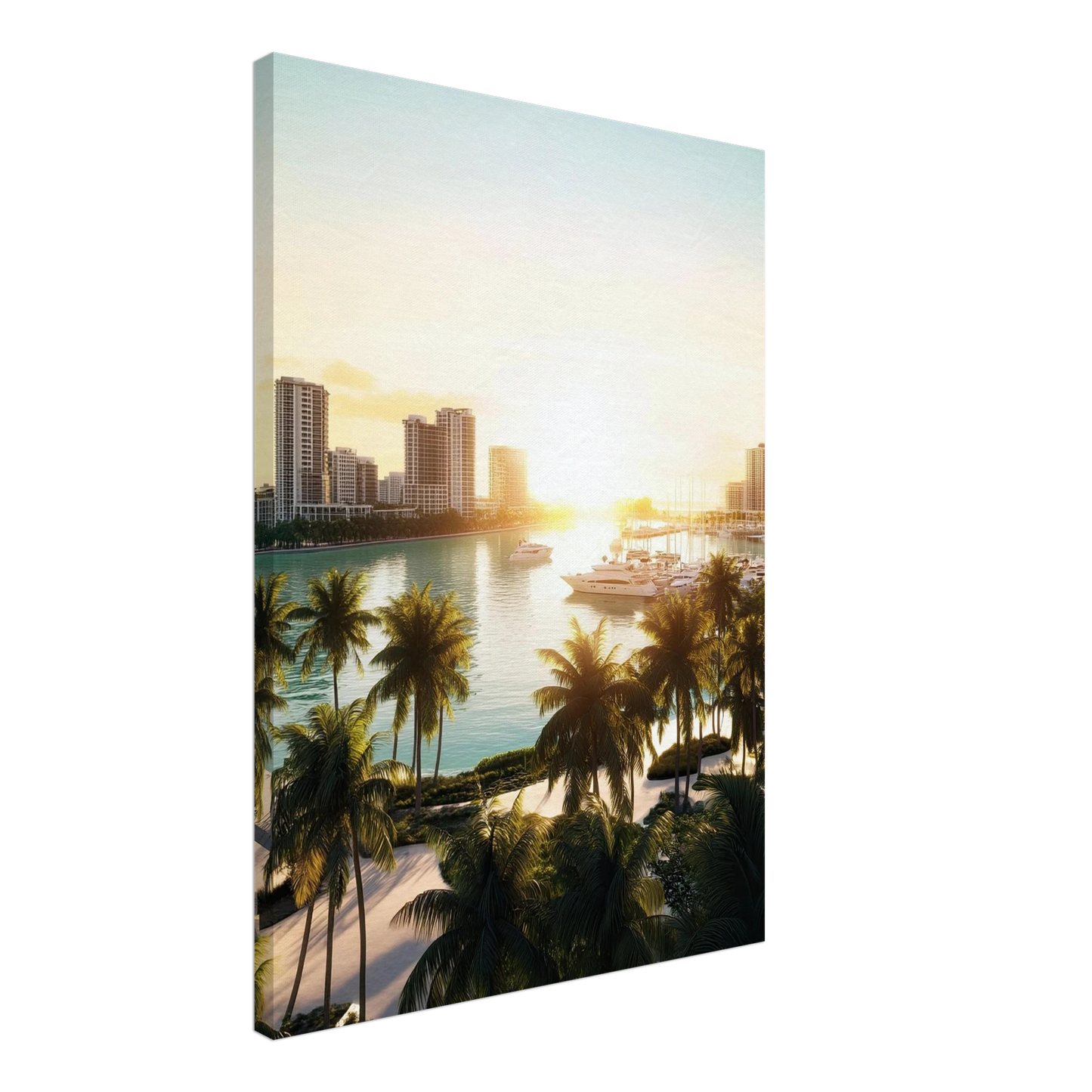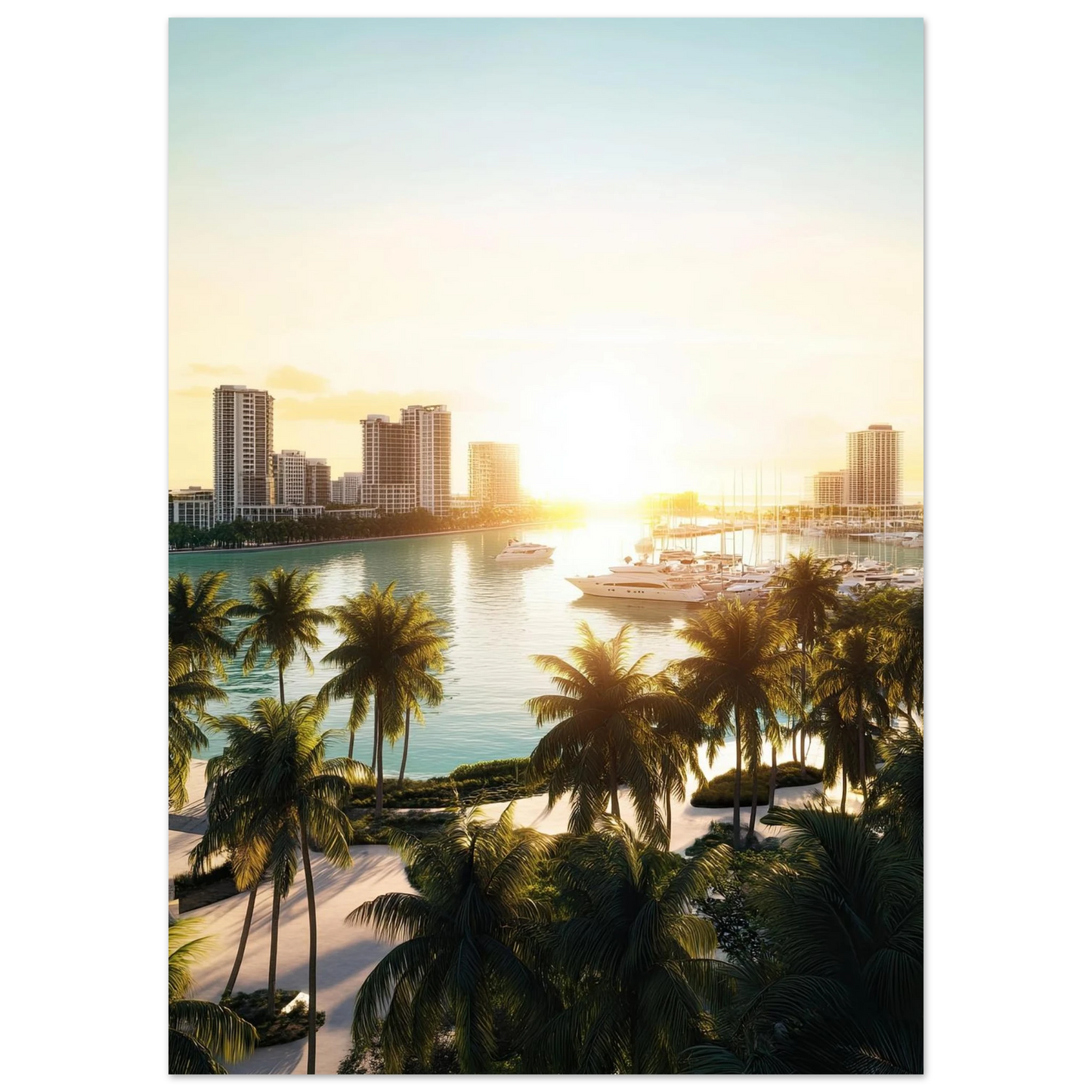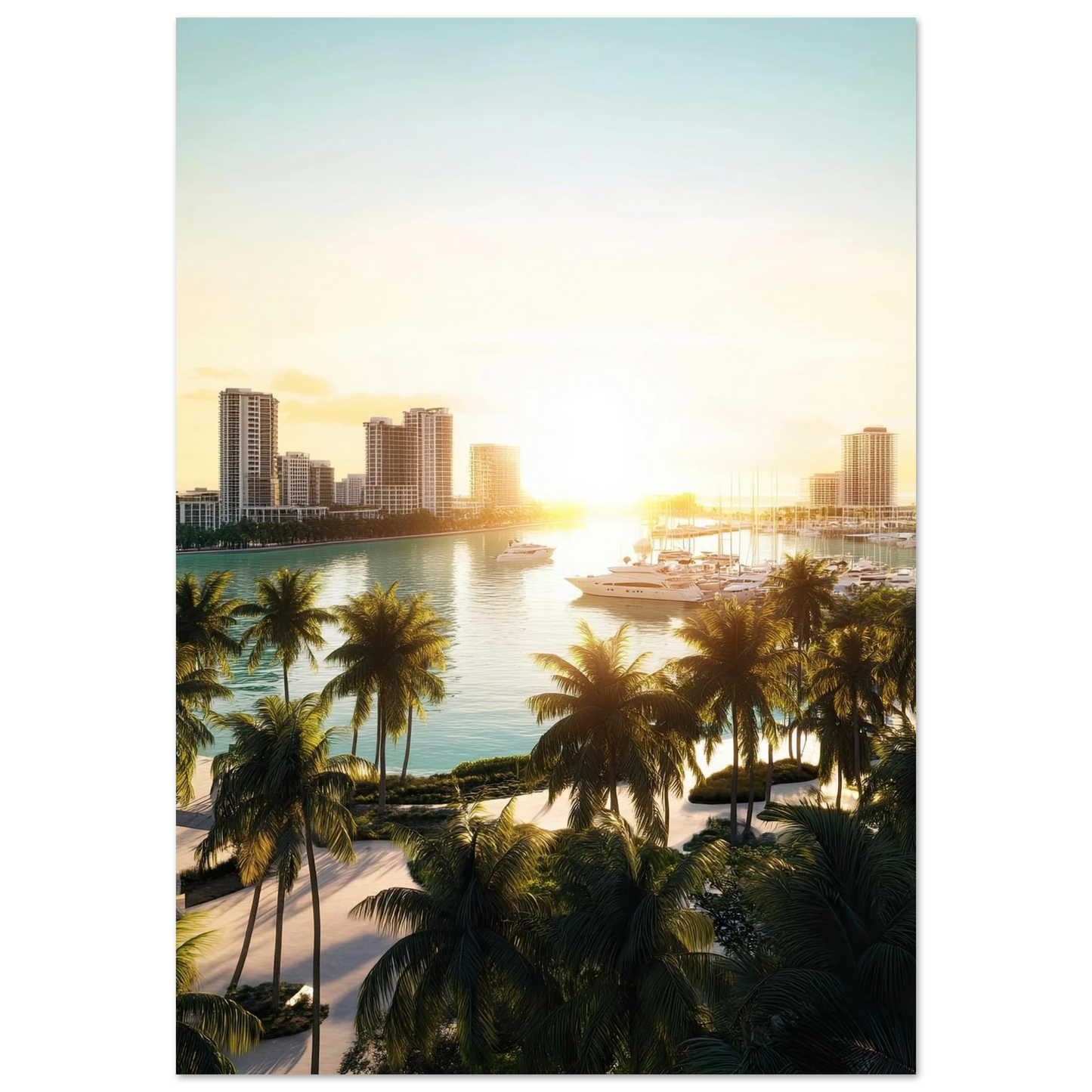Et lyst og eksklusivt motiv som fanger følelsen av moderne kystbyliv med skyline, marina og luksusyachter badet i sollys. Perfekt for deg som ønsker å tilføre hjemmet en følelse av stilfull frihet og urban sommerstemning.
