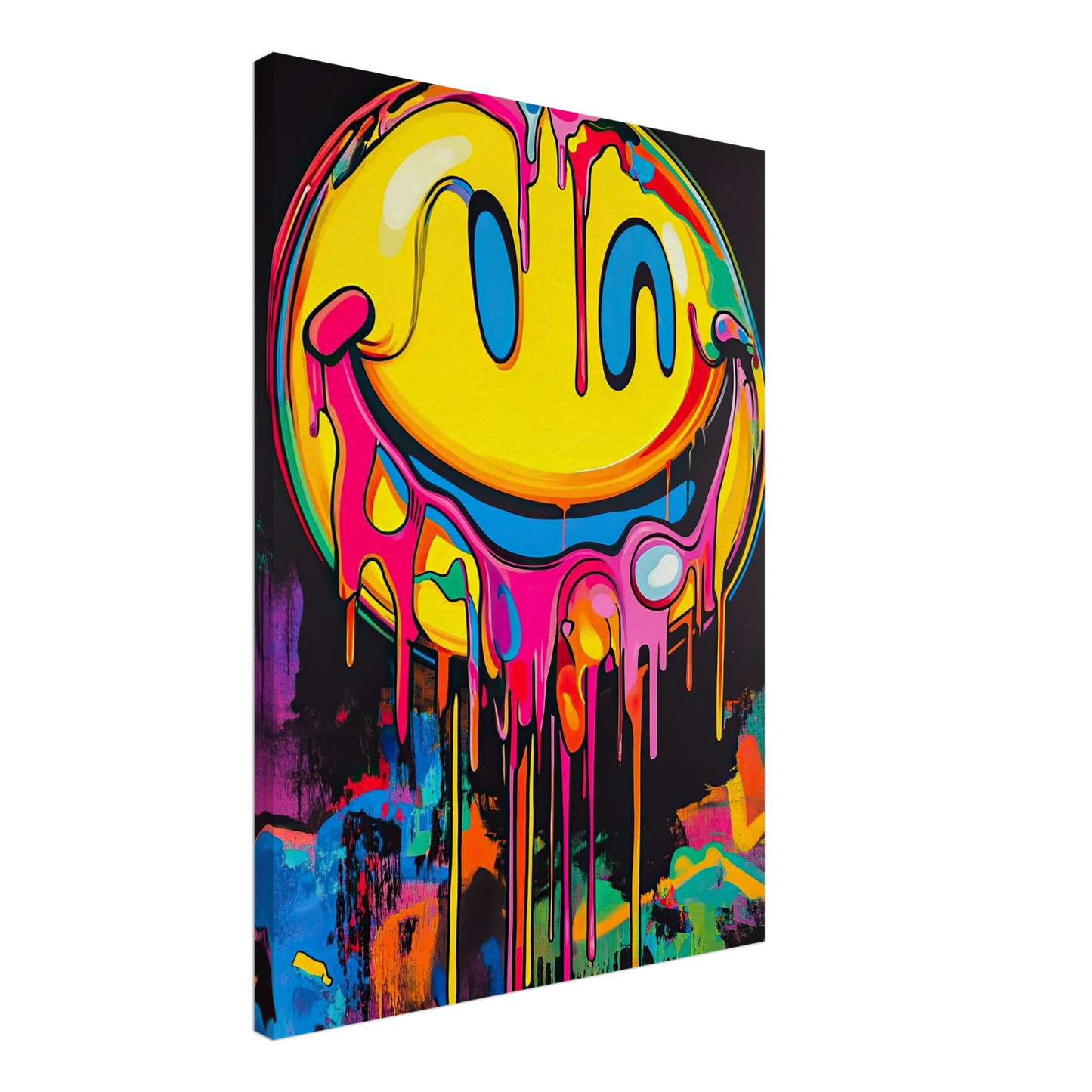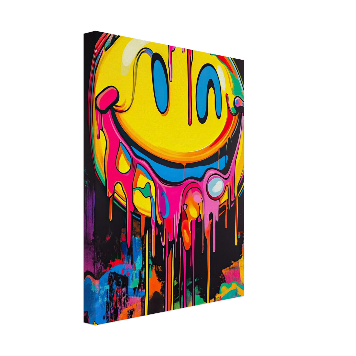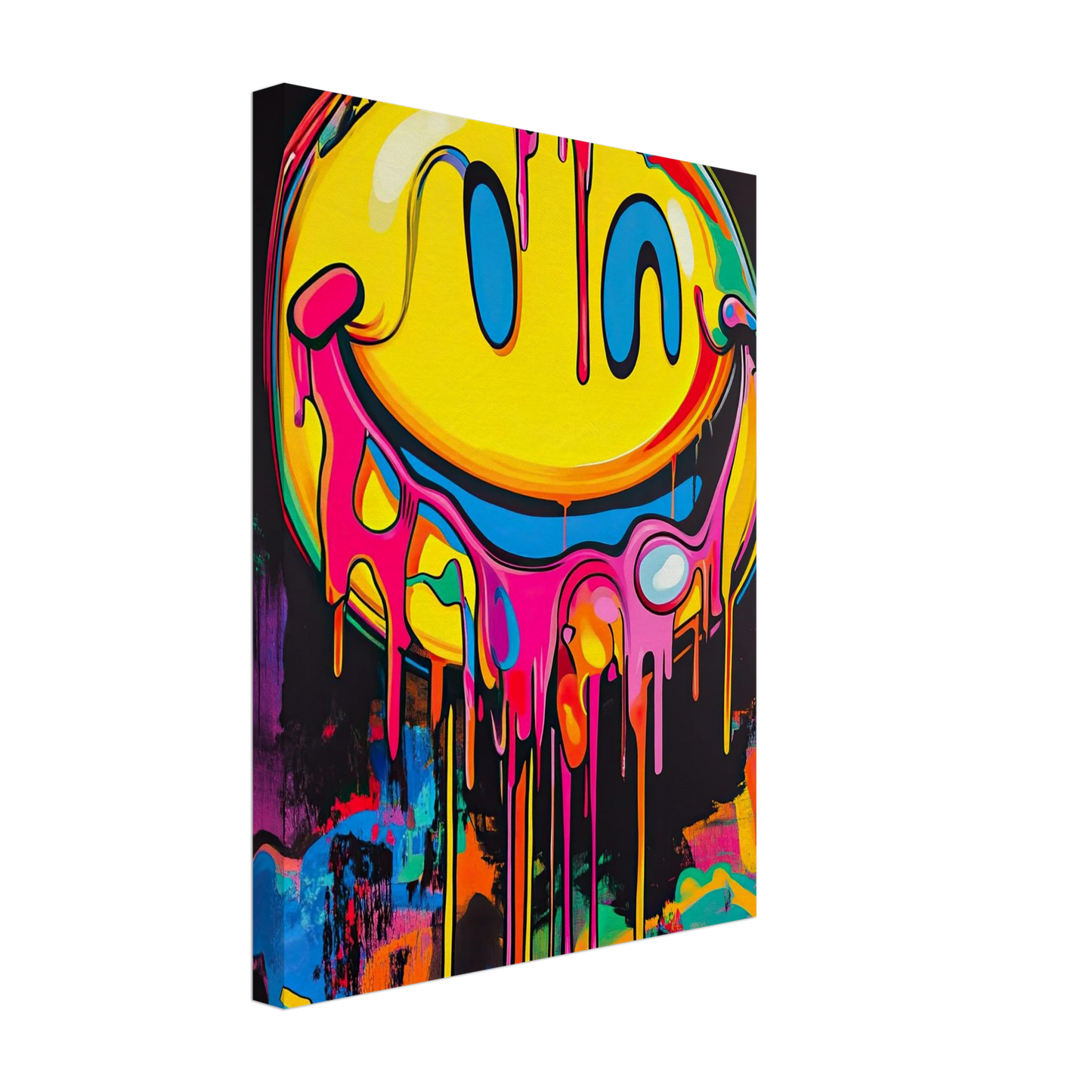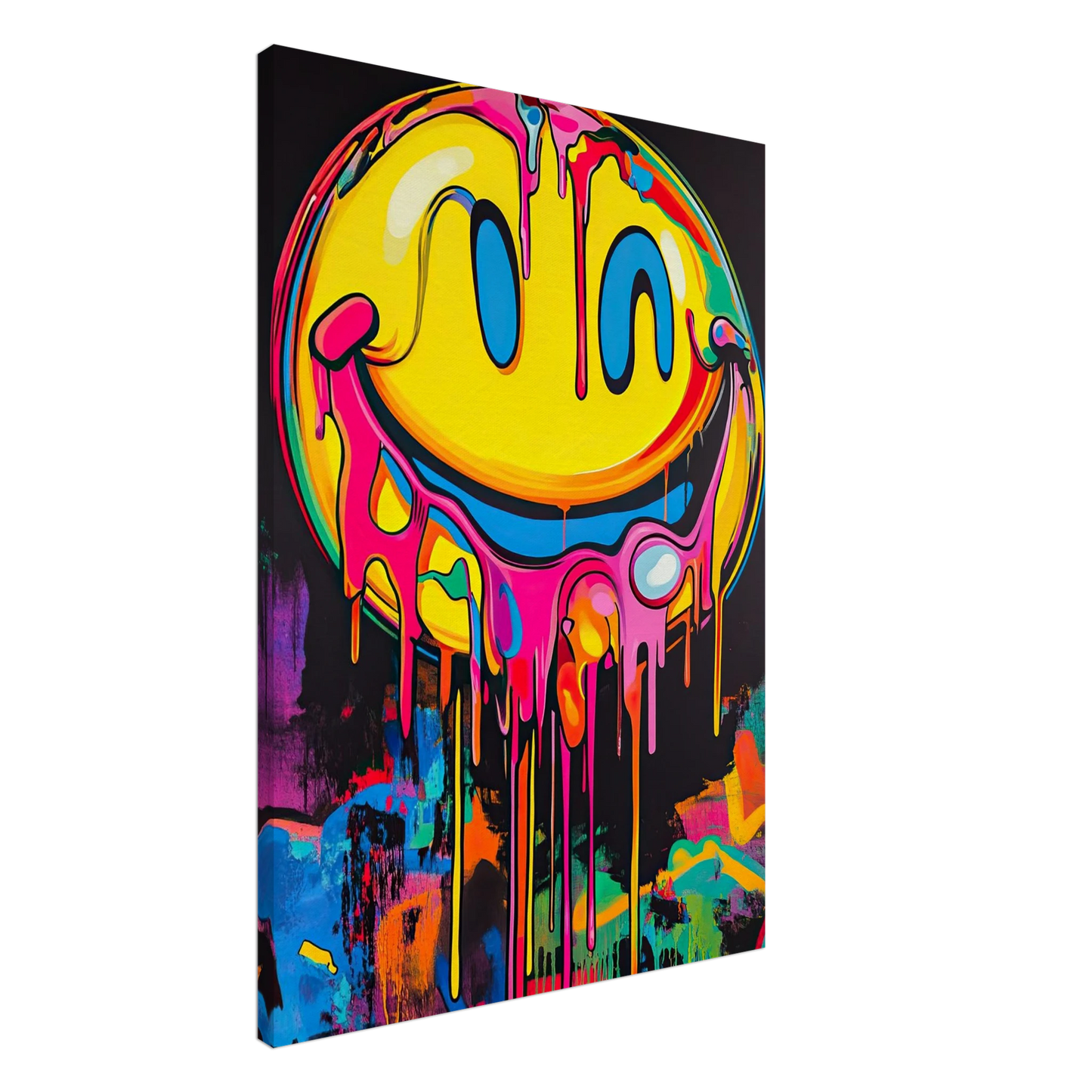 Et ikonisk smilefjes smelter nedover lerretet i en eksplosjon av neonrosa, gult og elektriske fargetoner. Den lekne kontrasten mellom det glade symbolet og den rå, dryppende effekten gir motivet både humor og edge. Perfekt for deg som vil tilføre rommet et urbant blikkfang med popkulturell attityde.
