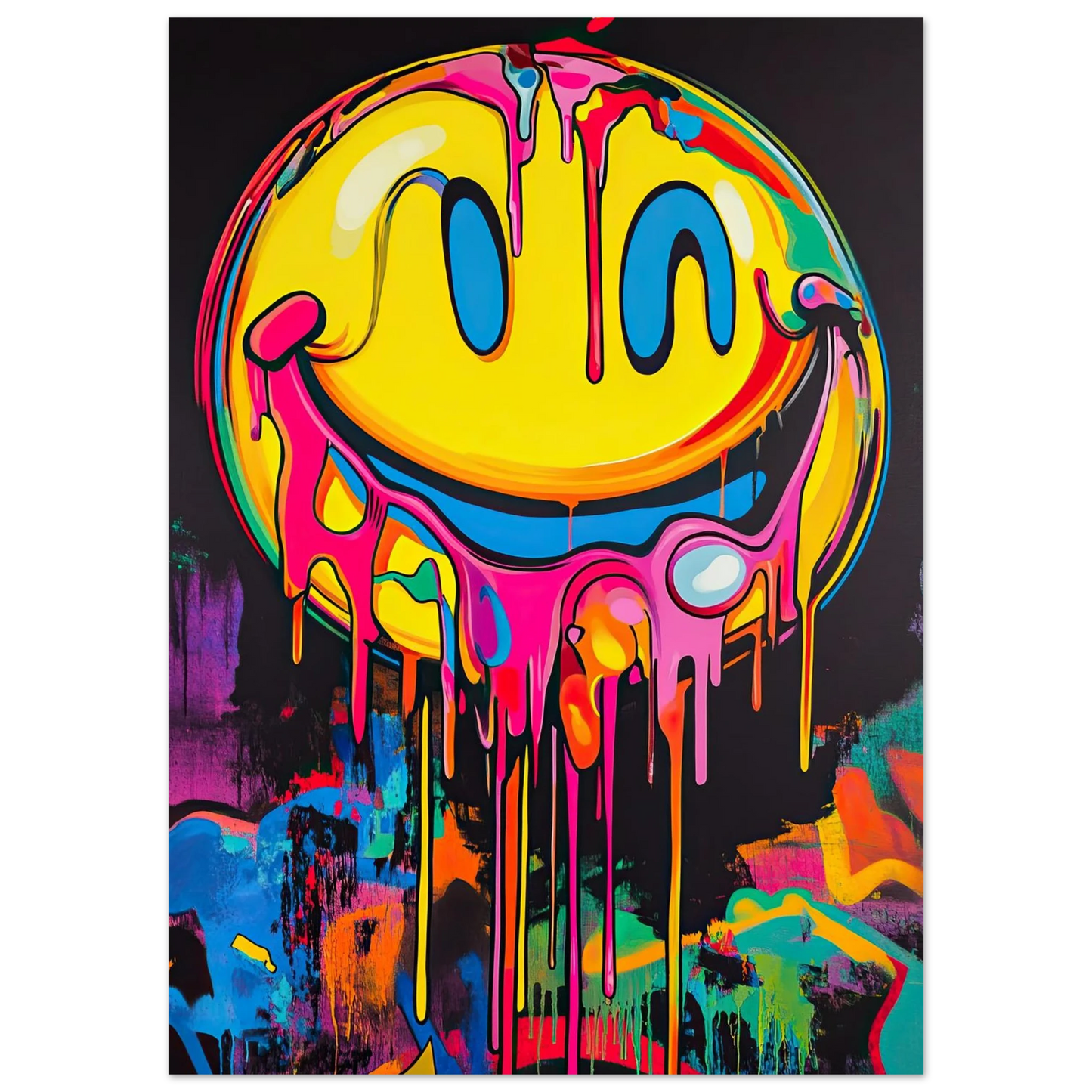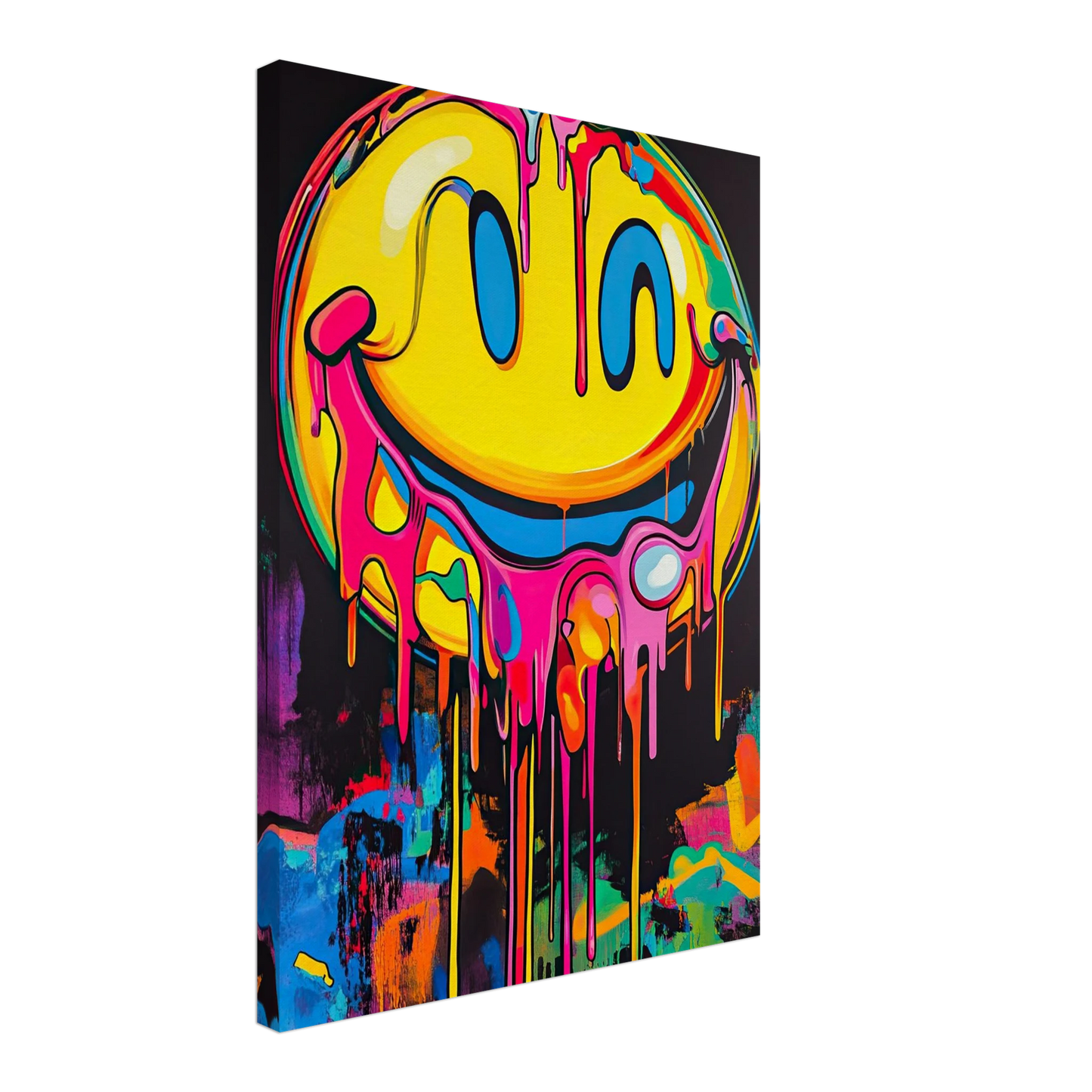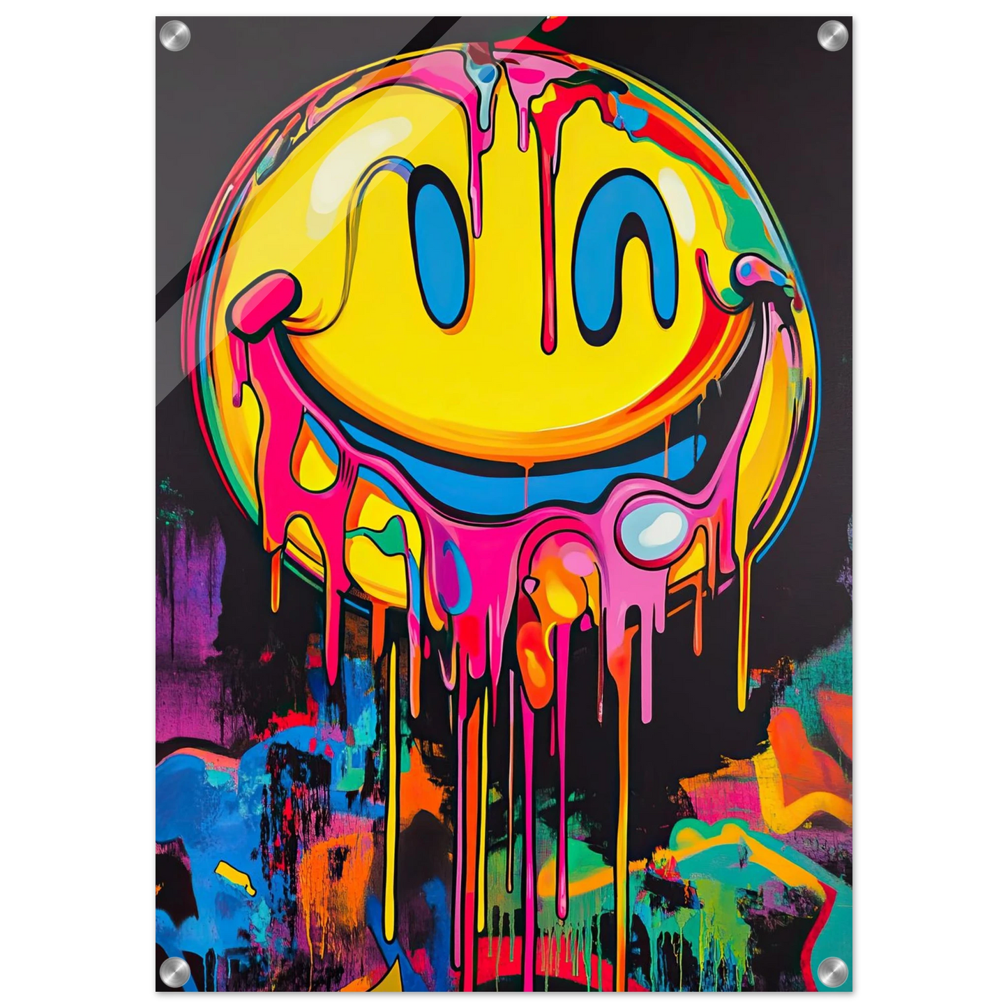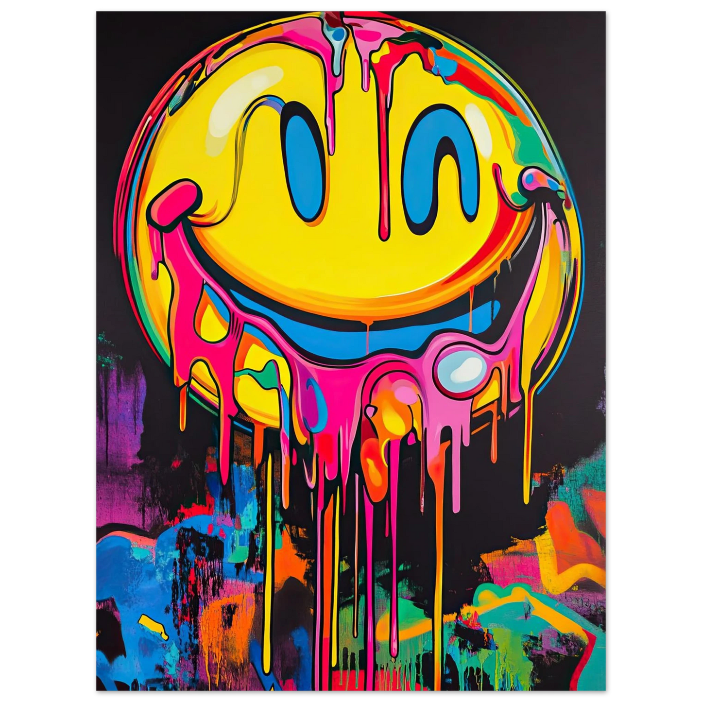 Et ikonisk smilefjes smelter nedover lerretet i en eksplosjon av neonrosa, gult og elektriske fargetoner. Den lekne kontrasten mellom det glade symbolet og den rå, dryppende effekten gir motivet både humor og edge. Perfekt for deg som vil tilføre rommet et urbant blikkfang med popkulturell attityde.