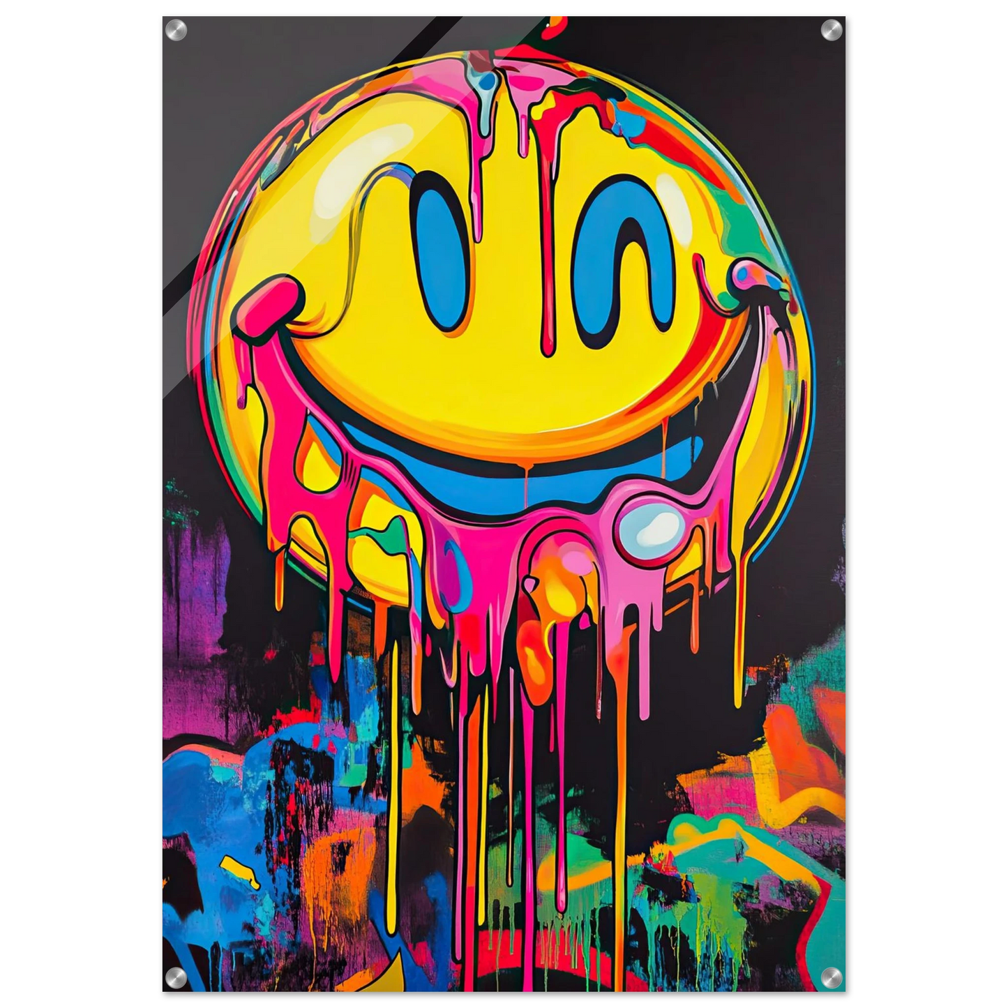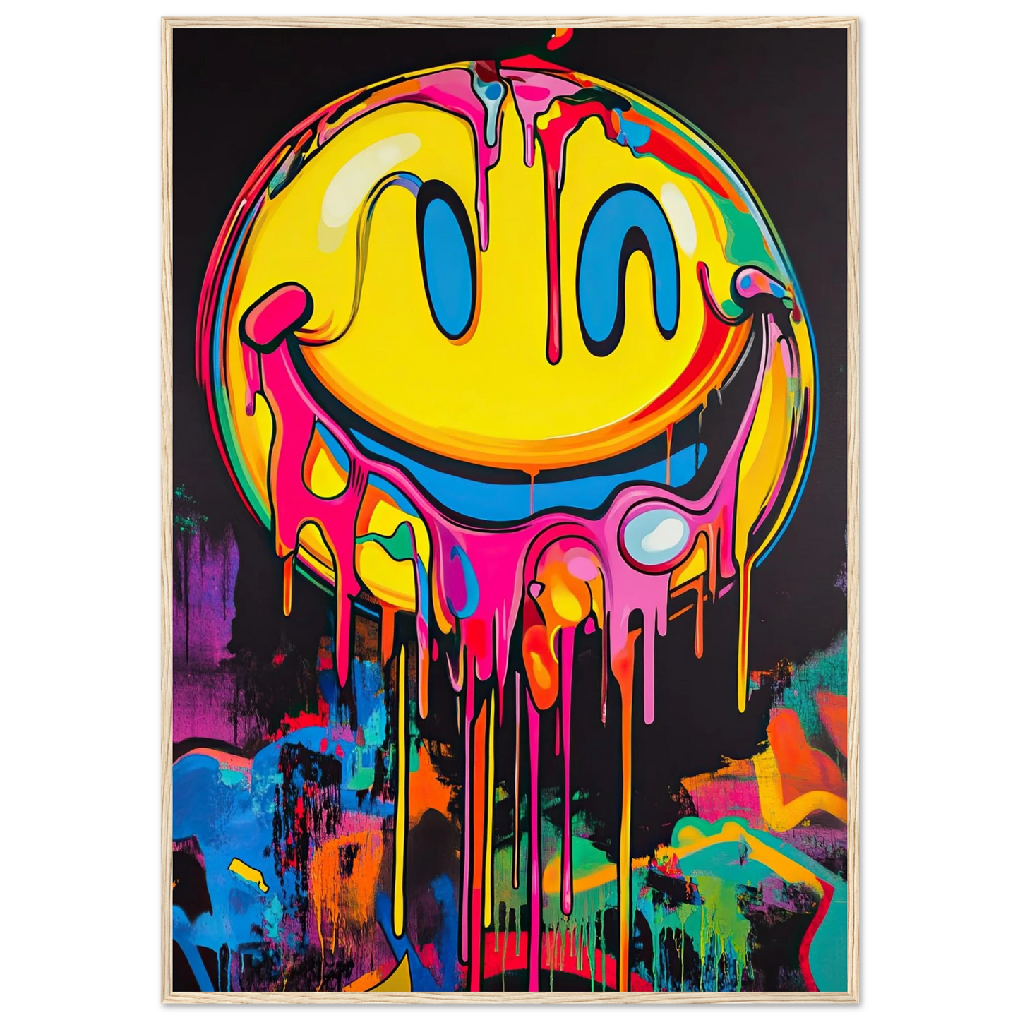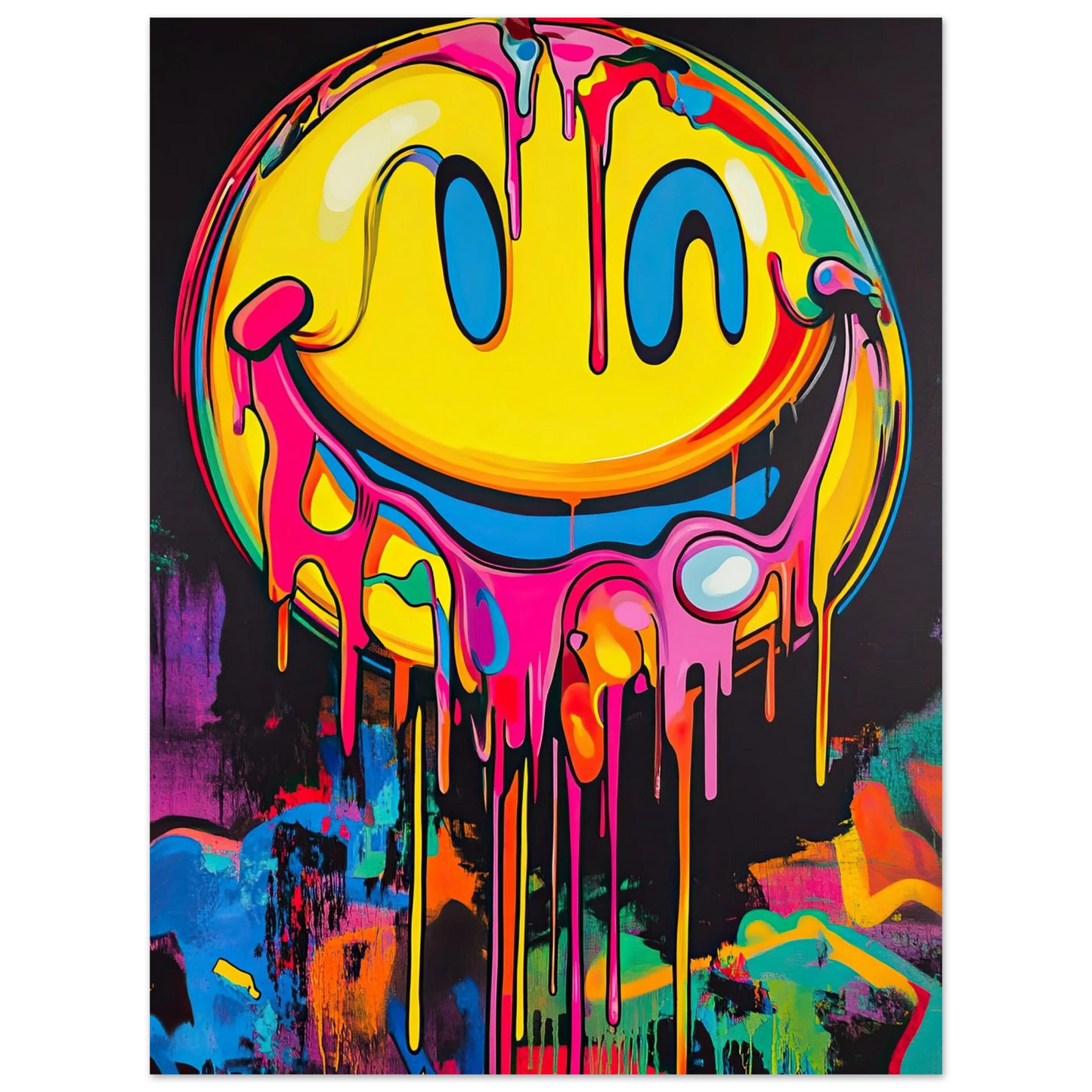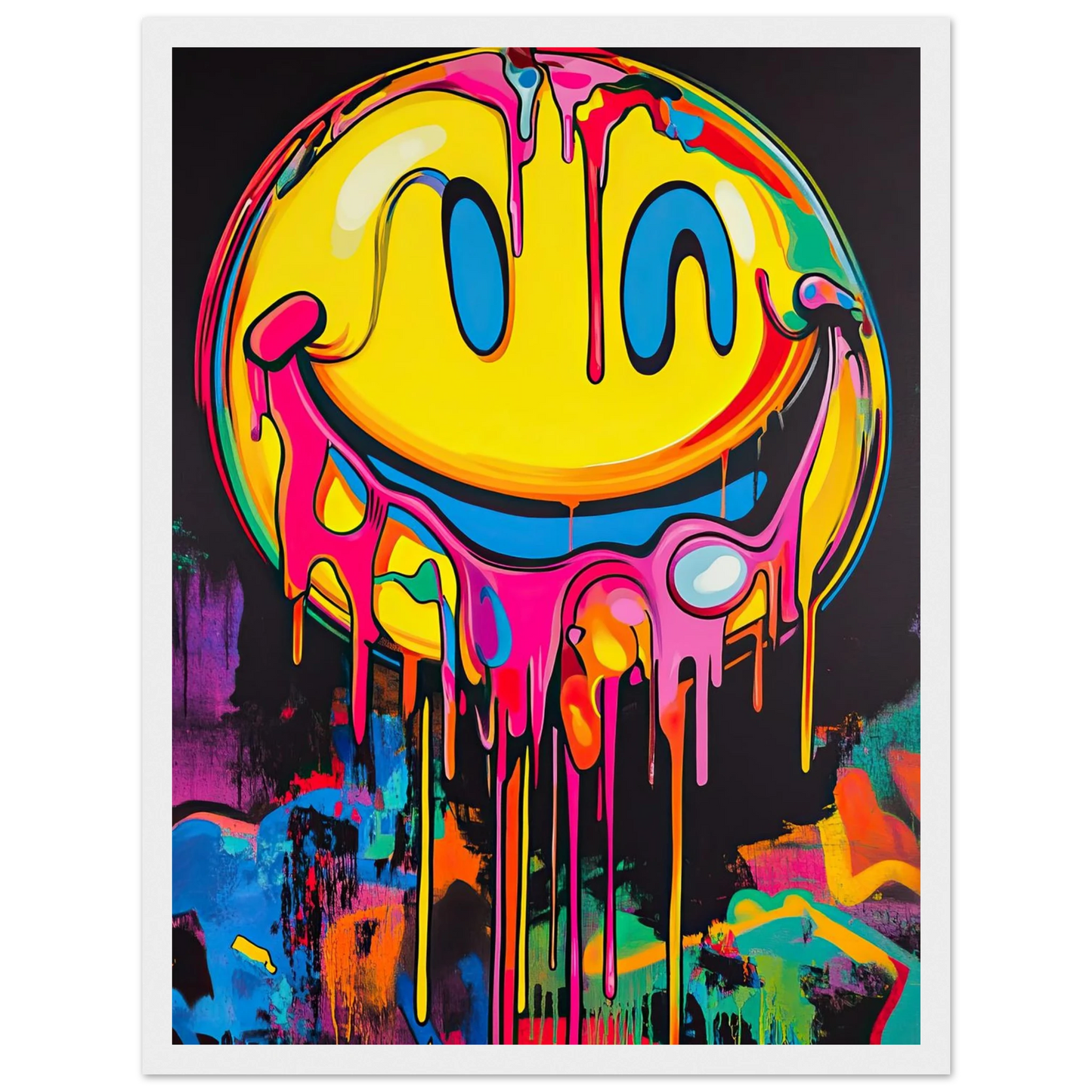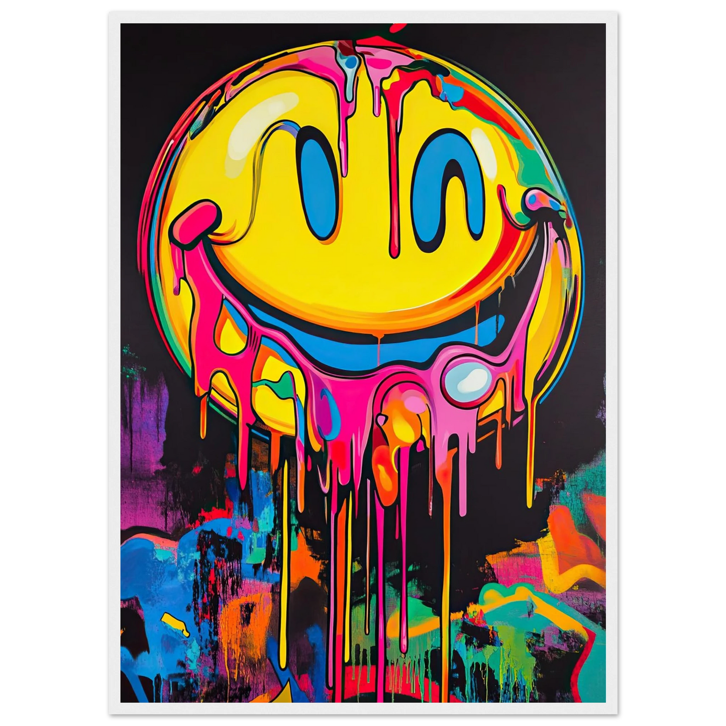 Et ikonisk smilefjes smelter nedover lerretet i en eksplosjon av neonrosa, gult og elektriske fargetoner. Den lekne kontrasten mellom det glade symbolet og den rå, dryppende effekten gir motivet både humor og edge. Perfekt for deg som vil tilføre rommet et urbant blikkfang med popkulturell attityde.