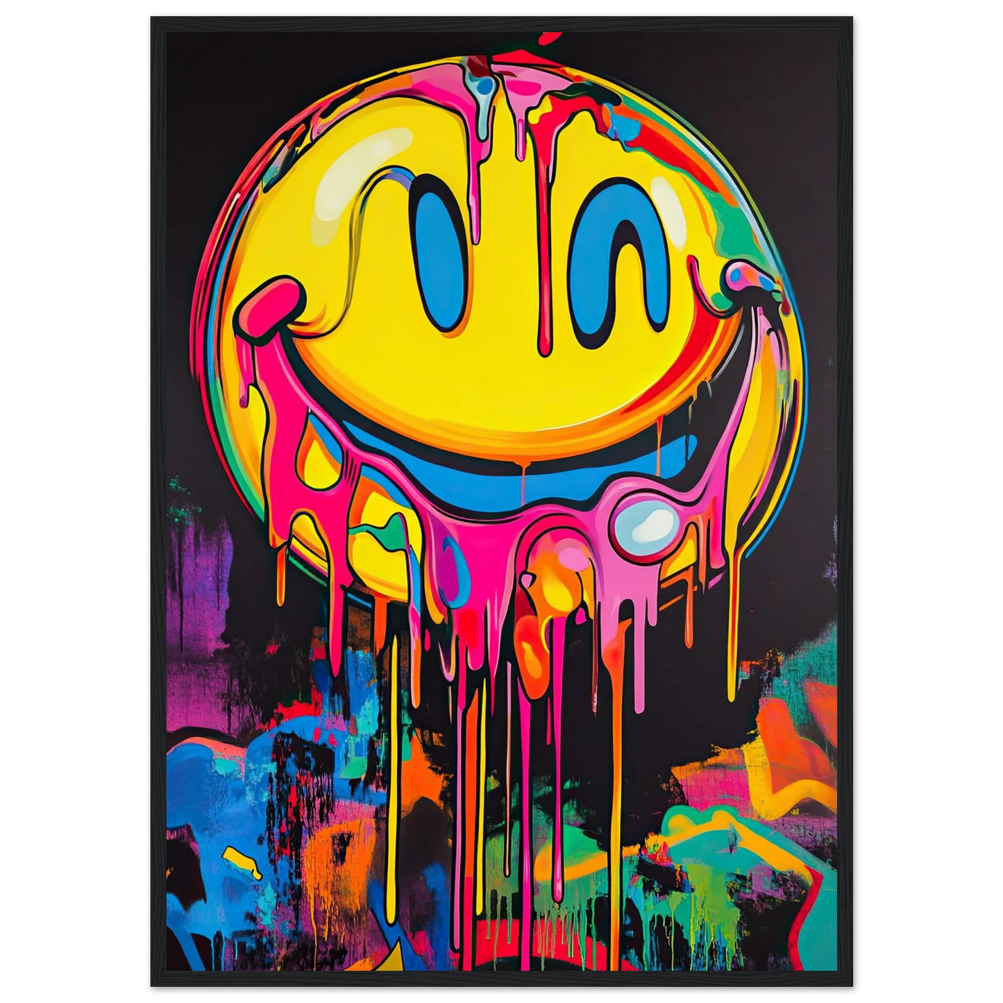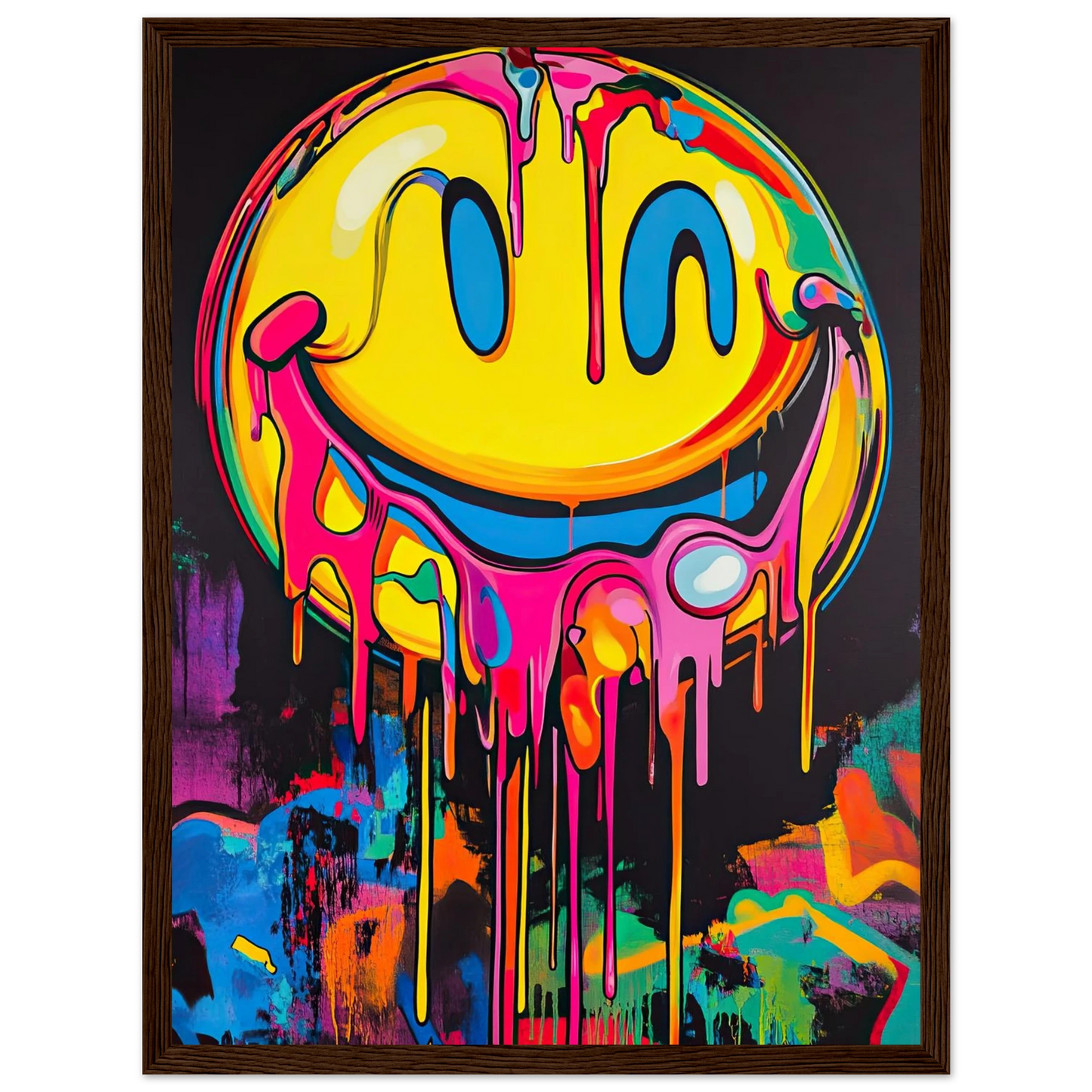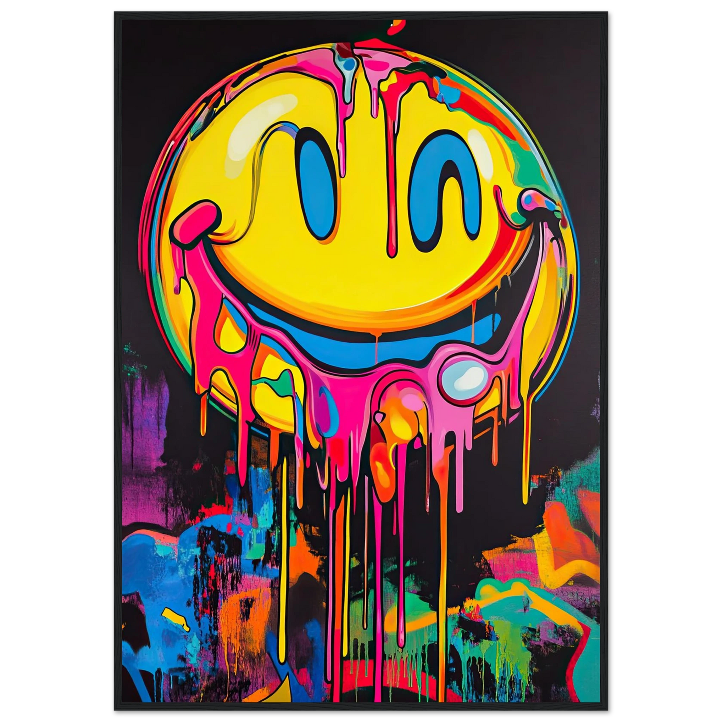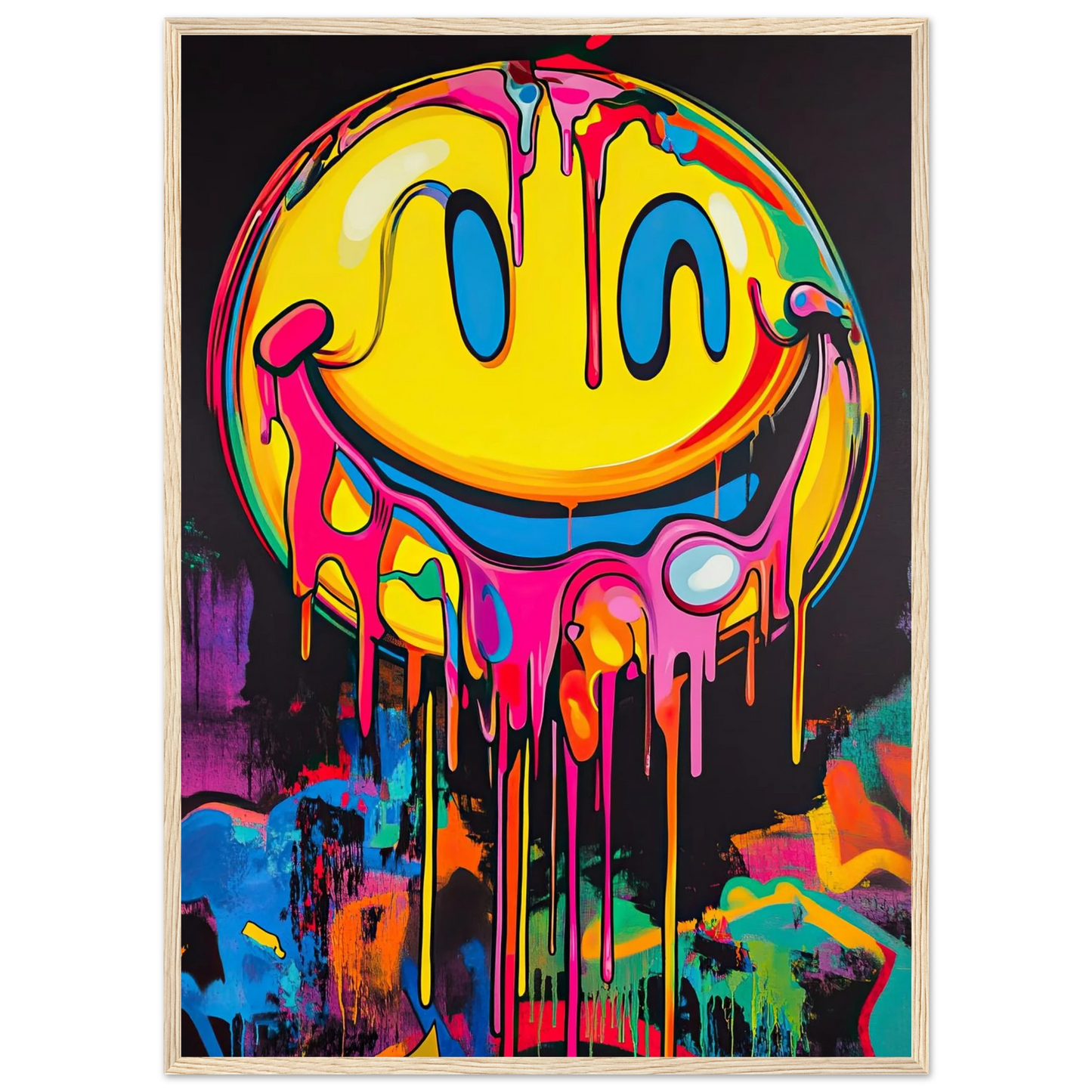Et ikonisk smilefjes smelter nedover lerretet i en eksplosjon av neonrosa, gult og elektriske fargetoner. Den lekne kontrasten mellom det glade symbolet og den rå, dryppende effekten gir motivet både humor og edge. Perfekt for deg som vil tilføre rommet et urbant blikkfang med popkulturell attityde.