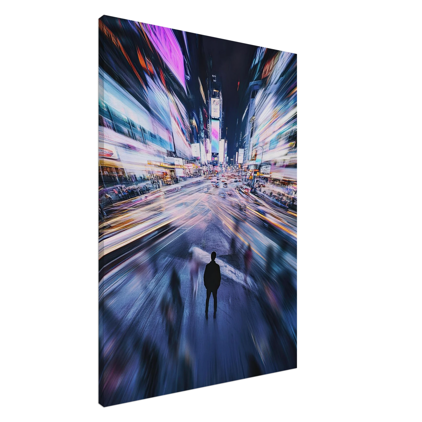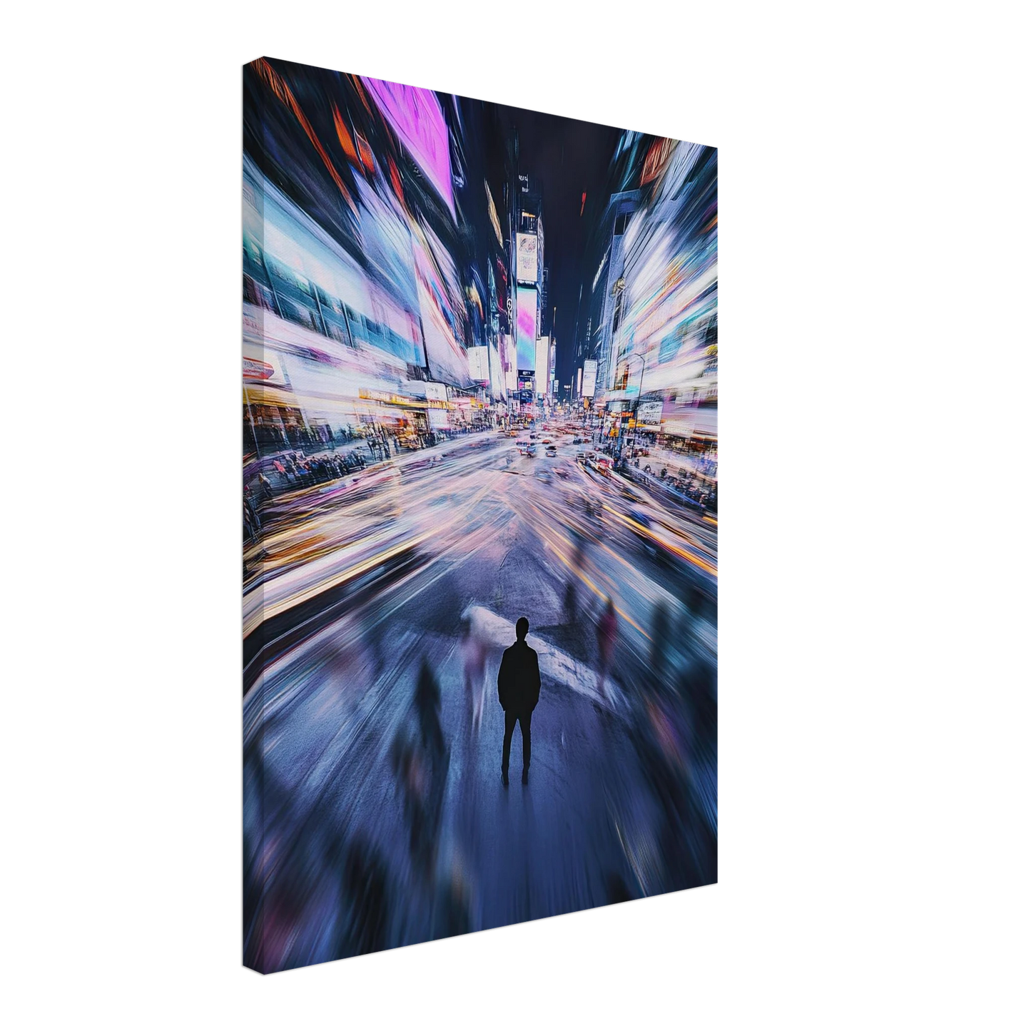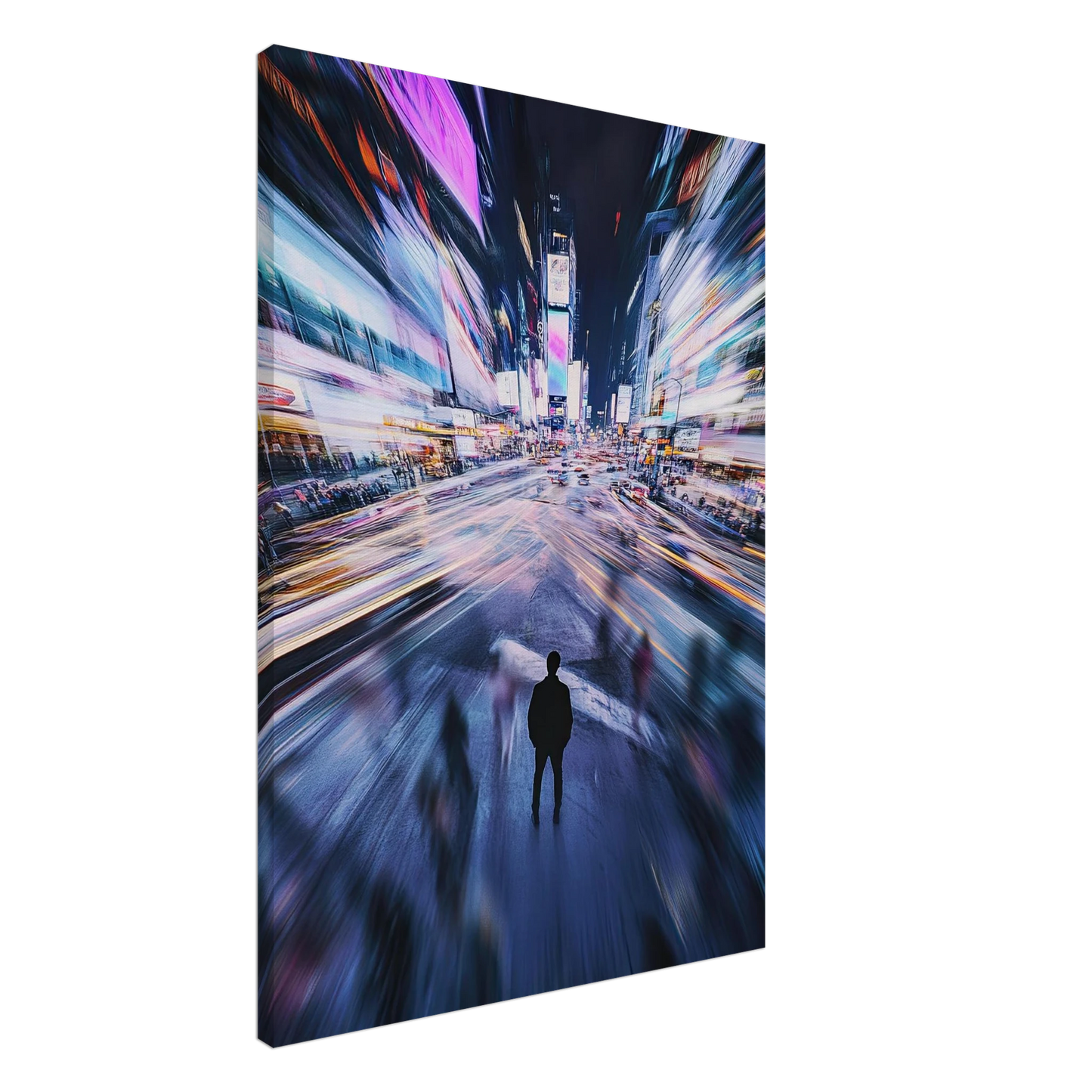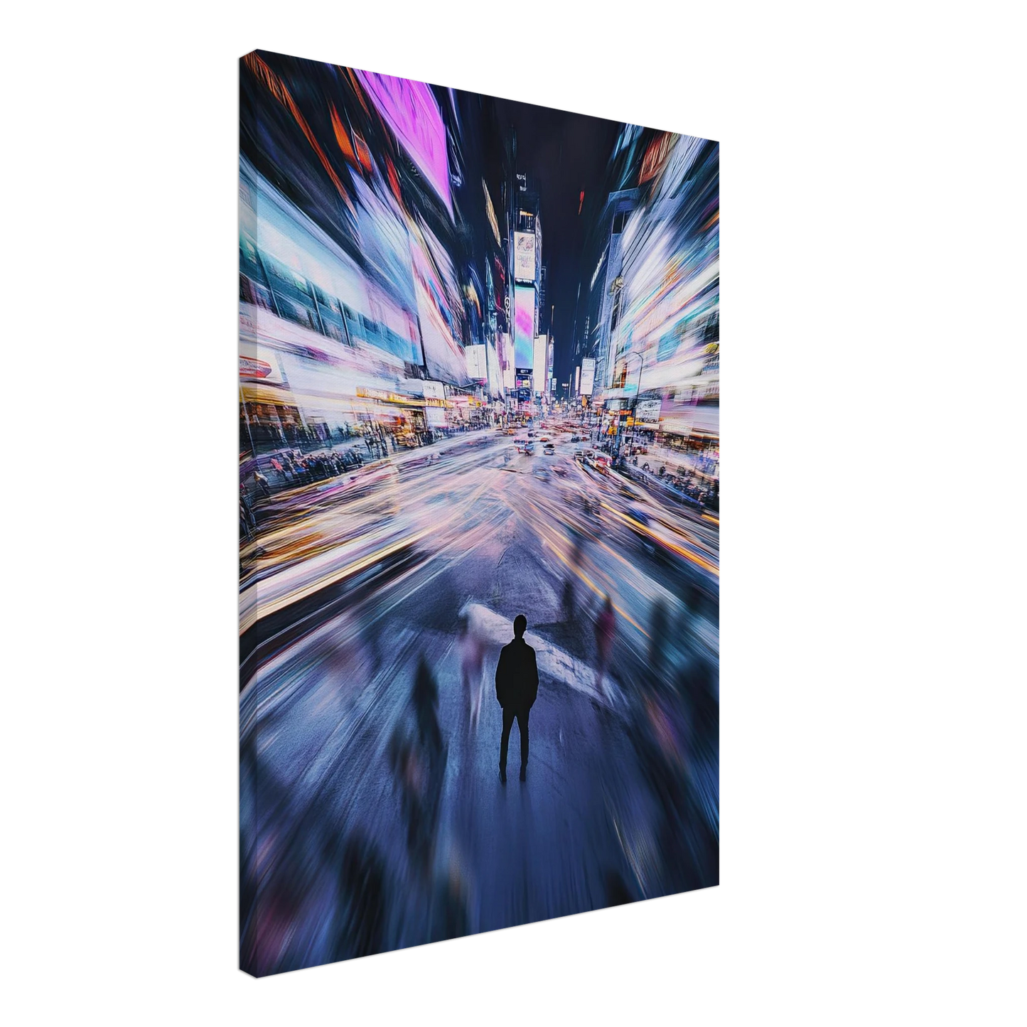 Et kraftfullt kunstverk som fanger følelsen av å stå stille mens verden raser forbi. Silhuetten av personen i sentrum gir ro og tilstedeværelse i møte med byens hektiske lys og tempo. Perfekt for deg som vil tilføre hjemmet en eksplosiv, men samtidig reflekterende energi.