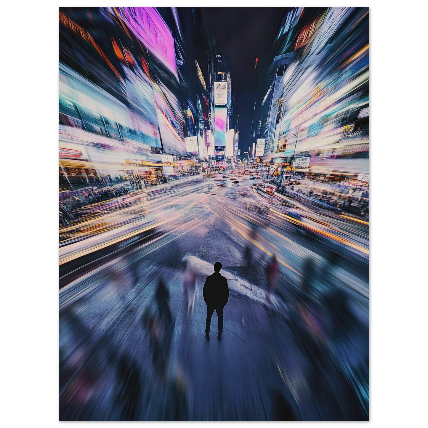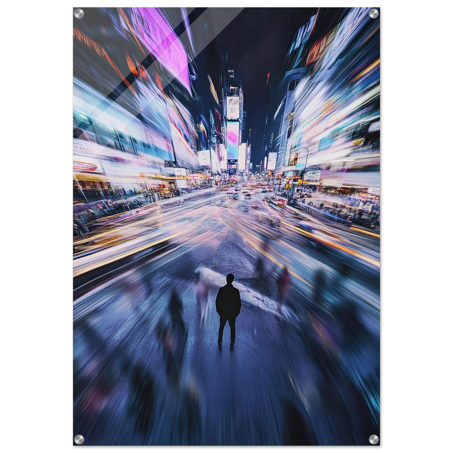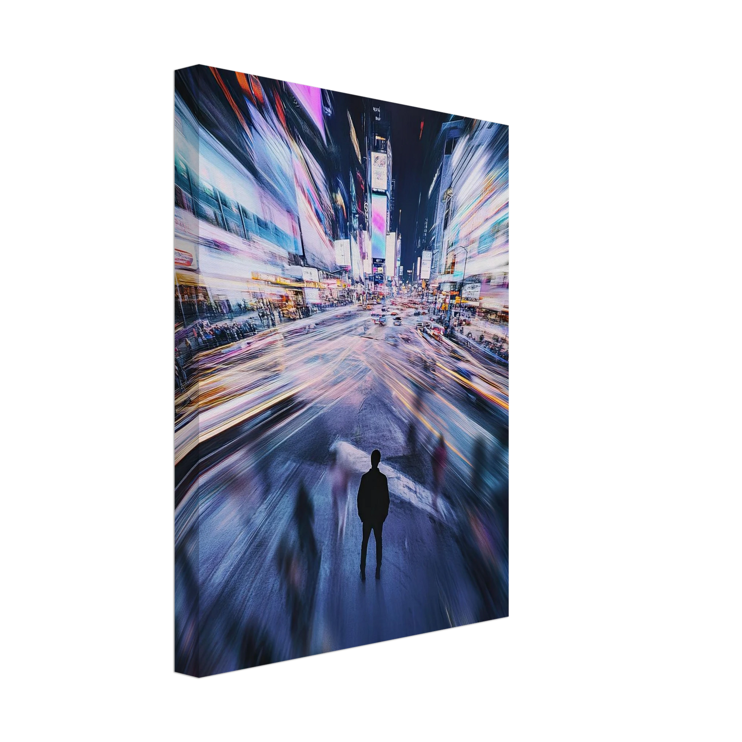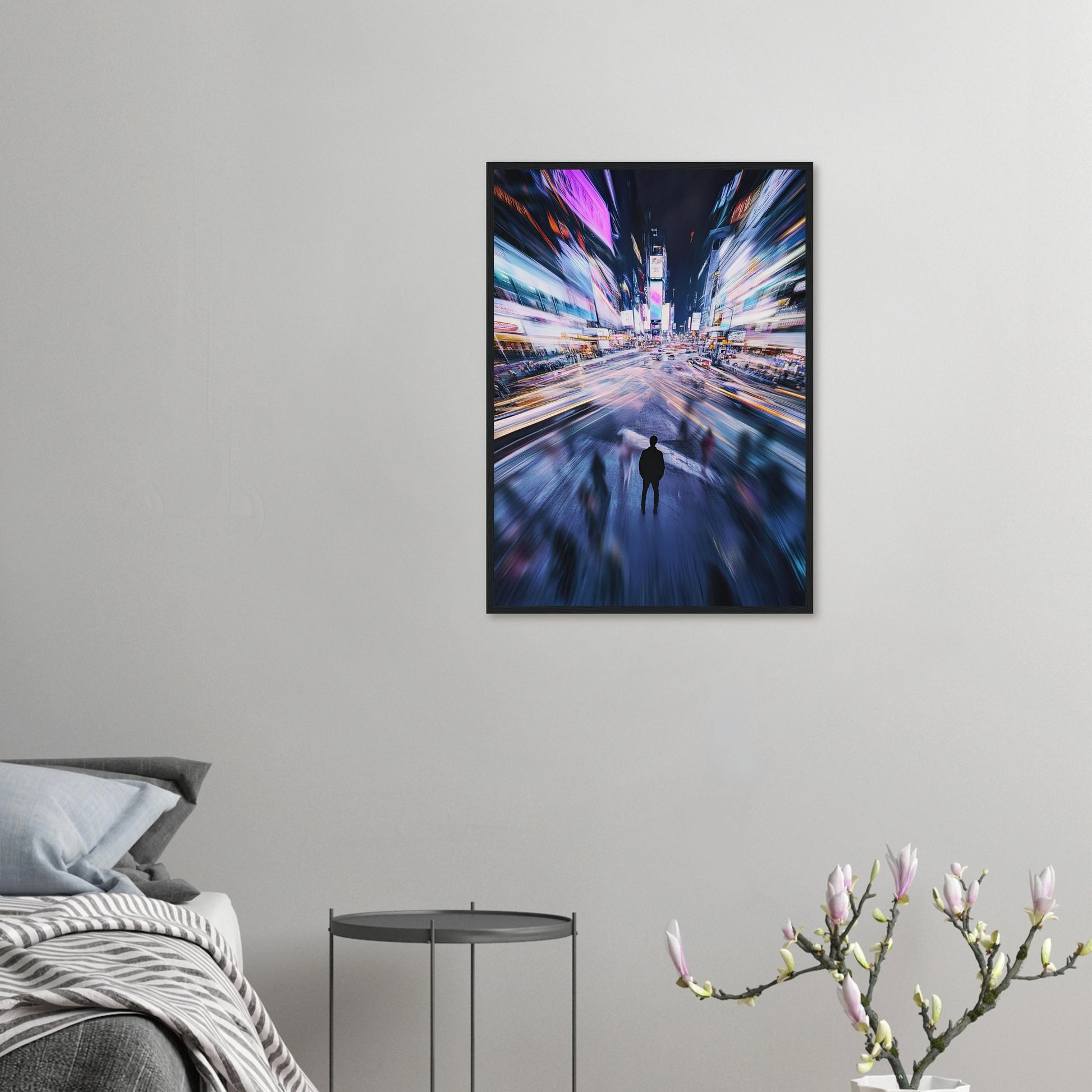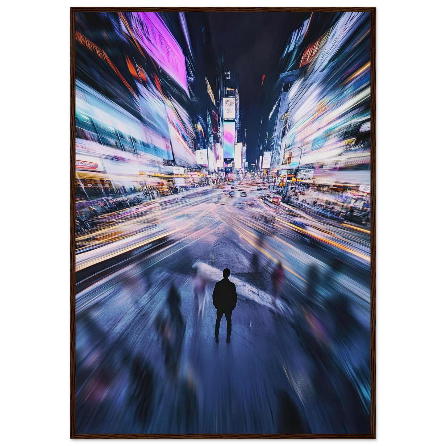 Et kraftfullt kunstverk som fanger følelsen av å stå stille mens verden raser forbi. Silhuetten av personen i sentrum gir ro og tilstedeværelse i møte med byens hektiske lys og tempo. Perfekt for deg som vil tilføre hjemmet en eksplosiv, men samtidig reflekterende energi.
