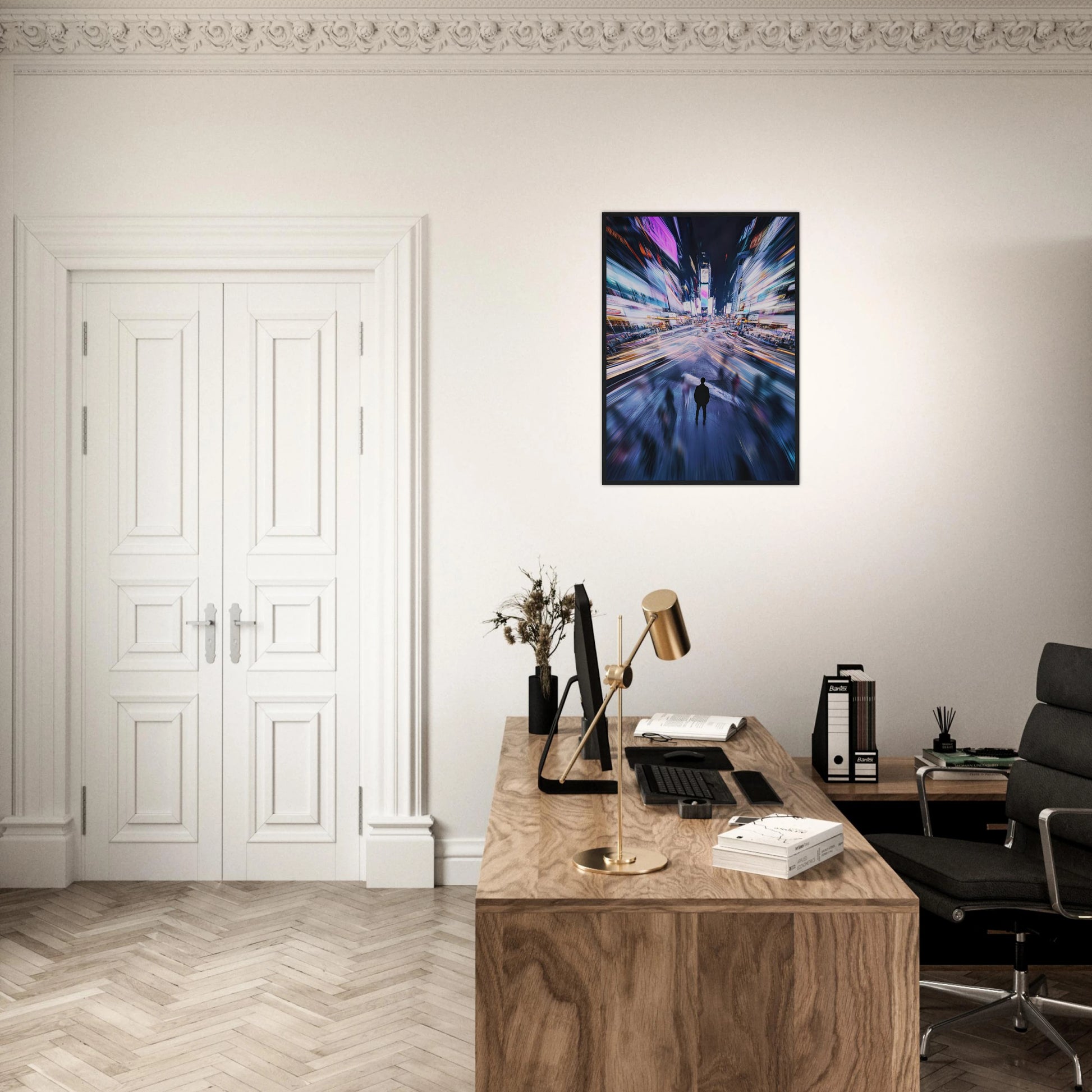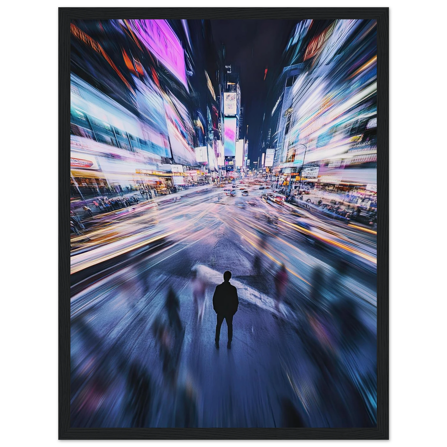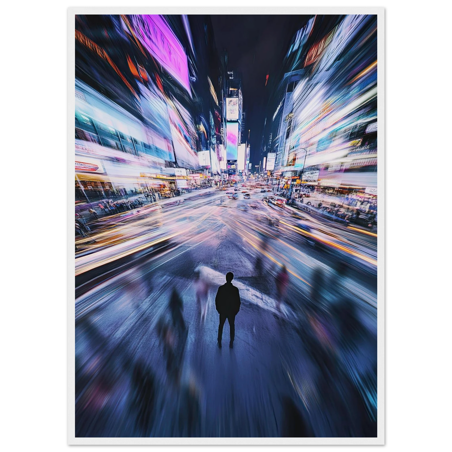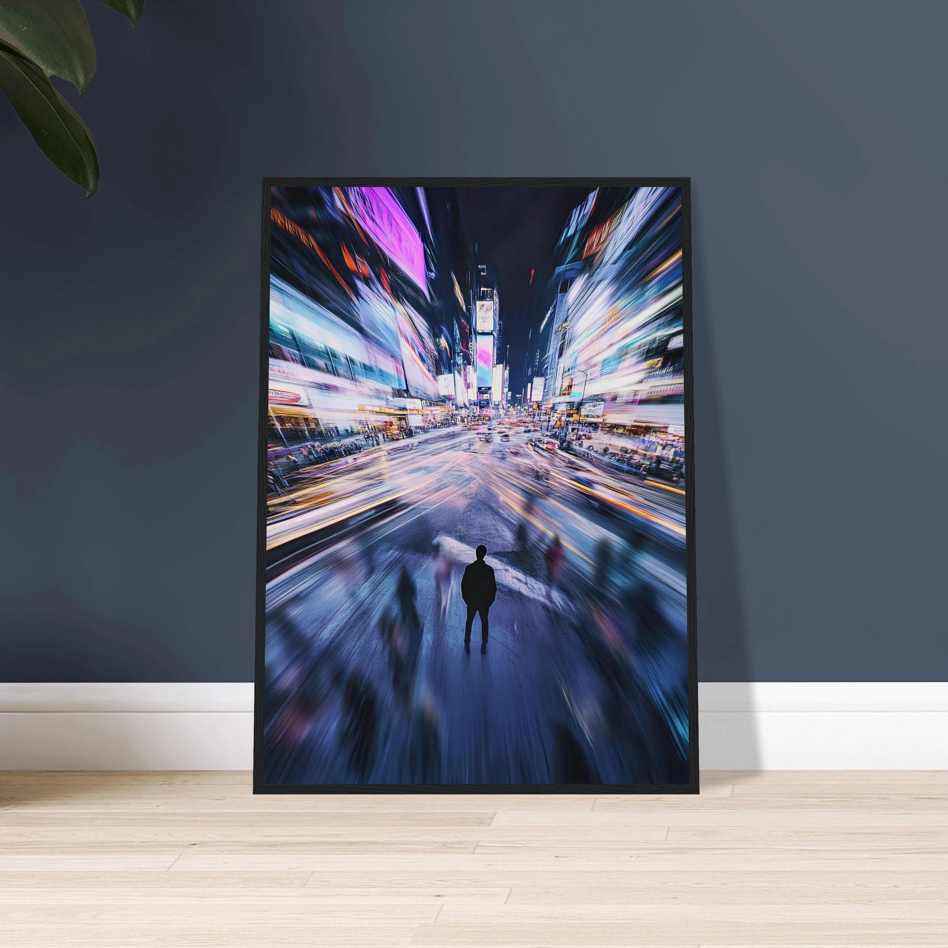 Et kraftfullt kunstverk som fanger følelsen av å stå stille mens verden raser forbi. Silhuetten av personen i sentrum gir ro og tilstedeværelse i møte med byens hektiske lys og tempo. Perfekt for deg som vil tilføre hjemmet en eksplosiv, men samtidig reflekterende energi.