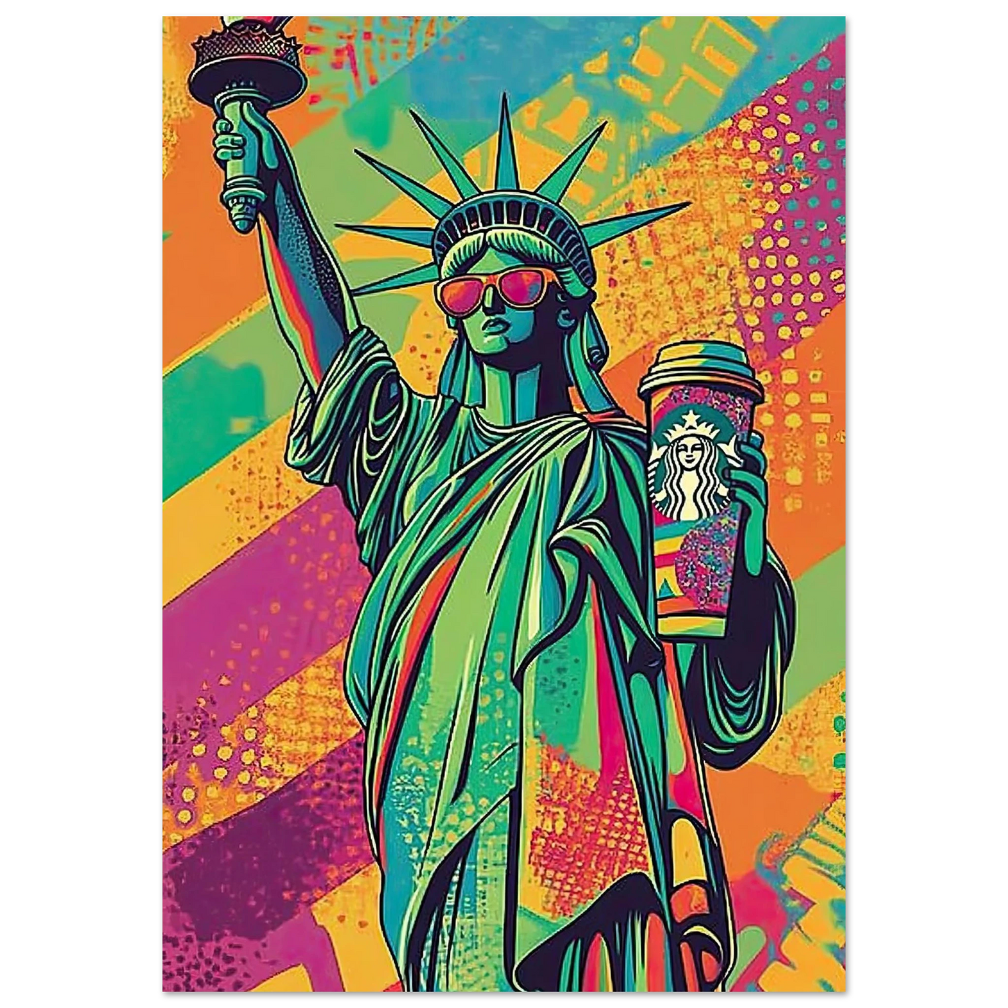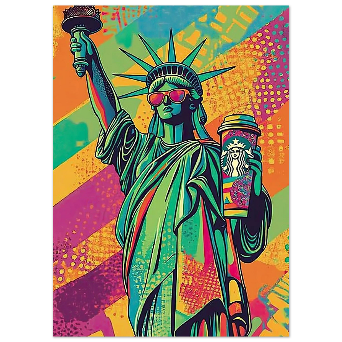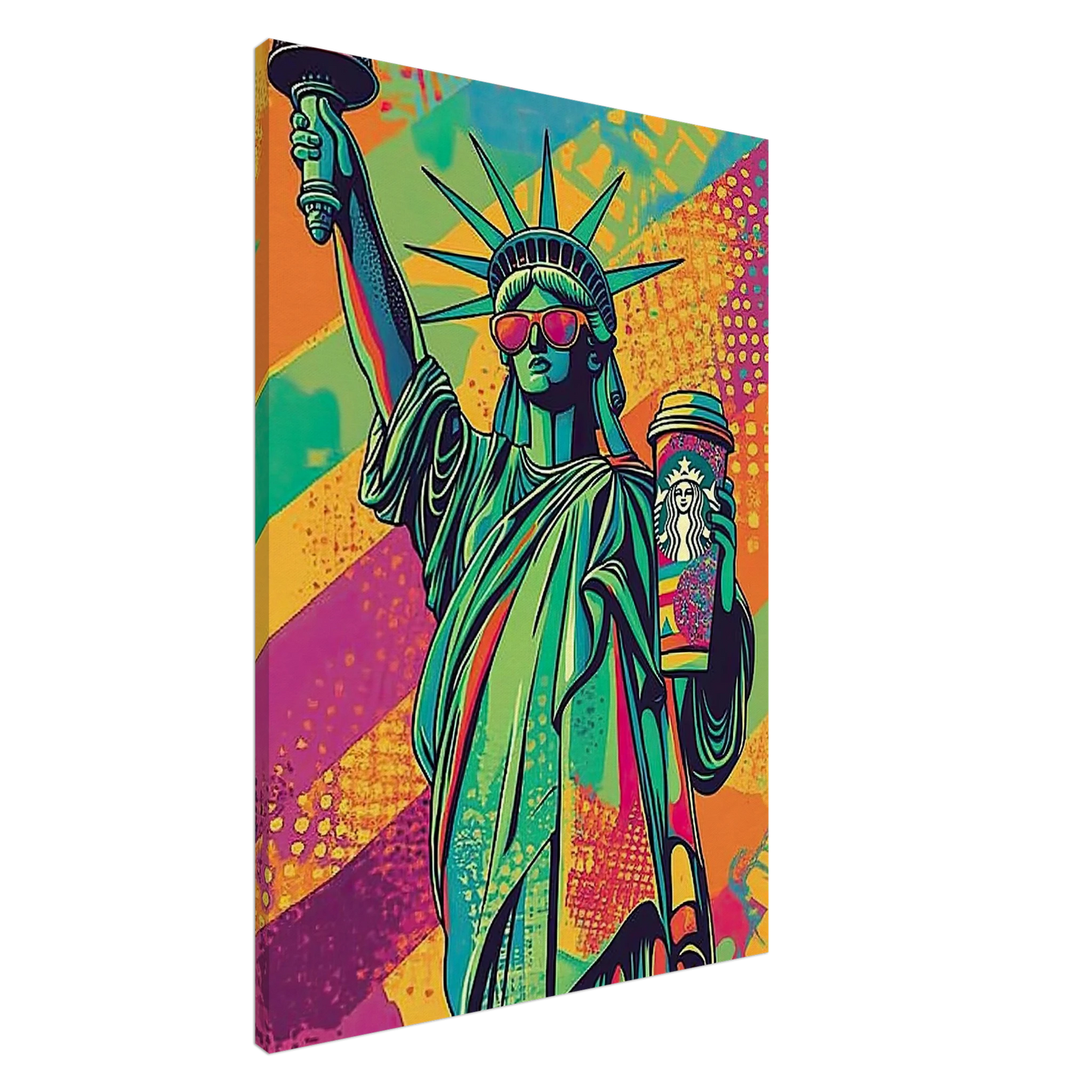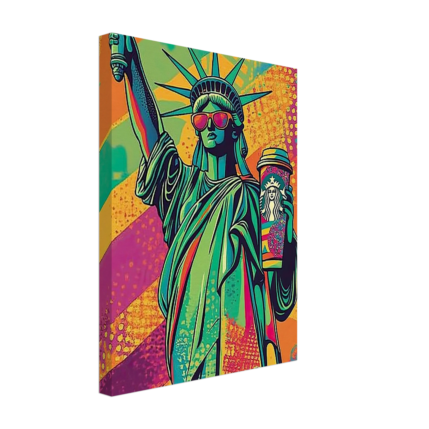 Frihetsgudinnen får en moderne makeover i denne fargerike pop art-tolkningen. Med solbriller og en gigantisk kaffekopp i hånden blir symbolet på frihet til et urbant ikon som stråler av humor, energi og attitude. Perfekt for deg som vil tilføre interiøret en blanding av ikonisk symbolikk og leken street style.