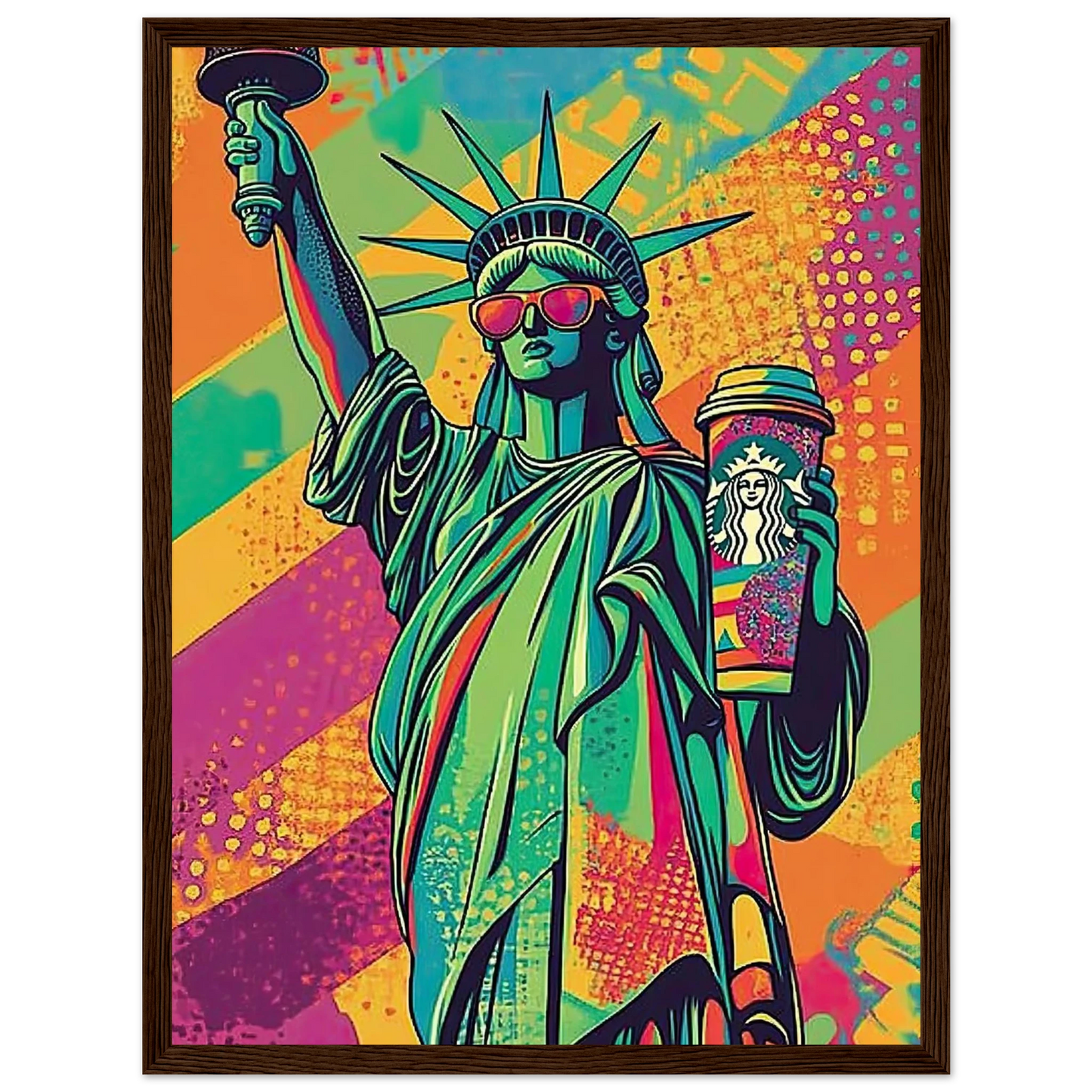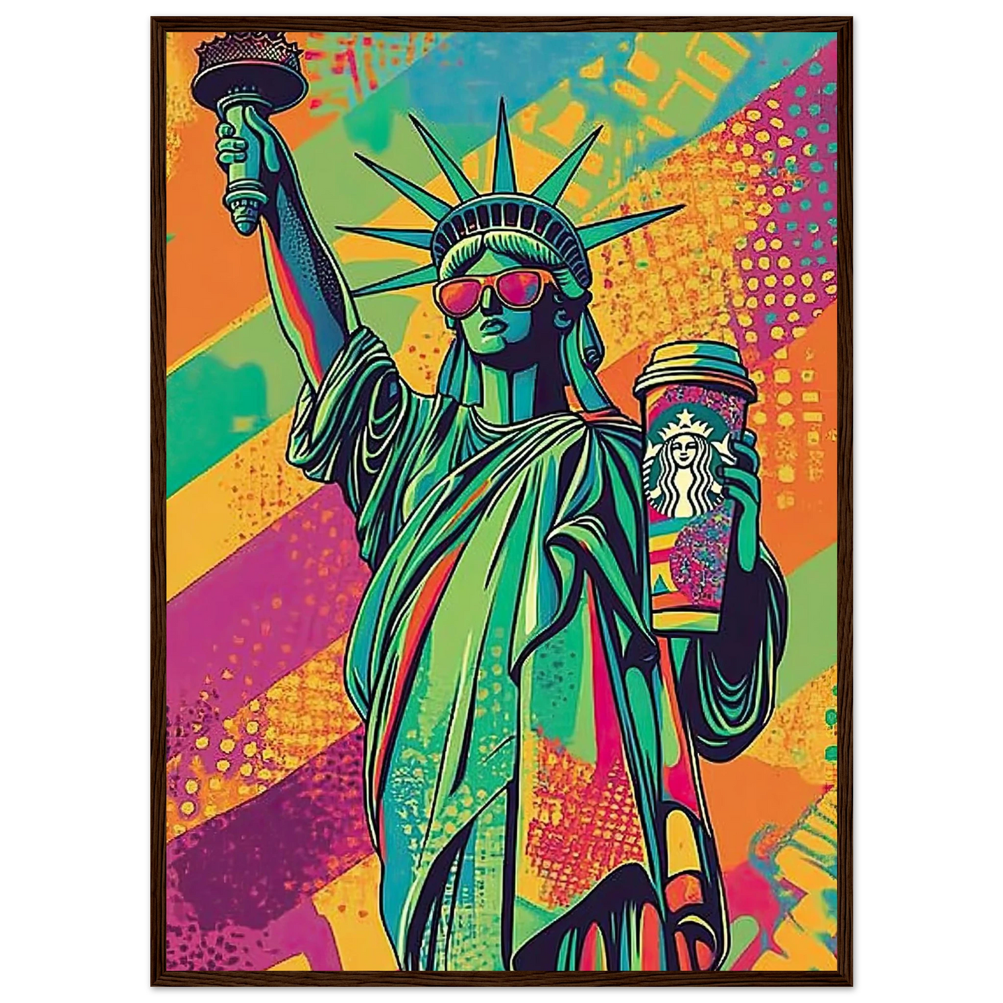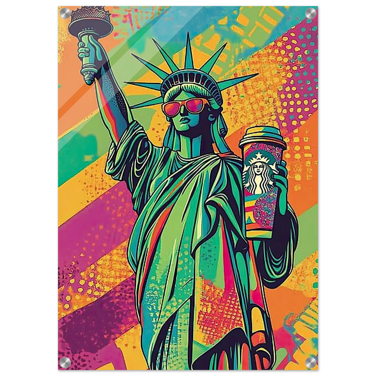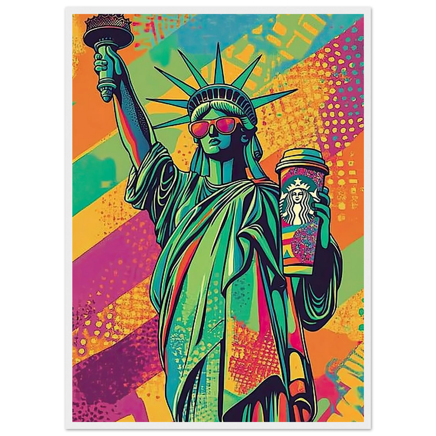 Frihetsgudinnen får en moderne makeover i denne fargerike pop art-tolkningen. Med solbriller og en gigantisk kaffekopp i hånden blir symbolet på frihet til et urbant ikon som stråler av humor, energi og attitude. Perfekt for deg som vil tilføre interiøret en blanding av ikonisk symbolikk og leken street style.