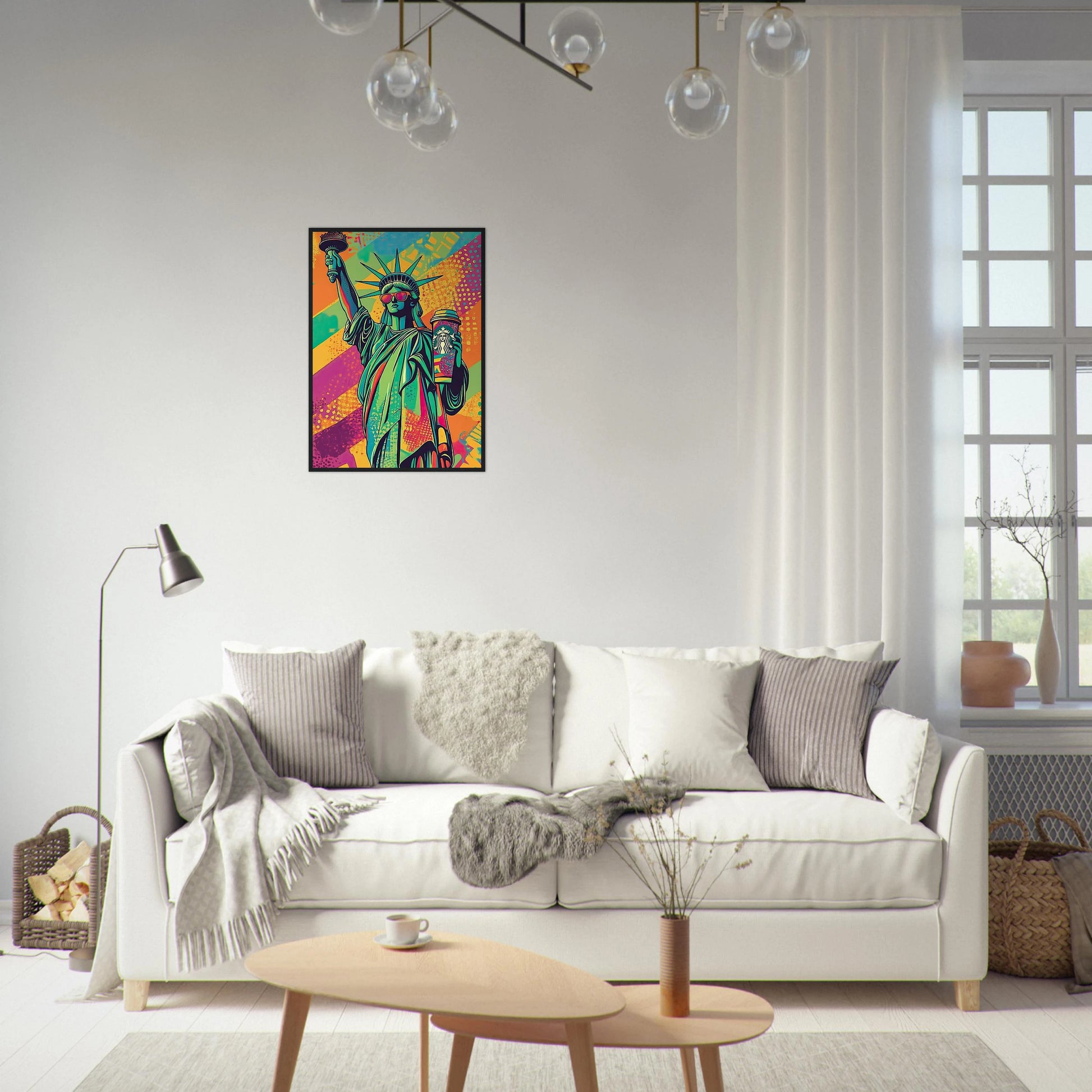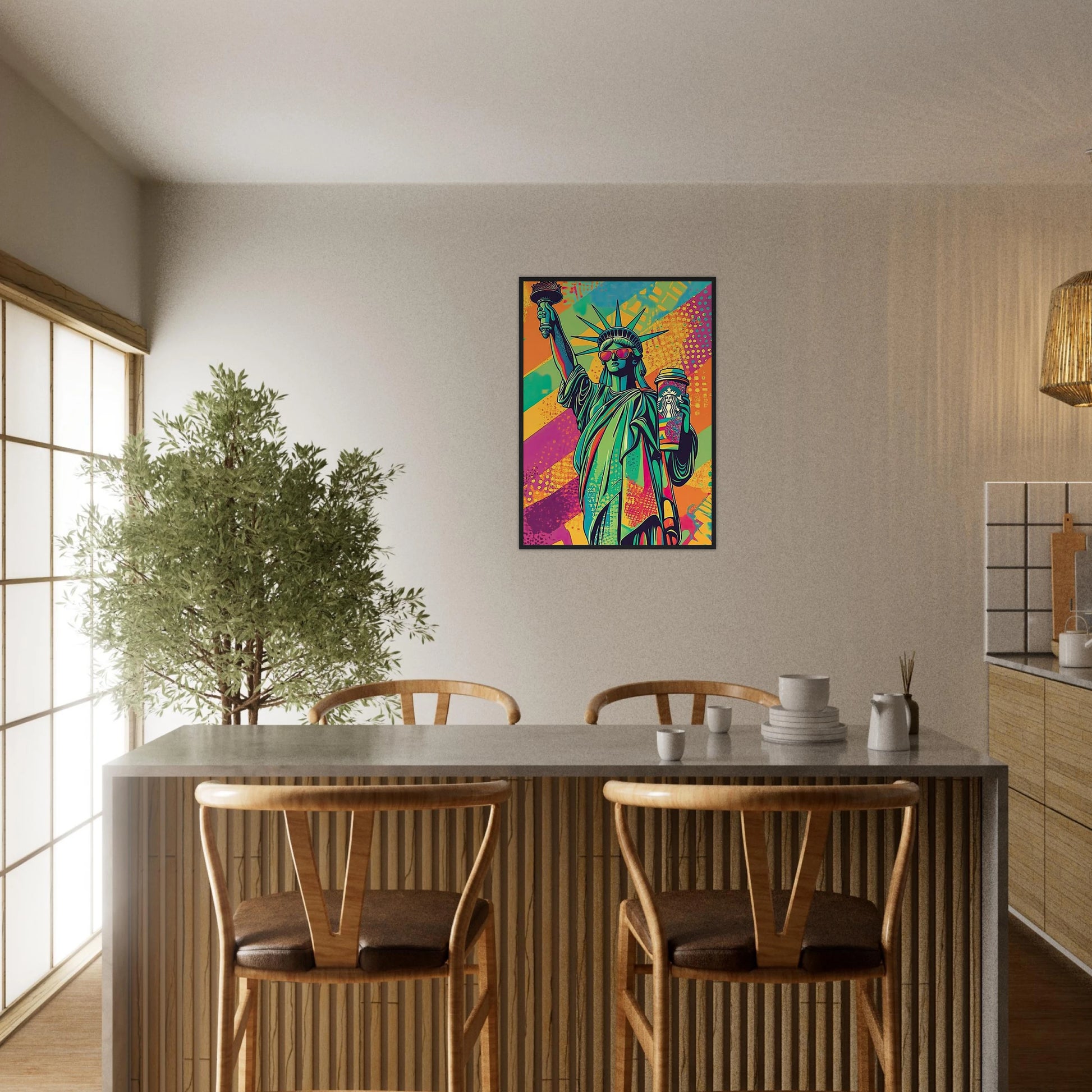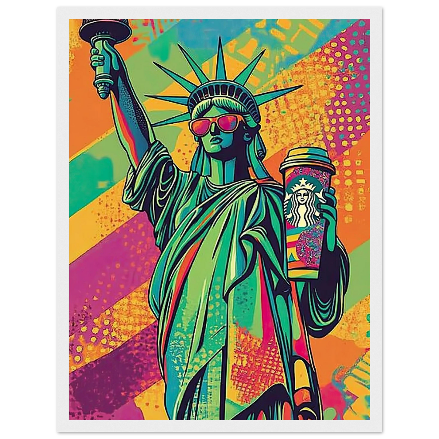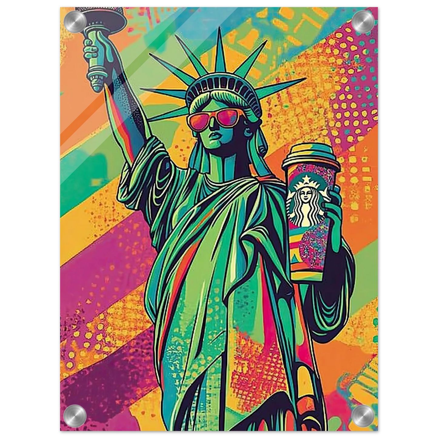 Frihetsgudinnen får en moderne makeover i denne fargerike pop art-tolkningen. Med solbriller og en gigantisk kaffekopp i hånden blir symbolet på frihet til et urbant ikon som stråler av humor, energi og attitude. Perfekt for deg som vil tilføre interiøret en blanding av ikonisk symbolikk og leken street style.