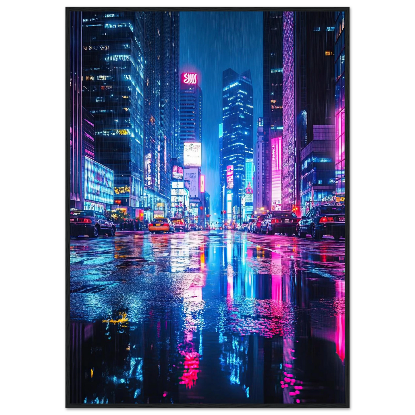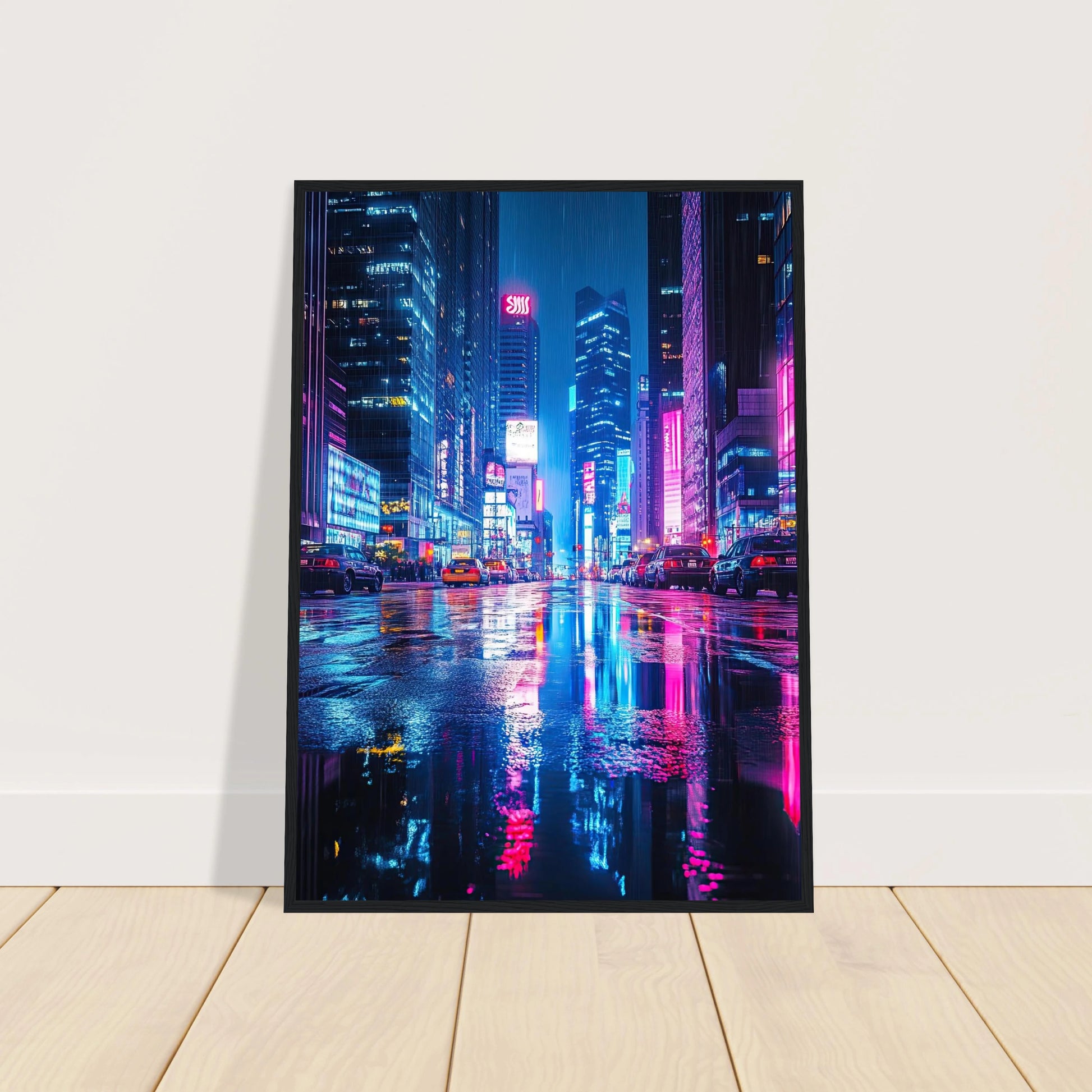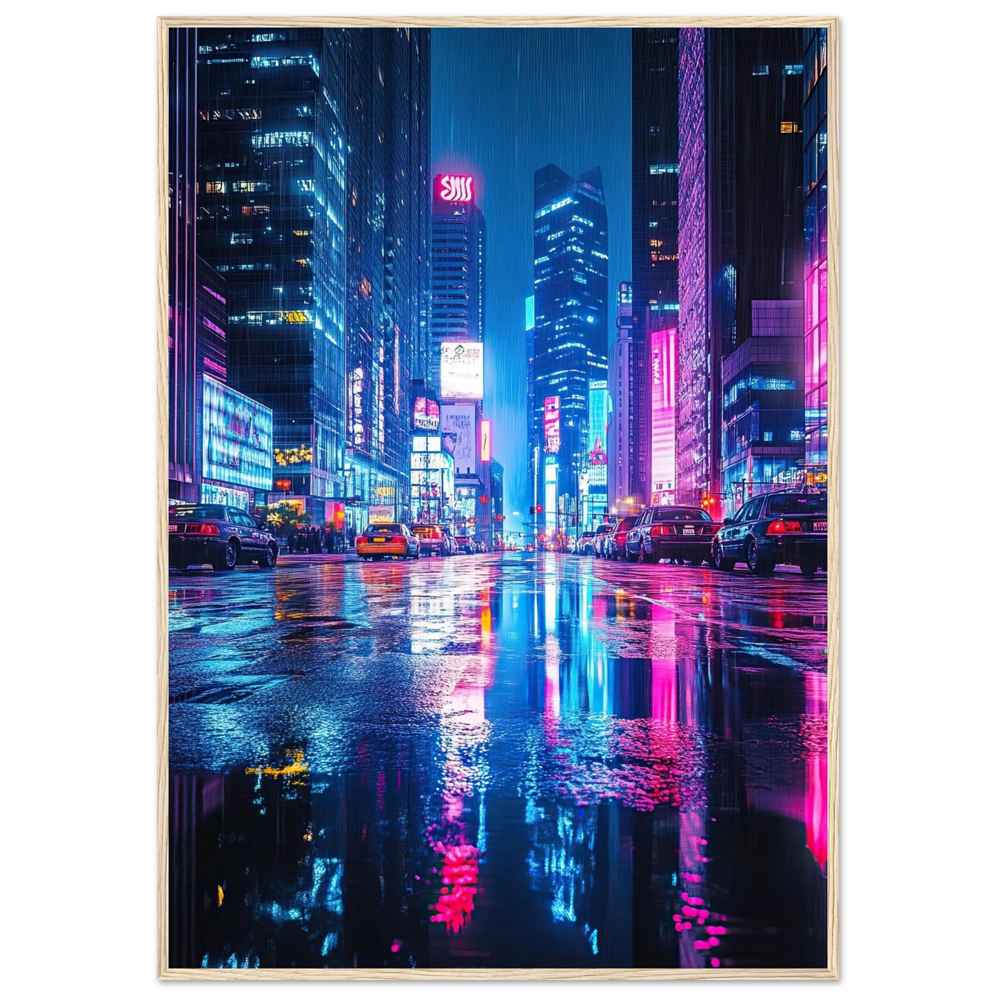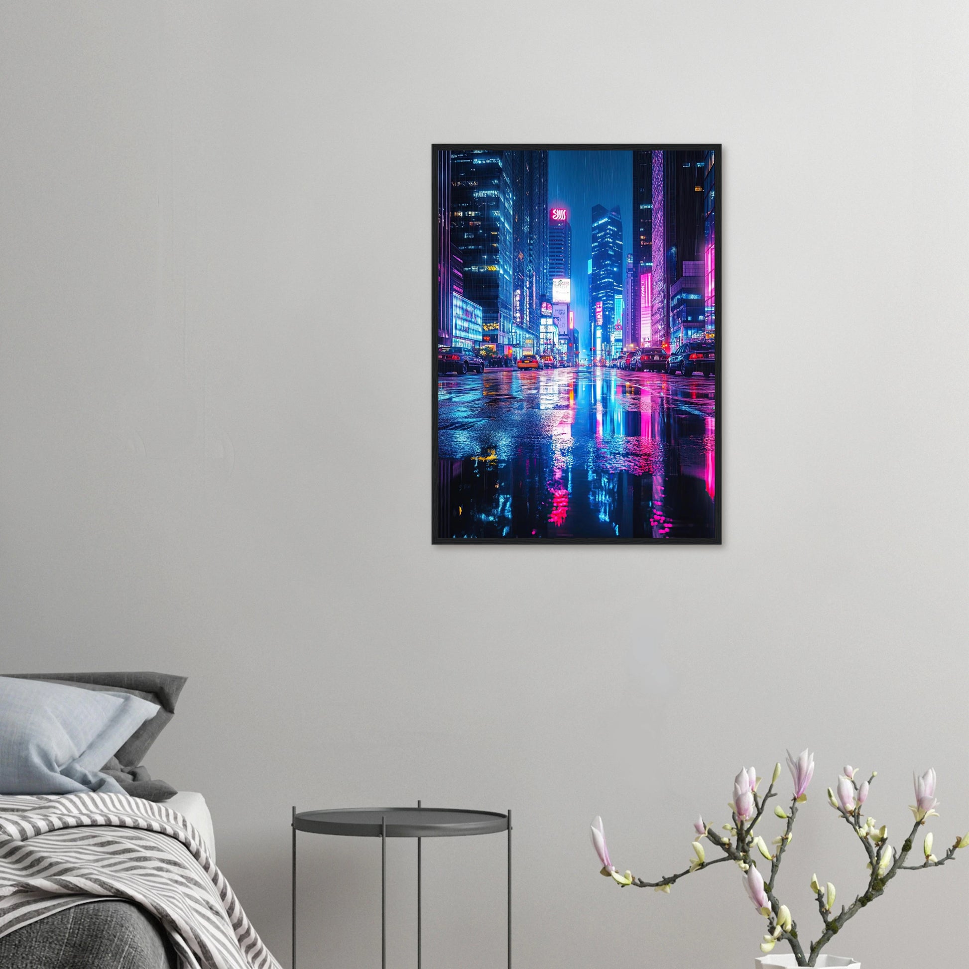 Et elektrisk bymotiv der neonlysene speiler seg i regnvåte gater, og skaper et energisk og moderne uttrykk. De intense blå- og rosatonene gir bildet en futuristisk atmosfære – perfekt for deg som vil ha en urban og dristig statement piece på veggen.