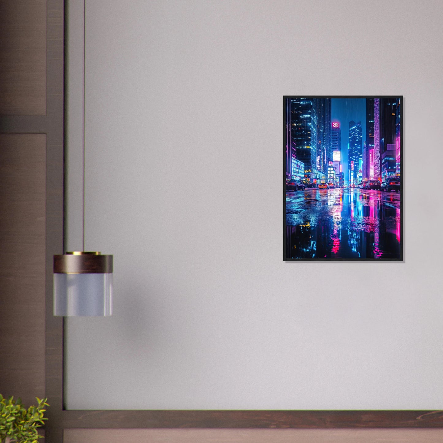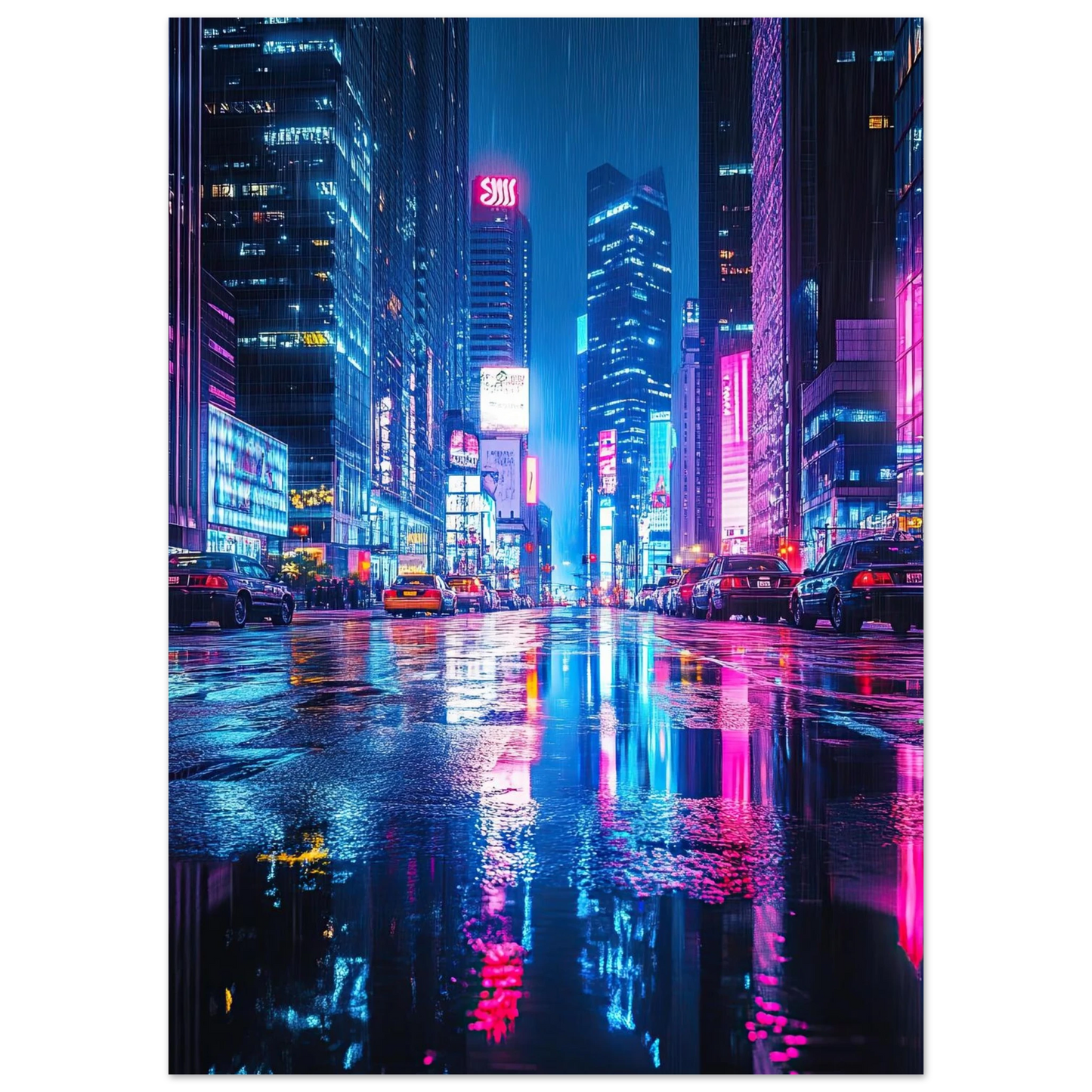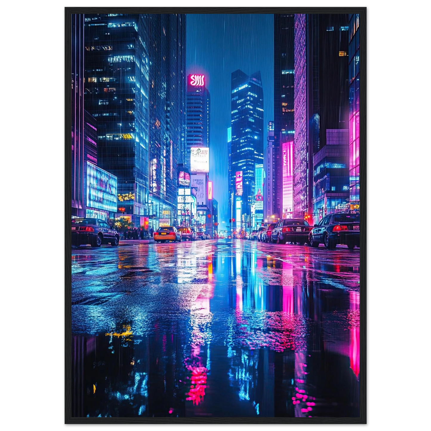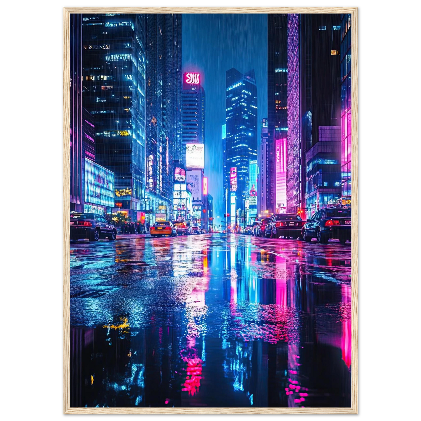 Et elektrisk bymotiv der neonlysene speiler seg i regnvåte gater, og skaper et energisk og moderne uttrykk. De intense blå- og rosatonene gir bildet en futuristisk atmosfære – perfekt for deg som vil ha en urban og dristig statement piece på veggen.