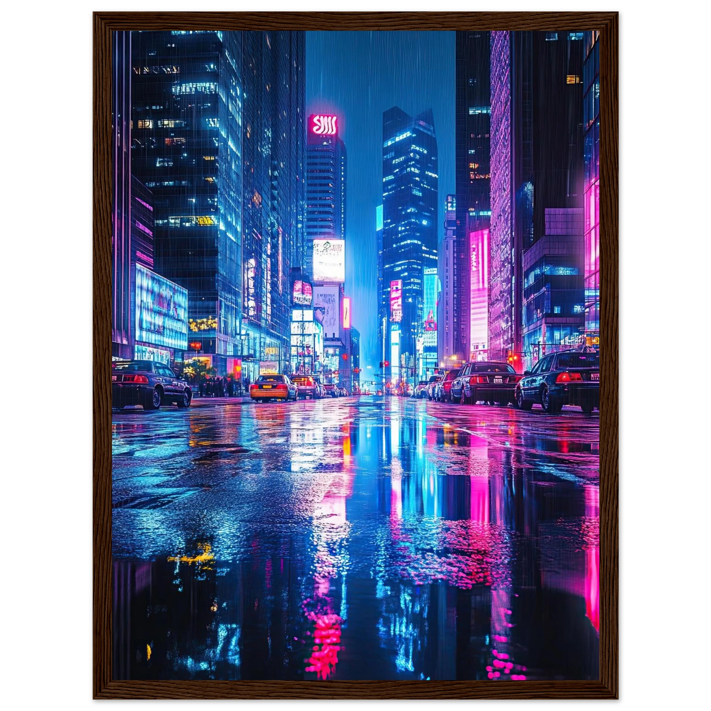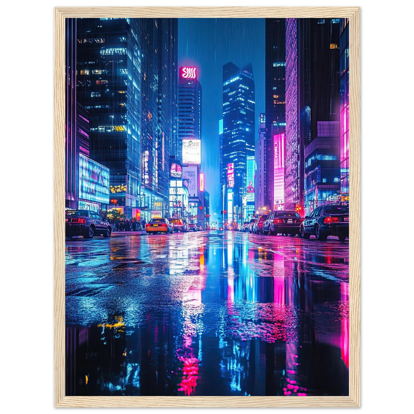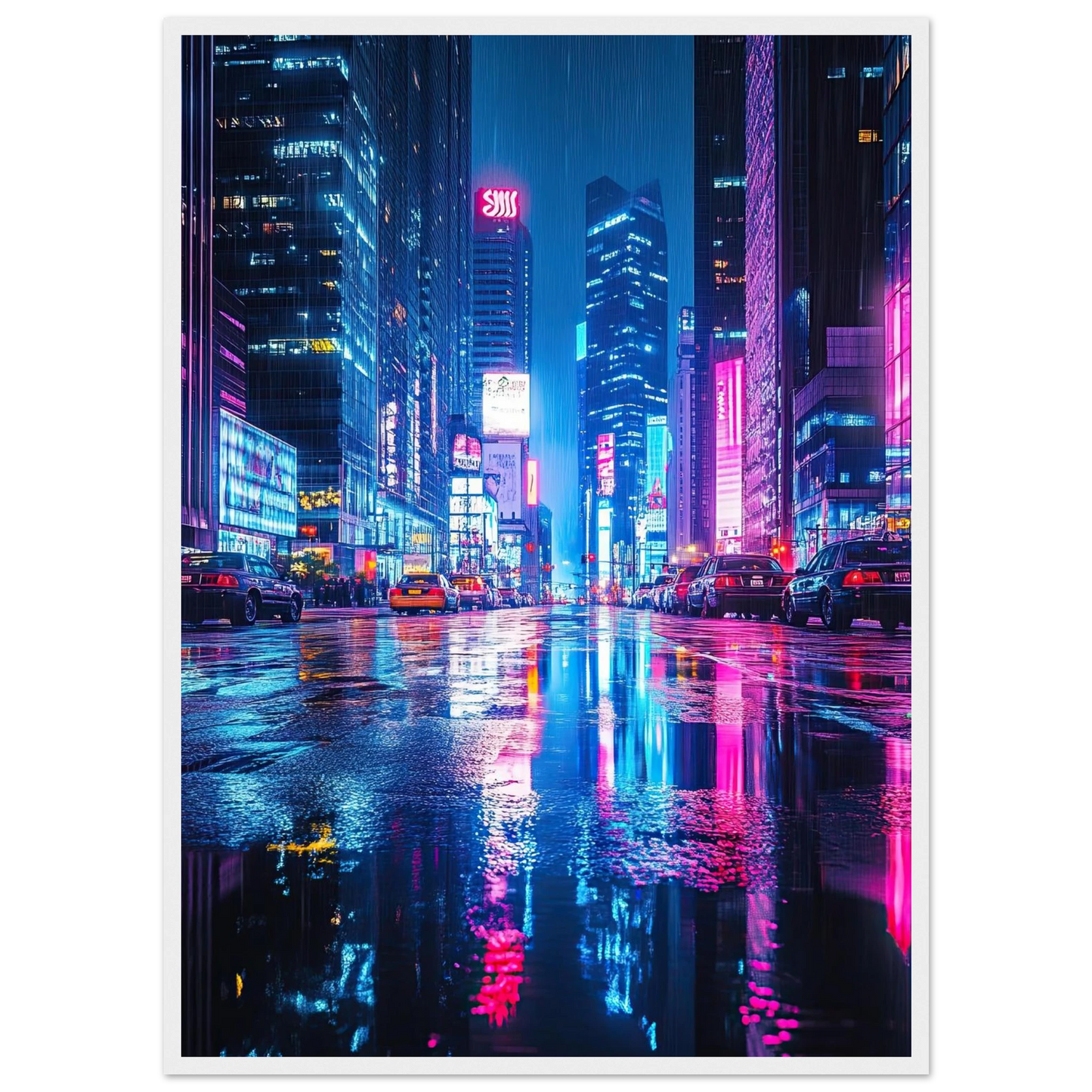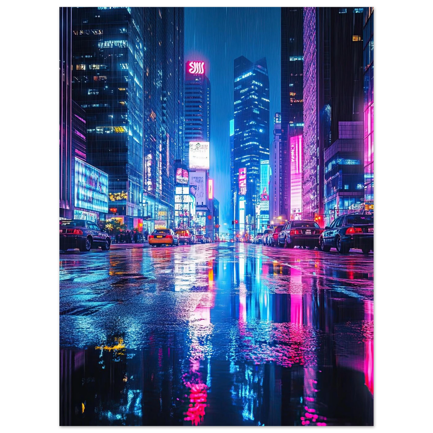 Et elektrisk bymotiv der neonlysene speiler seg i regnvåte gater, og skaper et energisk og moderne uttrykk. De intense blå- og rosatonene gir bildet en futuristisk atmosfære – perfekt for deg som vil ha en urban og dristig statement piece på veggen.