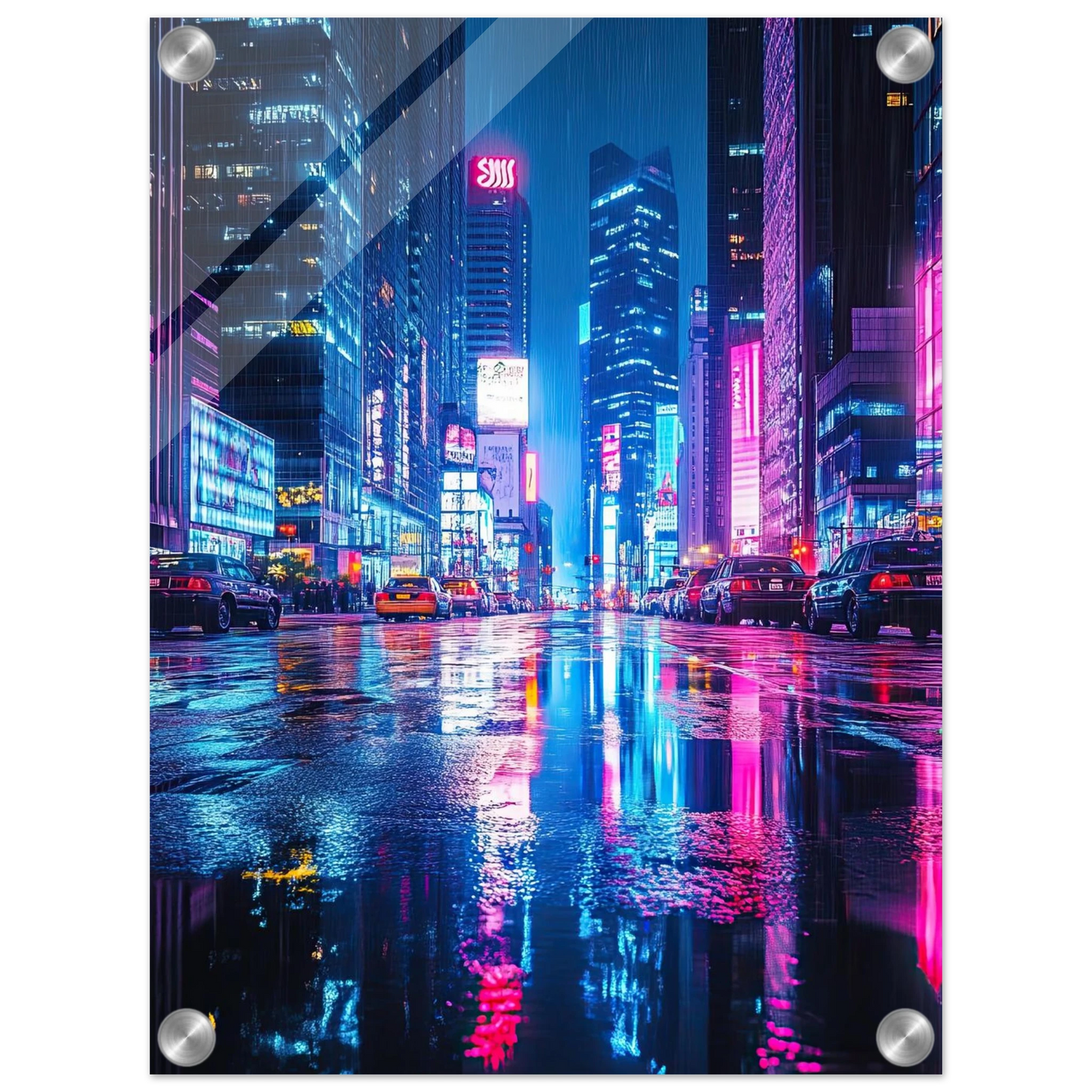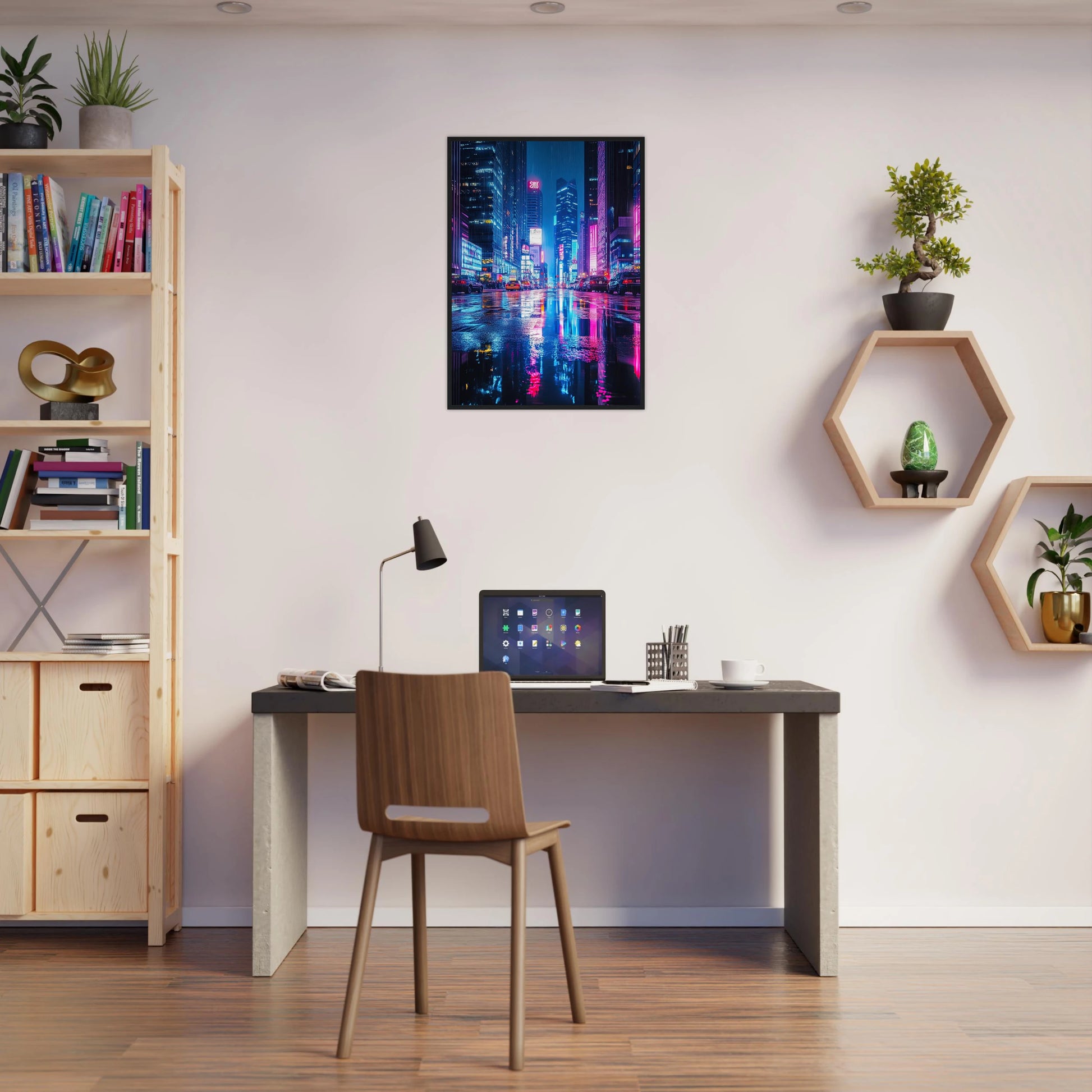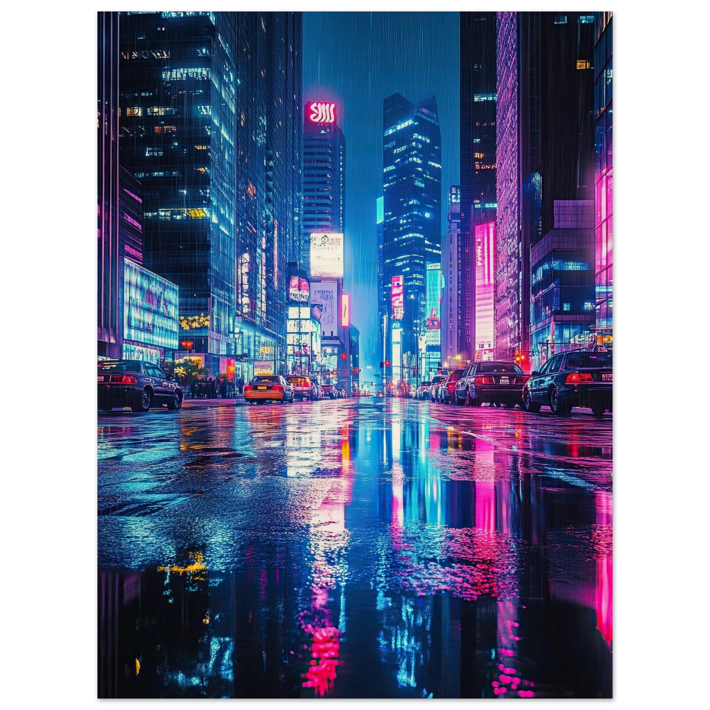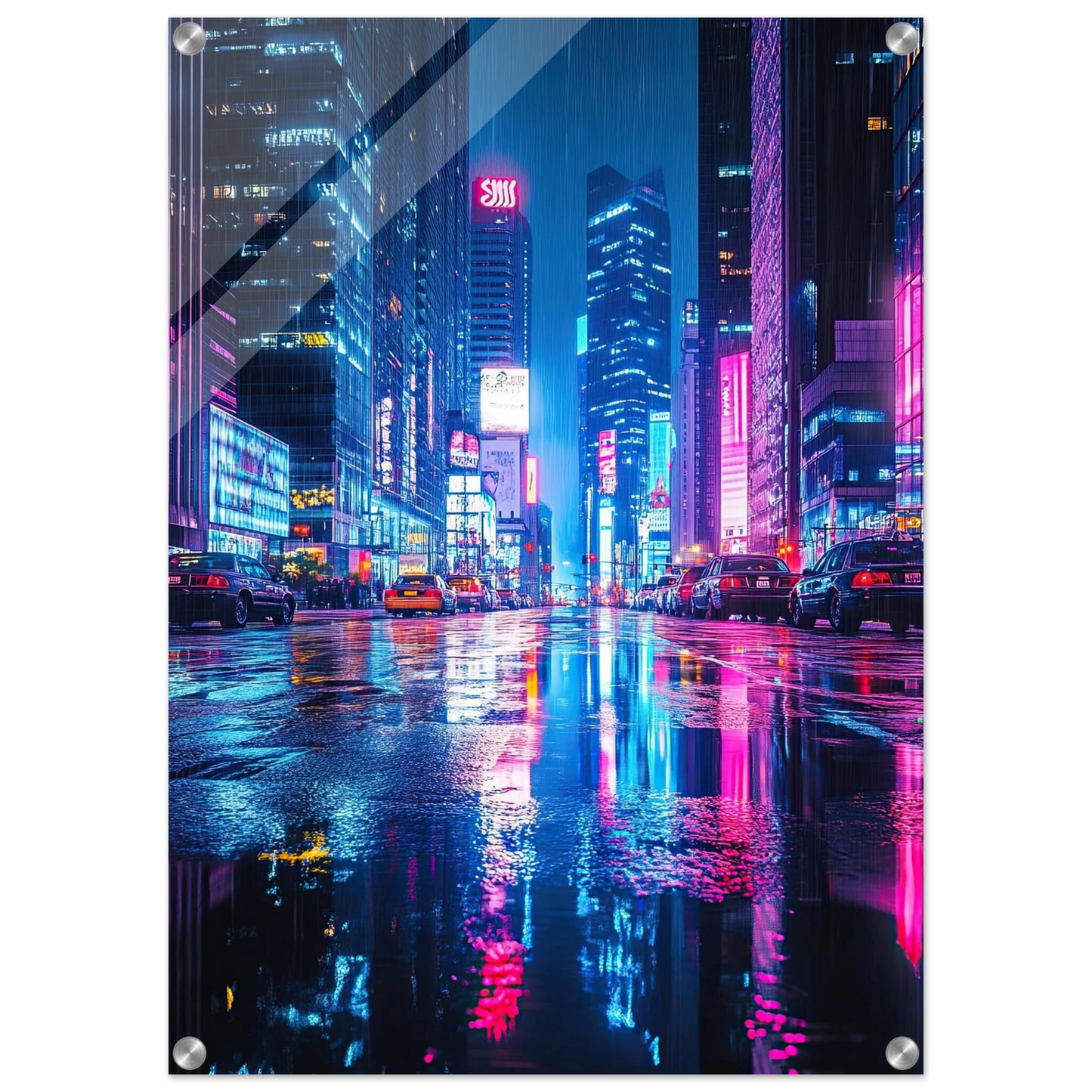 Et elektrisk bymotiv der neonlysene speiler seg i regnvåte gater, og skaper et energisk og moderne uttrykk. De intense blå- og rosatonene gir bildet en futuristisk atmosfære – perfekt for deg som vil ha en urban og dristig statement piece på veggen.