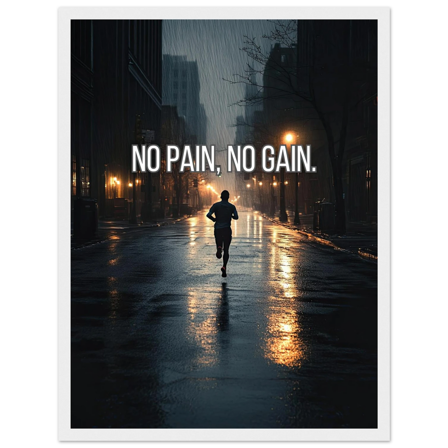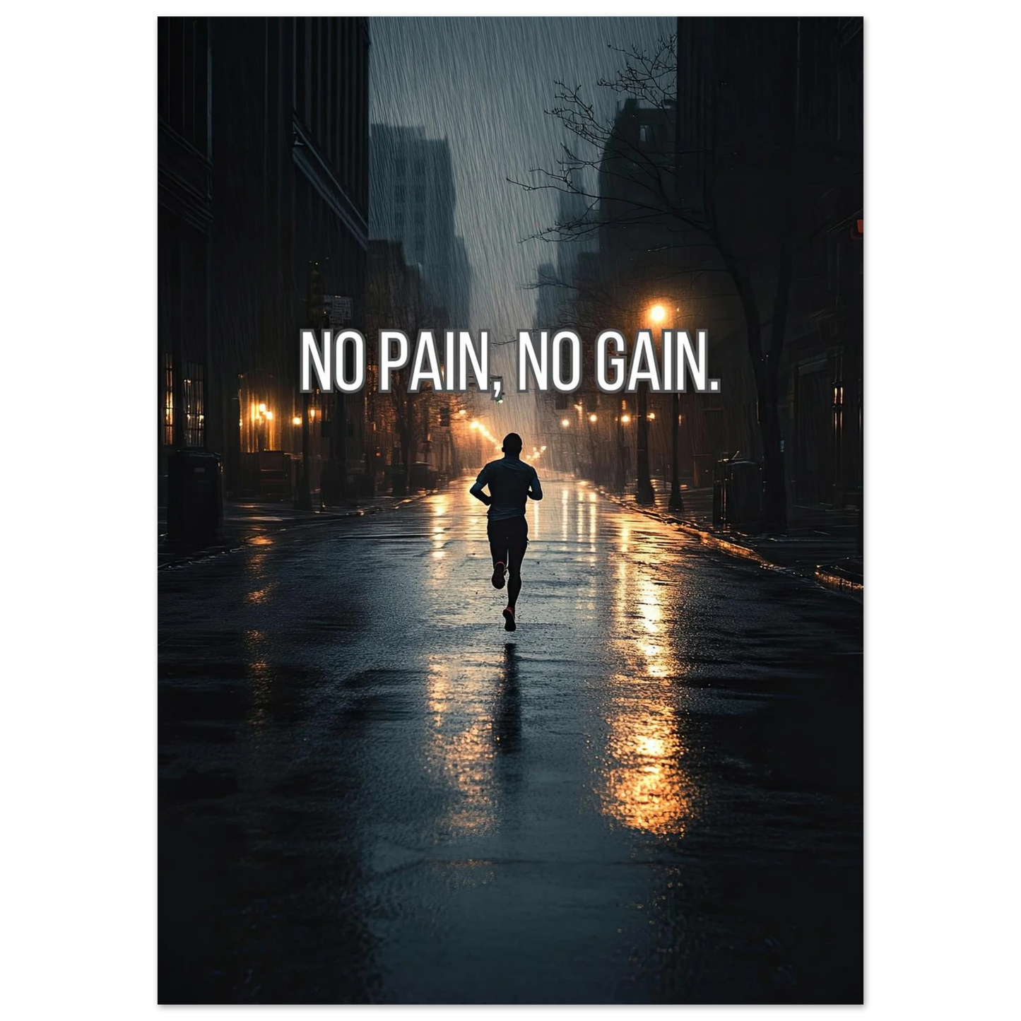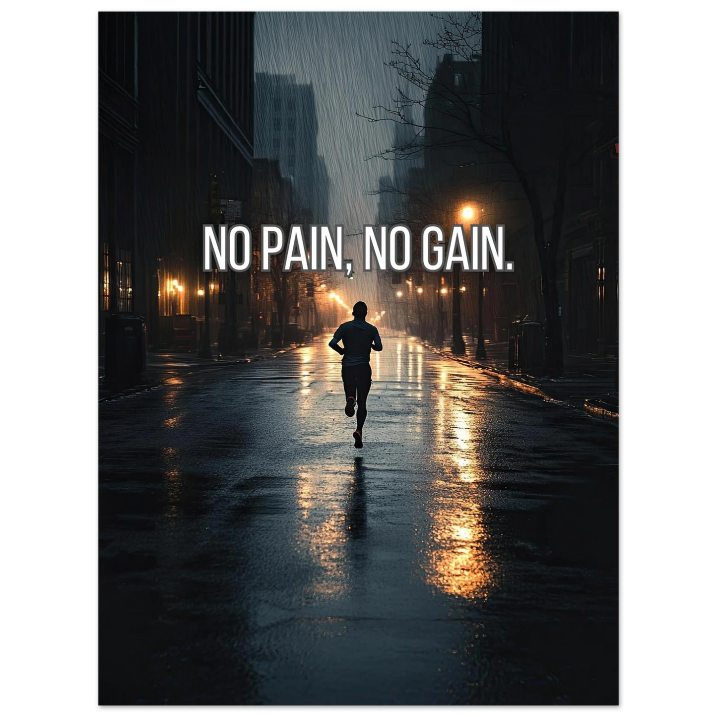 Et dramatisk motiv som fanger en løper i regnet, omgitt av mørke gater og lysende lykter. Bildet symboliserer utholdenhet, dedikasjon og viljen til å presse seg gjennom motstand for å oppnå ekte resultater. En kraftfull påminnelse om at smerte er prisen for vekst – og at innsatsen alltid belønnes.