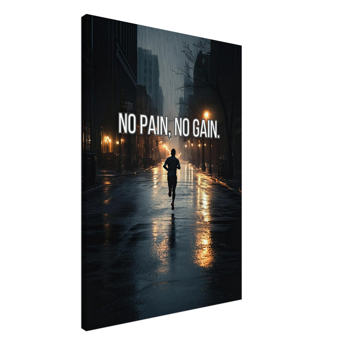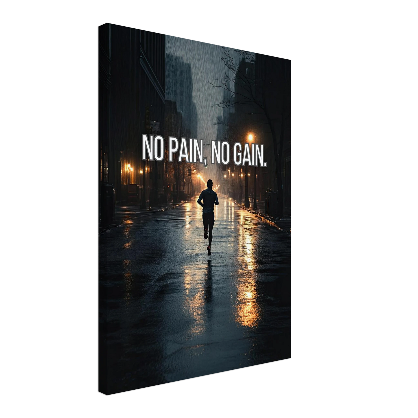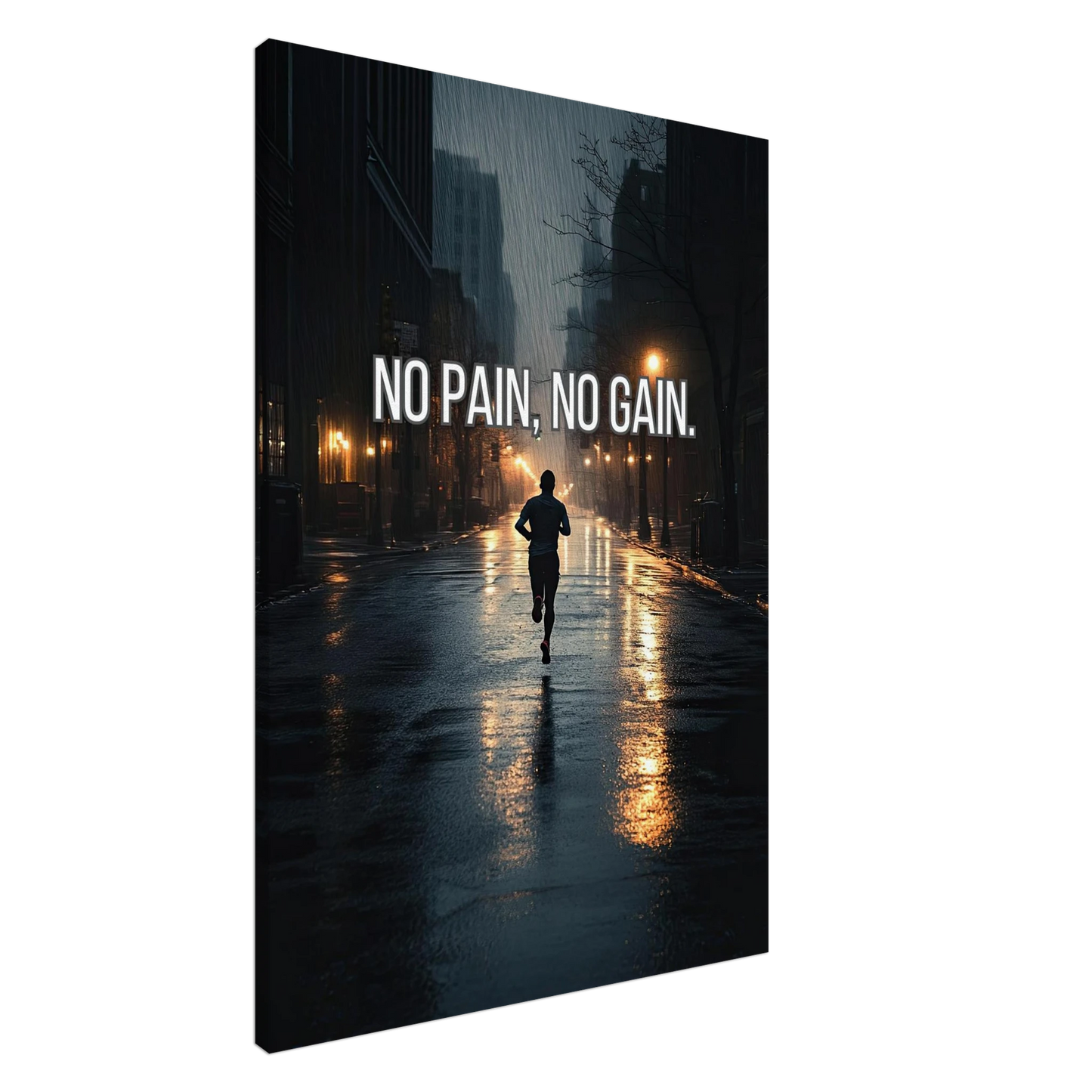 Et dramatisk motiv som fanger en løper i regnet, omgitt av mørke gater og lysende lykter. Bildet symboliserer utholdenhet, dedikasjon og viljen til å presse seg gjennom motstand for å oppnå ekte resultater. En kraftfull påminnelse om at smerte er prisen for vekst – og at innsatsen alltid belønnes.