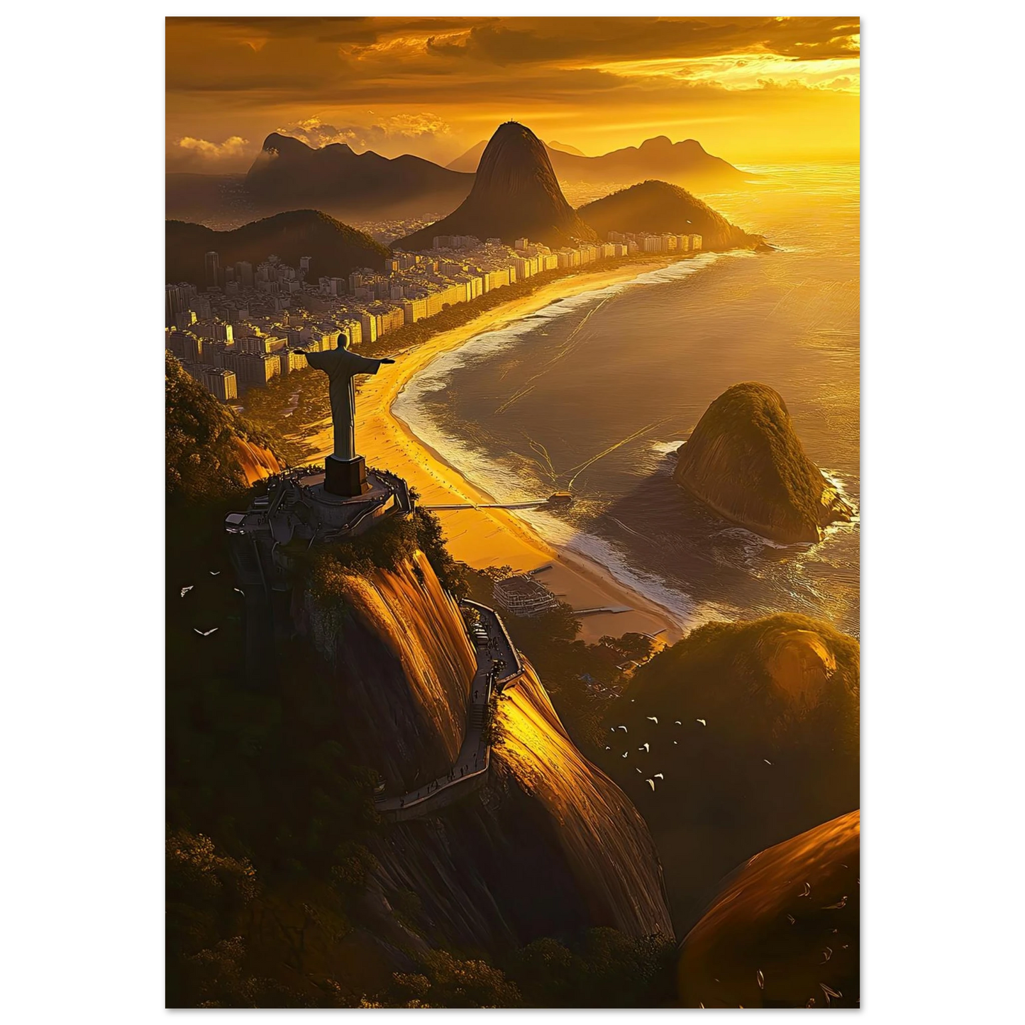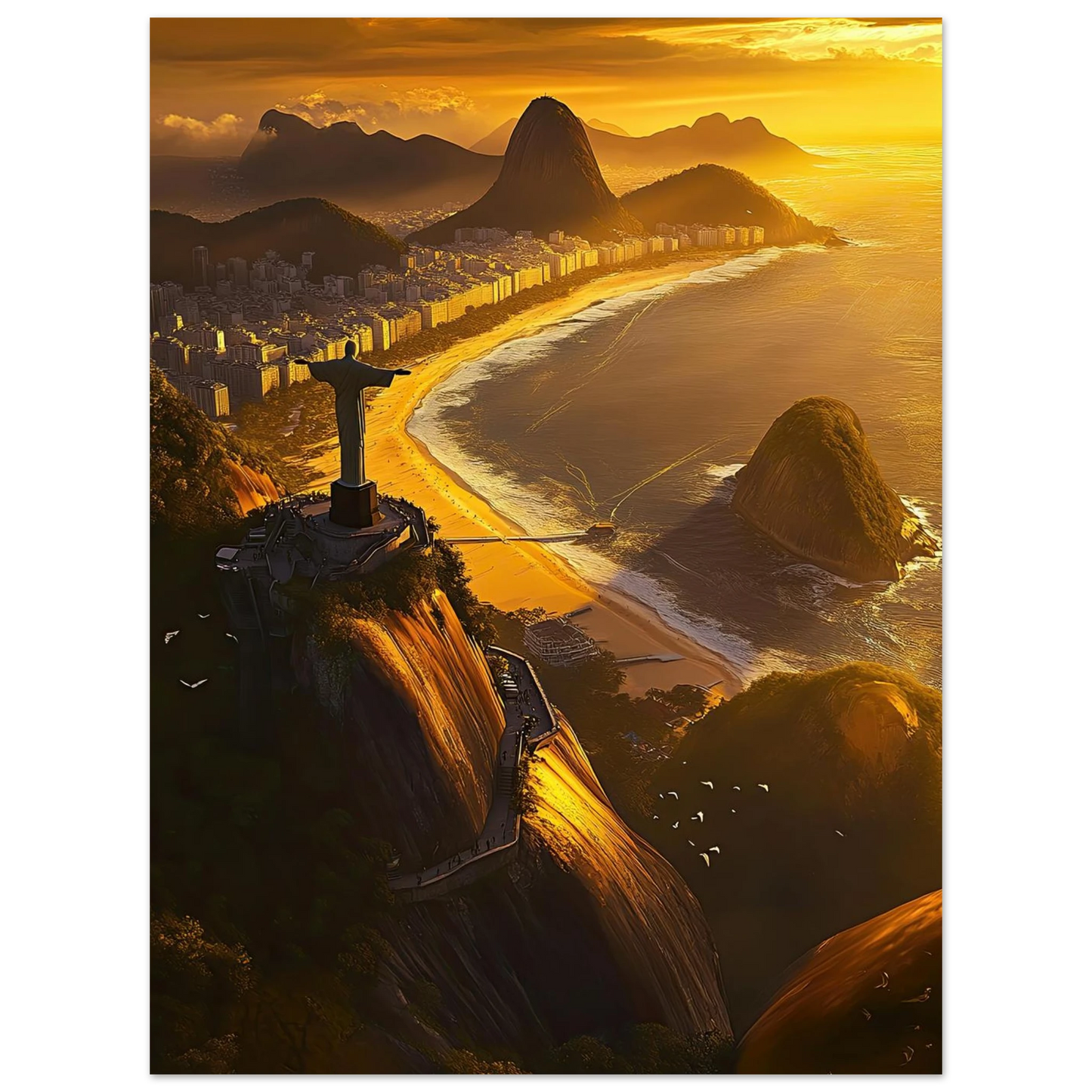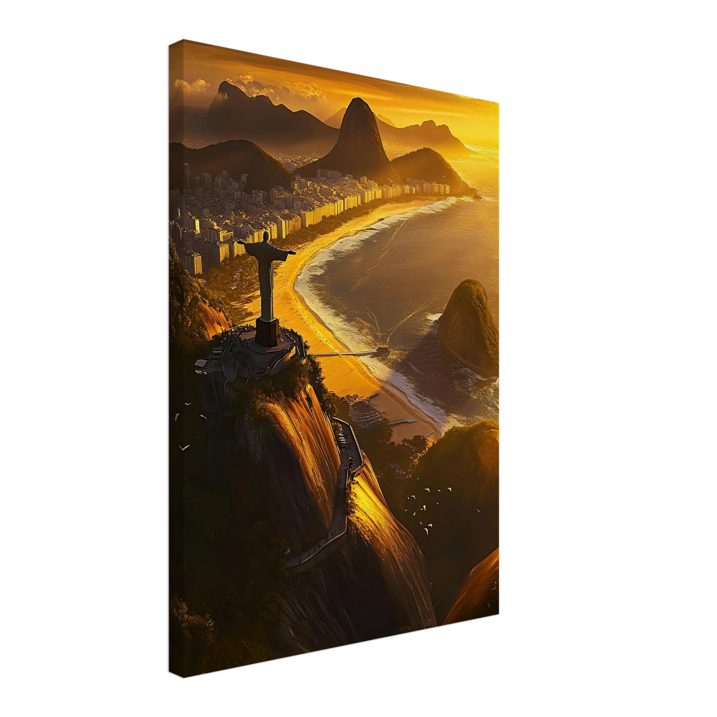 Et blendende vakkert kunstverk som fanger Rio de Janeiro badet i gyllen sol. Den verdenskjente kystlinjen slynger seg langs byen, mens fjellene og Kristusstatuen vokter over landskapet. Perfekt for deg som vil tilføre hjemmet energi, varme og reiselyst.