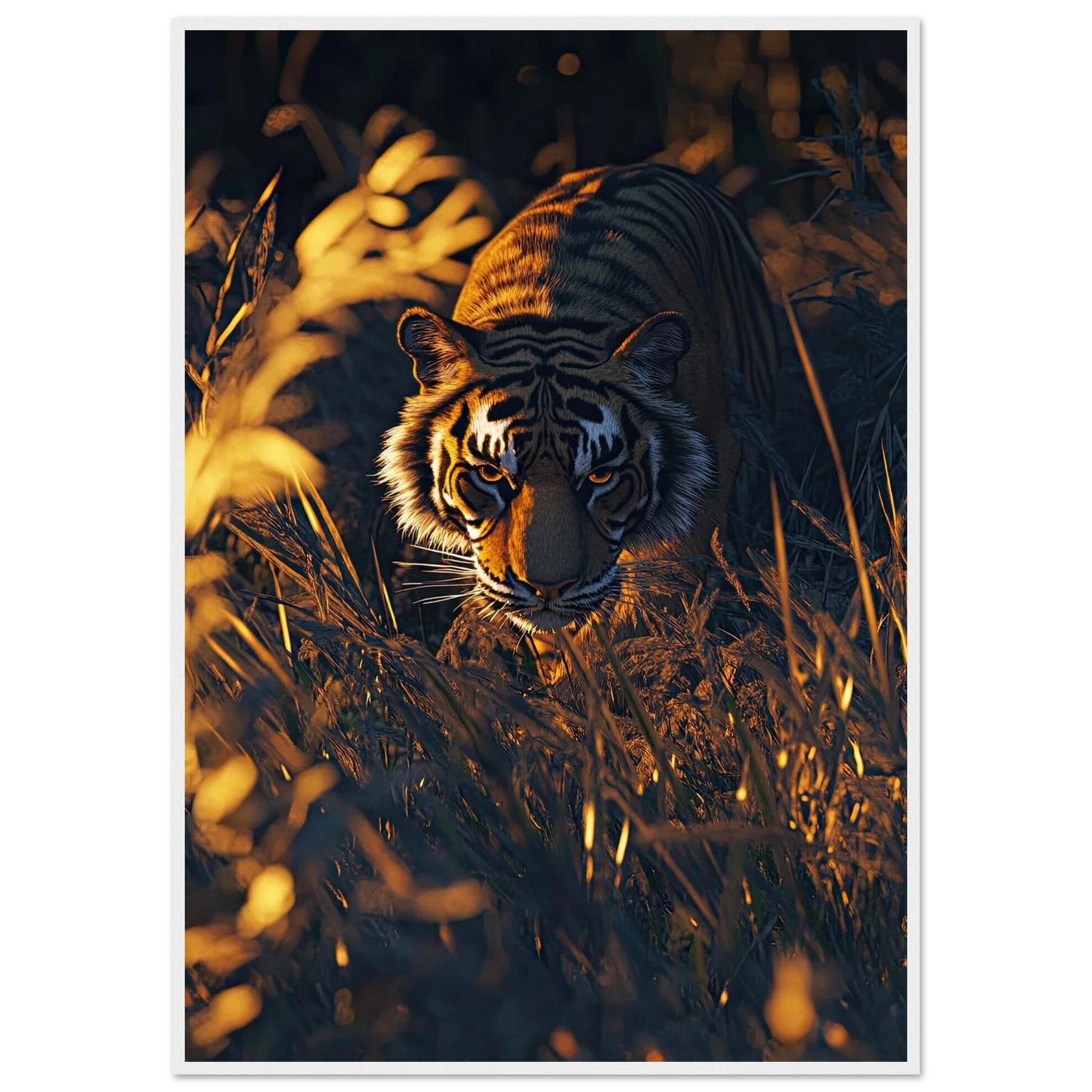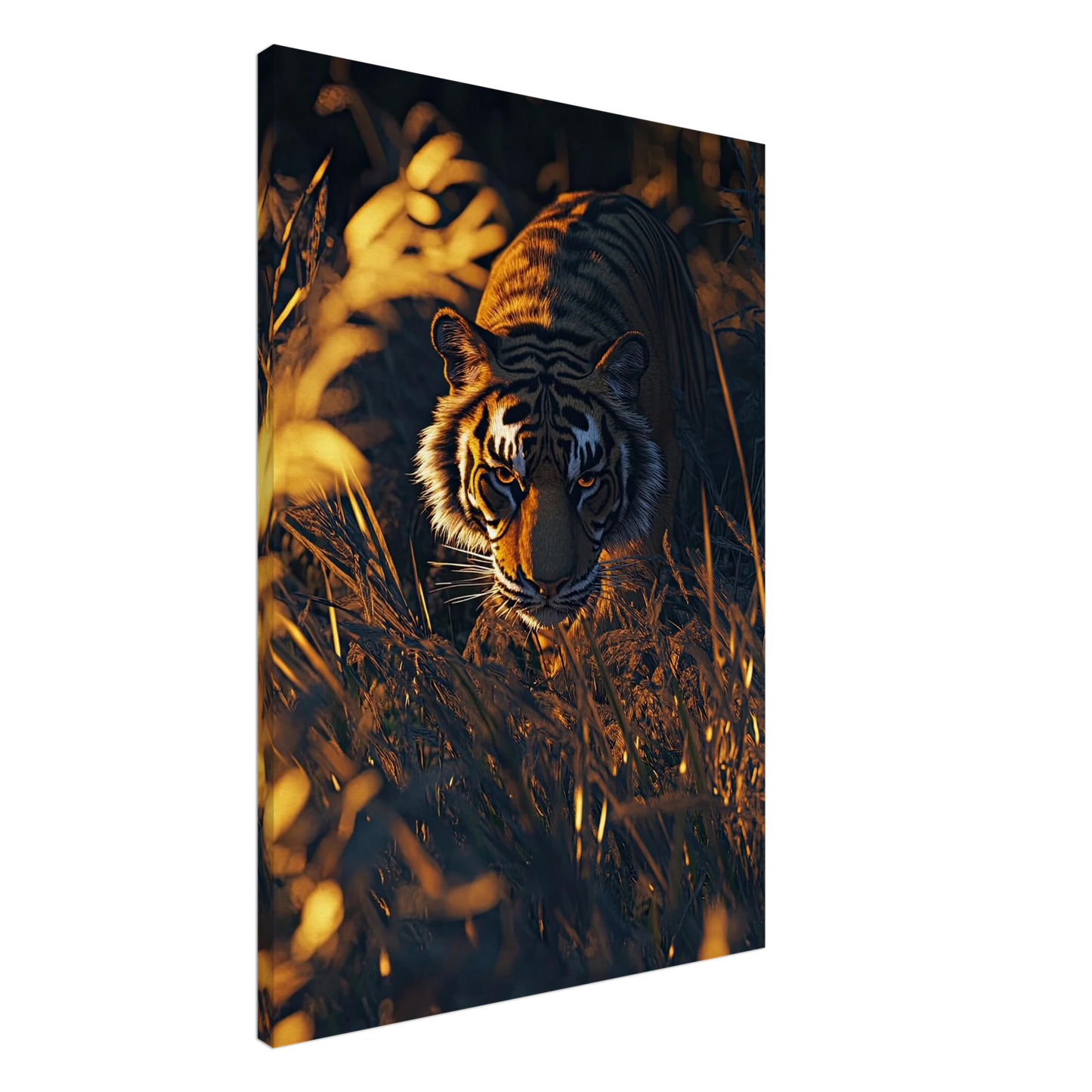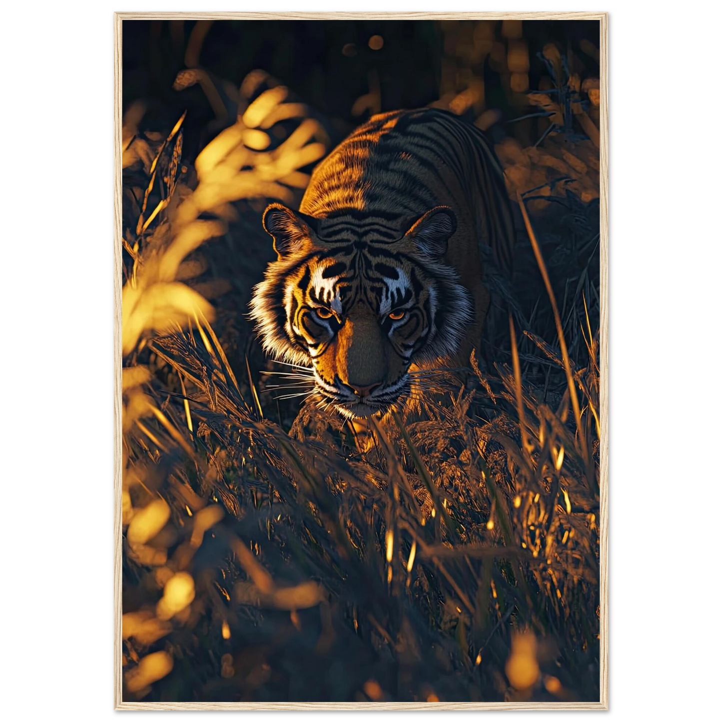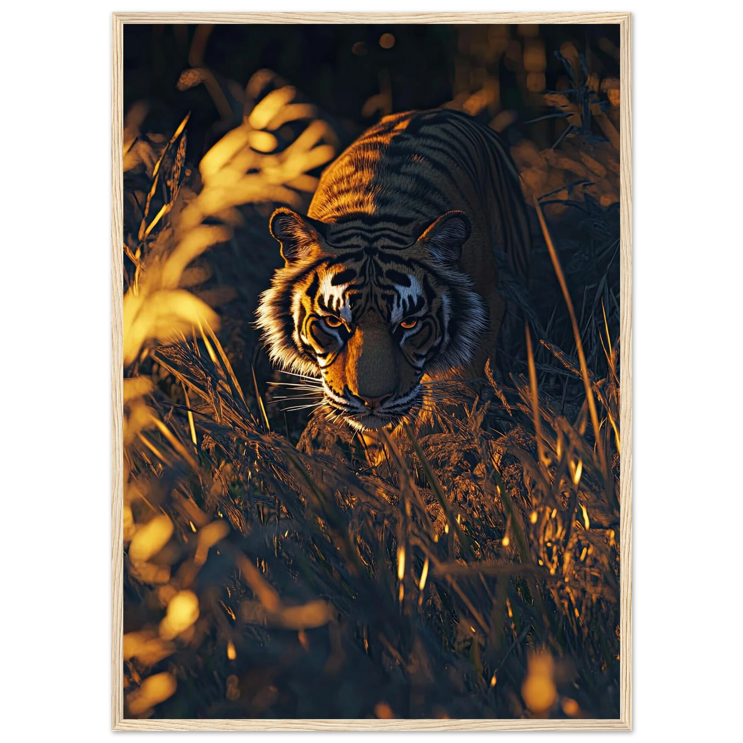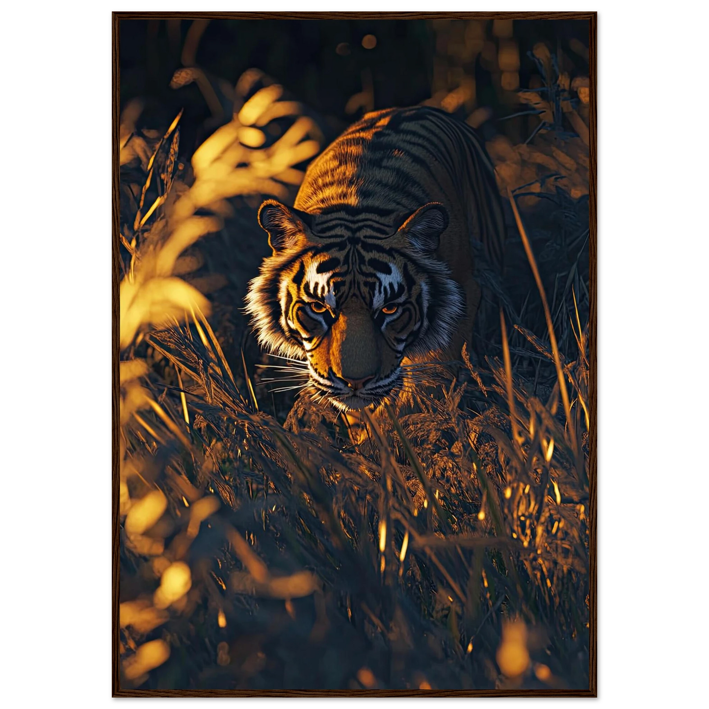 Et kraftfullt kunstverk som fanger tigeren i øyeblikket før handling. Den intense gløden i blikket og det varme lyset gir bildet en elektrisk spenning. Perfekt for deg som ønsker kunst med rå kraft og majestetisk tilstedeværelse.