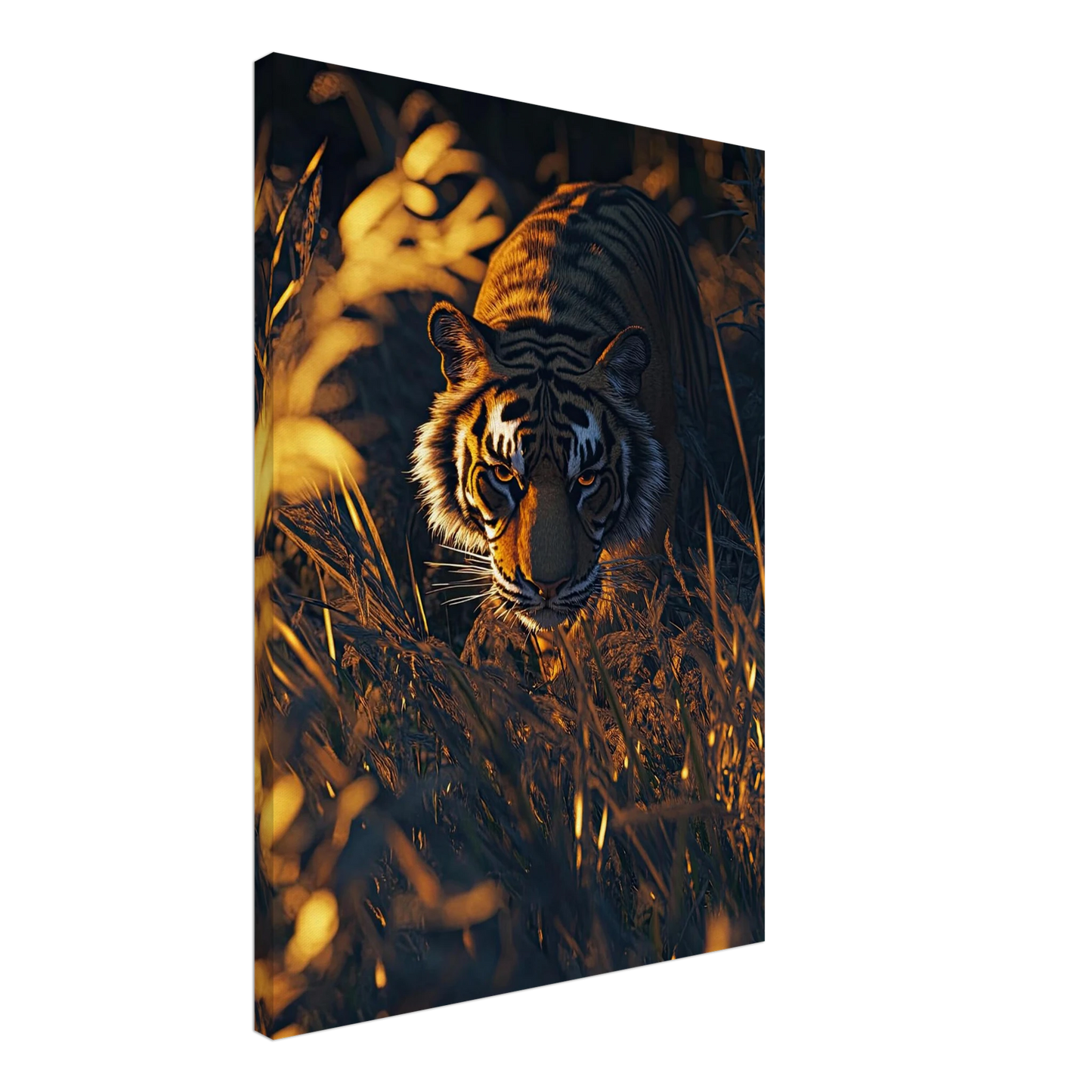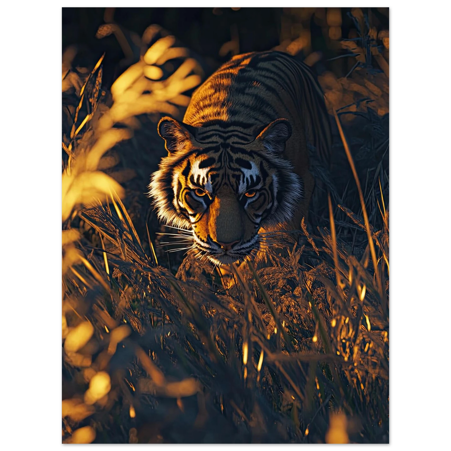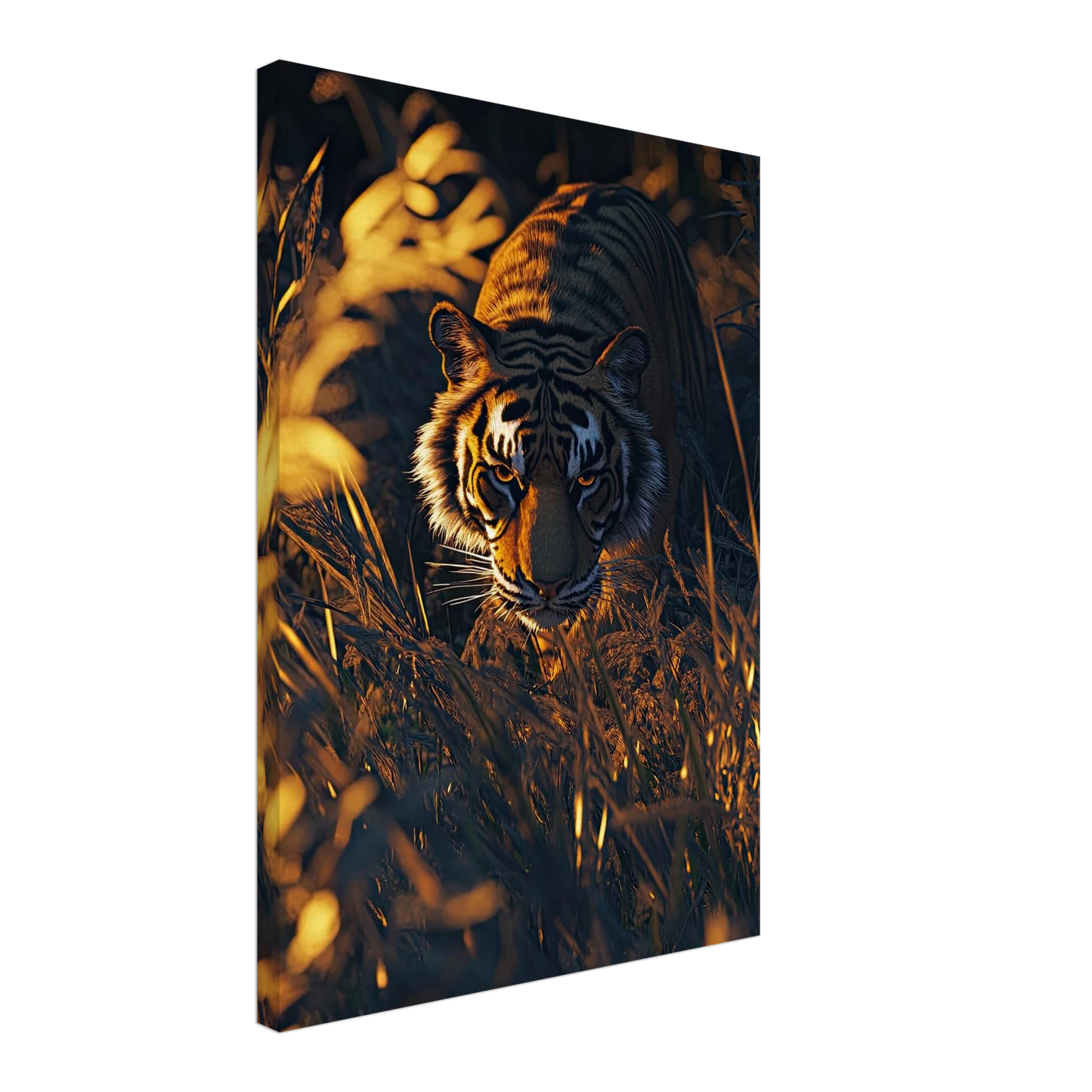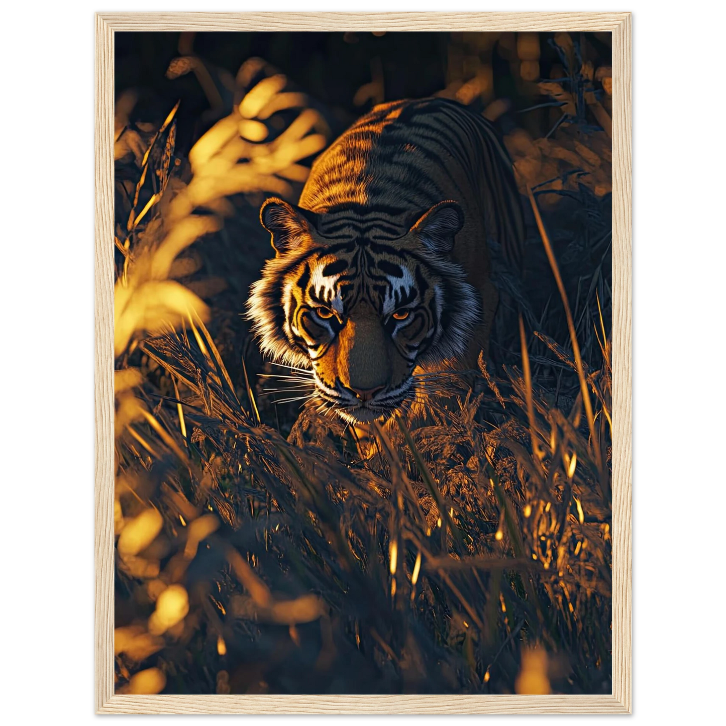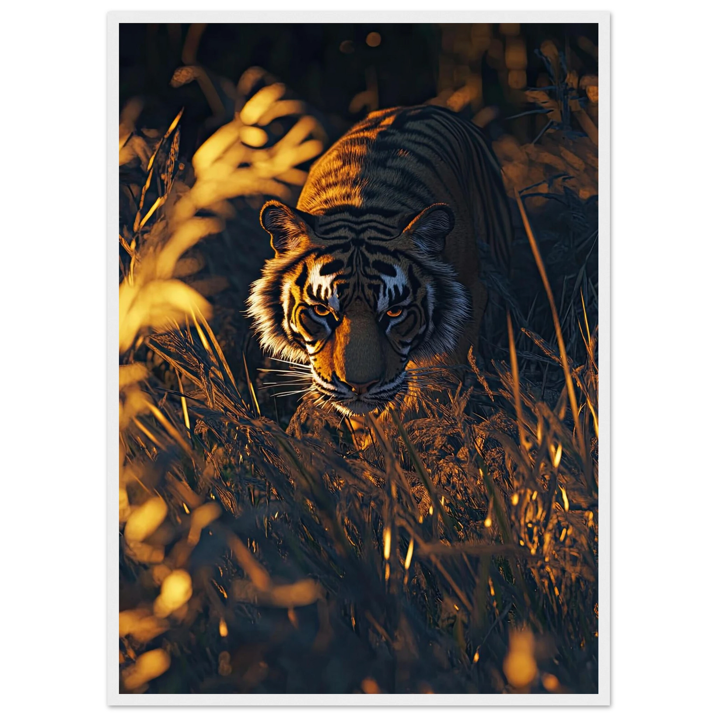 Et kraftfullt kunstverk som fanger tigeren i øyeblikket før handling. Den intense gløden i blikket og det varme lyset gir bildet en elektrisk spenning. Perfekt for deg som ønsker kunst med rå kraft og majestetisk tilstedeværelse.
